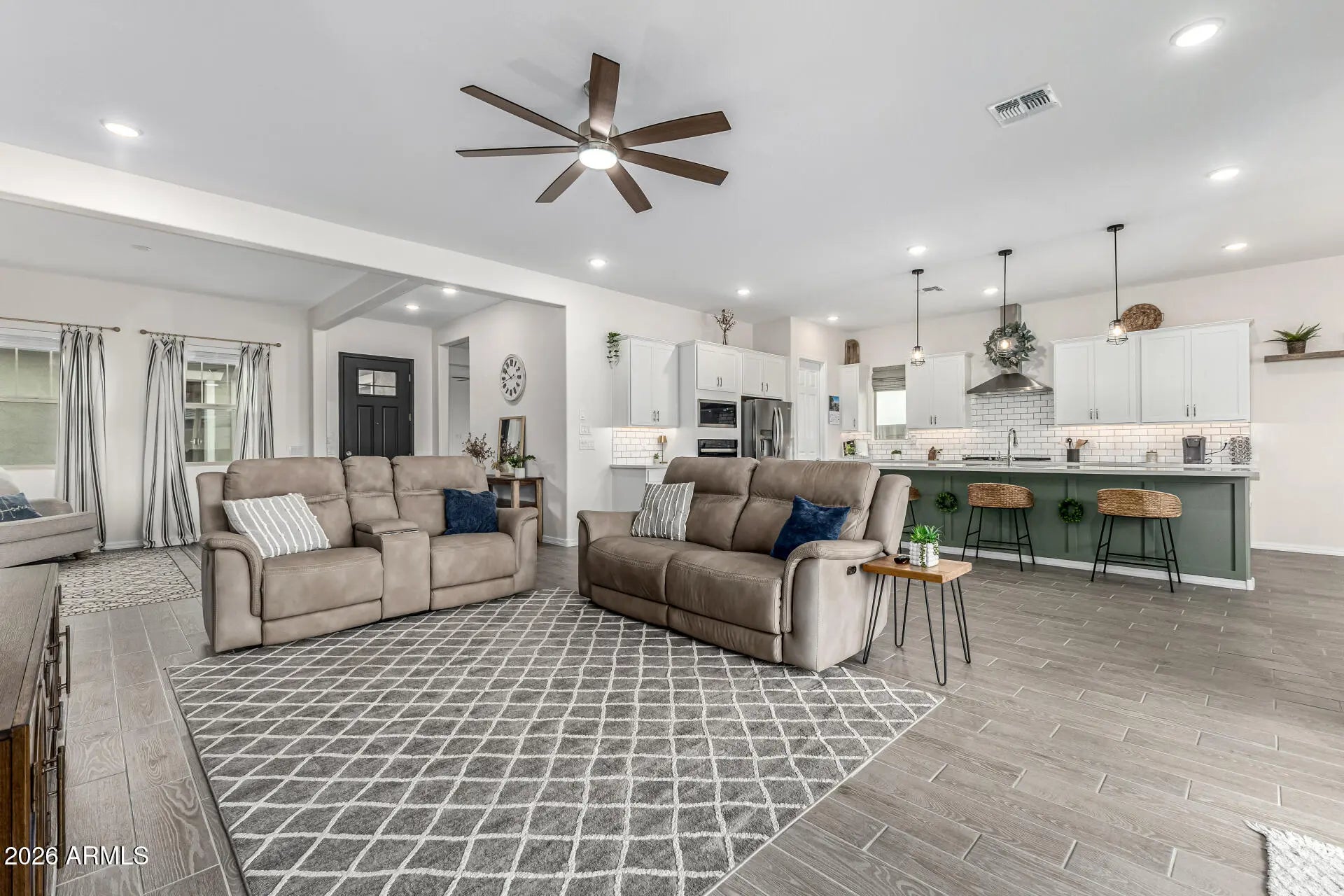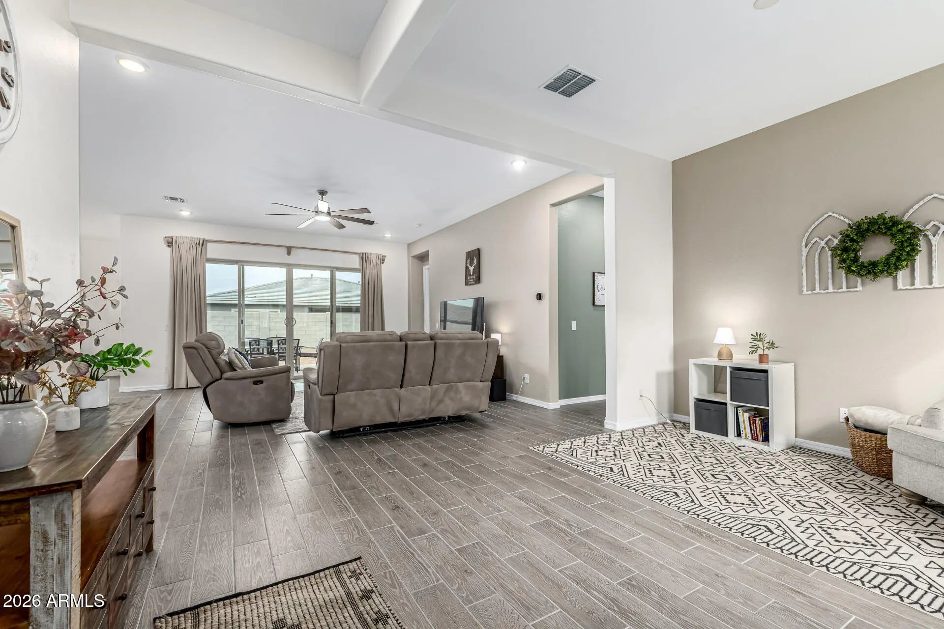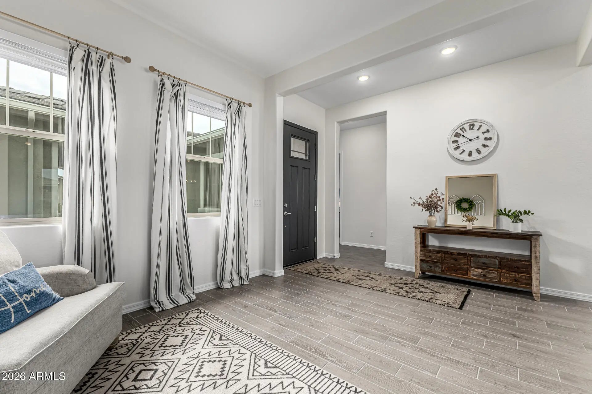 Nearly new and beautifully upgraded, this home delivers modern luxury from the moment you enter the private courtyard through the custom iron security door. The open floorplan features 10' ceilings, wood-look tile floors, designer accent walls, a chef's kitchen with 5-burner gas cooktop, 10' island, walk-in pantry, and hardwood cabinetry. A split layout provides privacy, plus two flex rooms ideal for a den, office, or game room. The spacious primary suite offers dual vanities and an oversized walk-in shower. Additional highlights include a large laundry room, 3-car tandem garage w/ epoxy floors & built-in cabinets, smart-home networking, covered patio, BBQ gas stub, concrete tile roof, R-30 insulation, and 10-yr structural warranty, all minutes to I-17, shopping, dining, schools & more!