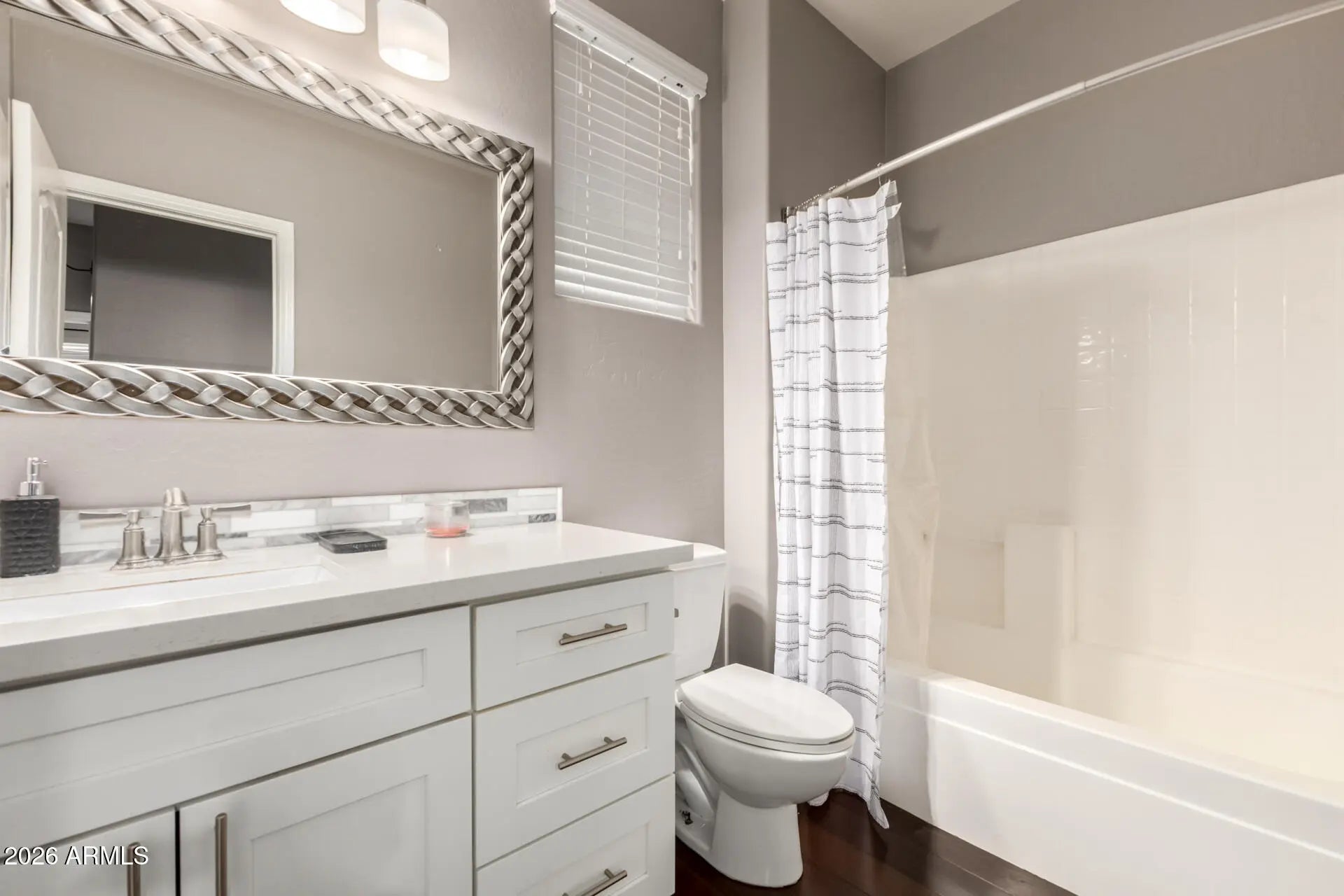 Check out this 3-bedroom, 2-bath home in Surprise Farms! Conveniently located near gyms, grocery stores, and everyday essentials, this home also offers easy access to shopping and dining at The Village at Prasada—just 10 minutes away! Inside, you'll love the open floor plan enhanced by vaulted ceilings and bamboo wood flooring throughout the main living areas. The modern kitchen features white shaker cabinets, quartz countertops, and stainless steel appliances. The spacious layout includes comfortable bedrooms and a private primary suite. Step outside to a low-maintenance backyard with turf and pavers—perfect for relaxing, entertaining, or enjoying Arizona living with ease. With a prime location close to shopping, dining, and entertainment, this home is one you dont want to miss!
