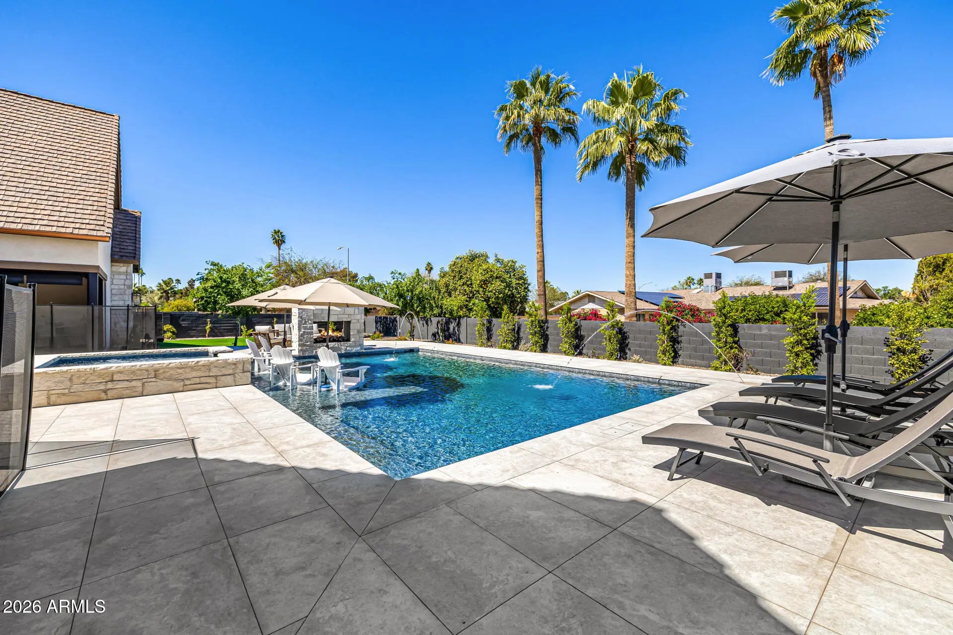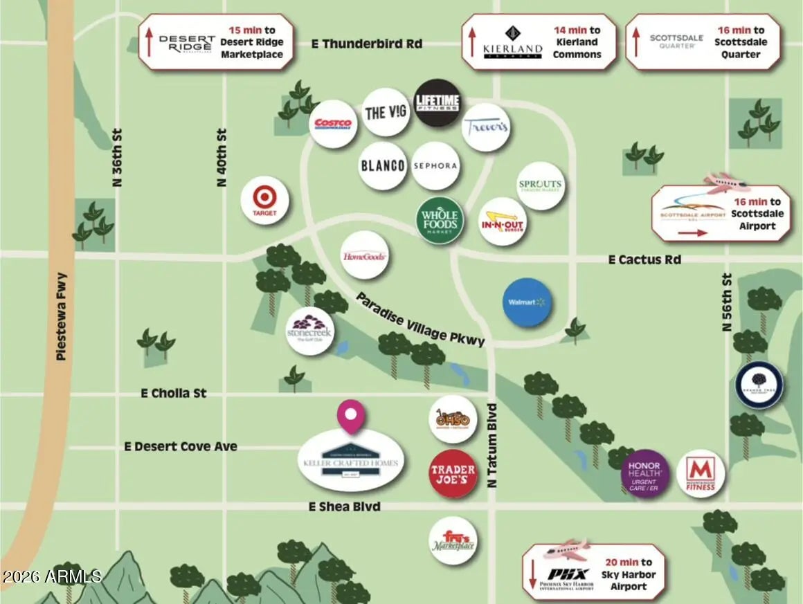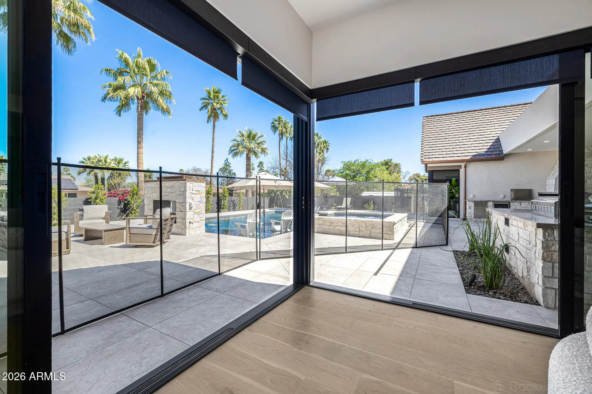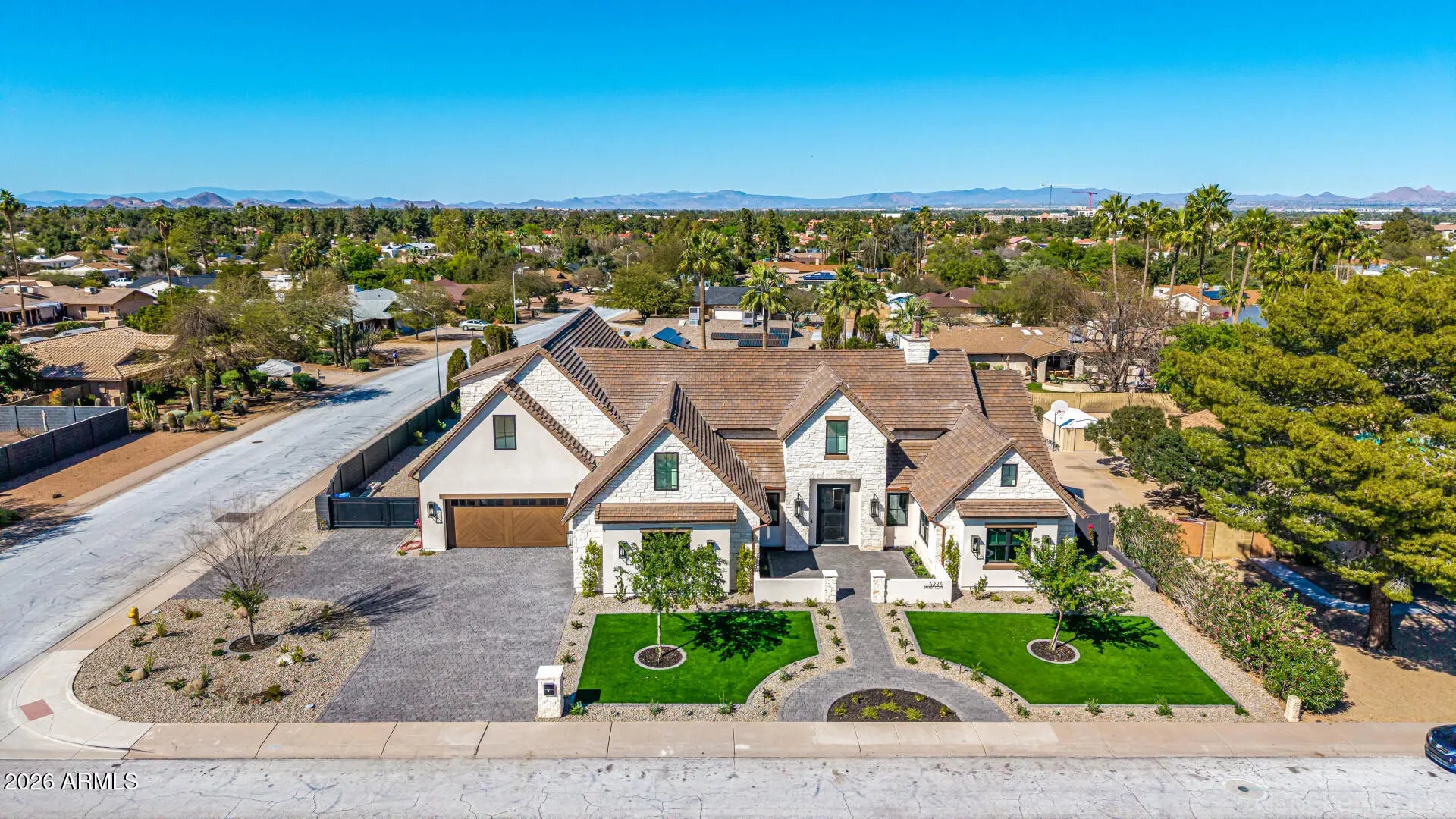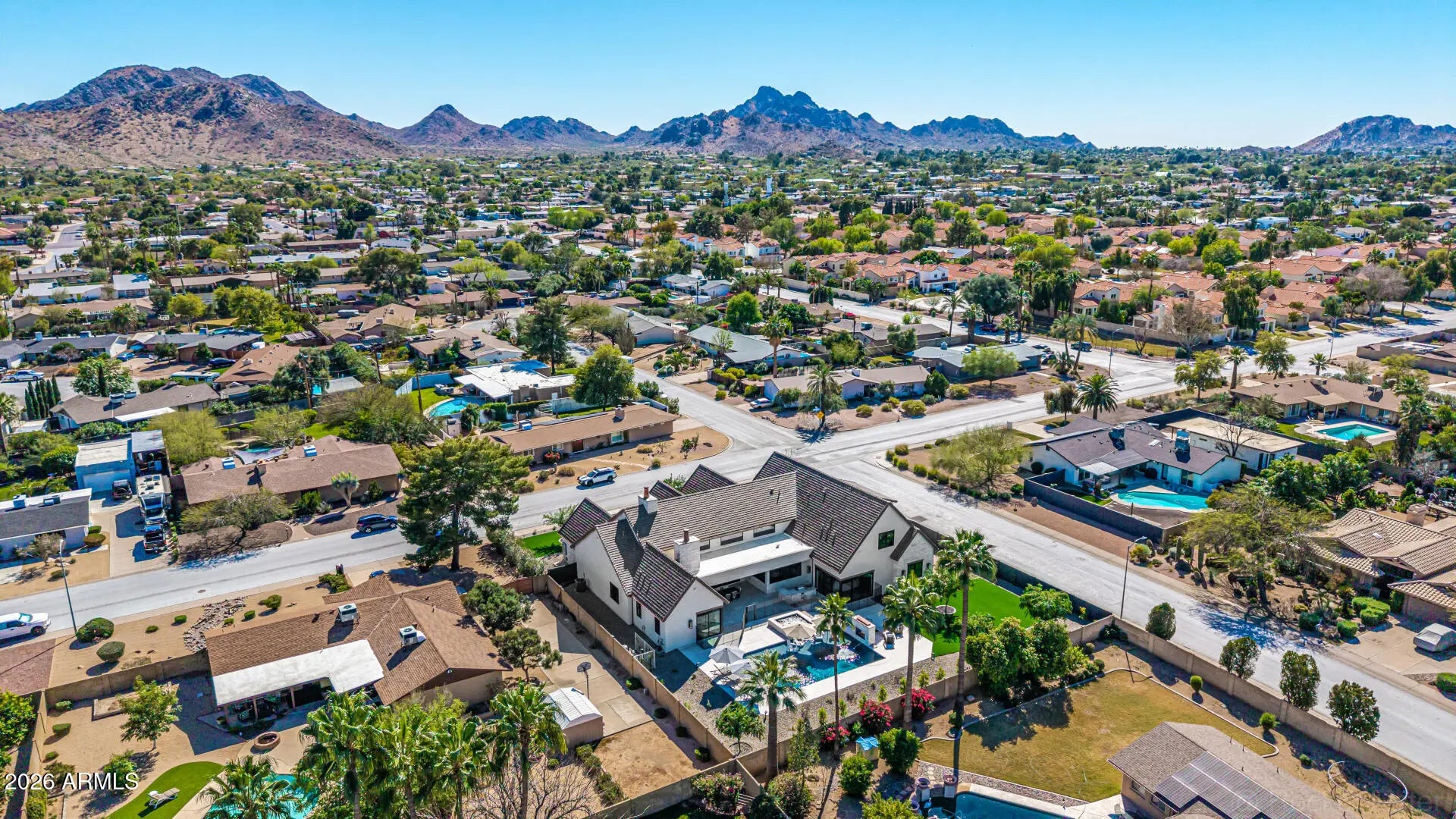 A rare opportunity to own new construction with true luxury finish and full smart-home integration just moments from Paradise Valley--offering comparable lifestyle at a more compelling value. A Fully Integrated Smart Estate in the Coveted Sheaborhood Set on a pristine nearly half-acre corner lot, this newly constructed 5,332-square-foot estate embodies elevated desert living with uncompromising design and fully integrated technology. Ideally positioned just moments from the revitalized PV District, home to sought-after retail, acclaimed dining, championship golf resorts, and neighborhood parks. The residence offers rare privacy while remaining effortlessly connected to Phoenix's most desirable destinations. A private courtyard entry introduces the home's striking stone-accented facade a architectural presence, framed by breathtaking mountain views. Designed for Elevated Living. The thoughtfully curated floorplan balances grand entertaining with refined everyday comfort: - Four spacious ensuite bedrooms - Four-and-a-half baths - Private executive office - Versatile game/flex lounge - Dedicated upstairs theater with chic concession loft At the heart of the home, a statement chef's kitchen pairs bespoke cabinetry with a full Sub-Zero and Wolf appliance suite, including a 60-inch range, separate 36-inch refrigerator and freezer (panel-ready), and a discreet walk-in pantry designed for seamless entertaining. A sophisticated full-service bar--complete with an 18-inch full-height Sub-Zero wine column and ice maker--anchors the main living spaces with understated glamour. Soaring vaulted ceilings with custom wood beams, an expansive sliding glass wall, and a fully glass-framed dining room blur the boundary between indoors and out, capturing uninterrupted views of the resort-caliber grounds. Intelligent. Intuitive. Effortless. A fully integrated Crestron system orchestrates the home with precision--curated lighting scenes, motorized shades, whole-home and exterior audio, climate control, pool and spa temperature, and garage access--all seamlessly controlled for a truly turnkey experience. A Private Sanctuary. The primary suite is a retreat unto itself. Corner glass doors open to tranquil views of the pool and landscaped grounds, while a 20' x 20' custom LED-illuminated dressing room evokes a luxury boutique experience. The spa-inspired bath offers a serene escape, where everyday living feels indulgent. Function meets refinement with dual washer/dryer setups in the main laundry room and an additional discreet unit within the primary suite for ultimate convenience. A Resort Beyond Compare. The backyard is designed as a private destination. A stunning pool with generous baja shelf and integrated spa anchors the space, surrounded by curated gathering areas. An outdoor kitchen--featuring a built-in grill, beverage refrigerator, and drop-in cooler--makes al fresco entertaining effortless. An intimate patio fireplace and a dramatic double-sided fireplace near the pool extend evenings well past sunset. Lush landscaping, an architectural wood-look concrete shake roof offering the warmth of timber with superior durability, double and single bay garages, and an RV gate complete this exceptional offering.