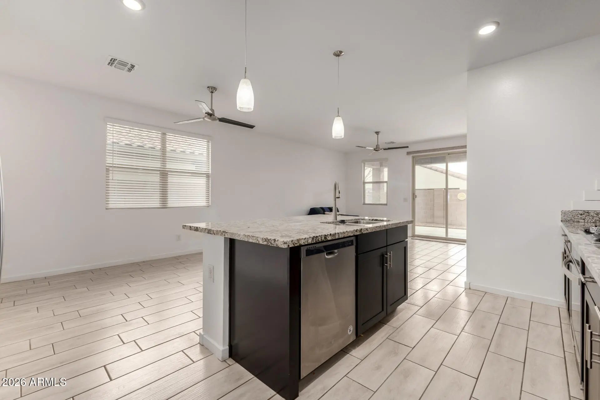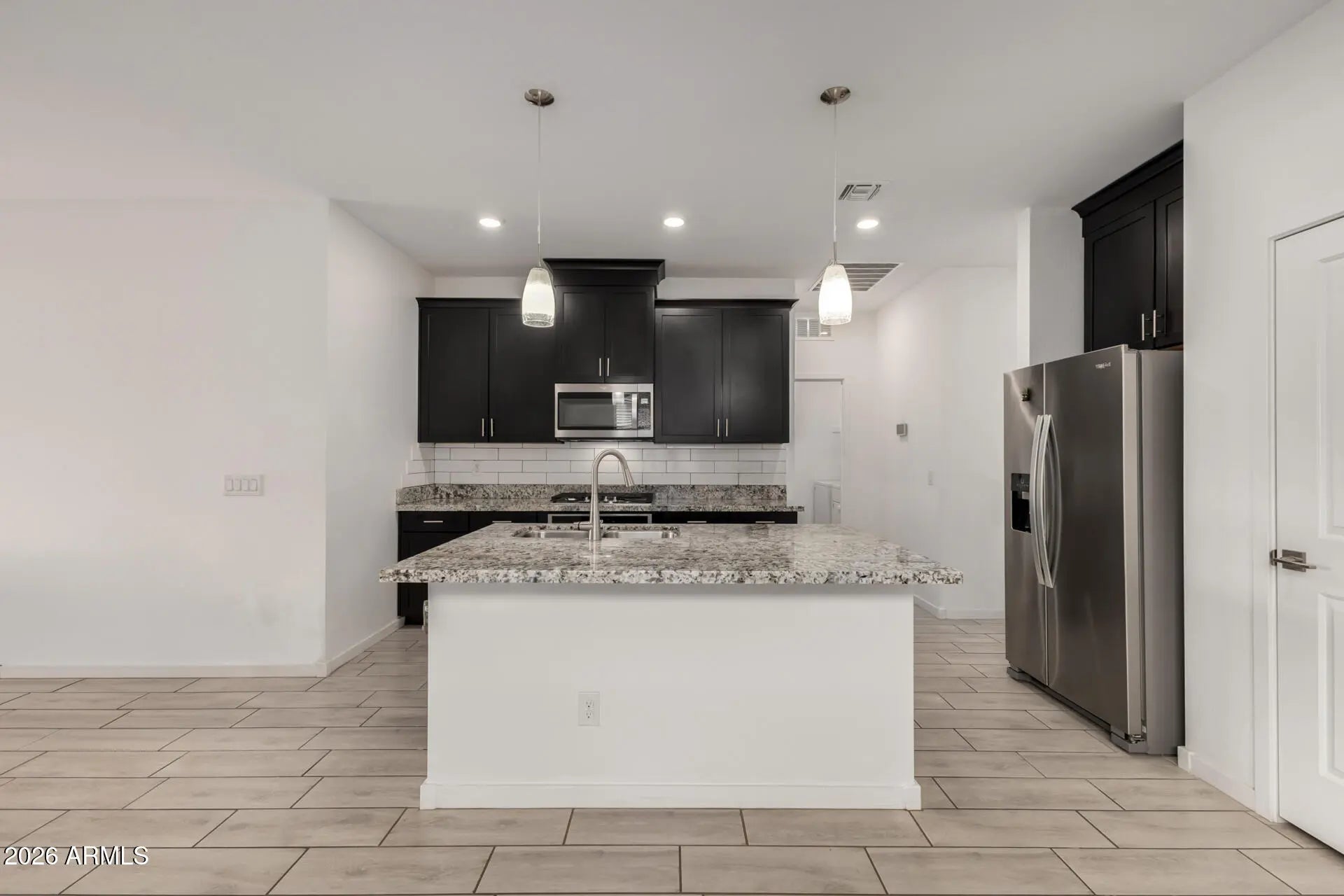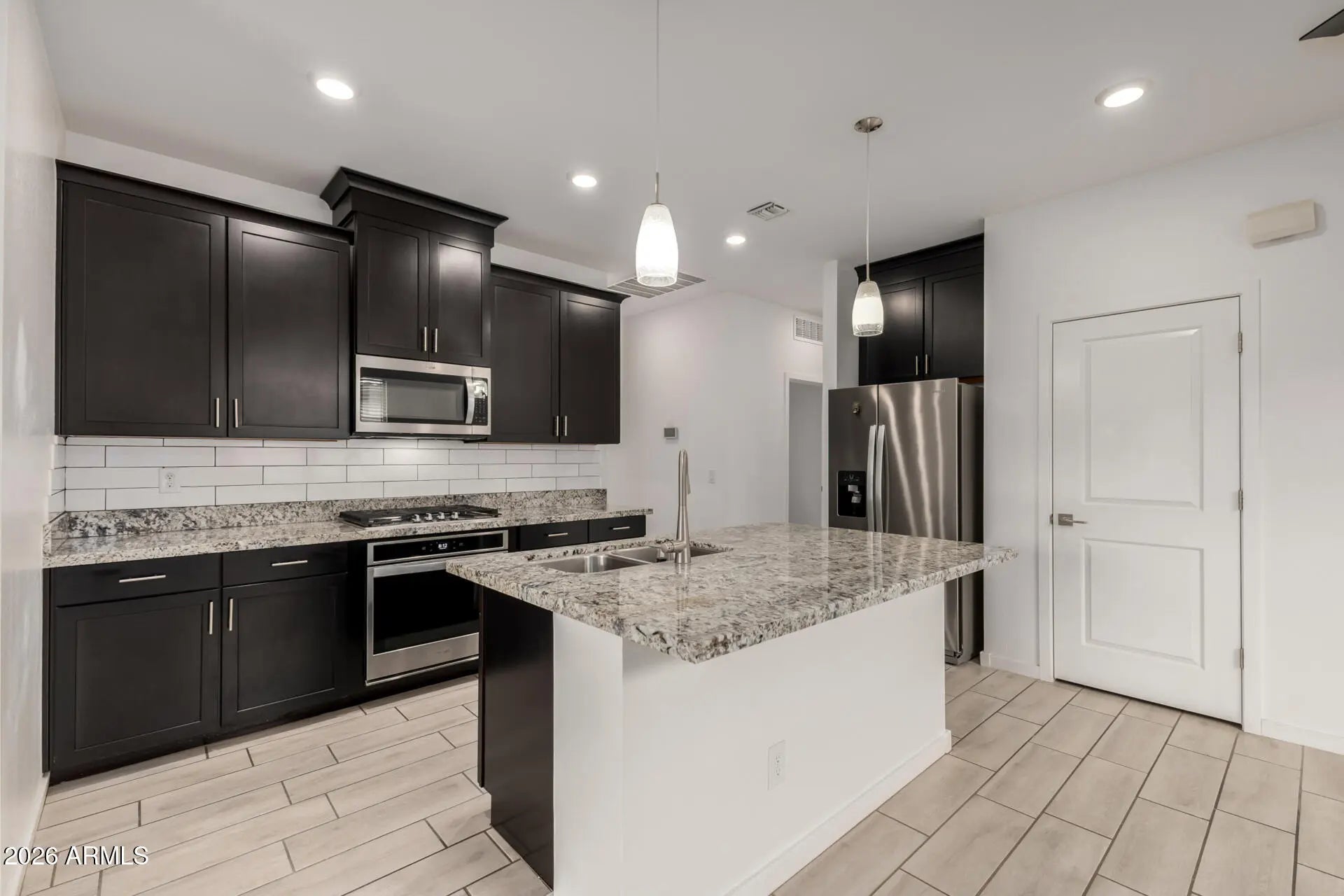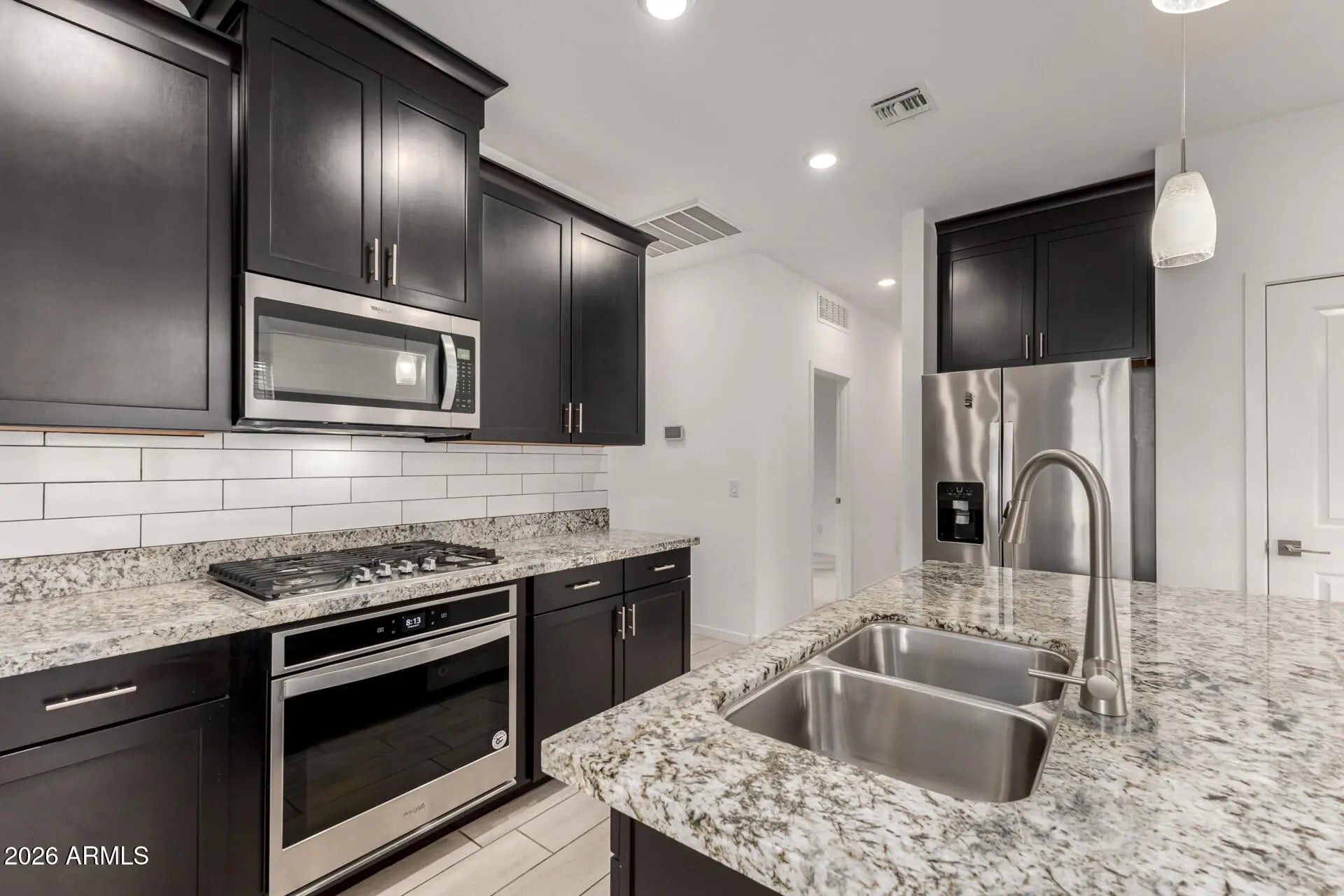 Welcome to this beautifully maintained newer home in the highly sought-after Homestead at Marley Park community in Surprise. Built in 2019, this thoughtfully designed 3-bedroom, 2-bath residence with a 2-car garage blends modern style with everyday comfort in all the right ways. Inside, wood-look tile flooring flows throughout the main living areas, creating a clean, cohesive feel that is both durable and elegant. The kitchen serves as the heart of the home, featuring striking black cabinetry, a classic white subway tile backsplash, granite countertops, stainless steel appliances, a spacious island with custom pendant lighting, a walk-in pantry, and a built-in gas cooktop paired with a separate wall oven for a true designer touch. The primary suite offers a quiet retreat with a large walk-in shower, dual vanities, an oversized walk-in closet, and additional linen storage to keep everything organized and within reach. Two additional bedrooms provide flexibility for guests, family, or a home office. Step outside to a low-maintenance backyard complete with a covered tile patio and extended paver hardscape, offering additional usable outdoor space without the upkeep of extensive landscaping. Living in Homestead at Marley Park means enjoying resort-style amenities just moments from your front door, including a beautifully appointed clubhouse with fitness center, fireplace lounge, and gathering spaces; outdoor dining areas with built-in gas grills and fire pit; a sparkling community pool with lap lanes and a children's splash area; basketball court, playgrounds, community garden beds, horseshoe pits, and multiple neighborhood parks. All of this is conveniently located near local schools, the Prasada shopping and entertainment district, Surprise spring training facilities, the City of Surprise Aquatic and Tennis Centers, restaurants, and everyday conveniences, making this home an exceptional opportunity to enjoy comfort, community, and convenience in one of Surprise's most popular neighborhoods.
