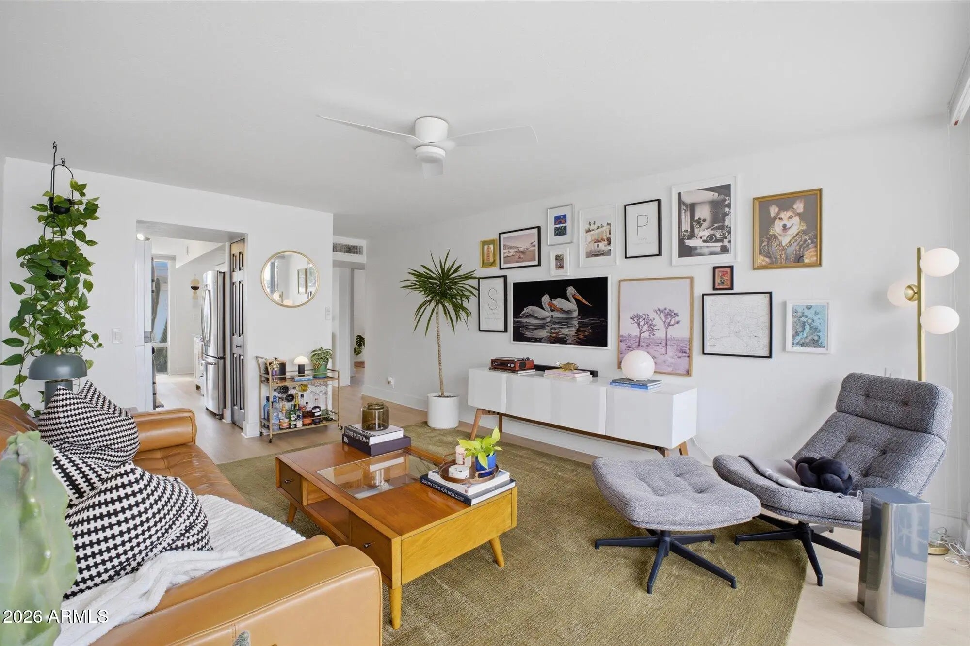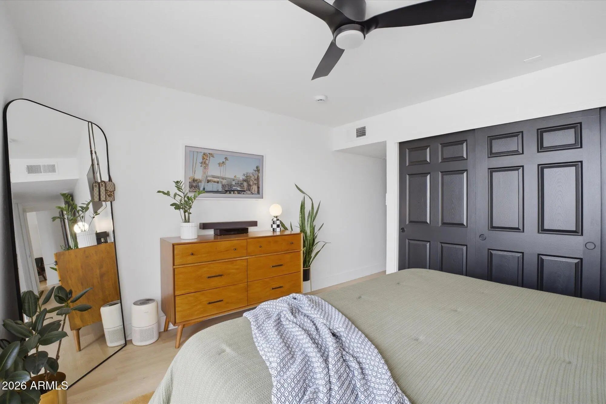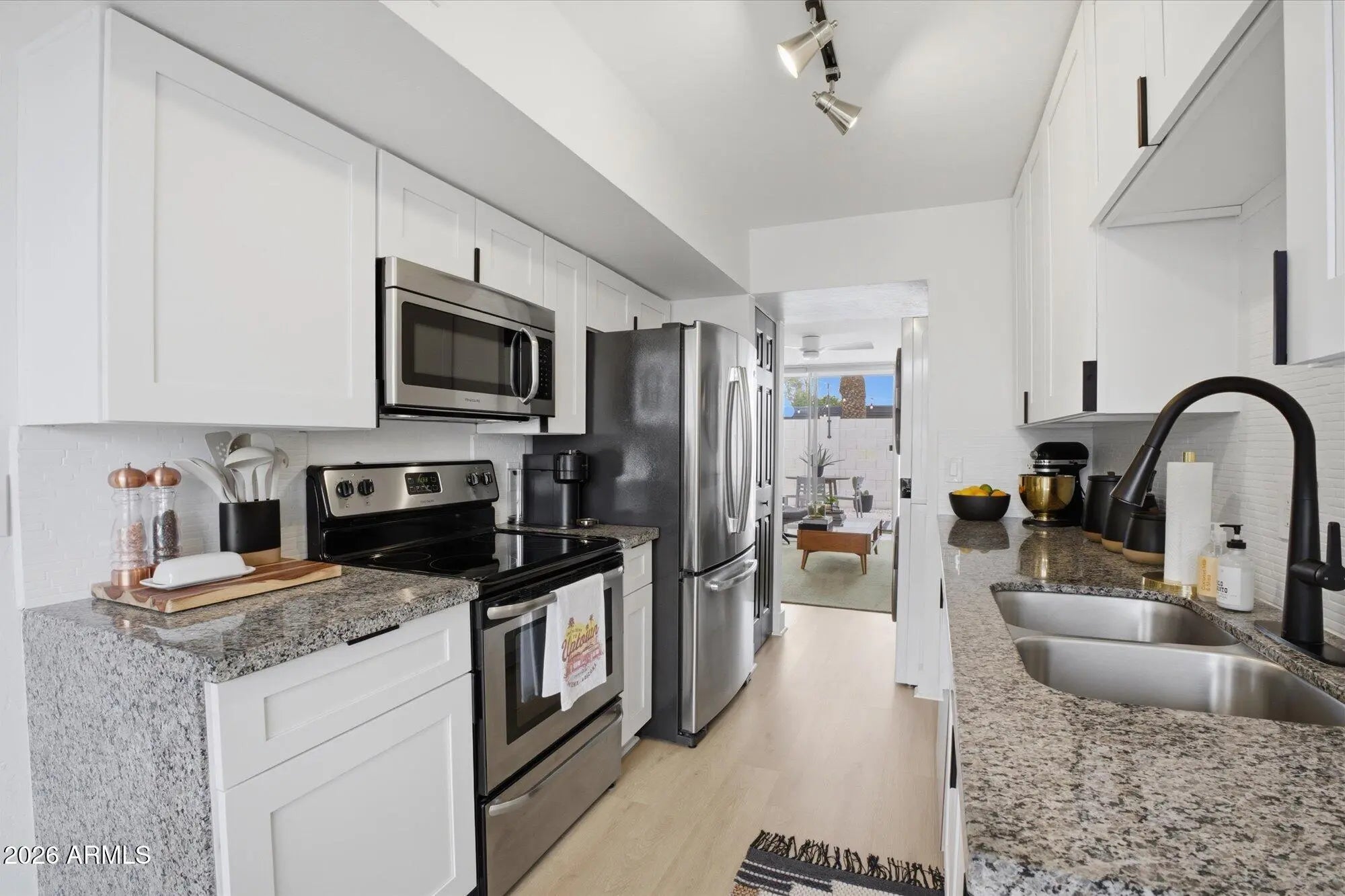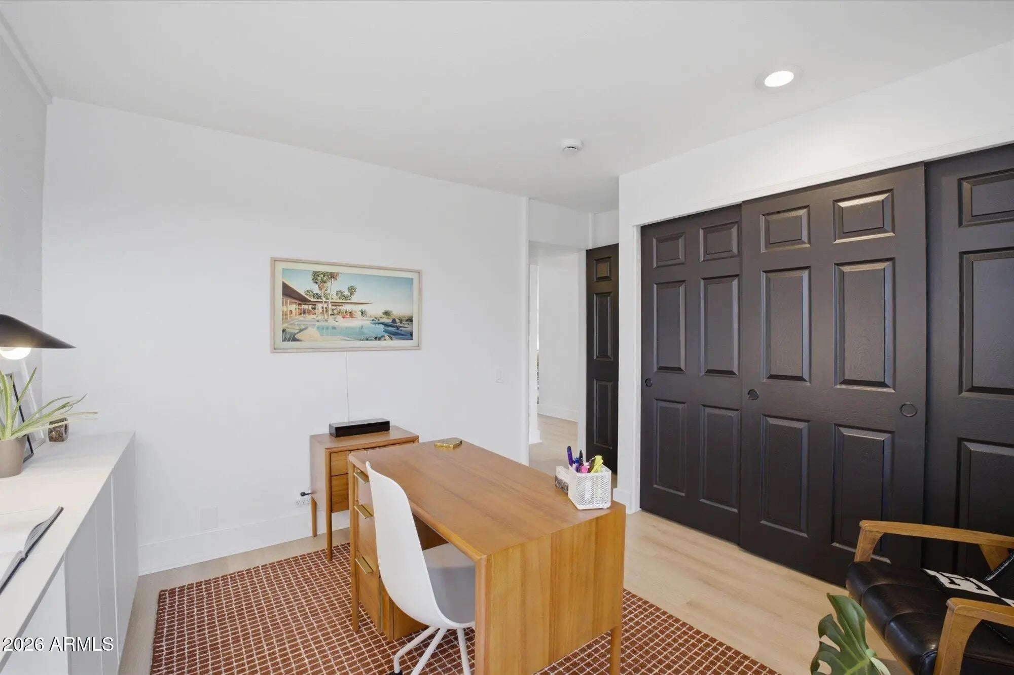 A favorite saying among mid-century enthusiasts is ''What would Beadle do?'' - and the answer is simple: purchase this residence and embrace the ultimate desert modern lifestyle! Located in the vibrant and highly desirable Grandview Neighborhood -affectionately known as the ''Neighborhood with Heart'' - this rare end-unit condo sits in the heart of the Melrose District, just moments from the iconic Melrose Mile along 7th Avenue with its beloved coffee shops, dining, bars, and vintage boutiques. Enjoy close proximity to Tawa Park at the end of the complex, along with easy access to light rail, major freeways, Downtown Phoenix (approximately 12 minutes), and Sky Harbor Airport. Designed by legendary mid-century modern architect Alfred Beadle, this prime end unit is a true Beadle Box - a rare opportunity to own an authentic piece of Phoenix architectural history within a small, boutique garden-style community of just 27 residences. With only one shared wall, no neighbors above or below, and solid block construction, the home lives more like a single-family residence: private, quiet, and filled with natural light. The unit backs to the community pool and lush grass area, offering added privacy and serene views. Inside, iconic mid-century details shine with slump block walls, clean lines, and expansive floor-to-ceiling glass doors and windows that create a bright, airy atmosphere. Fully updated and completely move-in ready, the home features new LVP flooring throughout, fresh interior paint, custom top-down/bottom-up window shades, new lighting, fans, fixtures, and an Ecobee smart thermostat. The updated kitchen blends style and function with stainless steel appliances (including a new dishwasher), waterfall-edge granite countertops, and seamless indoor/outdoor flow. Large sliding glass doors open to a private covered patio, perfect for enjoying Arizona's beautiful weather year-round. The spacious primary bedroom offers direct patio access as well, custom closet organization, and a tranquil retreat-like feel. A second generously sized bedroom includes a large closet, and both bathrooms have been refreshed with new vanities, fixtures, and toilets. Additional upgrades include a new water heater (2024), new LG smart WashTower (2024) conveniently located in-unit, and HVAC updated (2018). The Grandview Gardens community features a sparkling pool with refreshed patio furnishings (2025). Included with the unit is one reserved covered carport parking space, additional guest permit parking, ample street parking, and a dedicated storage unit. Beyond the home itself, Grandview is known for its strong sense of connection, hosting community events throughout the year including Front Yard Fridays, holiday gatherings, and neighborhood socials, adding to the true community feel that makes this area so special. The HOA is extremely well managed and includes your water, sewer, trash, roof repair and replacement (brand-new roof in 2024), blanket insurance, pest control, and exterior landscaping and maintenance. Thoughtfully curated to honor its 1963 mid-century roots, this home is equal parts architectural statement and effortless lifestyle - ideal as a primary residence, lock-and-leave winter retreat, or stylish urban escape. WELCOME HOME TO GRANDVIEW!