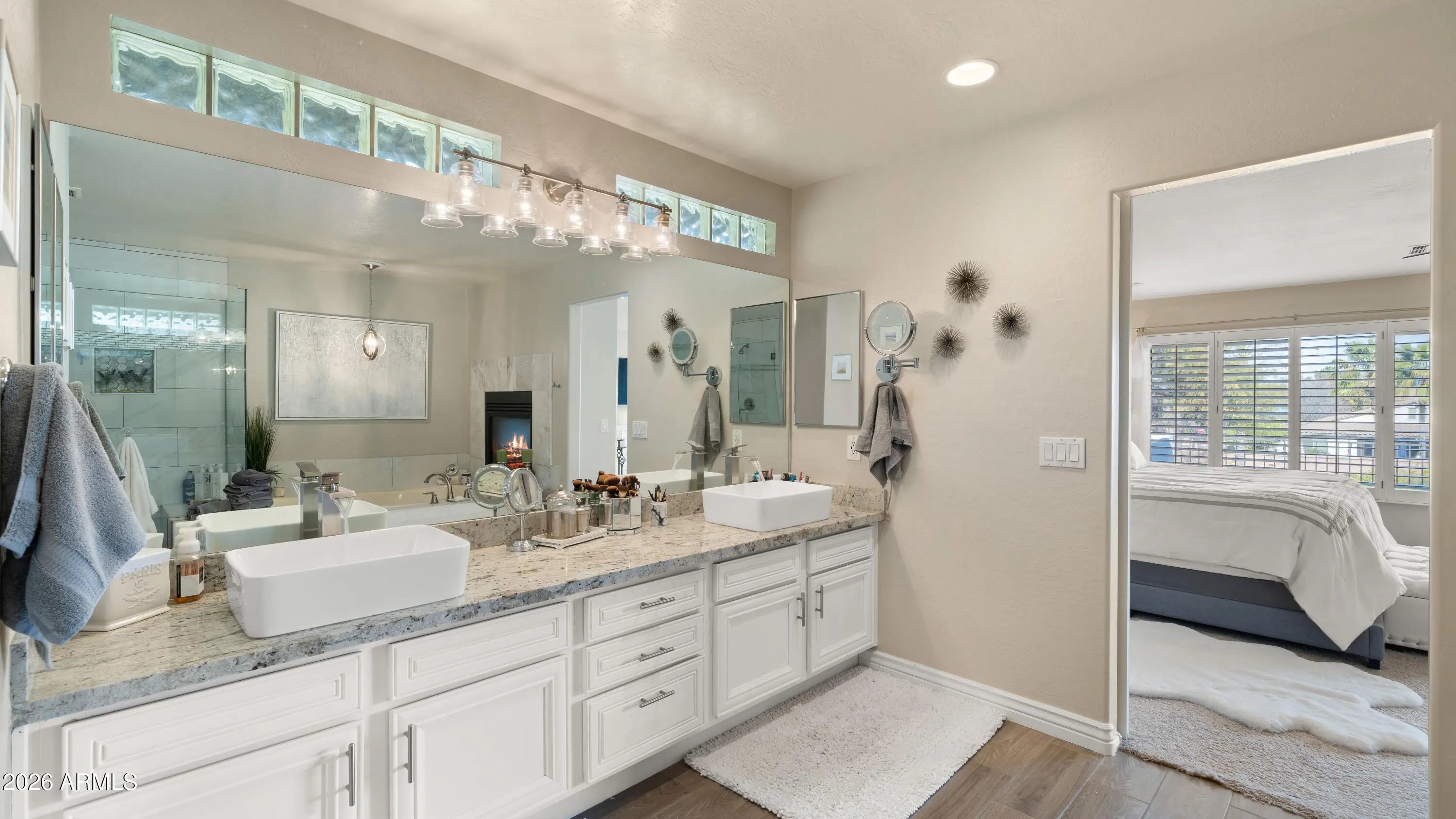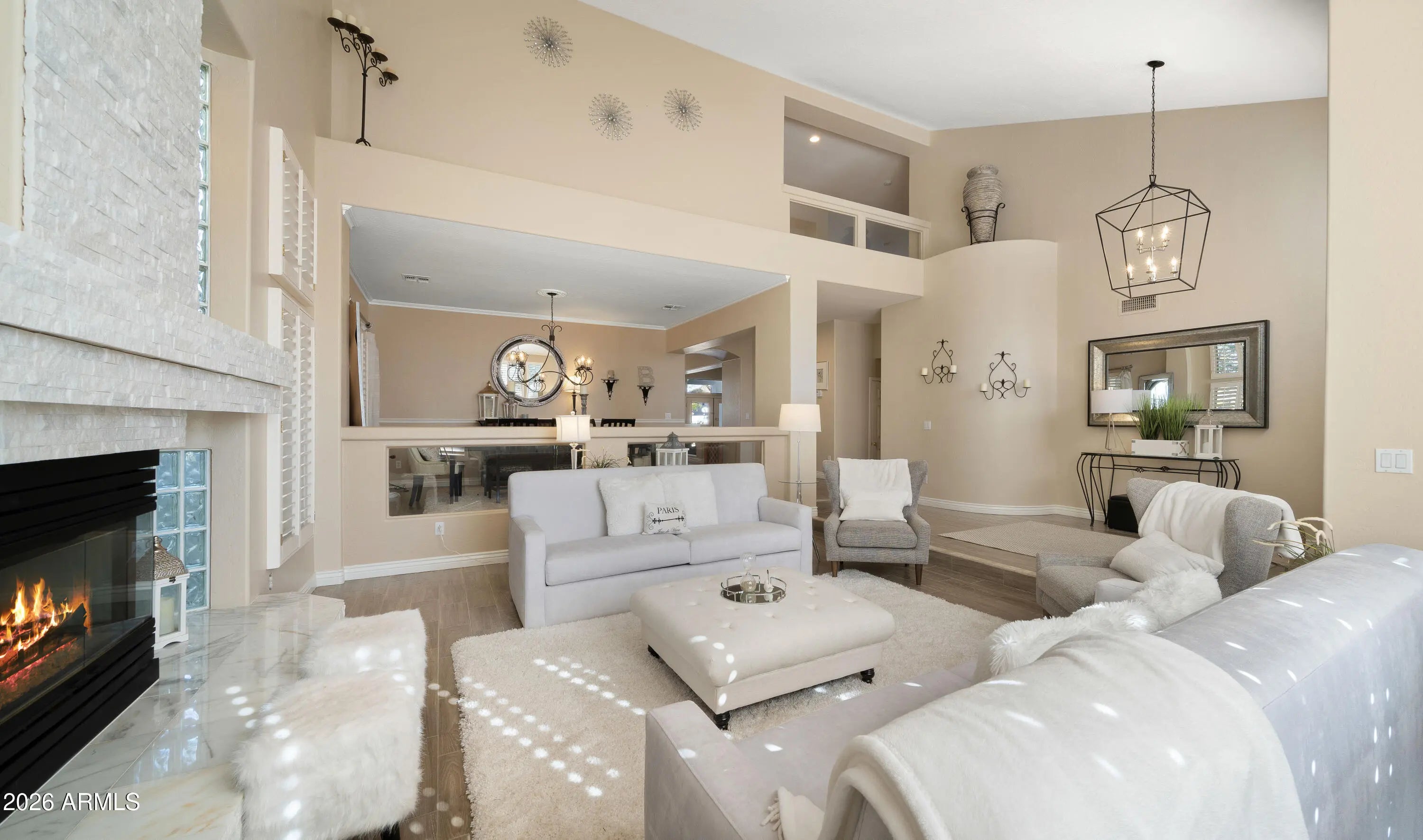 Stunning, meticulously maintained 5-bedroom, 3.5-bath home with a 4-car garage on a prime N/S corner lot in the gated Symphony 2 community in Chandler. This beautifully remodeled property features custom wood shutters throughout home, an open-concept floorplan and a true entertainer's kitchen with quartz countertops, built-in appliances and a resort-style backyard. The spacious kitchen opens seamlessly to the oversized family room and bar that is perfect for hosting. A formal dining room and expansive formal living area with a beautiful fireplace provide additional space for gatherings. Upstairs offers four generous bedrooms in a desirable split layout, plus a second upstairs family/entertainment room ideal for a game room, playroom, or fitness area.... The massive primary suite has a two-way gas fireplace, separate tub and large shower. Also a walkout deck. A private bedroom ensuite downstairs is perfect for guests. Enjoy beautifully matured landscape front and backyards, a full upper walkout deck, and an incredibly private backyard that backs to a common area. Outdoor amenities include a PebbleTec diving pool, large grass area and a half sport court, creating the ultimate Arizona outdoor retreat. Ideally located within walking distance to Santan Elementary and Santan Jr High. Quick access to the Price Corridor and Chandler's thriving high-tech business hub including Intel, Orbital Science, PayPal, and the Wells Fargo Corporate Center. Minutes to top-rated dining, premier shopping, Chandler Fashion Center, Shoppes at Casa Paloma, Chandler Pavilions, Phoenix Premium Outlets, and the charm of Historic Downtown Chandler. Easy to show don't miss this must-see home!