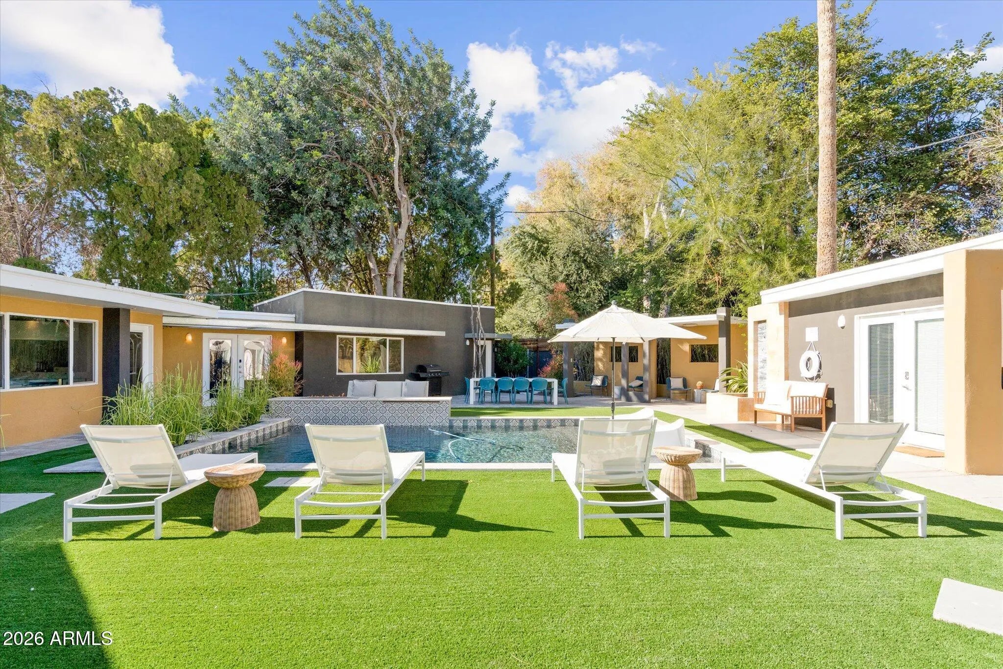 One of a kind, mid-century modern retreat with professional, artistic design blending architecture and curated detail throughout. This thoughtfully updated property features an open-concept layout, clean lines, and abundant natural light. The spacious primary suite offers soaring ceilings and a spa-inspired bath with a freestanding soaking tub and custom tile shower. Ensuite's with private patio access. Guest house provides ideal space for visitors or income potential. Enjoy seamless indoor-outdoor living with shaded courtyards, turf, and inviting entertaining areas. A built-in bar and contemporary finishes complete this move-in-ready gem.