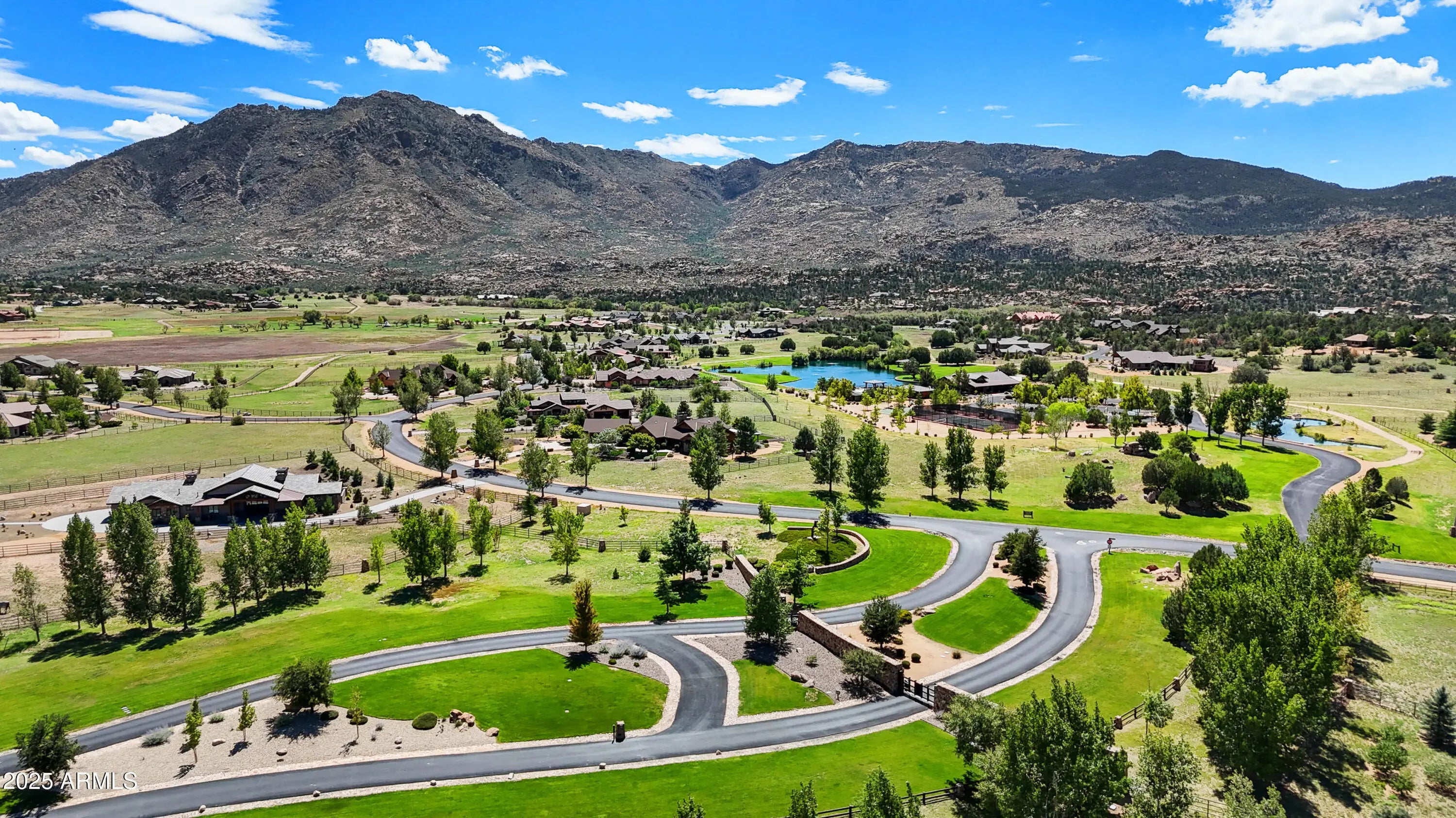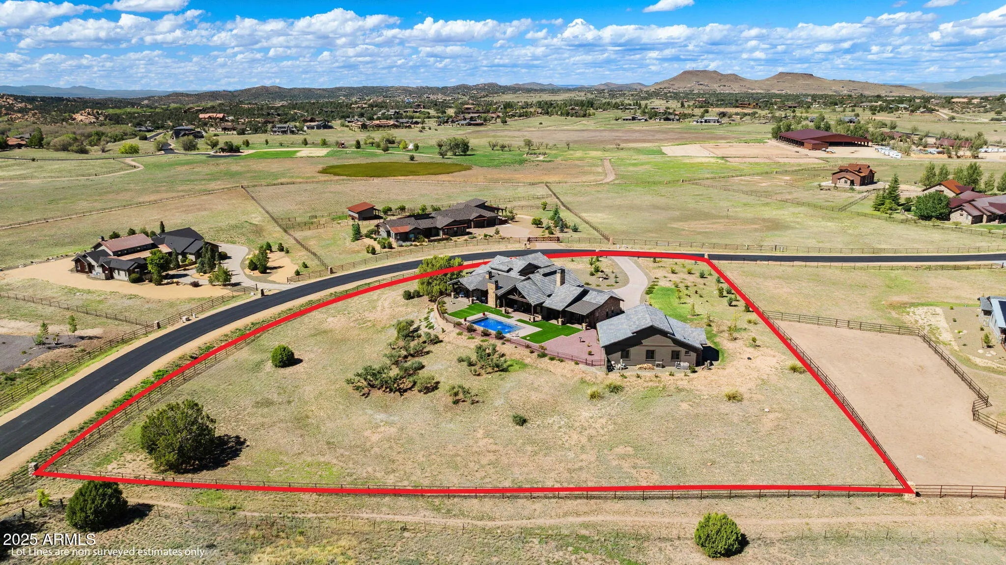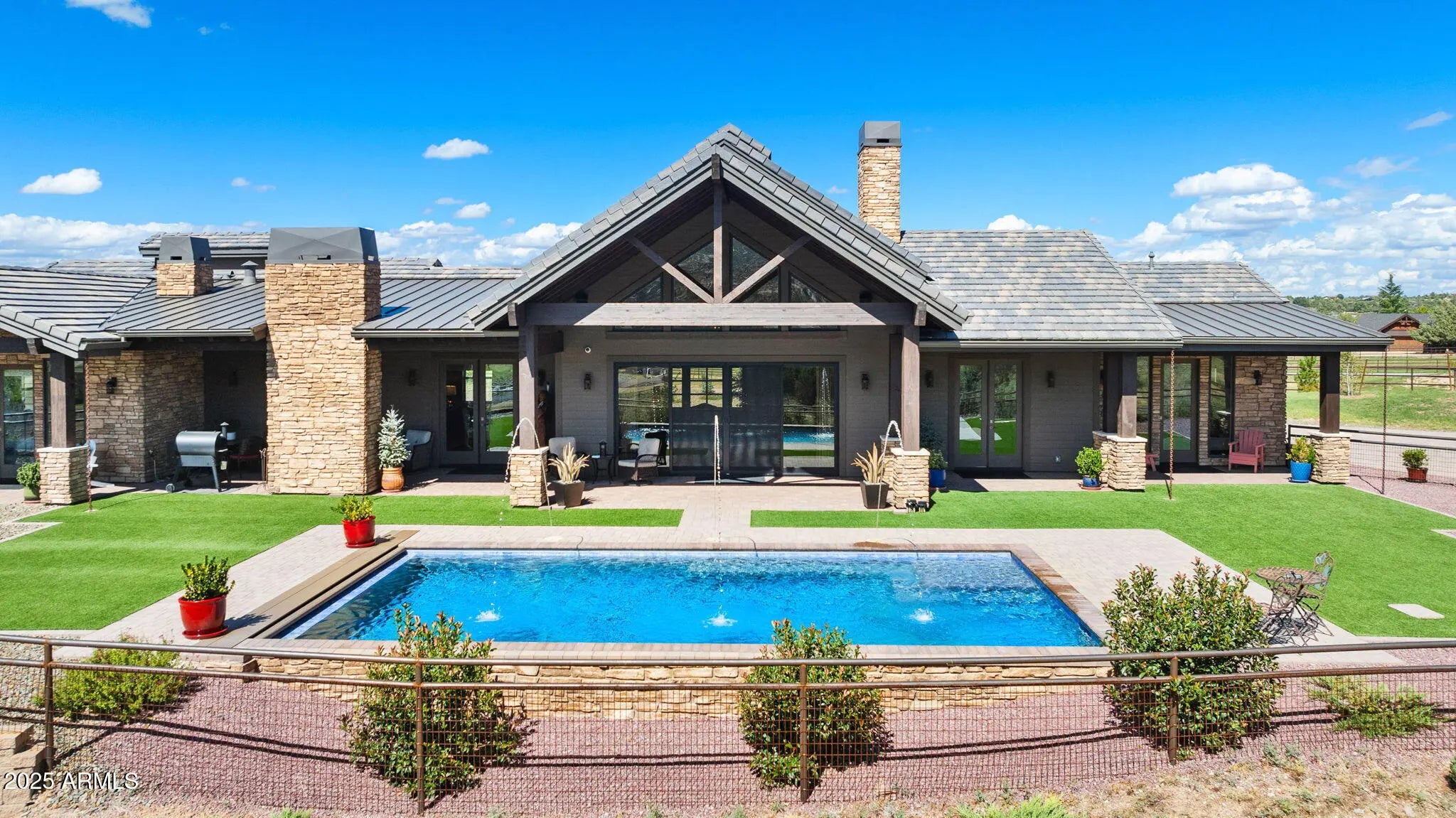 A Masterpiece of Design with Unrivaled Views of Granite Mountain. Perched to capture sweeping panoramic views of Granite Mountain, this extraordinary custom-built 2023 residence by Hughes Building Co. redefines luxury living in the prestigious gated community of American Ranch. Every detail of this 3,046 sq ft single-level home reflects exceptional craftsmanship and designer-selected finishes, blending rustic elegance with modern sophistication. The chef's kitchen is a culinary showpiece, featuring an oversized Wolfe 8-burner range, oversized Sub-Zero refrigerator, Wolf double ovens, pot filler, dual sinks, and a morning pantry with an additional refrigerator and wine cooler. The open great room is anchored by soaring beamed ceilings and a striking floor-to-ceiling stone fireplace, creating a warm and inviting atmosphere. Two luxurious primary suites offer spacious closets and vanities, with one thoughtfully designed to include a stacked washer and dryer for ultimate convenience. Throughout the home, hand-selected materials-- from counters to ceiling-height tile and a stunning wood-and-glass entry door-- reflect a timeless sense of style. Seamless indoor-outdoor living is at the heart of this property. Step onto the expansive patio where a second stone fireplace invites evening gatherings, or relax in the 16' x 30' heated swimming pool with an automatic safety cover, surrounded by the beauty of nature. The fenced backyard includes turf and a dog run, blending function with elegance. For car enthusiasts or hobbyists, the estate boasts a 918 sq ft three-car garage, plus an additional 1,354 sq ft barn-style garage--heated, cooled, and equipped with 220V power and a bathroom. With custom window coverings and designer finishes this home is better than new! American Ranch offers a lifestyle beyond compare with a clubhouse, fitness center, tennis, pickle ball, basketball, and sand volleyball courts, a heated community pool, pool Ranch House, and a large catch-and-release fishing lake. The professionally managed equestrian center provides boarding and access to scenic riding trails, and this property allows for horses. Set on over 2.3 acres just six miles from Pioneer Parkway, this home offers unmatched privacy, luxury, and convenience, all framed by the iconic beauty of Granite Mountain and Prescott's National Forest.