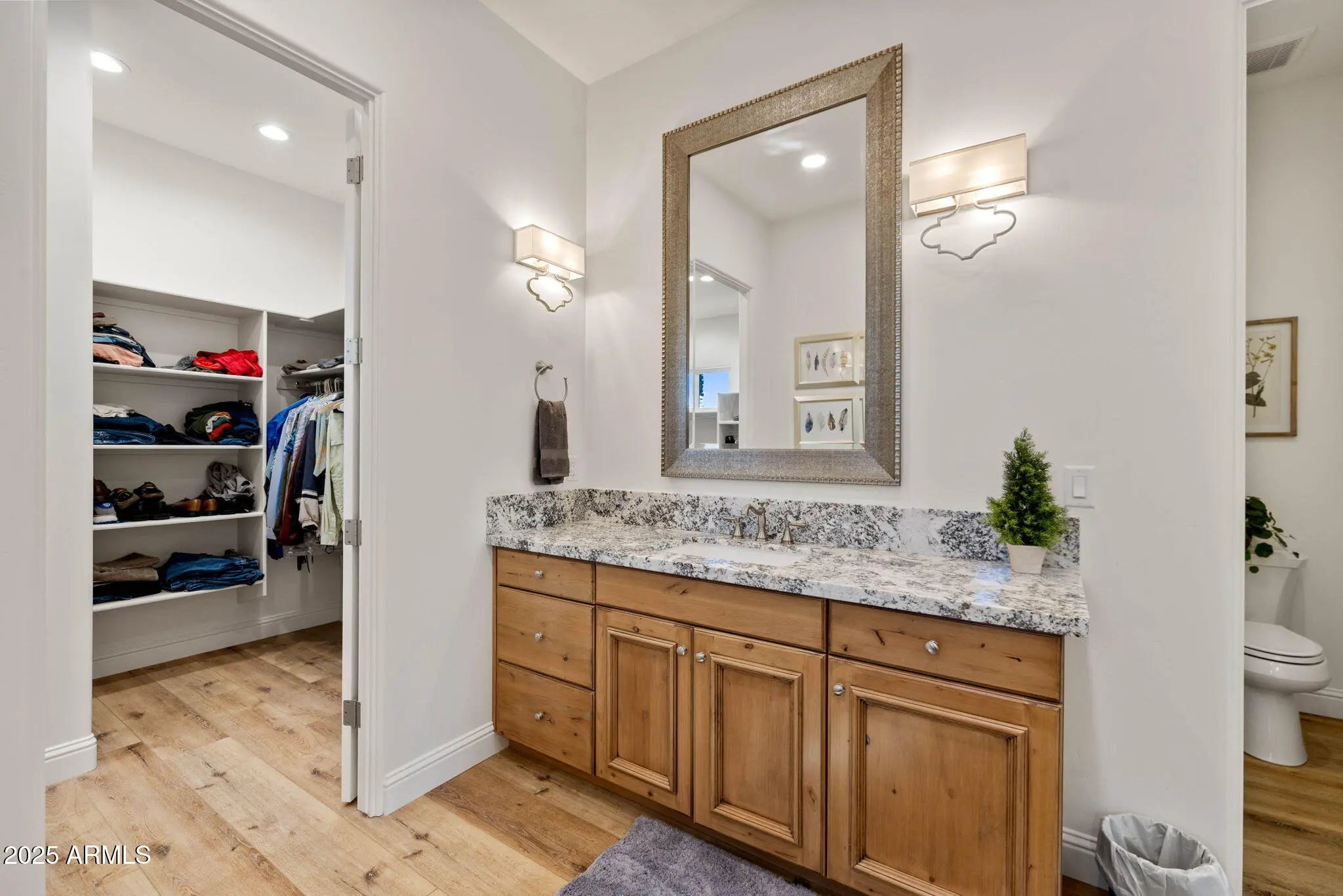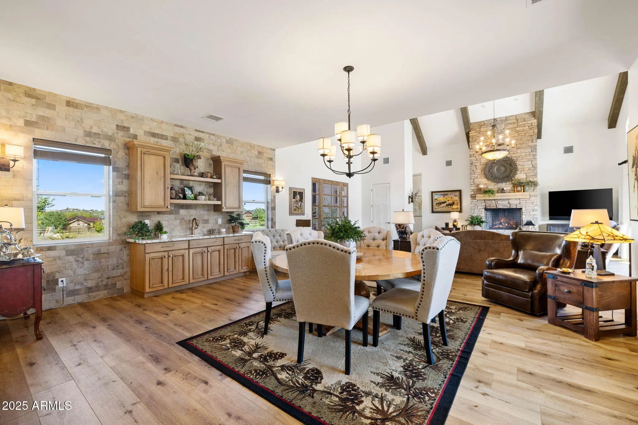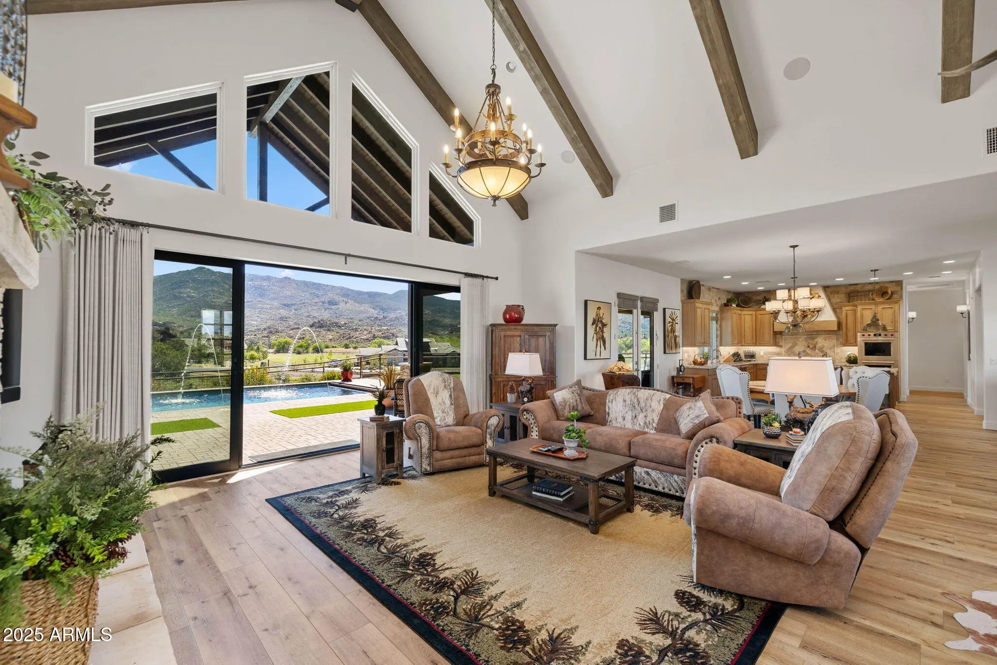 A Masterpiece of Design with Unrivaled Views of Granite Mountain. Perched to capture sweeping panoramic views of Granite Mountain, this extraordinary custom-built 2023 residence by Hughes Building Co. redefines luxury living in the prestigious gated community of American Ranch. Every detail of this 3,046 sq ft single-level home reflects exceptional craftsmanship and designer-selected finishes, blending rustic elegance with modern sophistication. The chef's kitchen is a culinary showpiece, featuring an oversized Wolfe 8-burner range, oversized Sub-Zero refrigerator, Wolf double ovens, pot filler, dual sinks, and a morning pantry with an additional refrigerator and wine cooler. The open great room is anchored by soaring beamed ceilings and a striking floor-to-ceiling stone fireplace, creating a warm and inviting atmosphere. Two luxurious primary suites offer spacious closets and vanities, with one thoughtfully designed to include a stacked washer and dryer for ultimate convenience. Throughout the home, hand-selected materials-- from counters to ceiling-height tile and a stunning wood-and-glass entry door-- reflect a timeless sense of style. Seamless indoor-outdoor living is at the heart of this property. Step onto the expansive patio where a second stone fireplace invites evening gatherings, or relax in the 16' x 30' heated swimming pool with an automatic safety cover, surrounded by the beauty of nature. The fenced backyard includes turf and a dog run, blending function with elegance. For car enthusiasts or hobbyists, the estate boasts a 918 sq ft three-car garage, plus an additional 1,354 sq ft barn-style garage--heated, cooled, and equipped with 220V power and a bathroom. With custom window coverings and designer finishes this home is better than new! American Ranch offers a lifestyle beyond compare with a clubhouse, fitness center, tennis, pickle ball, basketball, and sand volleyball courts, a heated community pool, pool Ranch House, and a large catch-and-release fishing lake. The professionally managed equestrian center provides boarding and access to scenic riding trails, and this property allows for horses. Set on over 2.3 acres just six miles from Pioneer Parkway, this home offers unmatched privacy, luxury, and convenience, all framed by the iconic beauty of Granite Mountain and Prescott's National Forest.