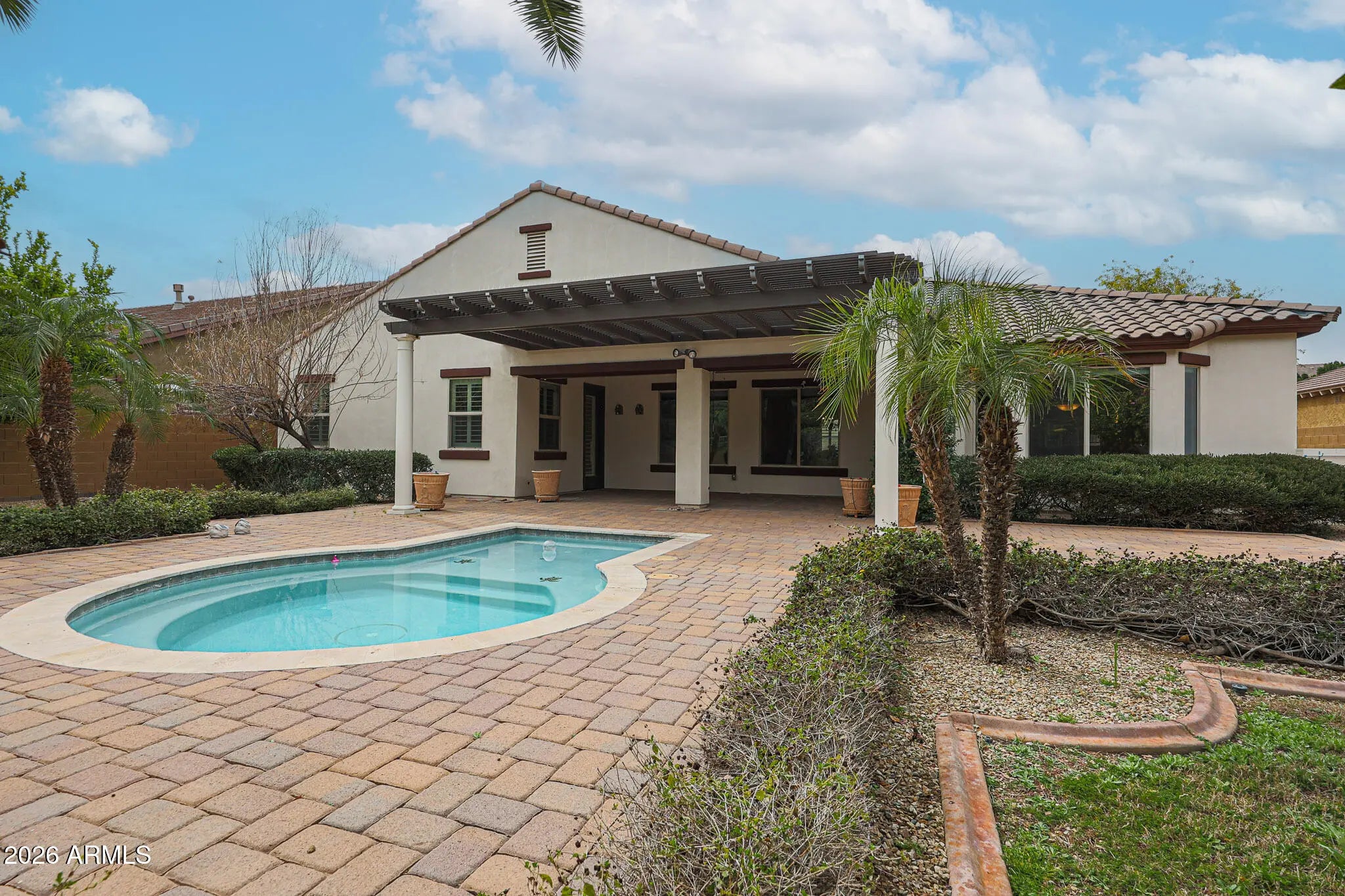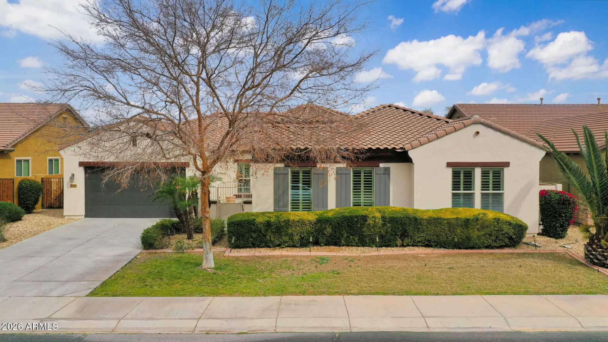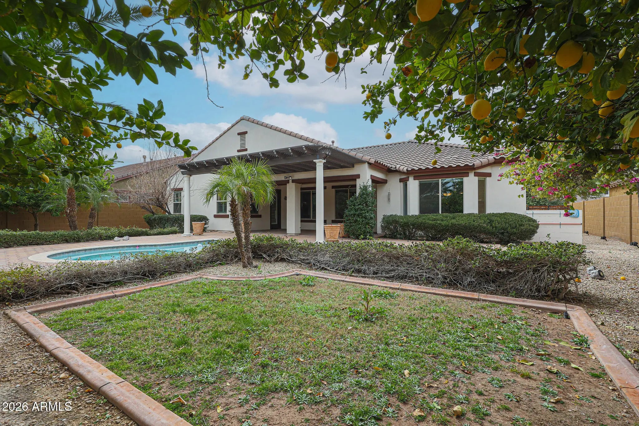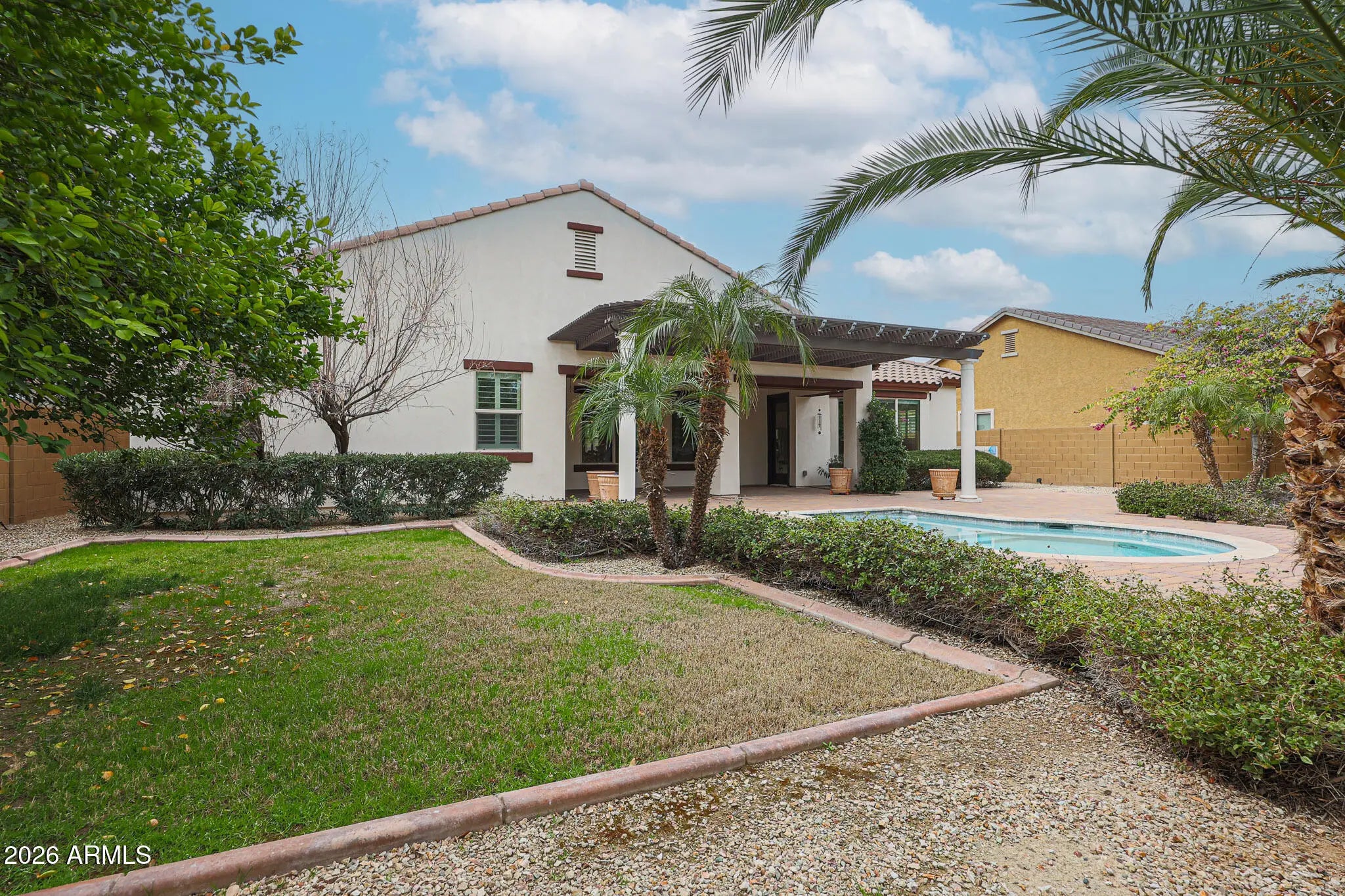 Welcome to this beautifully maintained 4-bedroom, 3-bath home tucked inside the highly desirable gated community of Portales - where everyday living feels just a little more elevated. From the moment you arrive, the lush, mature landscaping and private gated courtyard set the tone, offering a warm, welcoming entry that feels both elegant and intimate. Step inside and you'll immediately notice the light-filled, open floor plan designed for connection and comfort. Neutral tile flooring flows throughout the entire home - no carpet - creating a clean, cohesive look that's as practical as it is beautiful. Classic plantation shutters add timeless charm while offering privacy and energy efficiency. This thoughtfully designed layout provides exceptional flexibility for today's lifestyle. Host memorable dinner parties in the formal dining room, create your ideal work-from-home setup in the bonus/flex space, or design a cozy conversation room or reading retreat. The spacious great room is truly the heart of the home, anchored by a stunning custom wood entertainment center that makes movie nights and game days feel special. The kitchen is a dream for both daily living and entertaining. White cabinetry, granite countertops, double ovens, and a gas cooktop make meal prep a pleasure, while the open design keeps you connected to family and guests. The adjoining informal dining area features a charming bay window that fills the space with natural light and frames peaceful backyard views - turning even casual meals into a moment to enjoy. Privately situated, the primary suite offers a serene retreat at the end of the day and provides direct access to the backyard. The spa-inspired ensuite bath features dual sinks, a soaking tub, a fully tiled walk-in shower, and a generous walk-in closet - designed to feel like your own personal sanctuary. On the opposite side of the home, three oversized secondary bedrooms and two full bathrooms provide comfortable accommodations for family or guests. Each bedroom offers direct access to a spacious teen room/bonus room - an ideal hangout space for homework, gaming, or simply relaxing with friends. This split layout ensures privacy while still keeping everyone connected. Step outside and experience true Arizona living. Your private backyard oasis is designed for both relaxation and entertaining, complete with a low-maintenance sparkling pool at the center, an expansive covered patio with an extended pergola, and a paver patio perfect for outdoor gatherings. Mature landscaping, including lemon and citrus trees, adds beauty and charm, while gas plumbing is already in place for your dream BBQ setup. With no neighbors directly behind and peaceful common space views, you'll enjoy added privacy and tranquility. This is more than just a home - it's a lifestyle. A place where gatherings are effortless, quiet moments are cherished, and lasting memories are made.