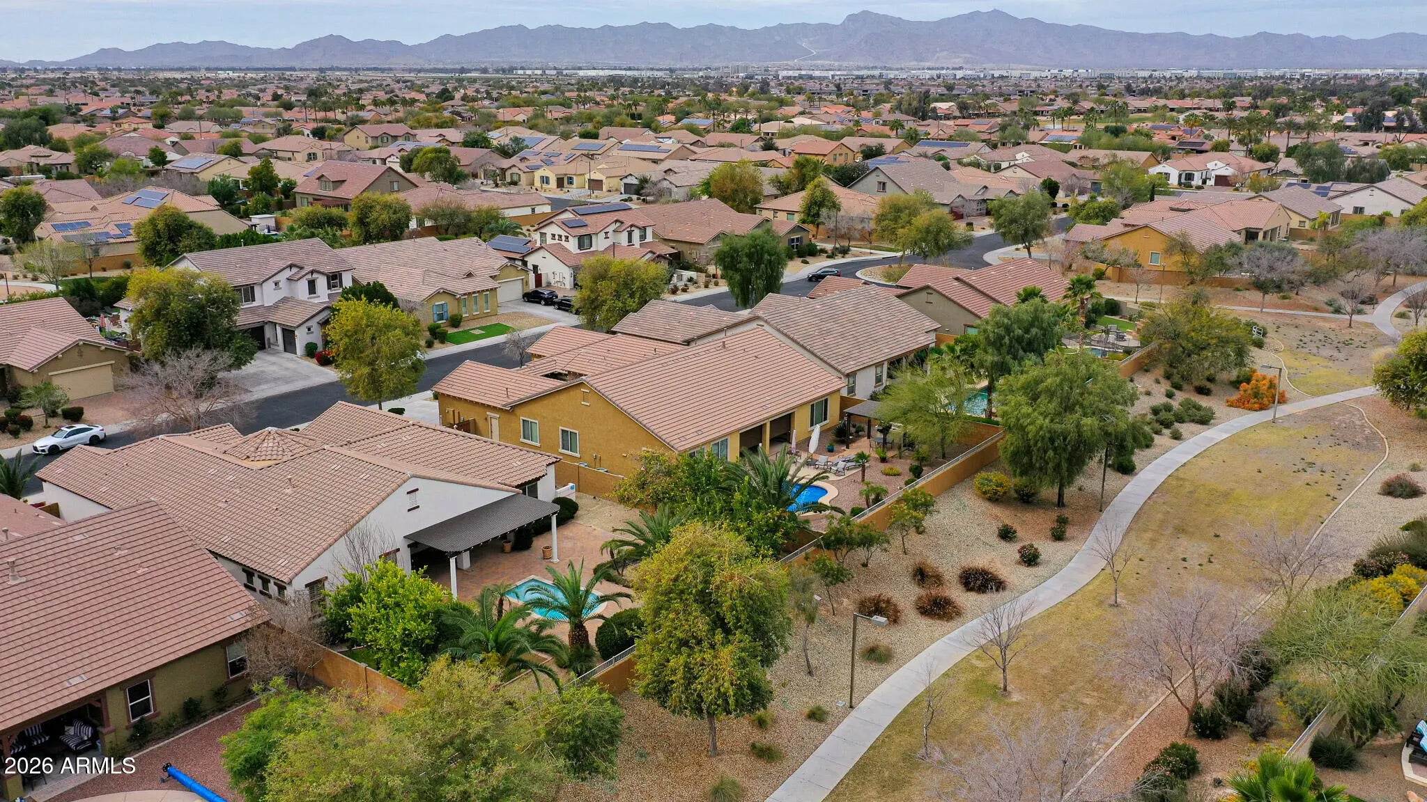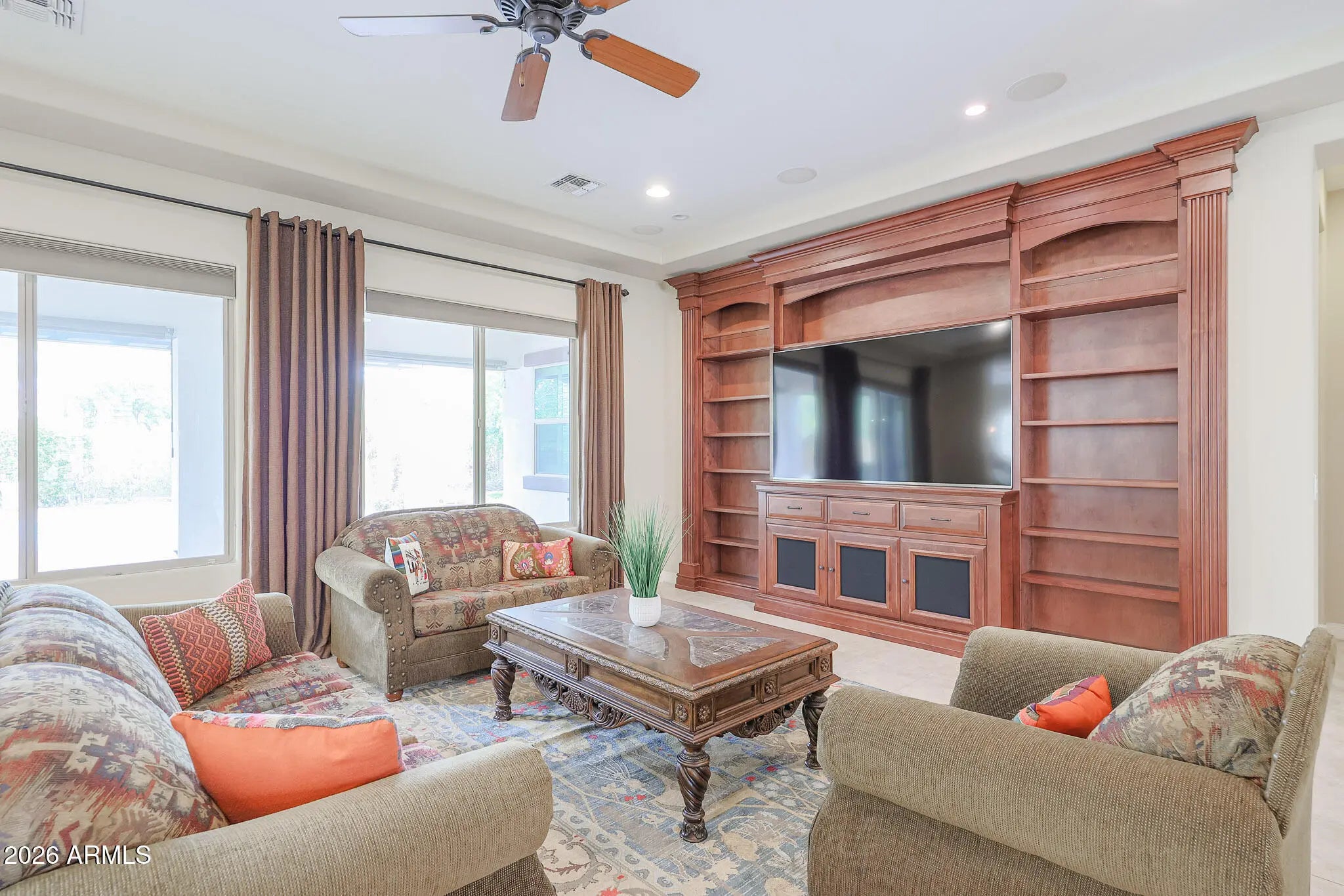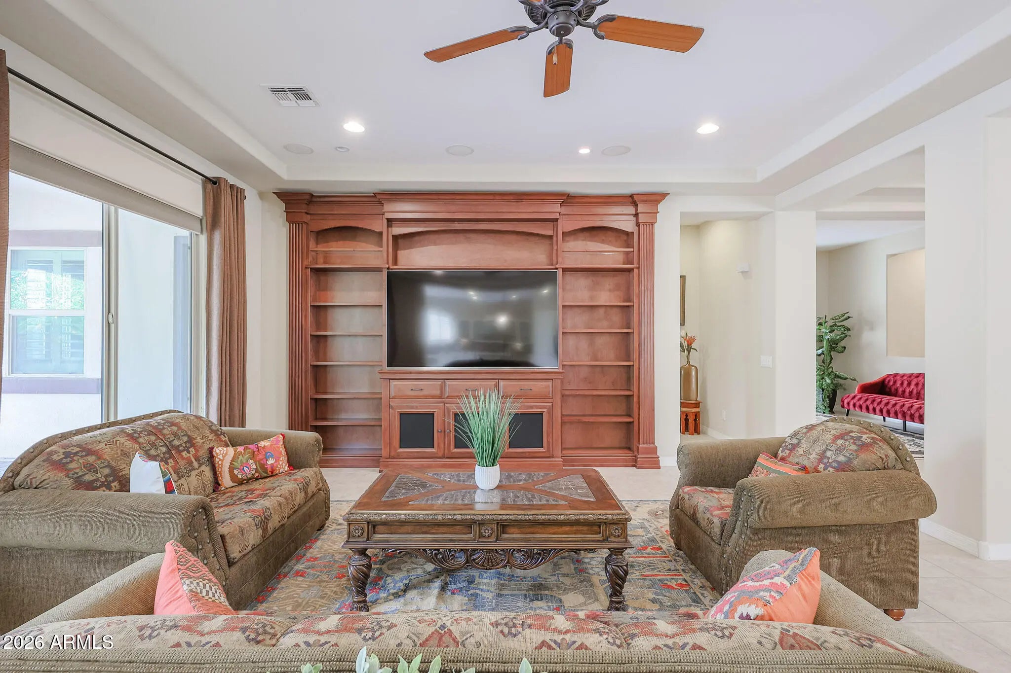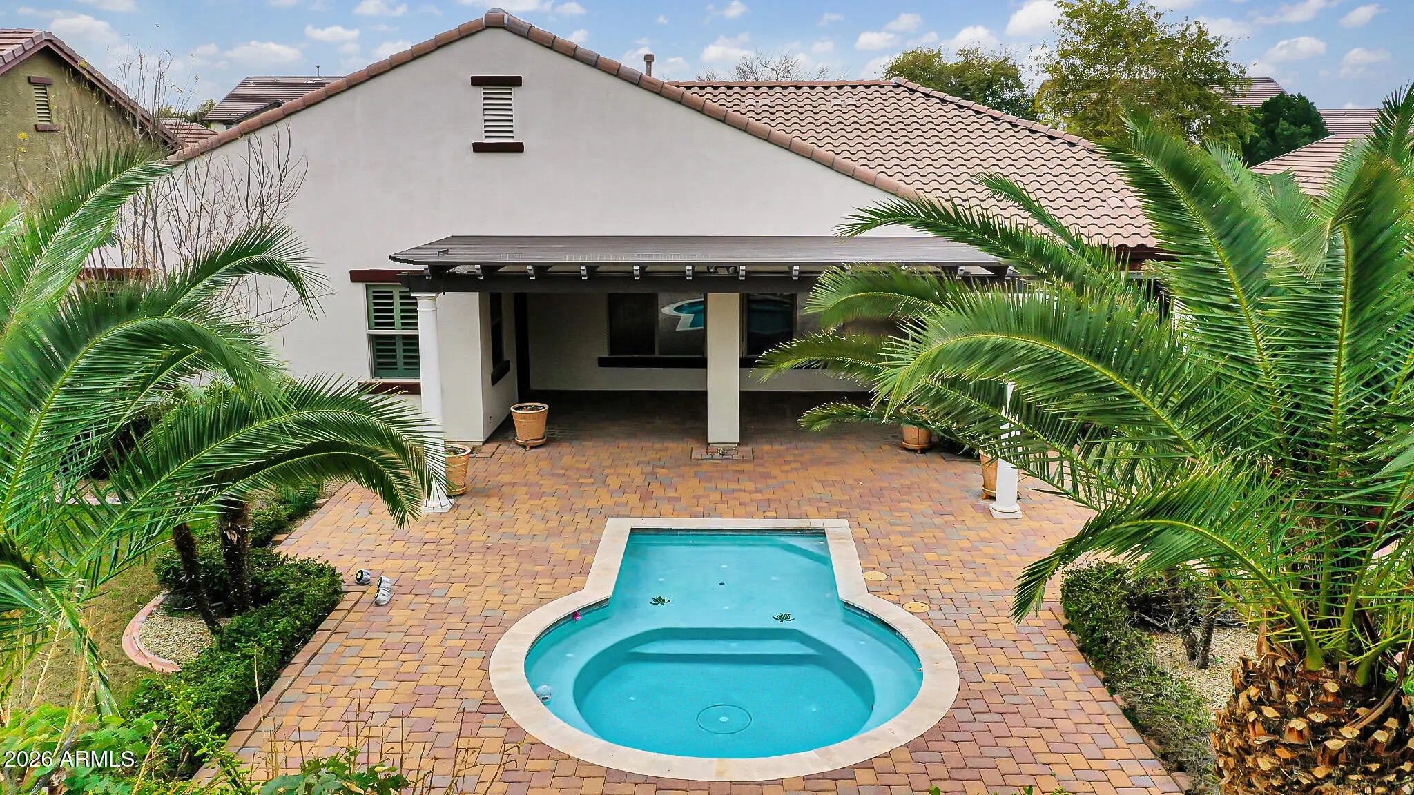 Welcome to this beautifully maintained 4-bedroom, 3-bath home tucked inside the highly desirable gated community of Portales - where everyday living feels just a little more elevated. From the moment you arrive, the lush, mature landscaping and private gated courtyard set the tone, offering a warm, welcoming entry that feels both elegant and intimate. Step inside and you'll immediately notice the light-filled, open floor plan designed for connection and comfort. Neutral tile flooring flows throughout the entire home - no carpet - creating a clean, cohesive look that's as practical as it is beautiful. Classic plantation shutters add timeless charm while offering privacy and energy efficiency. This thoughtfully designed layout provides exceptional flexibility for today's lifestyle. Host memorable dinner parties in the formal dining room, create your ideal work-from-home setup in the bonus/flex space, or design a cozy conversation room or reading retreat. The spacious great room is truly the heart of the home, anchored by a stunning custom wood entertainment center that makes movie nights and game days feel special. The kitchen is a dream for both daily living and entertaining. White cabinetry, granite countertops, double ovens, and a gas cooktop make meal prep a pleasure, while the open design keeps you connected to family and guests. The adjoining informal dining area features a charming bay window that fills the space with natural light and frames peaceful backyard views - turning even casual meals into a moment to enjoy. Privately situated, the primary suite offers a serene retreat at the end of the day and provides direct access to the backyard. The spa-inspired ensuite bath features dual sinks, a soaking tub, a fully tiled walk-in shower, and a generous walk-in closet - designed to feel like your own personal sanctuary. On the opposite side of the home, three oversized secondary bedrooms and two full bathrooms provide comfortable accommodations for family or guests. Each bedroom offers direct access to a spacious teen room/bonus room - an ideal hangout space for homework, gaming, or simply relaxing with friends. This split layout ensures privacy while still keeping everyone connected. Step outside and experience true Arizona living. Your private backyard oasis is designed for both relaxation and entertaining, complete with a low-maintenance sparkling pool at the center, an expansive covered patio with an extended pergola, and a paver patio perfect for outdoor gatherings. Mature landscaping, including lemon and citrus trees, adds beauty and charm, while gas plumbing is already in place for your dream BBQ setup. With no neighbors directly behind and peaceful common space views, you'll enjoy added privacy and tranquility. This is more than just a home - it's a lifestyle. A place where gatherings are effortless, quiet moments are cherished, and lasting memories are made.