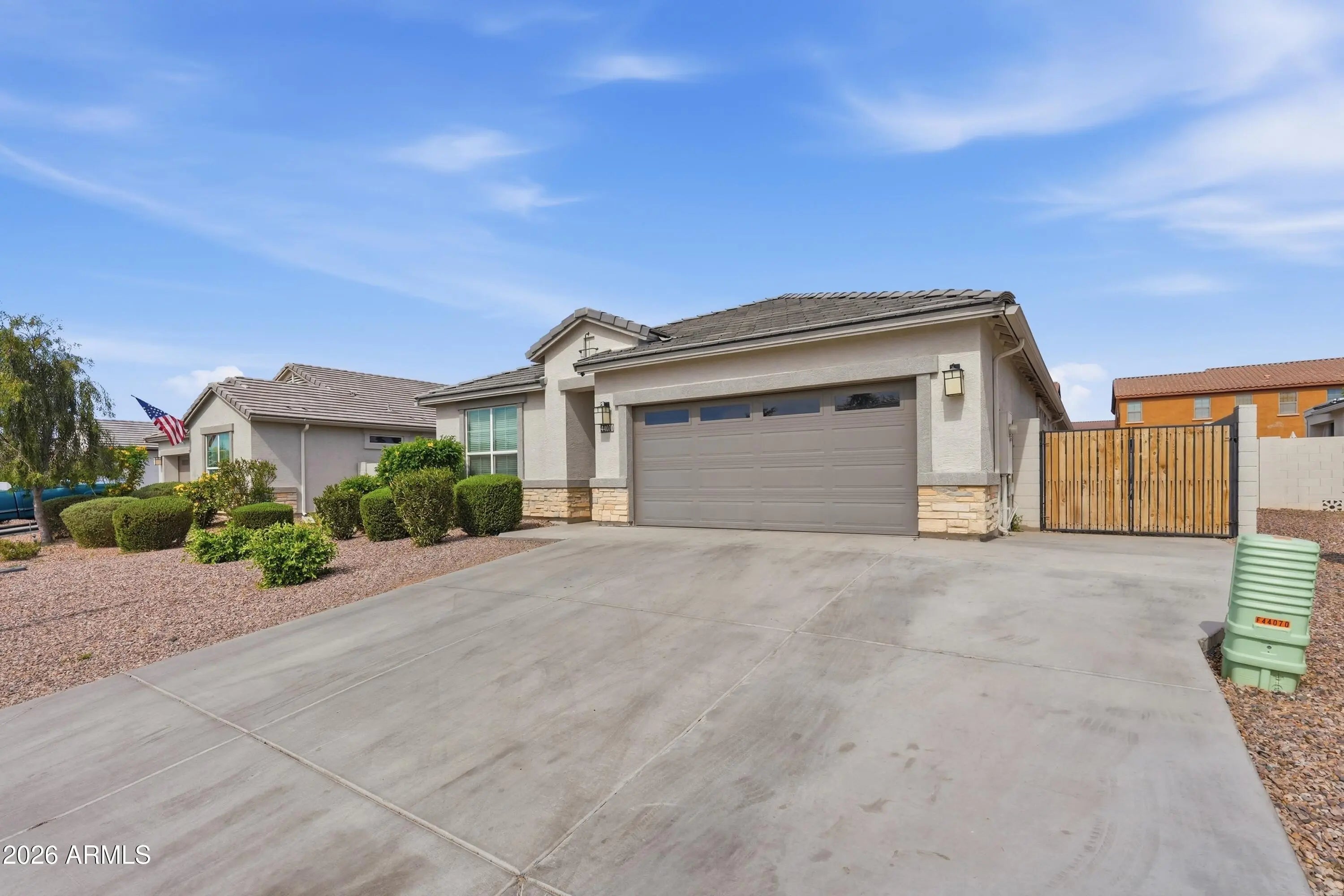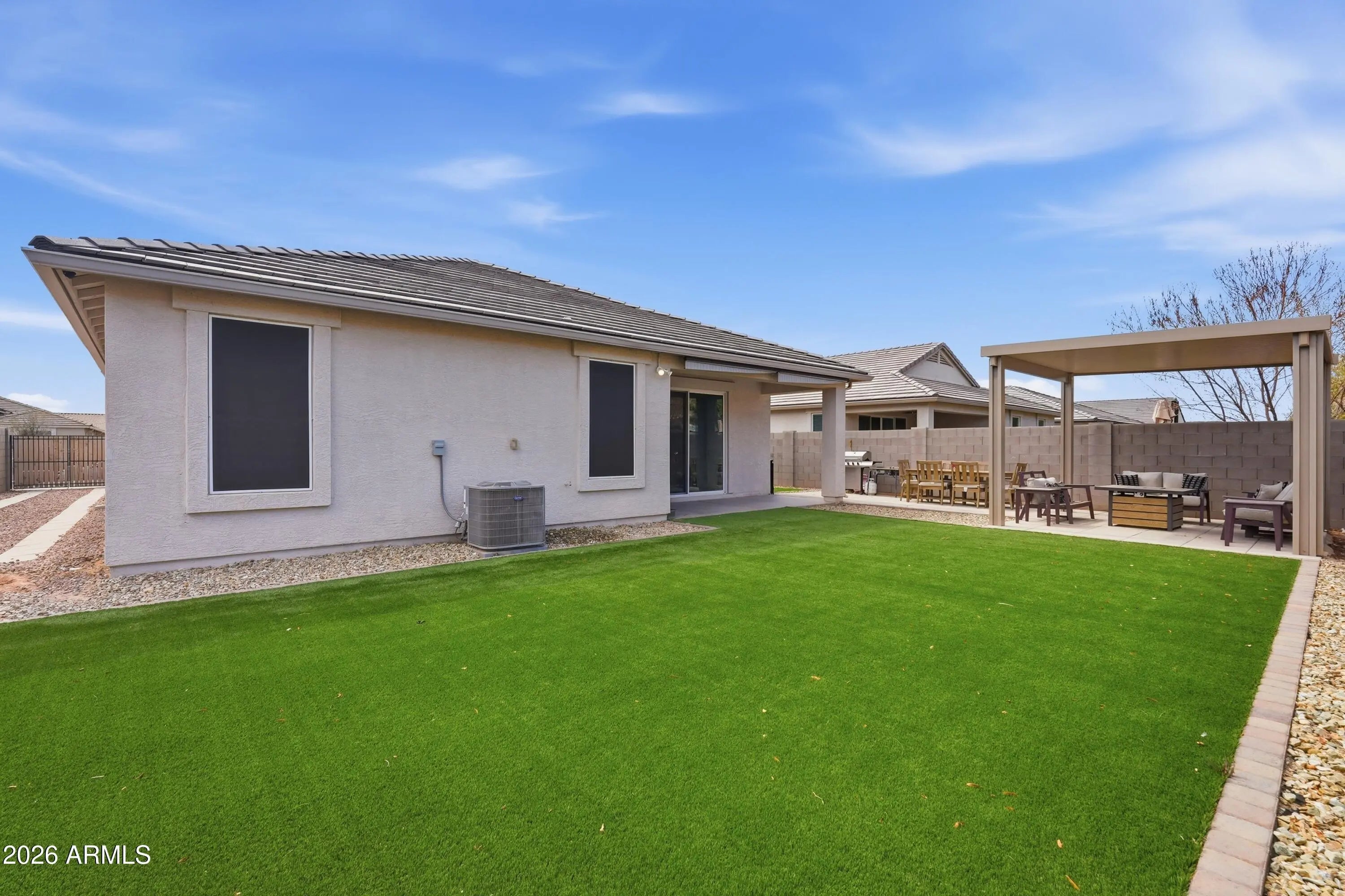 Beautiful Boulder Floorplan, single Level, 2366 sq ft, w/ 11' ceiling height in Great Room! Featuring 4 bedrooms-including a guest suite and a spacious primary suite, both with ensuite bathrooms-plus a third full bathroom. White cabinets, quartz kitchen counter-tops, stainless-steel appliances, tile throughout, oversized shower in primary bath, 2 tone interior paint, soft water, 12' patio slider, shade gazebo & artificial turf complete the backyard. Conveniently located off John Wayne Pkwy (347) minutes from Copper Sky Rec Center & Harrah's Ak-Chin Casino. NOTE: FHA loan is assumable. Current interest rate is 4.5%.