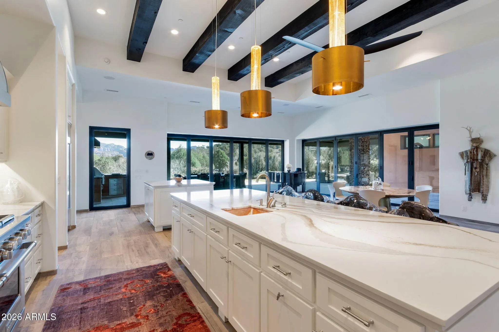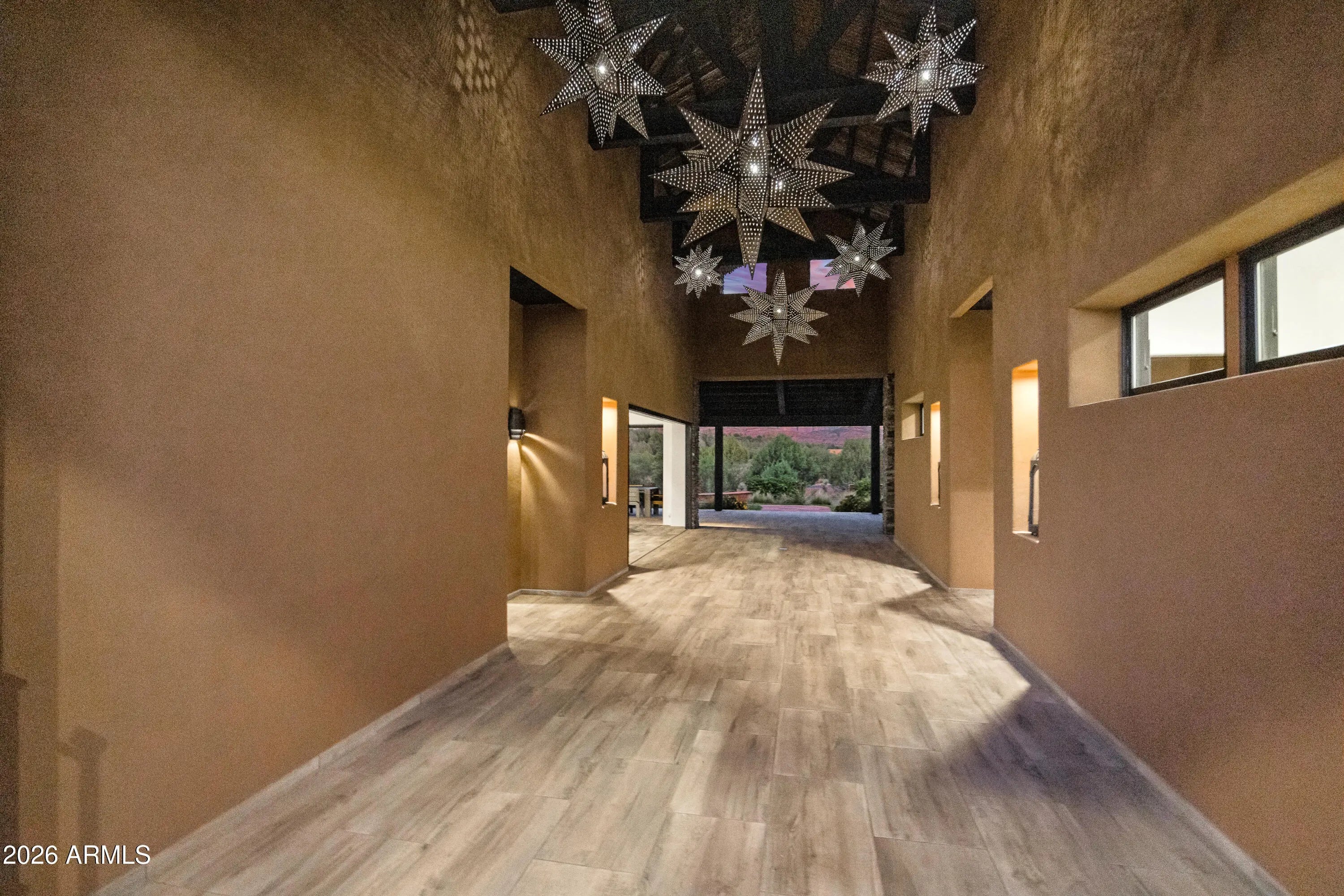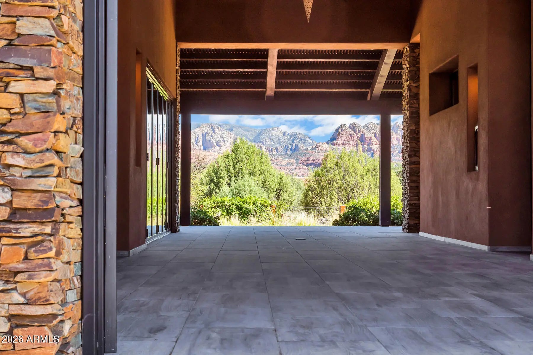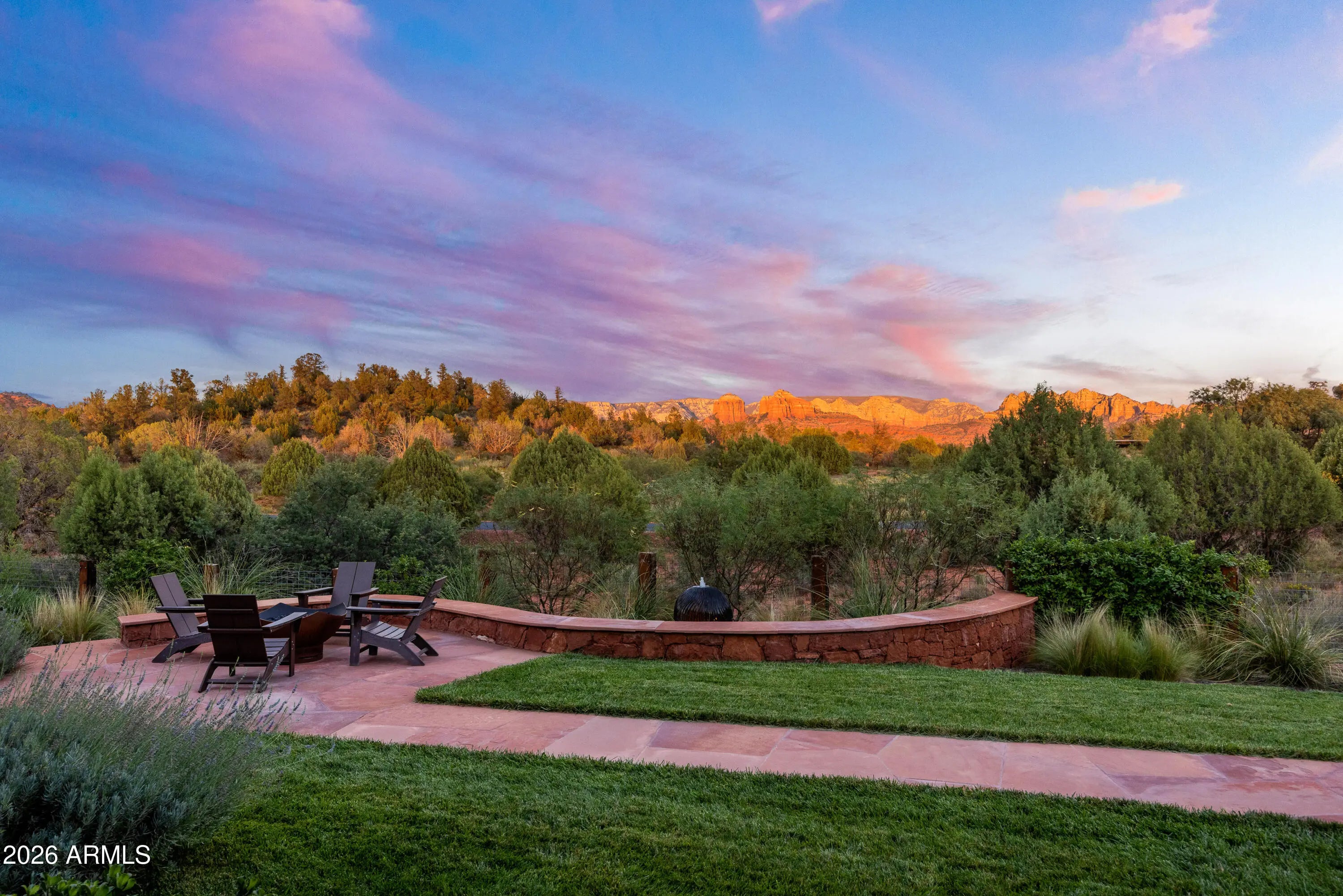 From arrival to interior detail, this Cross Creek Ranch estate reflects architectural intention and exceptional craftsmanship! Set on a private 2-acre corner lot within the gated community bordering Oak Creek, the property offers both seclusion and connection to Sedona's surrounding beauty. A cobblestone drive leads to the oversized 3-car garage and gated courtyard entry. A vaulted corridor illuminated by suspended star-like lighting creates a striking first impression by day and an unforgettable experience by night. The main residence and guest quarters are positioned on opposite sides of this central corridor, offering exceptional privacy. Two guest suites, each with private entry, ensuite bath, and patio access, function independently from the main house. Inside, expansive ...See More living spaces are framed by two walls of 20-foot La Cantina folding glass doors, seamlessly integrating indoor and outdoor living while showcasing unobstructed Cathedral Rock views. A temperature-controlled glass wine room anchors the living area for both intimate evenings and larger gatherings. The dual-kitchen layout supports effortless entertaining, with a fully equipped back kitchen complementing the main culinary space. Landscaped grounds with lawn and fountain create inviting settings for dining and relaxation. The primary suite offers fireplace, sitting area, patio access, hot tub, and Endless Swim Fitness Spa. The spa-inspired bath features dual stone vanities with lighted mirrors, a soaking tub with stone walls and ambient lighting, walk-in shower, and sauna, while the expansive closet connects directly to the laundry room. Additional highlights include a dedicated office with exceptional views, custom flooring and cabinetry in the 3-car garage, and a 6,960-watt solar system. A true one-of-a-kind offering in one of Sedona's most sought-after gated communities.