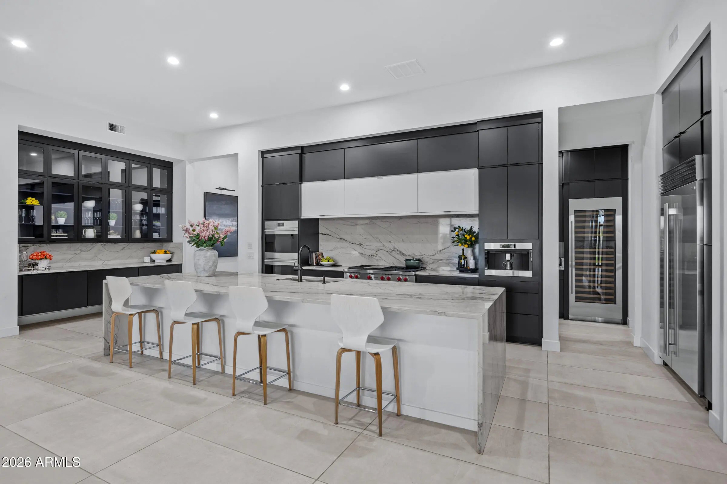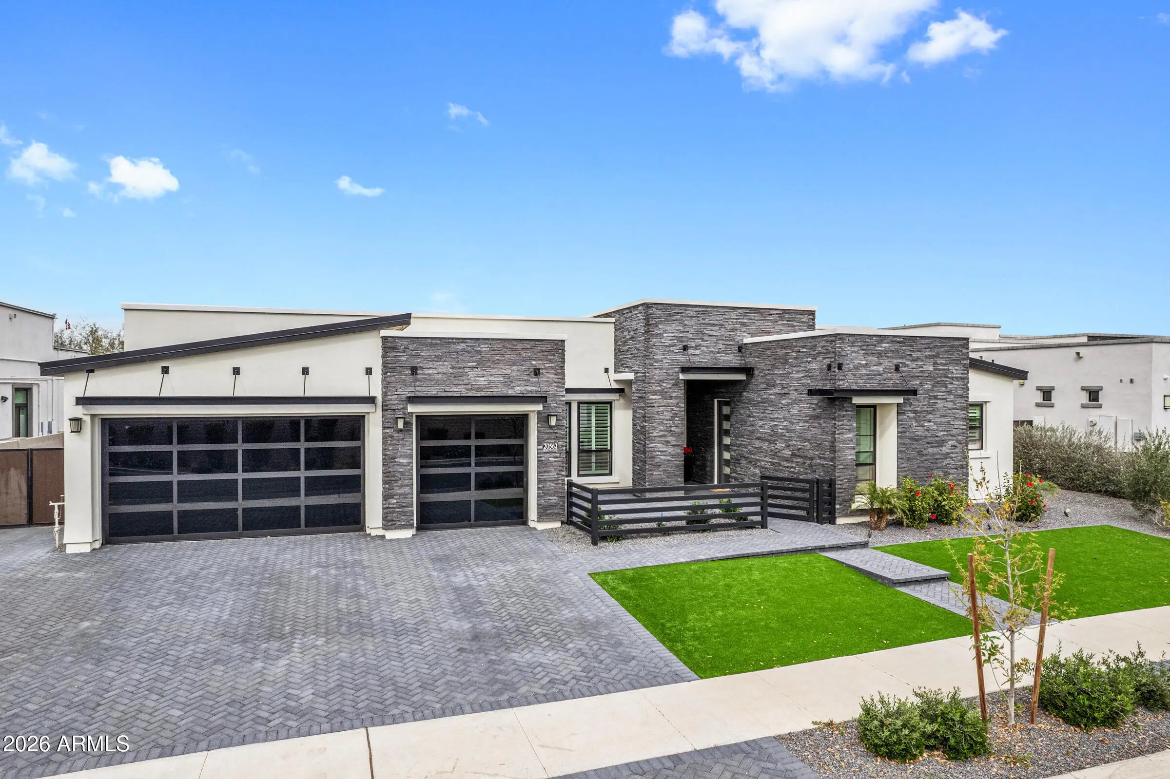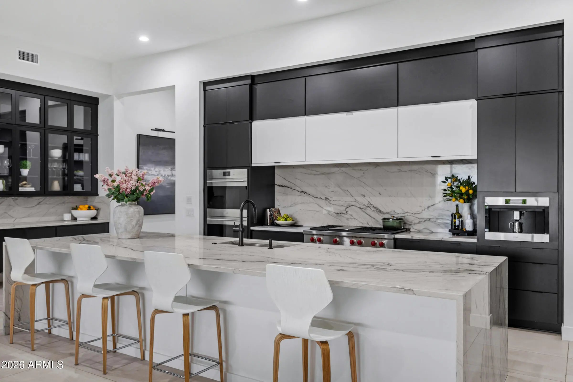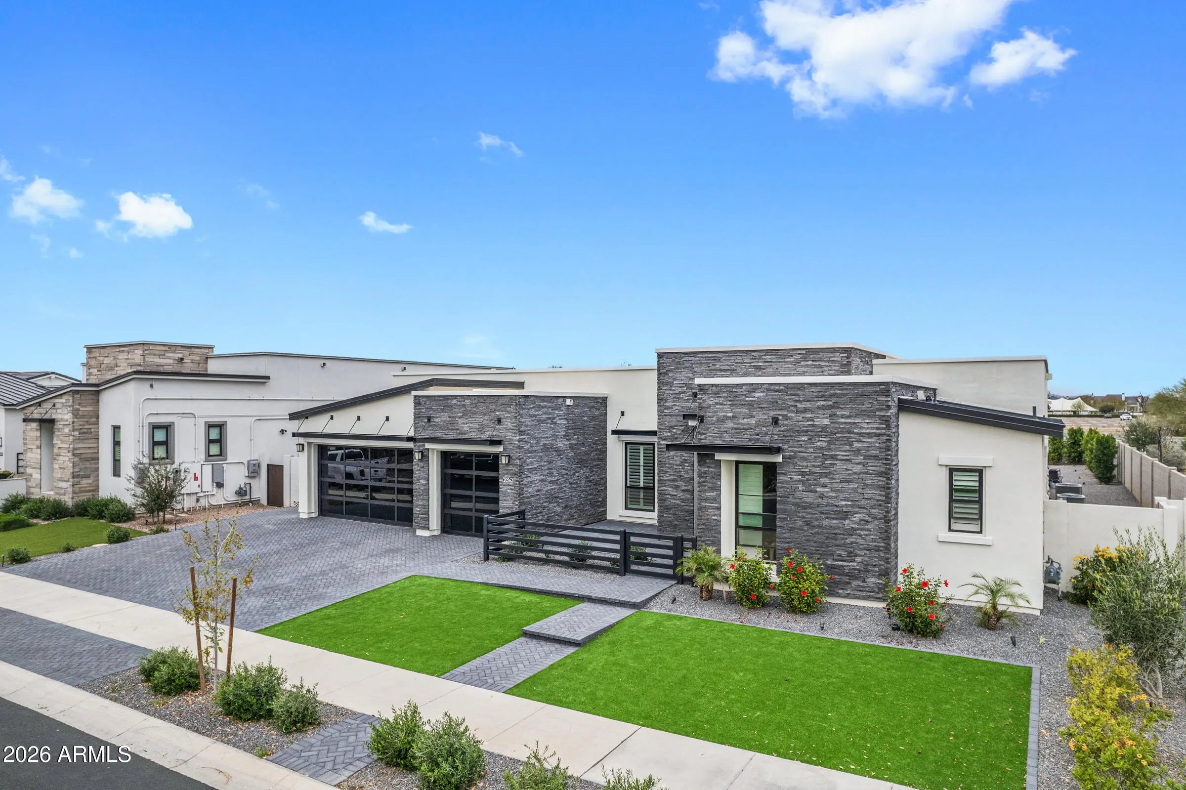 Welcome to an extraordinary contemporary residence nestled within the exclusive gated community of Bridle Ranch in Queen Creek. From the moment you arrive, the striking curb appeal commands attention -- a dramatic facade of stacked ledger stone, crisp stucco, and floor-to-ceiling glass garage doors set against a manicured artificial turf front yard with elegant paver hardscaping. A gated front courtyard with sleek horizontal iron railings leads to a private entry porch, creating an impressive arrival experience. Step through the custom glass-panel front door and into a world of refined, open-concept living. The expansive great room flows seamlessly from the chef's kitchen to the main living area, with soaring ceilings, recessed lighting, in-ceiling speakers throughout, and oversized porcelain tile flooring that reflects natural light pouring in through walls of black-framed sliding glass doors. The gourmet kitchen is nothing short of spectacular. At its heart sits a dramatic waterfall-edge island clad in book-matched Calacatta marble, accommodating seating for five and anchored by a matte black designer faucet with an undermount sink. The perimeter cabinetry is finished in a bold two-tone palette, matte black lowers and white high-gloss uppers, all illuminated by warm under-cabinet and toe-kick lighting. The Calacatta marble backsplash runs the full length of the cooking wall, providing a stunning backdrop for the professional-grade Wolf range with red-knob burners, multiple Wolf wall ovens, a built-in Wolf espresso/coffee system, and a Sub-Zero panel-ready refrigerator. A dedicated wet bar and butler's pantry features its own marble countertop, cabinetry, and a full-height glass-door Sub-Zero wine refrigerator -- perfect for the discerning entertainer. The great room is anchored by a full-height charcoal porcelain tile feature wall housing a wide-format linear electric fireplace and a large-screen television, with a dramatic oversized black ceiling fan overhead. Natural light and direct backyard access are provided by a wall of sliding glass doors that open to the covered outdoor living space, lined with mature privacy hedges and a lush artificial turf yard beyond. The main residence offers three spacious bedrooms, a dedicated private office, and a separate bonus room ideal as a game room, media room, or second family room, complete with carpet, in-ceiling speakers, and its own sliding glass door to the backyard. Every bedroom and living space has been thoughtfully designed with high-end finishes and smart home controls throughout. The primary suite is a true sanctuary, complete with its own linear fireplace set into a dramatic dark accent wall, a mounted TV, a statement ceiling fan, and direct backyard access through sliding glass doors overlooking the private, lush grounds. The spa-caliber primary bath features dual floating vanities with dark cabinetry and white quartz countertops, a freestanding soaking tub positioned center-stage, and a frameless glass-enclosed walk-in shower finished entirely in Calacatta marble with a rain head, arched niche, and multiple body sprays. A massive walk-in closet with custom built-in cabinetry, dual hanging sections, shoe shelving, and generous island storage completes this exceptional retreat. A standout feature of this property is the attached private casita, offering true flexibility for multi-generational living, extended guest accommodations, or potential rental income. Completely self-contained, the casita includes its own private exterior entrance, living room, bedroom, and full bathroom, providing total privacy and independence while remaining connected to the main home. The backyard is an entertainer's canvas already framed with tall privacy hedges and lush artificial turf across the generous 14,940 square foot lot, offering ample space for a custom pool, outdoor kitchen, or sport court build-out. Situated within the sought-after gated enclave of Bridle Ranch, this residence offers the security and prestige of a premier Queen Creek address. This is a rare opportunity to own a true luxury showpiece, where every finish, every appliance, and every design choice speaks to an uncompromising standard of living.