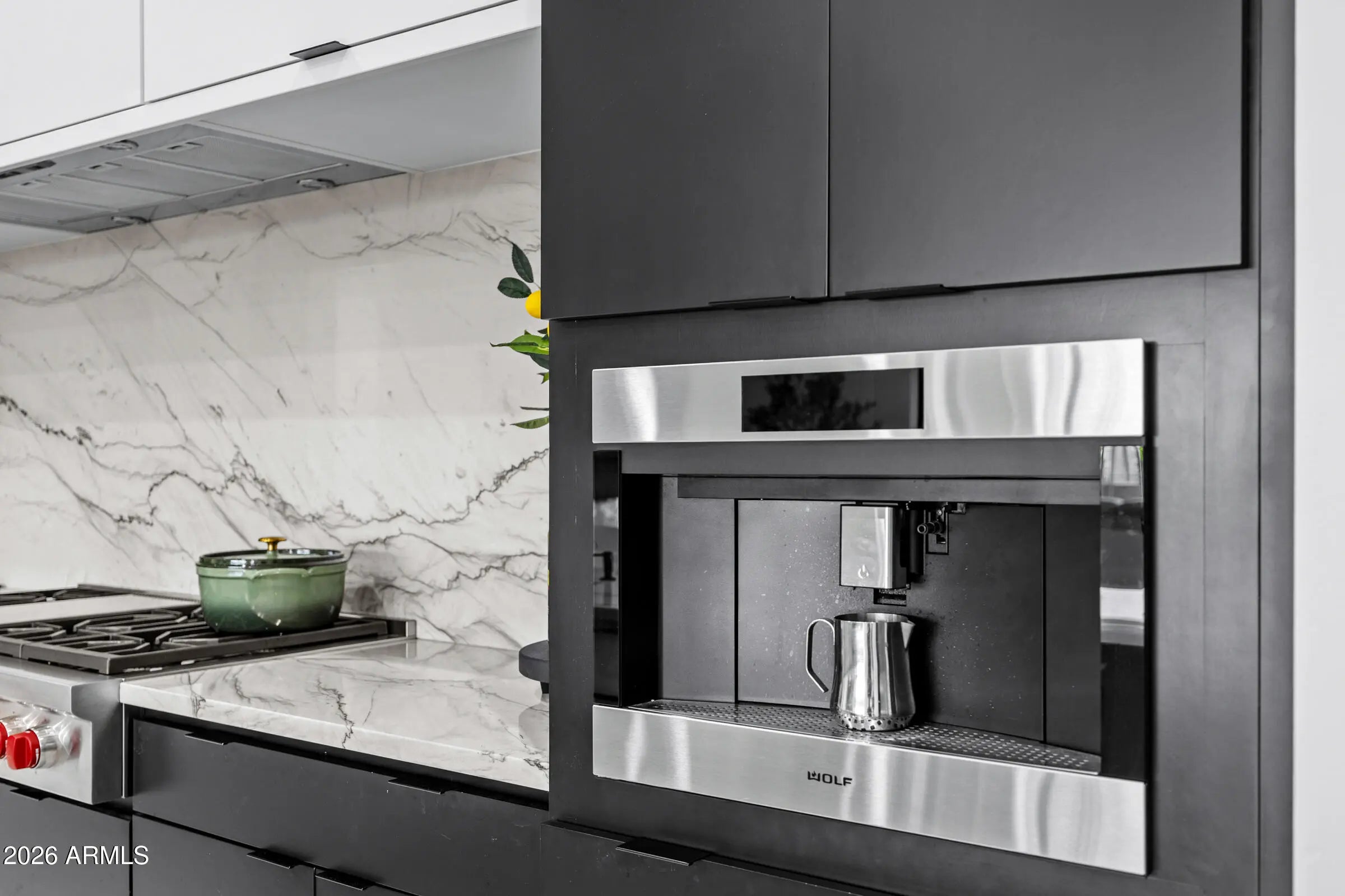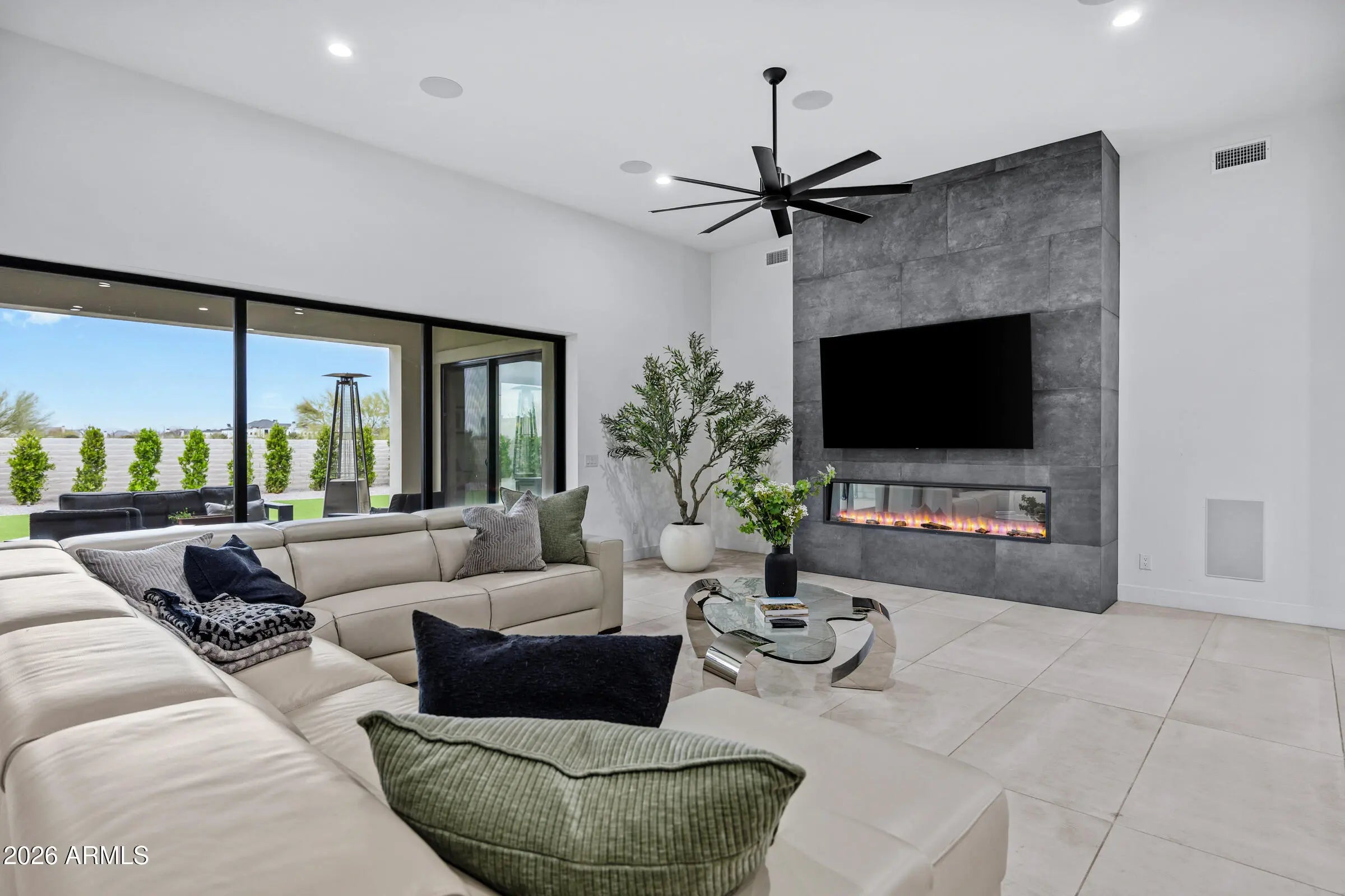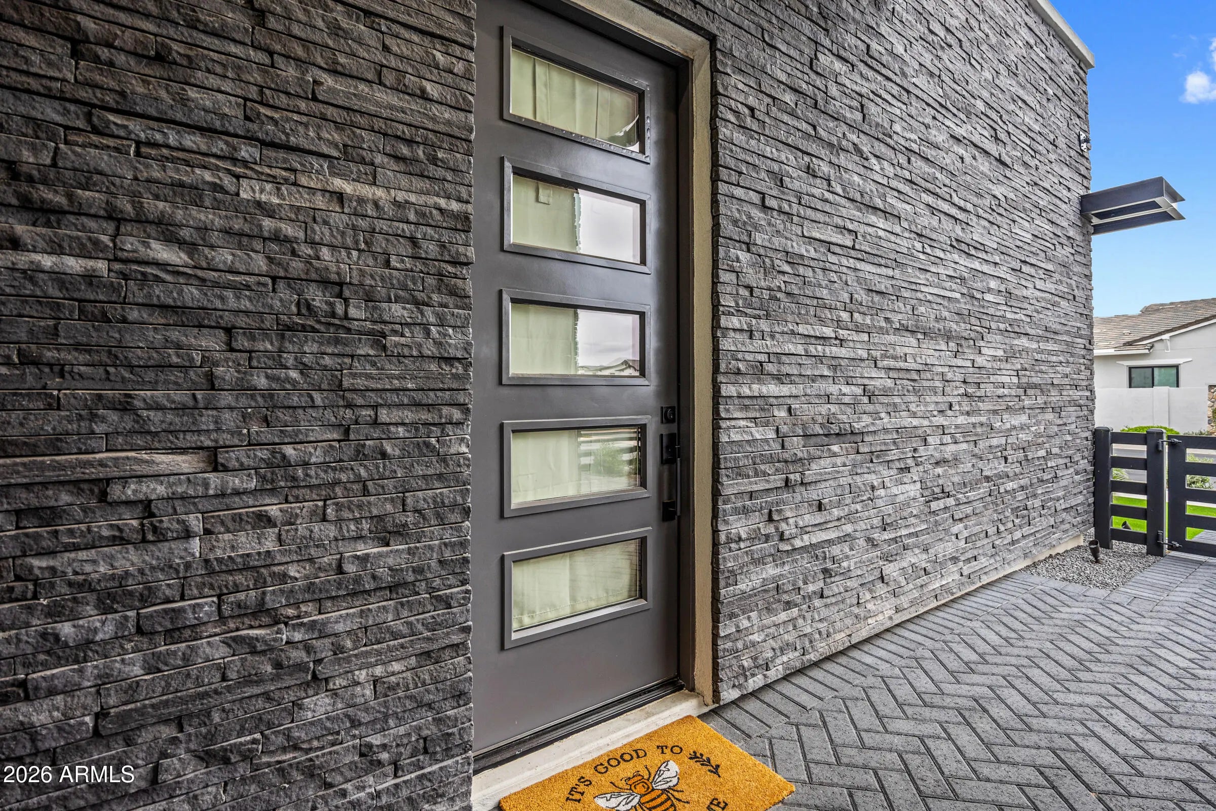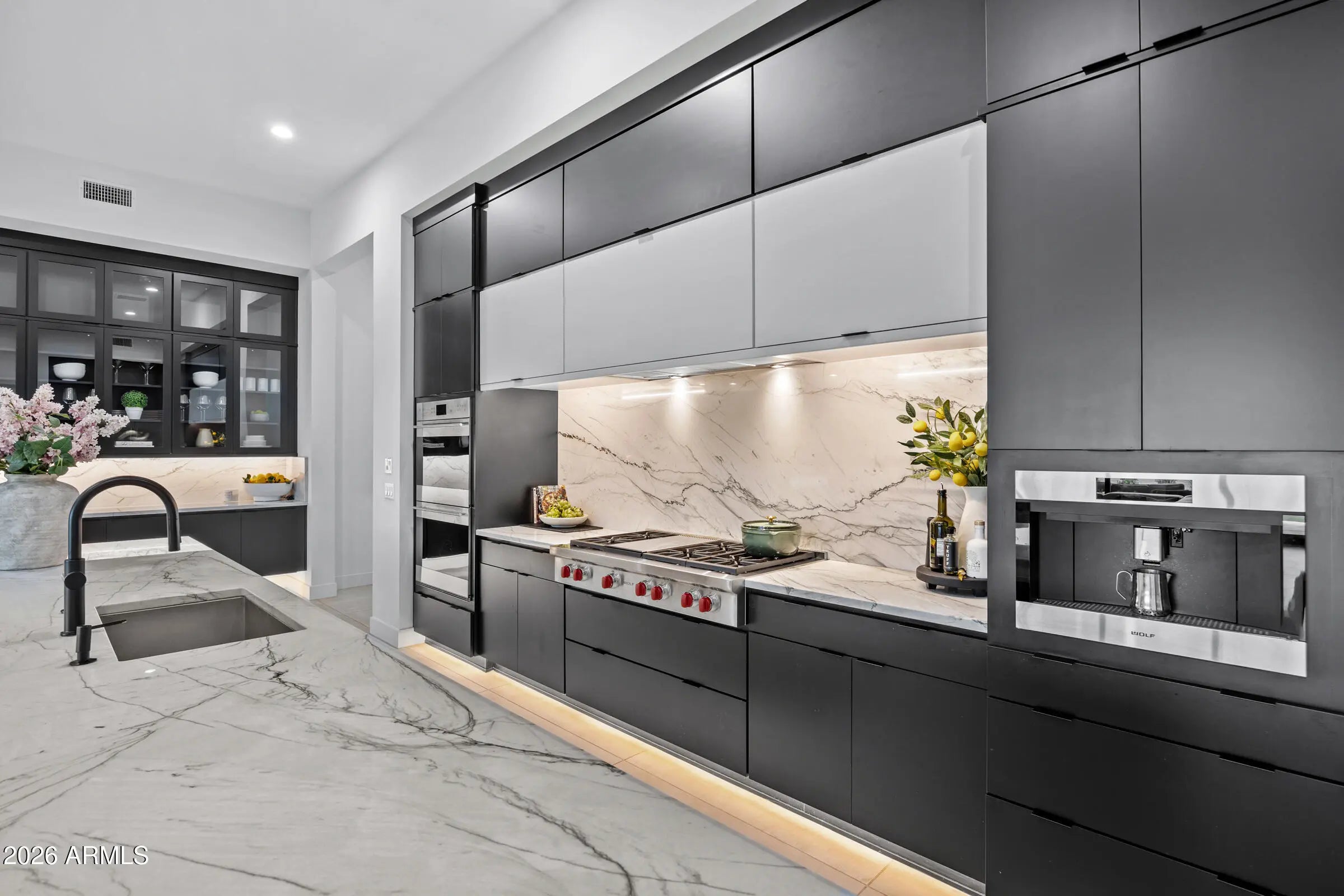 Welcome to an extraordinary contemporary residence nestled within the exclusive gated community of Bridle Ranch in Queen Creek. From the moment you arrive, the striking curb appeal commands attention -- a dramatic facade of stacked ledger stone, crisp stucco, and floor-to-ceiling glass garage doors set against a manicured artificial turf front yard with elegant paver hardscaping. A gated front courtyard with sleek horizontal iron railings leads to a private entry porch, creating an impressive arrival experience. Step through the custom glass-panel front door and into a world of refined, open-concept living. The expansive great room flows seamlessly from the chef's kitchen to the main living area, with soaring ceilings, recessed lighting, in-ceiling speakers throughout, and oversized porcelain tile flooring that reflects natural light pouring in through walls of black-framed sliding glass doors. The gourmet kitchen is nothing short of spectacular. At its heart sits a dramatic waterfall-edge island clad in book-matched Calacatta marble, accommodating seating for five and anchored by a matte black designer faucet with an undermount sink. The perimeter cabinetry is finished in a bold two-tone palette, matte black lowers and white high-gloss uppers, all illuminated by warm under-cabinet and toe-kick lighting. The Calacatta marble backsplash runs the full length of the cooking wall, providing a stunning backdrop for the professional-grade Wolf range with red-knob burners, multiple Wolf wall ovens, a built-in Wolf espresso/coffee system, and a Sub-Zero panel-ready refrigerator. A dedicated wet bar and butler's pantry features its own marble countertop, cabinetry, and a full-height glass-door Sub-Zero wine refrigerator -- perfect for the discerning entertainer. The great room is anchored by a full-height charcoal porcelain tile feature wall housing a wide-format linear electric fireplace and a large-screen television, with a dramatic oversized black ceiling fan overhead. Natural light and direct backyard access are provided by a wall of sliding glass doors that open to the covered outdoor living space, lined with mature privacy hedges and a lush artificial turf yard beyond. The main residence offers three spacious bedrooms, a dedicated private office, and a separate bonus room ideal as a game room, media room, or second family room, complete with carpet, in-ceiling speakers, and its own sliding glass door to the backyard. Every bedroom and living space has been thoughtfully designed with high-end finishes and smart home controls throughout. The primary suite is a true sanctuary, complete with its own linear fireplace set into a dramatic dark accent wall, a mounted TV, a statement ceiling fan, and direct backyard access through sliding glass doors overlooking the private, lush grounds. The spa-caliber primary bath features dual floating vanities with dark cabinetry and white quartz countertops, a freestanding soaking tub positioned center-stage, and a frameless glass-enclosed walk-in shower finished entirely in Calacatta marble with a rain head, arched niche, and multiple body sprays. A massive walk-in closet with custom built-in cabinetry, dual hanging sections, shoe shelving, and generous island storage completes this exceptional retreat. A standout feature of this property is the attached private casita, offering true flexibility for multi-generational living, extended guest accommodations, or potential rental income. Completely self-contained, the casita includes its own private exterior entrance, living room, bedroom, and full bathroom, providing total privacy and independence while remaining connected to the main home. The backyard is an entertainer's canvas already framed with tall privacy hedges and lush artificial turf across the generous 14,940 square foot lot, offering ample space for a custom pool, outdoor kitchen, or sport court build-out. Situated within the sought-after gated enclave of Bridle Ranch, this residence offers the security and prestige of a premier Queen Creek address. This is a rare opportunity to own a true luxury showpiece, where every finish, every appliance, and every design choice speaks to an uncompromising standard of living.