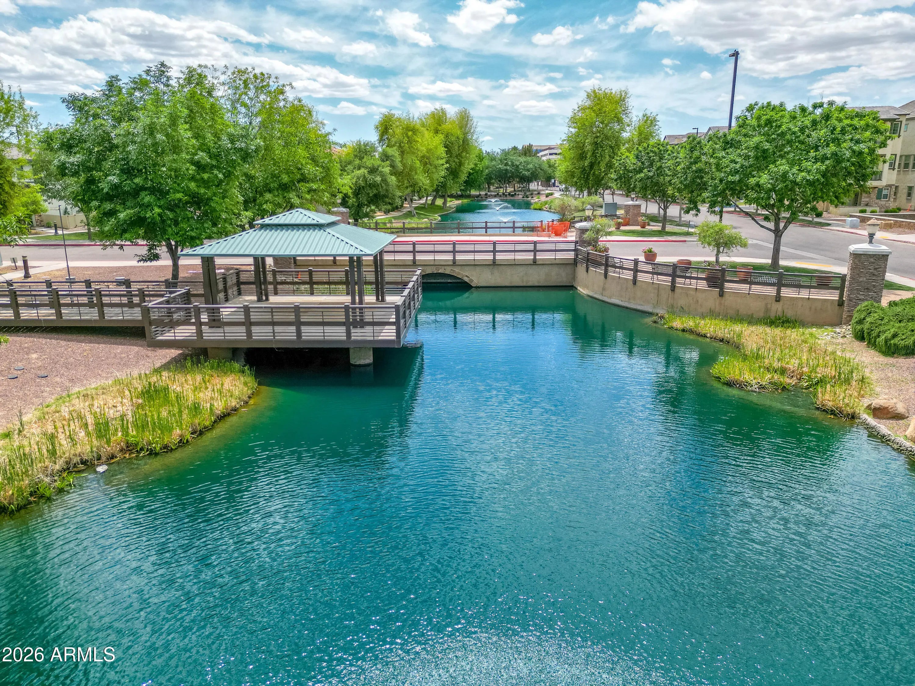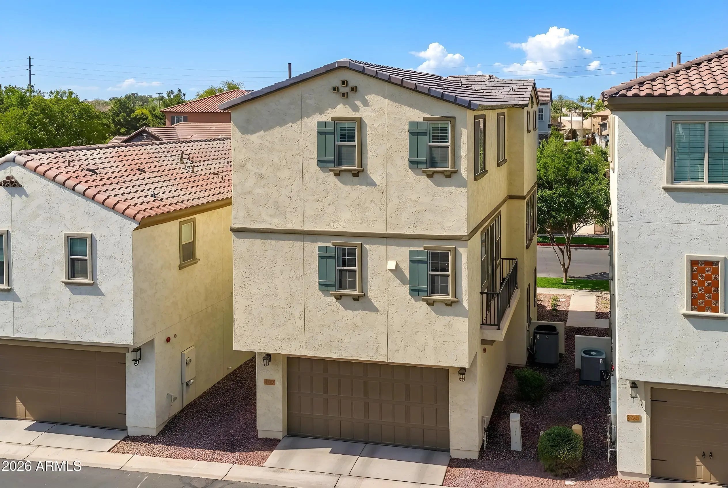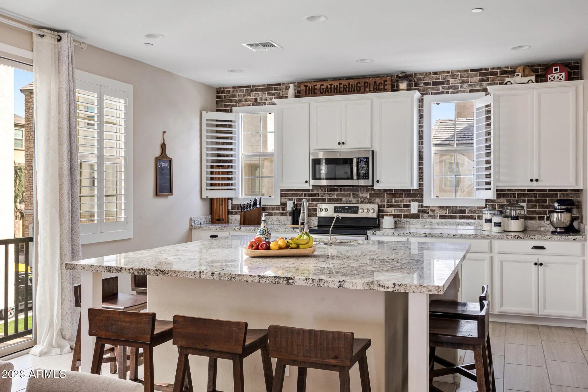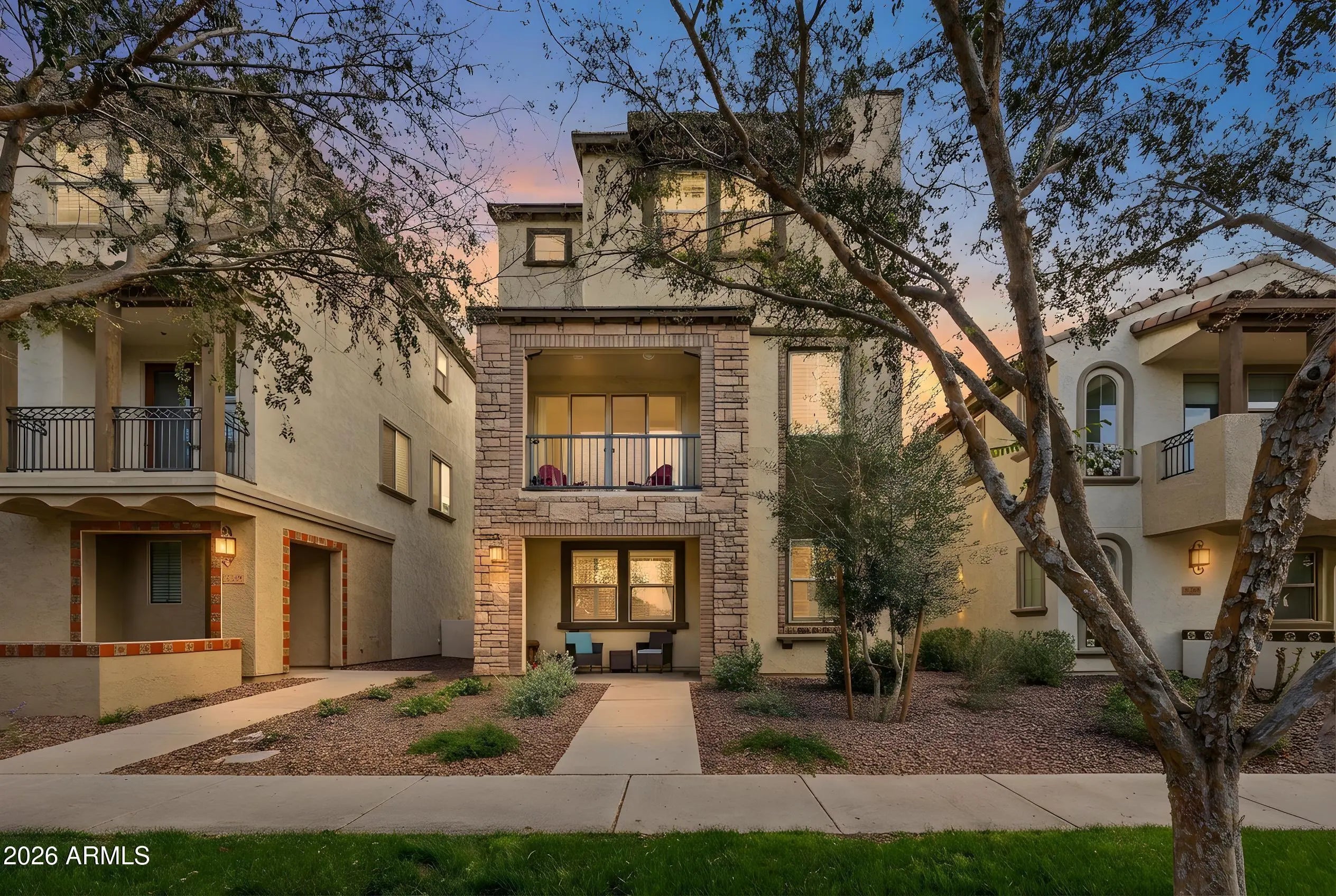 A rare opportunity to own one of the largest and most private residences in the gated community of The Lakes at Annecy. Fully detached with no common walls and positioned along a tree-lined street rather than directly facing neighboring homes, this 3-bedroom + den home offers the ease of condominium living with the feel and presence of a single-family residence. Built in 2020 and spanning 2,166 sq ft, this is the largest floorplan offered in the community - and it lives beautifully. The main living spaces are intentionally elevated on the second level, allowing natural light to pour in from multiple directions. Surrounded by windows and framed by custom plantation shutters throughout, the space feels bright, open, and quietly refined. The kitchen is truly the heart of the home and one of the most expansive layouts in Annecy. A massive island with seating for up to eight becomes a natural gathering place, complemented by stone countertops, stainless steel appliances, and a generous walk-in pantry. It's a layout that feels equally suited for hosting friends or simply enjoying an unhurried evening at home. A Juliet balcony off the kitchen and a front balcony with an upgraded double slider extend the living space outdoors and enhance the sense of openness. On the first level, a flexible den currently serves as a media room, creating separation between entertaining spaces and private retreats. The oversized two-car garage includes additional overhead storage, and an owned water softening system adds everyday comfort. A covered front patio offers a welcoming entry and another quiet place to unwind. The third level is thoughtfully designed with a split primary suite for added privacy. The retreat includes a recessed alcove ideal for a workspace or reading nook, a spacious walk-in closet, and an en-suite bath with dual vanities and a walk-in shower. Ceramic tile spans the first and second floors and all wet areas, with upgraded low-pile carpet in the bedrooms and staircases. Nine-foot ceilings throughout further enhance the sense of scale. The Lakes at Annecy is one of Gilbert's most distinctive gated communities, known for its resort-inspired design, scenic lakes with fountains, tree-lined pedestrian paths, and three pools and spas. Residents enjoy a walkable, low-maintenance lifestyle in a setting that feels intentionally designed and thoughtfully maintained. Located just moments from SanTan Village and with convenient access to the Loop 202 SanTan Freeway, the community offers both privacy and connectivity. With its detached design, premium interior positioning, and larger floorplan, this residence represents one of the more unique offerings within Annecy - combining privacy, scale, and light in one of Gilbert's most distinctive communities.
