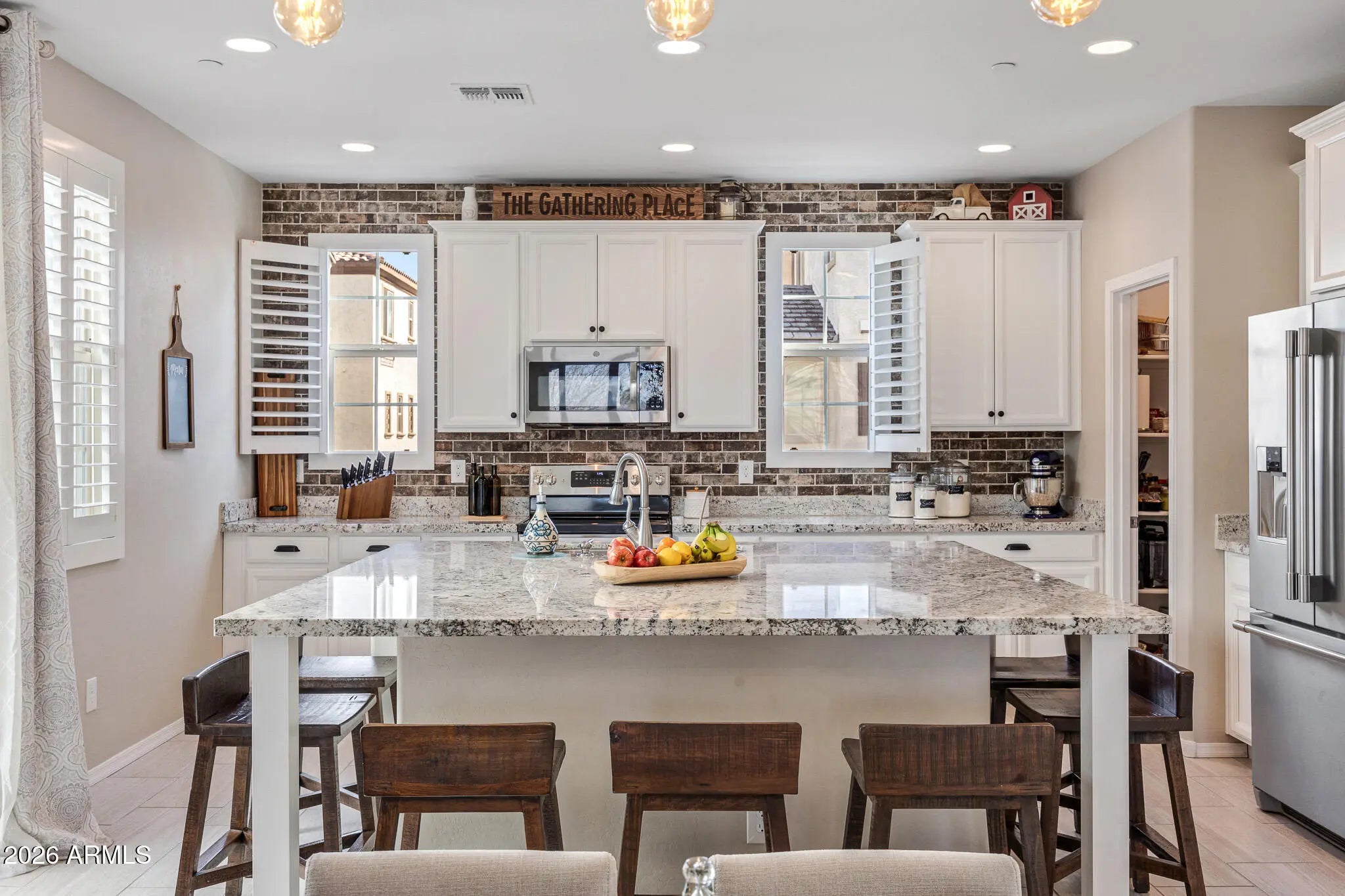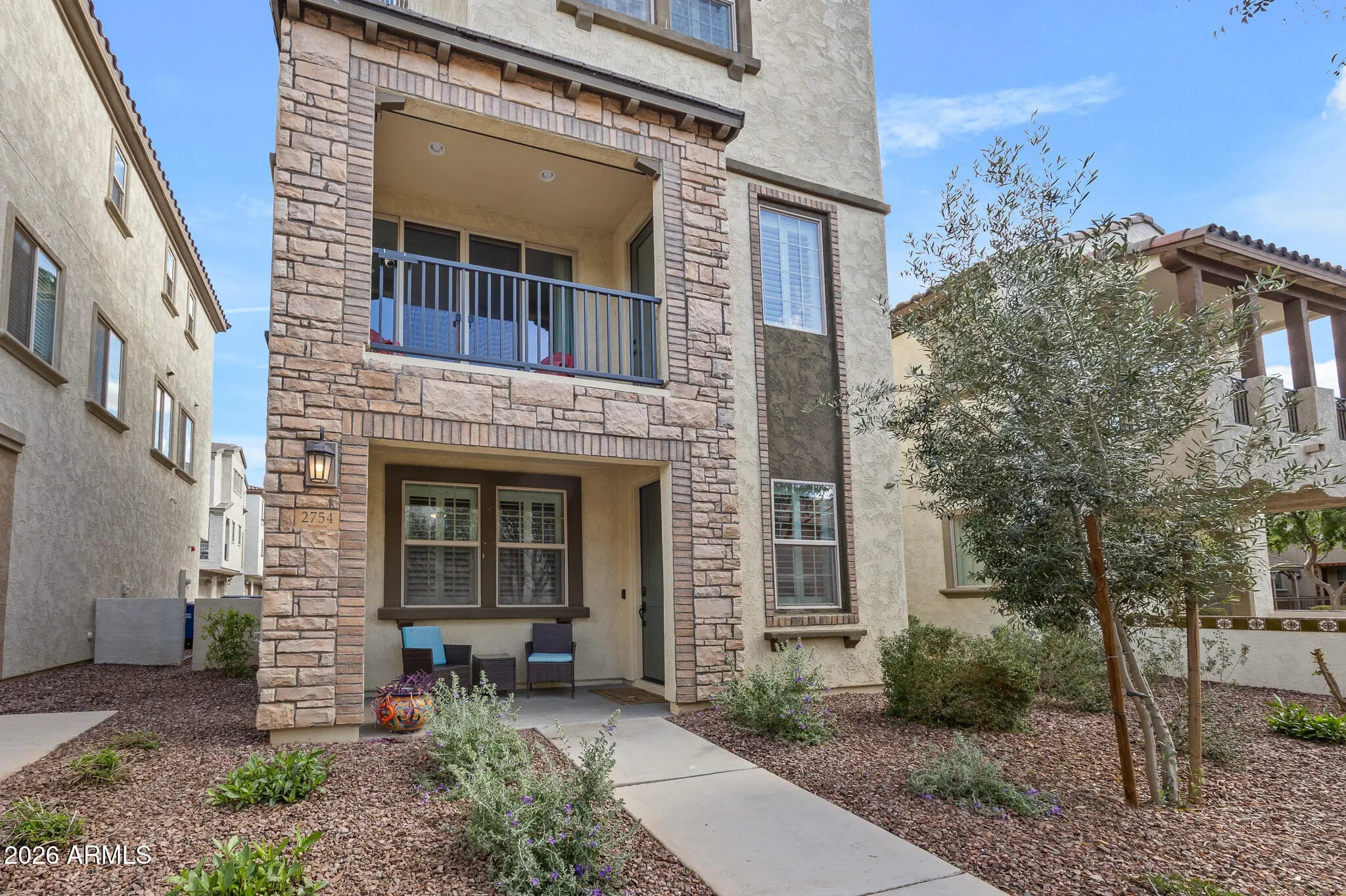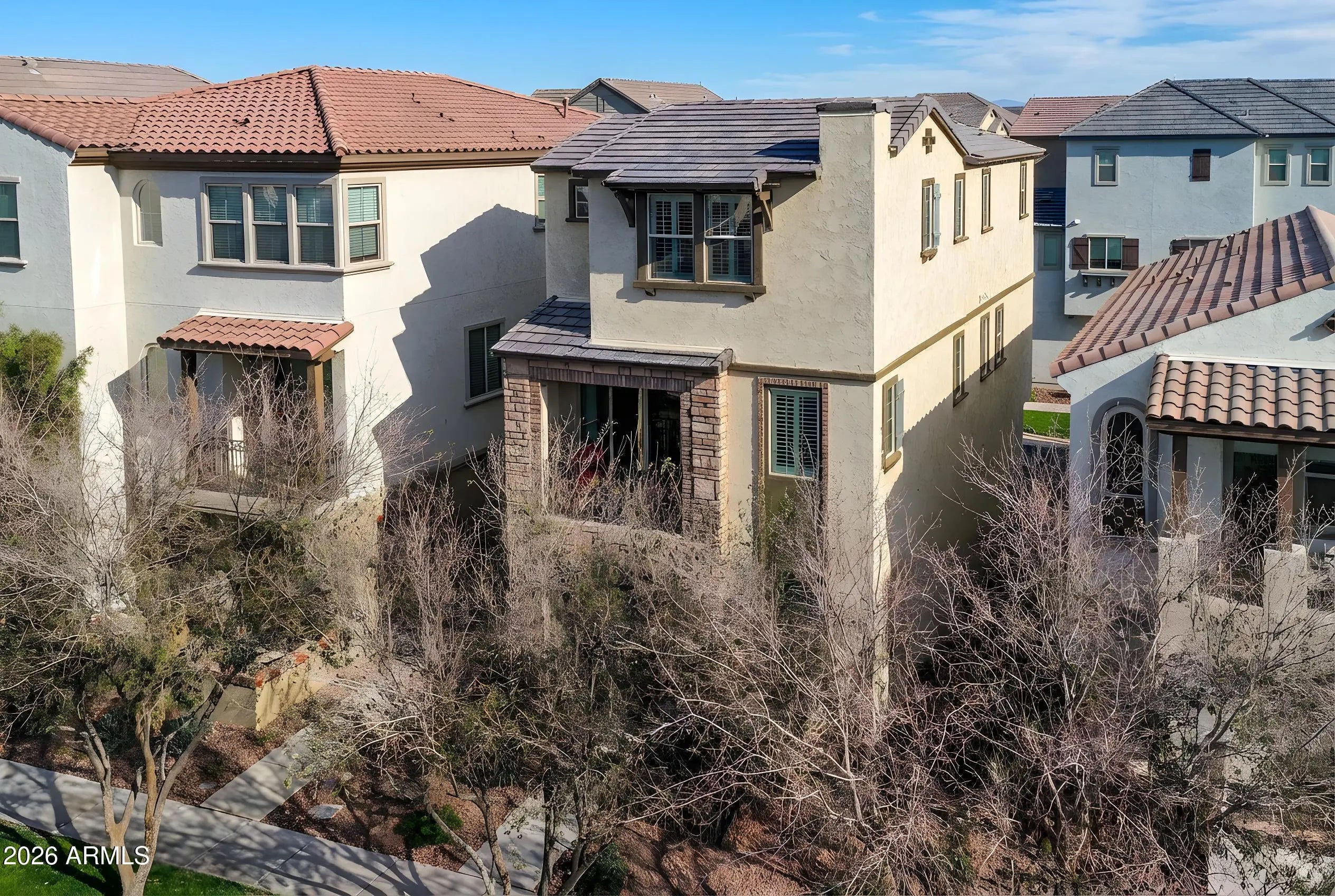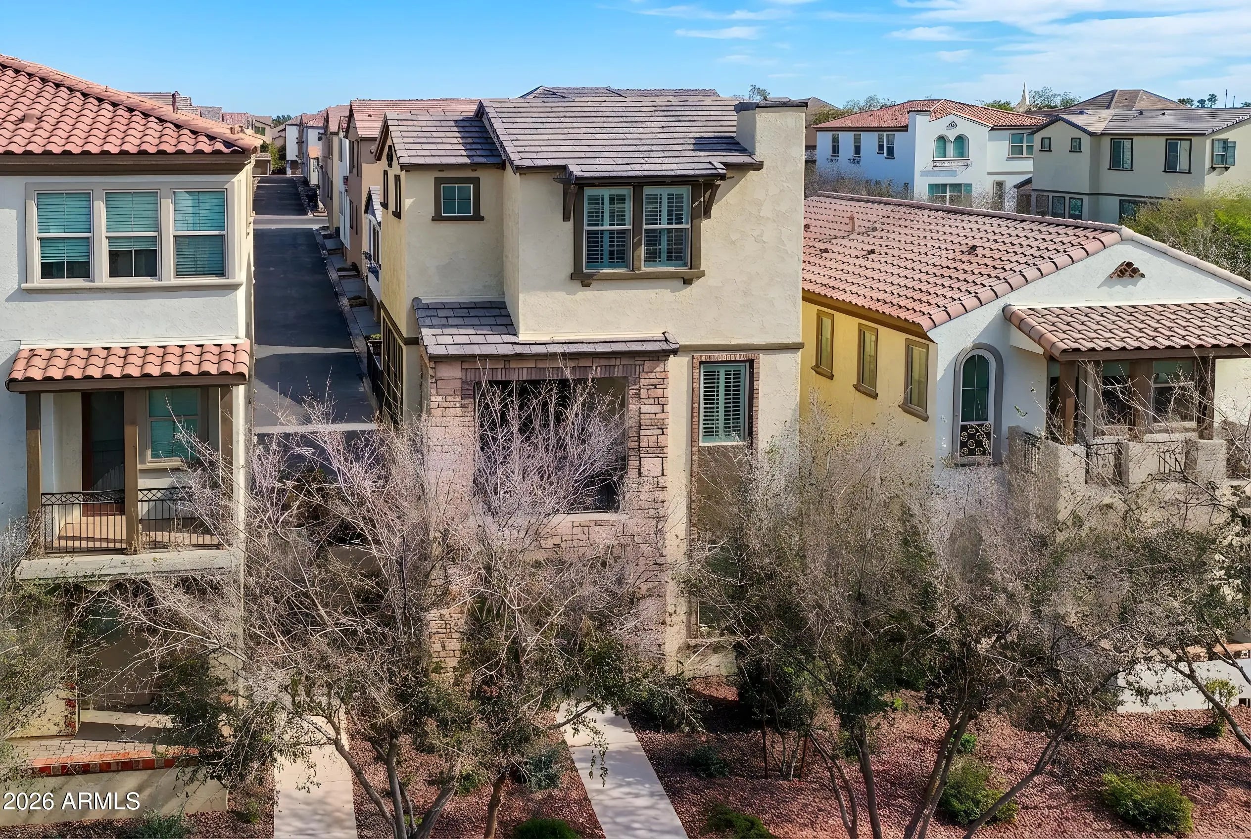 A rare opportunity to own one of the largest and most private residences in the gated community of The Lakes at Annecy. Fully detached with no common walls and positioned along a tree-lined street rather than directly facing neighboring homes, this 3-bedroom + den home offers the ease of condominium living with the feel and presence of a single-family residence. Built in 2020 and spanning 2,166 sq ft, this is the largest floorplan offered in the community - and it lives beautifully. The main living spaces are intentionally elevated on the second level, allowing natural light to pour in from multiple directions. Surrounded by windows and framed by custom plantation shutters throughout, the space feels bright, open, and quietly refined. The kitchen is truly the heart of the home and one of the most expansive layouts in Annecy. A massive island with seating for up to eight becomes a natural gathering place, complemented by stone countertops, stainless steel appliances, and a generous walk-in pantry. It's a layout that feels equally suited for hosting friends or simply enjoying an unhurried evening at home. A Juliet balcony off the kitchen and a front balcony with an upgraded double slider extend the living space outdoors and enhance the sense of openness. On the first level, a flexible den currently serves as a media room, creating separation between entertaining spaces and private retreats. The oversized two-car garage includes additional overhead storage, and an owned water softening system adds everyday comfort. A covered front patio offers a welcoming entry and another quiet place to unwind. The third level is thoughtfully designed with a split primary suite for added privacy. The retreat includes a recessed alcove ideal for a workspace or reading nook, a spacious walk-in closet, and an en-suite bath with dual vanities and a walk-in shower. Ceramic tile spans the first and second floors and all wet areas, with upgraded low-pile carpet in the bedrooms and staircases. Nine-foot ceilings throughout further enhance the sense of scale. The Lakes at Annecy is one of Gilbert's most distinctive gated communities, known for its resort-inspired design, scenic lakes with fountains, tree-lined pedestrian paths, and three pools and spas. Residents enjoy a walkable, low-maintenance lifestyle in a setting that feels intentionally designed and thoughtfully maintained. Located just moments from SanTan Village and with convenient access to the Loop 202 SanTan Freeway, the community offers both privacy and connectivity. With its detached design, premium interior positioning, and larger floorplan, this residence represents one of the more unique offerings within Annecy - combining privacy, scale, and light in one of Gilbert's most distinctive communities.