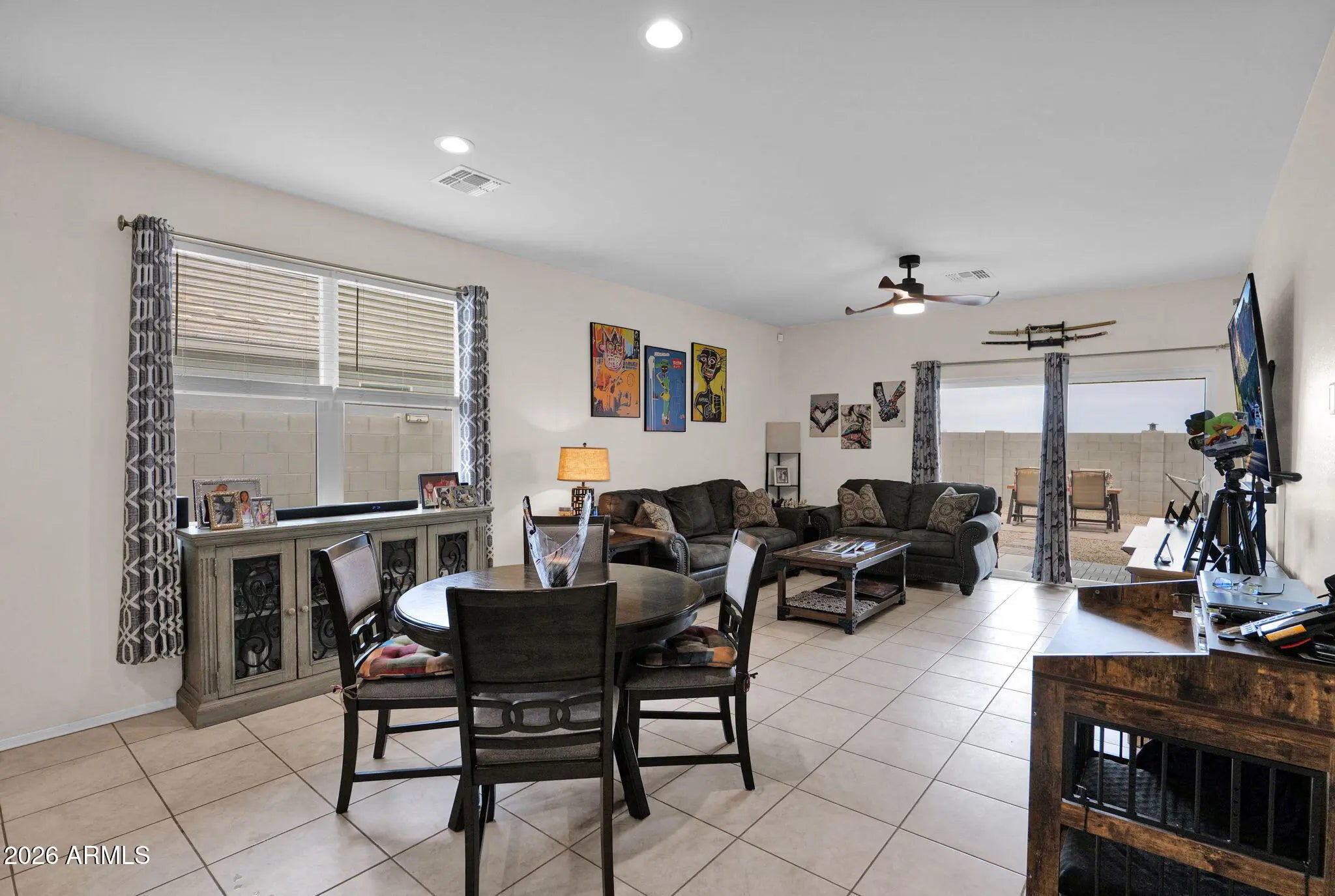 Skip the construction delays and step straight into homeownership in this fantastic Heartland Ranch home. Built in 2020 and beautifully maintained, this 4 bedroom, 2 bathroom residence offers 1,559 square feet of thoughtfully designed living space that feels open, bright, and functional. The open-concept layout creates seamless flow from the living area to the kitchen, making it a great floorplan for hosting friends, family nights, or simply enjoying everyday life. Natural light pours through double-pane windows, while tile flooring, 9 foot ceilings, and modern finishes give the home a clean feel. Outside, the private backyard offers a covered patio and extended paver areas that are already in place. No dust, no construction noise, no added expense-- just a space ready for morning coffee, weekend BBQs, and Arizona sunsets. You'll also enjoy the thoughtful upgrades throughout, including a smart home system where you can control your whole home at the touch of a button, plus 2" blinds on every window, ceiling fans in each bedroom and greatroom, and even on the patio for year-round comfort. A neutral color palette accented with stylish feature walls add just the right touch of personality, and the double gate adds convenience for storing your toys. Located near Heartland Ranch Elementary and within the Coolidge Unified School District, you'll love the newer yet established neighborhood feel that is close to important conveniences, while still enjoying that rural vibe. This home is move-in ready with no builder surprises -- just a smart, stylish home ready for its next chapter.