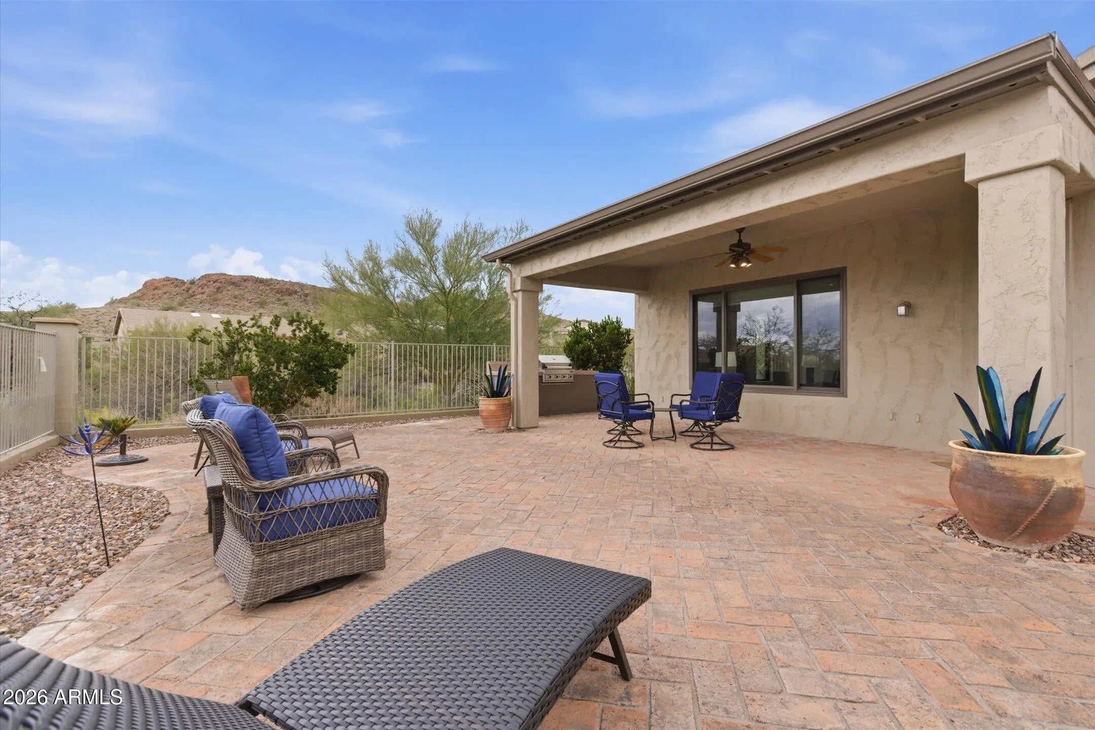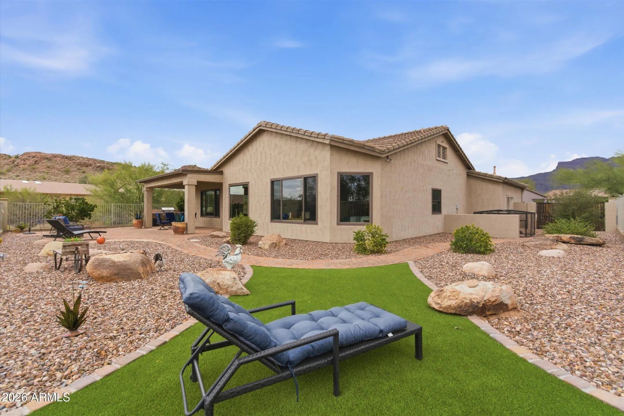 Rare end-of-cul-de-sac lot offering exceptional privacy with no homes on either side and backing to a natural wash that extends along both sides of the property. Single-level home in Superstition Foothills delivers peaceful desert living with MOUNTAIN surroundings. The backyard retreat features an extended paver patio + 2022 built-in BBQ, perfect for entertaining. Built with 2x6 construction by Pulte, the home offers a spacious open great room with Andersen windows installed in 2020, skylights with retractable remote shades, upgraded light fixtures throughout. The kitchen opens to the great room & includes upgraded cabinetry, Corian counters + breakfast bar. The split floor plan provides privacy with guest bedrooms separated from the large primary suite. Primary bedroom includes double vanity, separate shower, jetted tub, and an oversized walk-in closet. Additional highlights include a 3-car extended garage with quality built-in cabinets and epoxy flooring, plus a brand new roof in 2026. Superstition Foothills is one of Gold Canyon's most desirable communities, offering low HOA fees of $214.50 quarterly and amenities that include a heated community pool and spa, pet-friendly park, and 52 scenic hiking and walking trails.