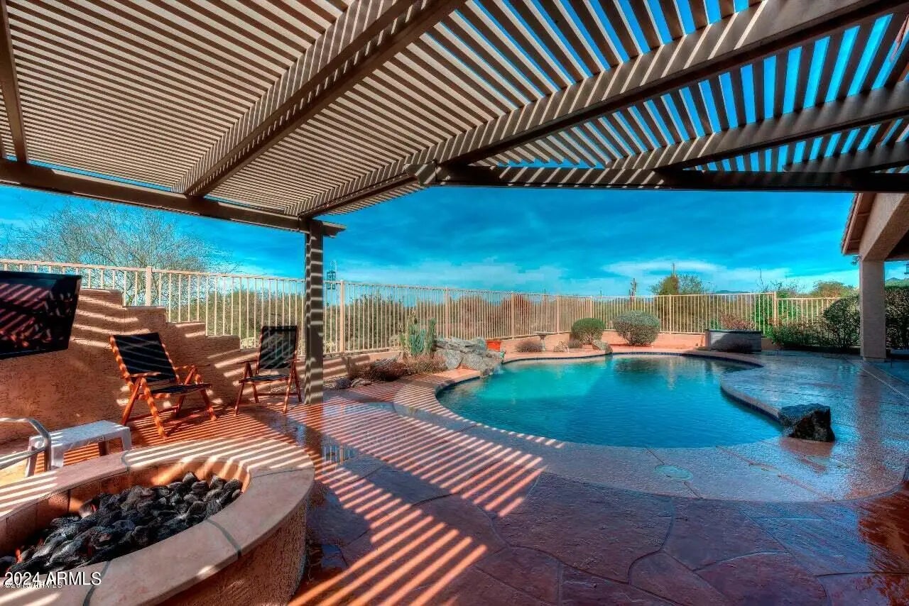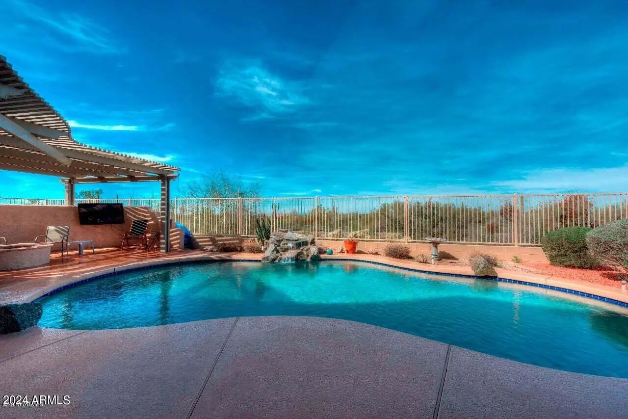 Vacation home for Mar 17th to July 31st. Desert retreat in North Scottsdale, Cave Creek, Carefree area. 4 bedrooms, 5 beds, 3 bath. 3 car. Private resort style backyard with heated pool, boulder rock waterfall, fire pit, pergola, covered patio. Mountain and sunset views. Gourmet kitchen with oversized granite counter, wolf 6 burner gas range, subzero wine fridge, double ovens. Open split floor plan. Primary suite has a newly upgraded luxurious bathroom with a huge walk-in steam shower and new vanity. It has a king bed, tv and slider to the backyard. 2nd primary suite has a beautiful Victorian-inspired claw foot bathtub, separate shower, queen bed. 3rd bedroom has 2 twin beds. 4th has a day bed (bunks) . Convenient location close to golf clubs, restaurants and shops.