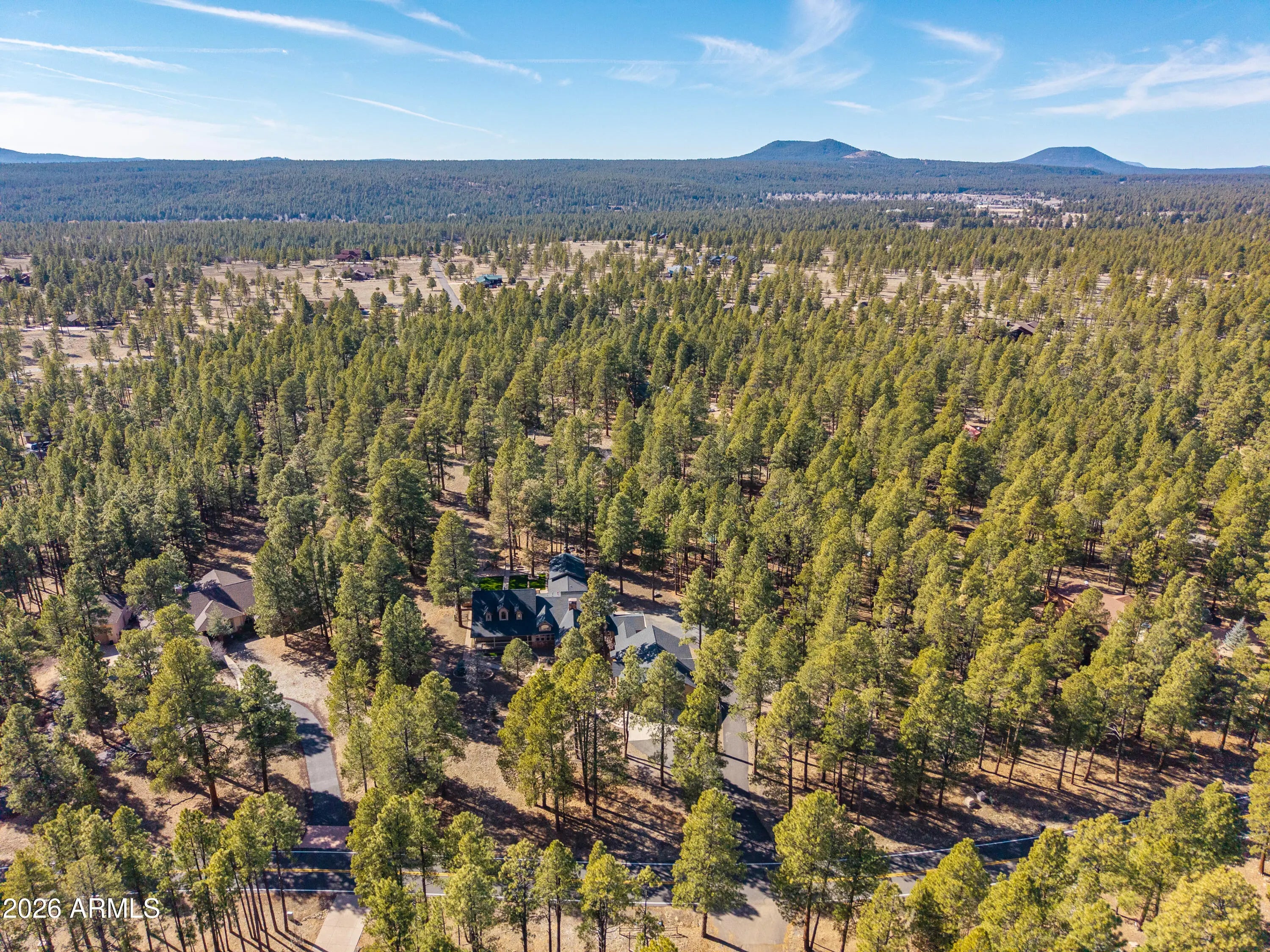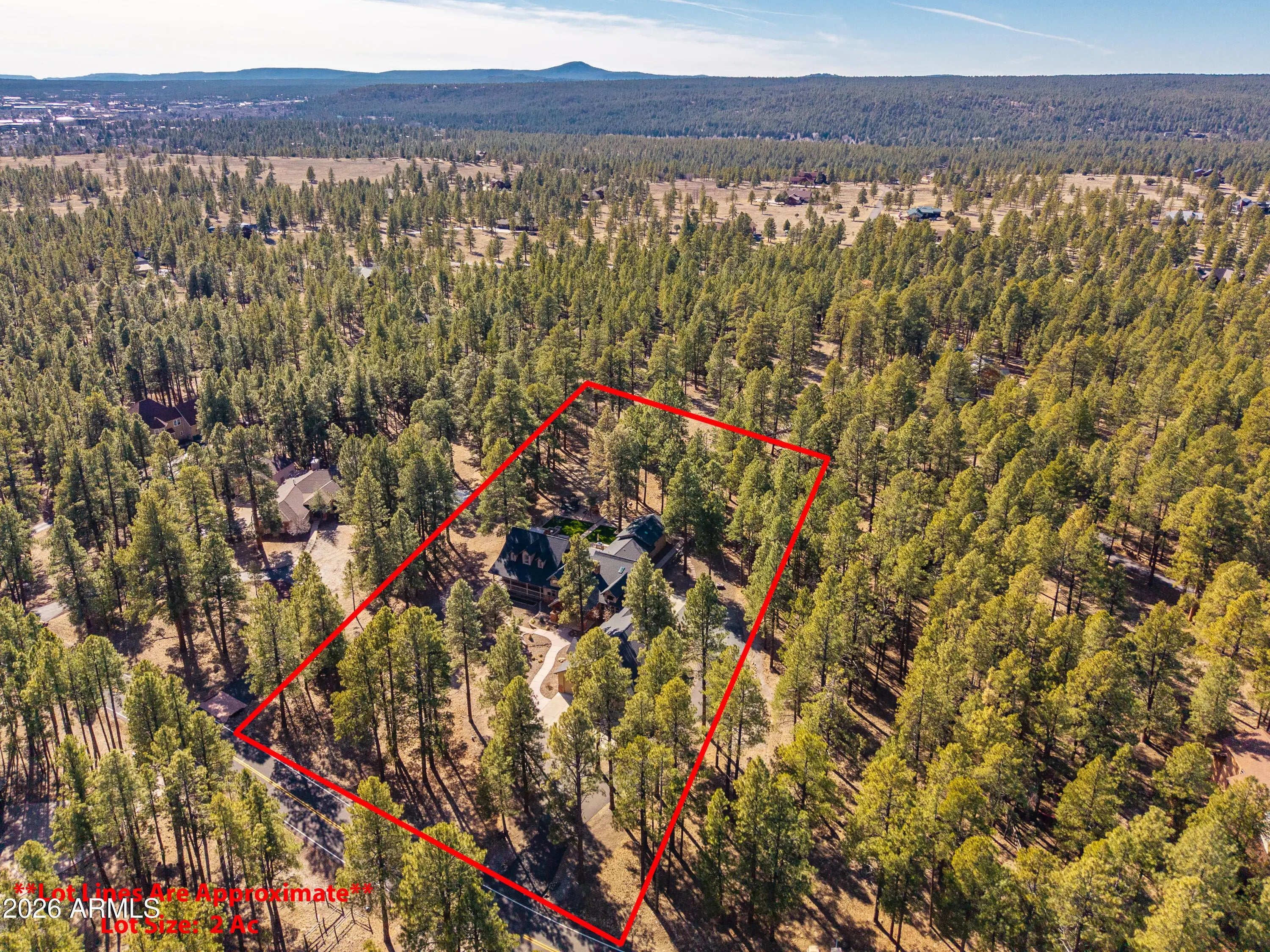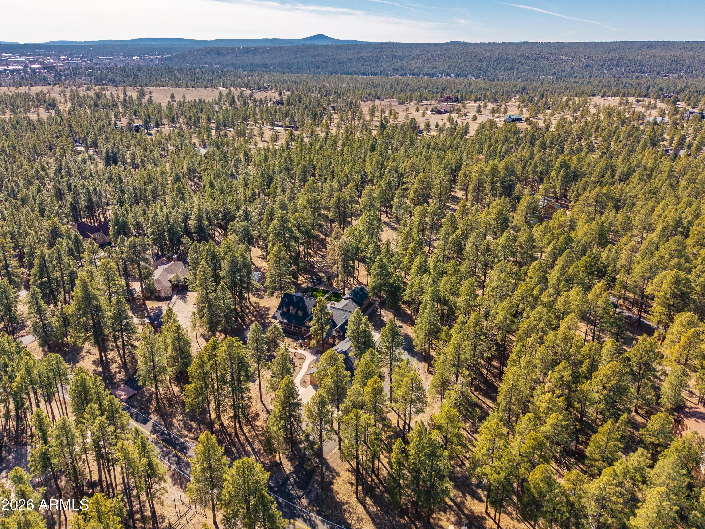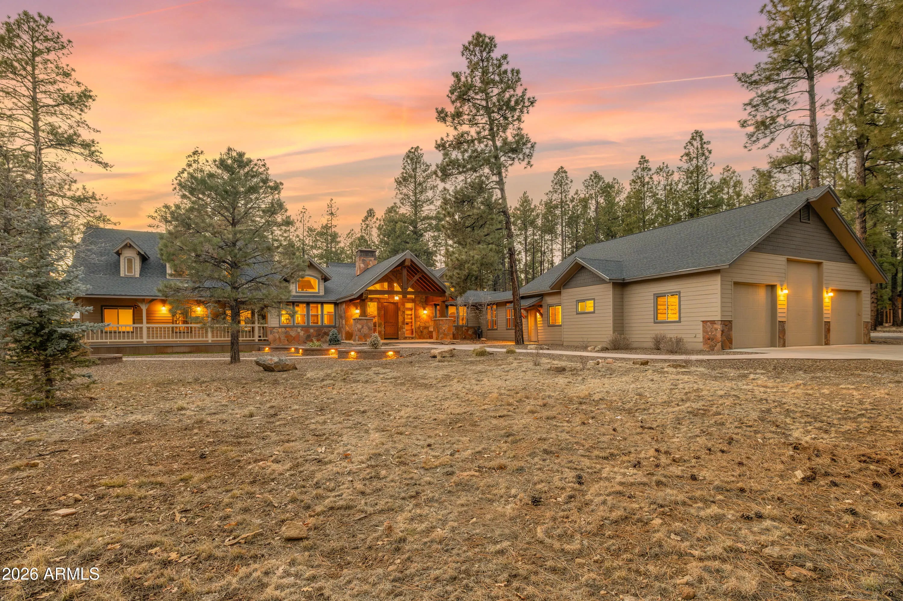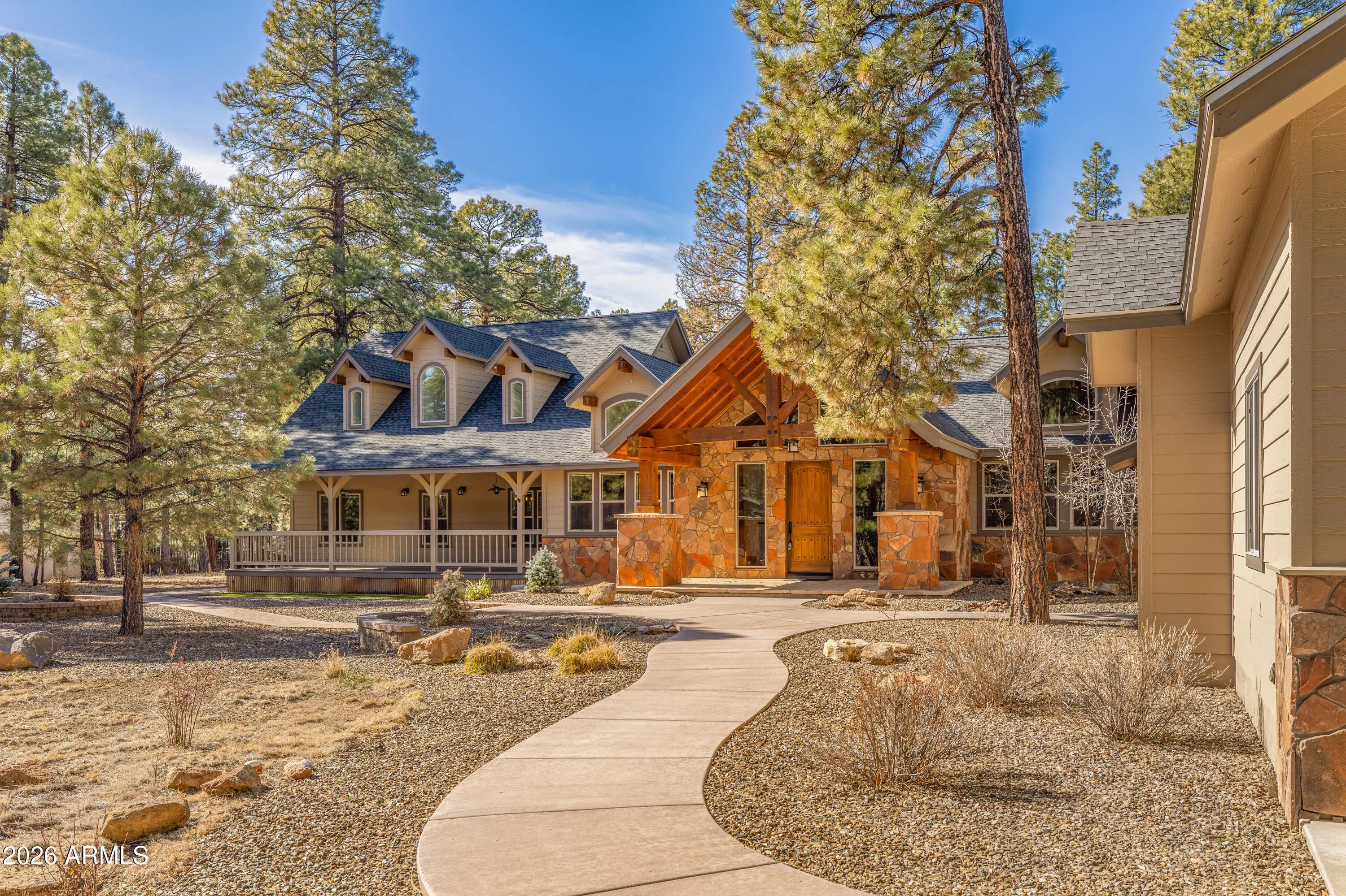 This custom Flagstaff mountain estate has been reimagined with a lighter, more refined mountain aesthetic. Set well back from the road among towering pines on nearly two private acres in the heart of Lockett Ranches, the property offers a rare sense of arrival, privacy, and calm. Thoughtfully updated throughout, the home now presents as it was always intended—bright, inviting, and effortlessly liveable—while preserving the craftsmanship and architectural presence that make it truly one of a kind. A timber-framed entry and solid wood front door welcome you into a dramatic central gathering hall designed as the heart of the home. Anchored by a floor-to-ceiling stone fireplace, massive exposed wood beams, and custom built-ins, this space was intentionally created for connectionequally suited for hosting, relaxing, or everyday living at scale. Large windows throughout frame views of the surrounding forest, filling the home with natural light and a constant connection to the outdoors. The main living areas flow comfortably from the gathering hall into the kitchen, dining, and great room spaces, creating an open yet grounded layout that works for both entertaining and quiet retreat. The home offers a predominantly single-level, split floor plan that provides flexibility, privacy, and long-term comfort, with generously sized rooms and thoughtful separation between living areas and bedrooms. A spacious garage complements the home's scale and functionality, offering ample room for vehicles, gear, and storageideal for Flagstaff living and year-round recreation. The backyard is equally intentional, opening to a peaceful forested setting that feels private and natural, with space to gather, relax, or simply enjoy the quiet of the pines. Whether hosting outdoors or enjoying a quiet morning, the setting reinforces the home's sense of retreat. Recent updates include a full interior repaint in a soft, neutral palette, updated lighting and fixtures, modernized fans and hardware, refreshed exterior paint, and professional stagingbringing a clean, contemporary mountain feel while allowing the home's custom materials and design to take center stage. Every improvement was made to enhance livability and presentation without compromising the home's original character. Surrounded by mature pines and positioned for privacy, yet just minutes from Flagstaff's best trails, parks, downtown amenities, and year-round recreation, the property offers a rare balance of seclusion and accessibility. This combination of acreage, architectural presence, and proximity is increasingly difficult to find.
