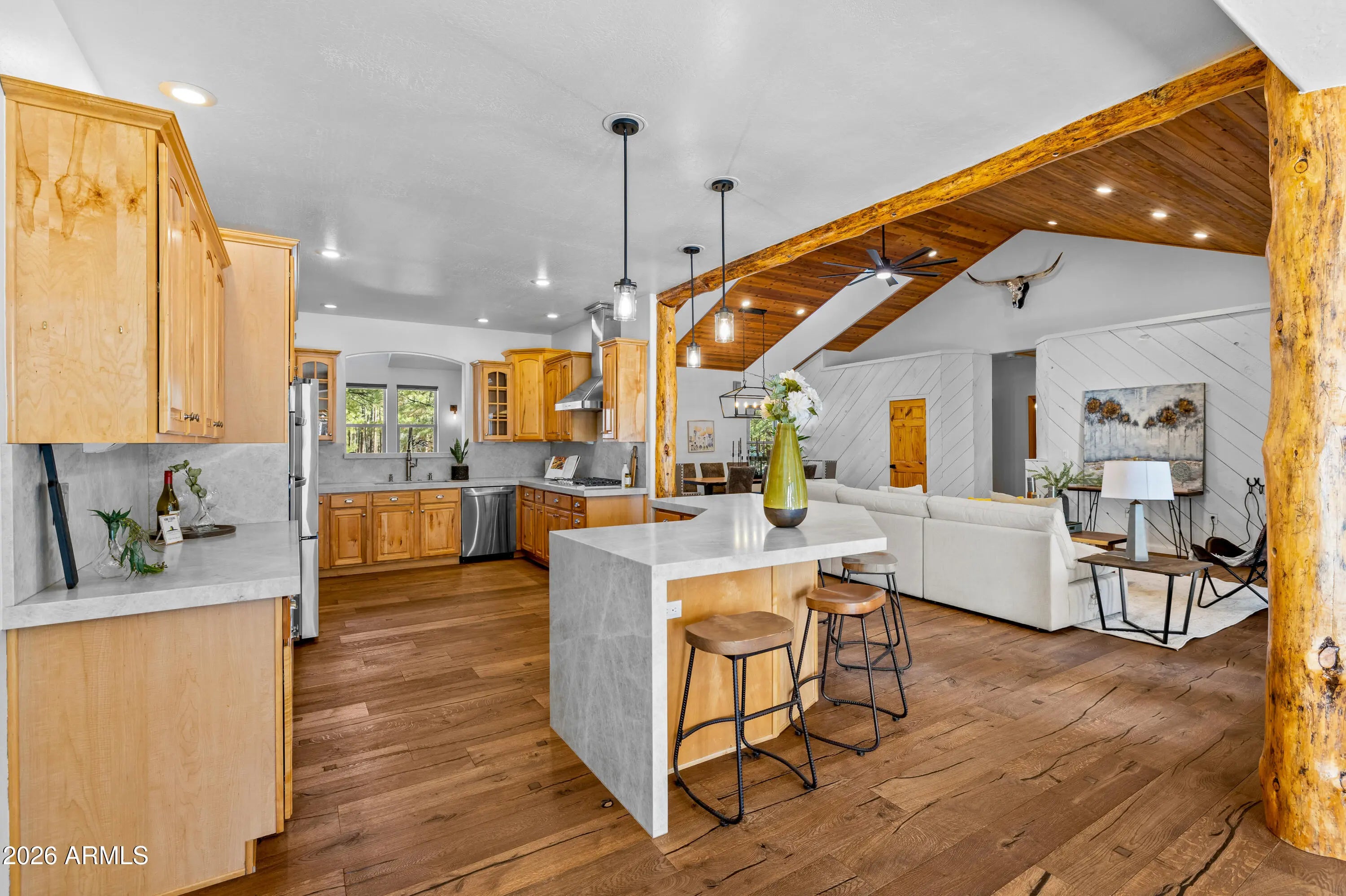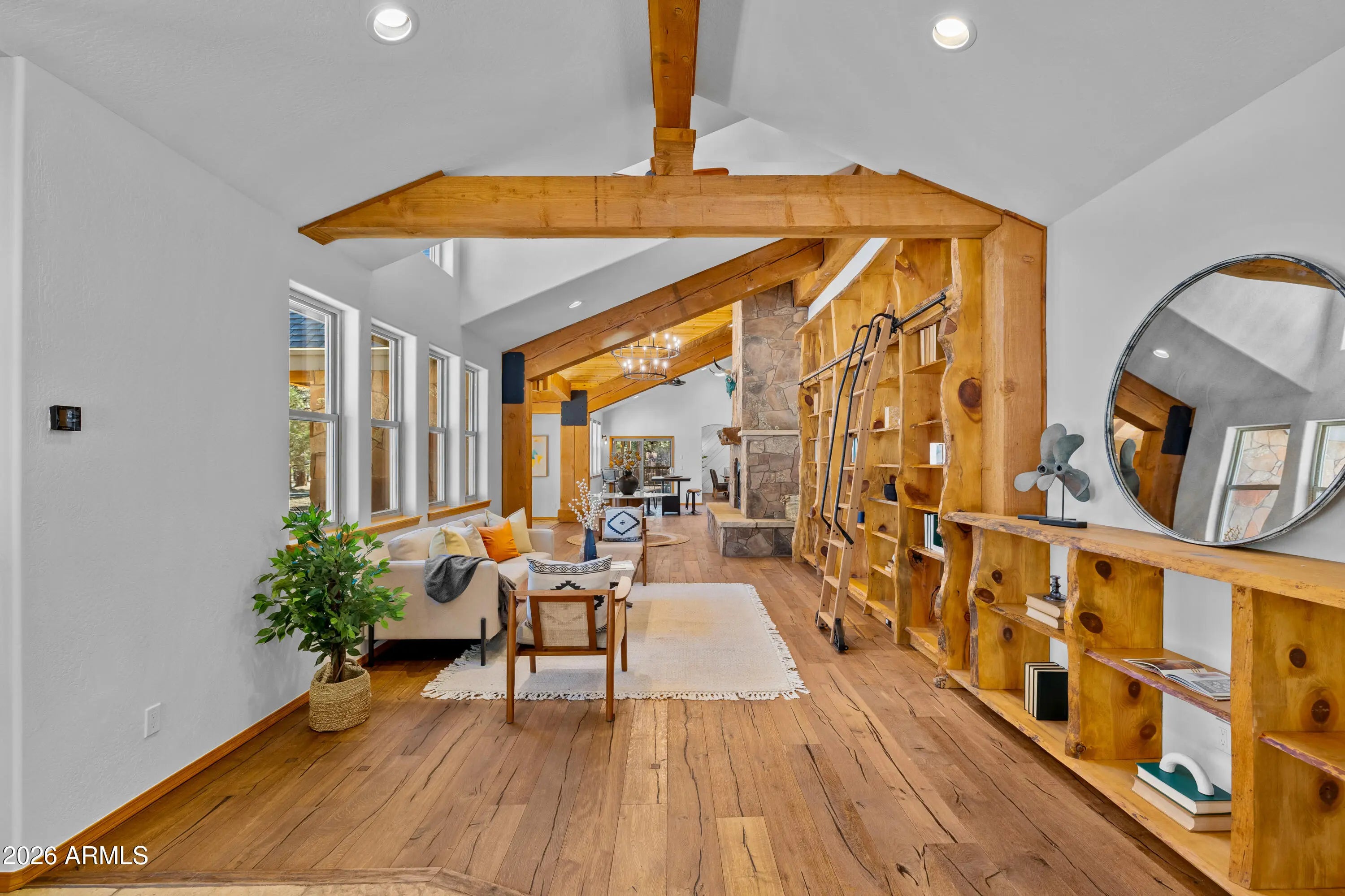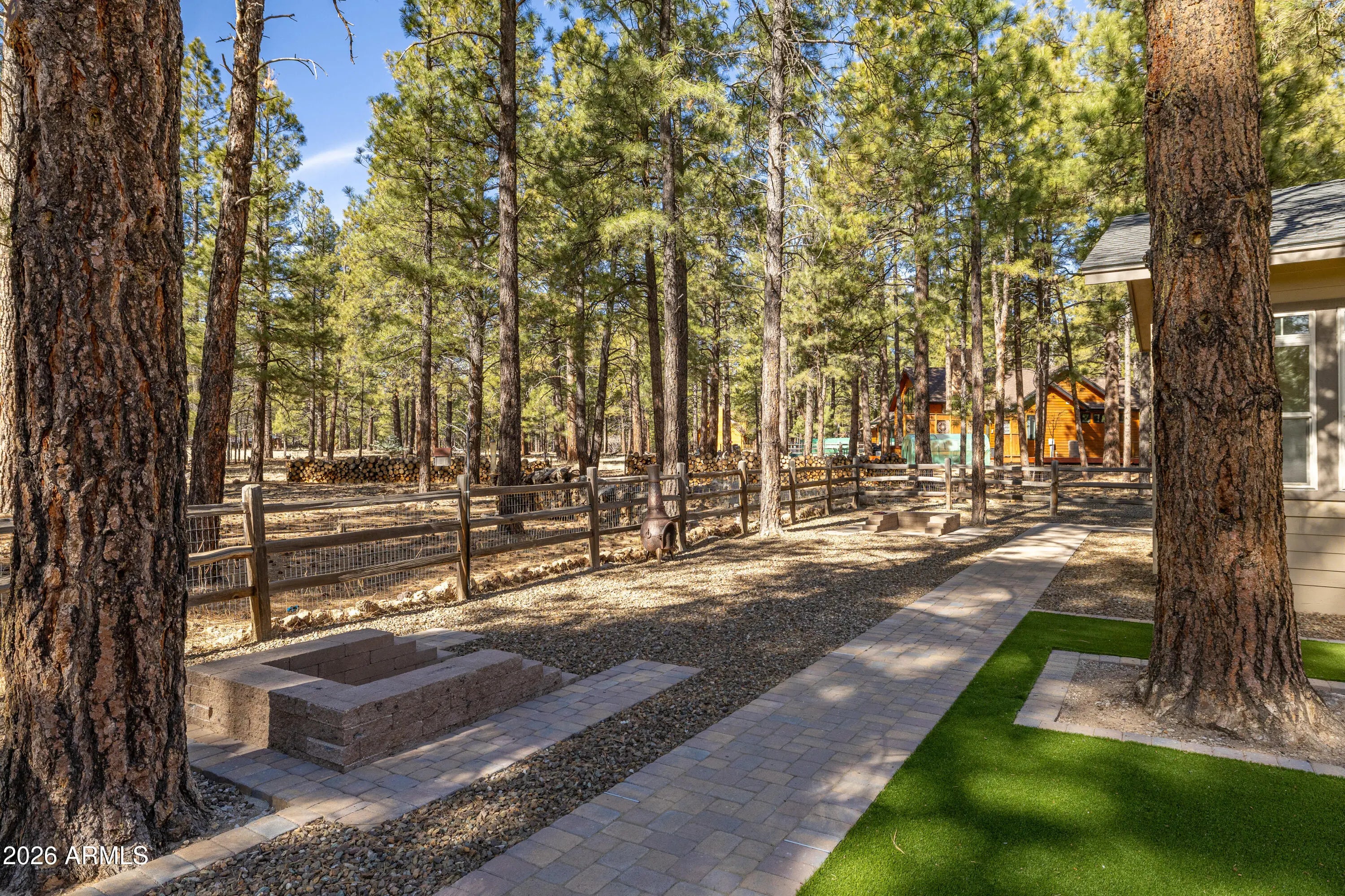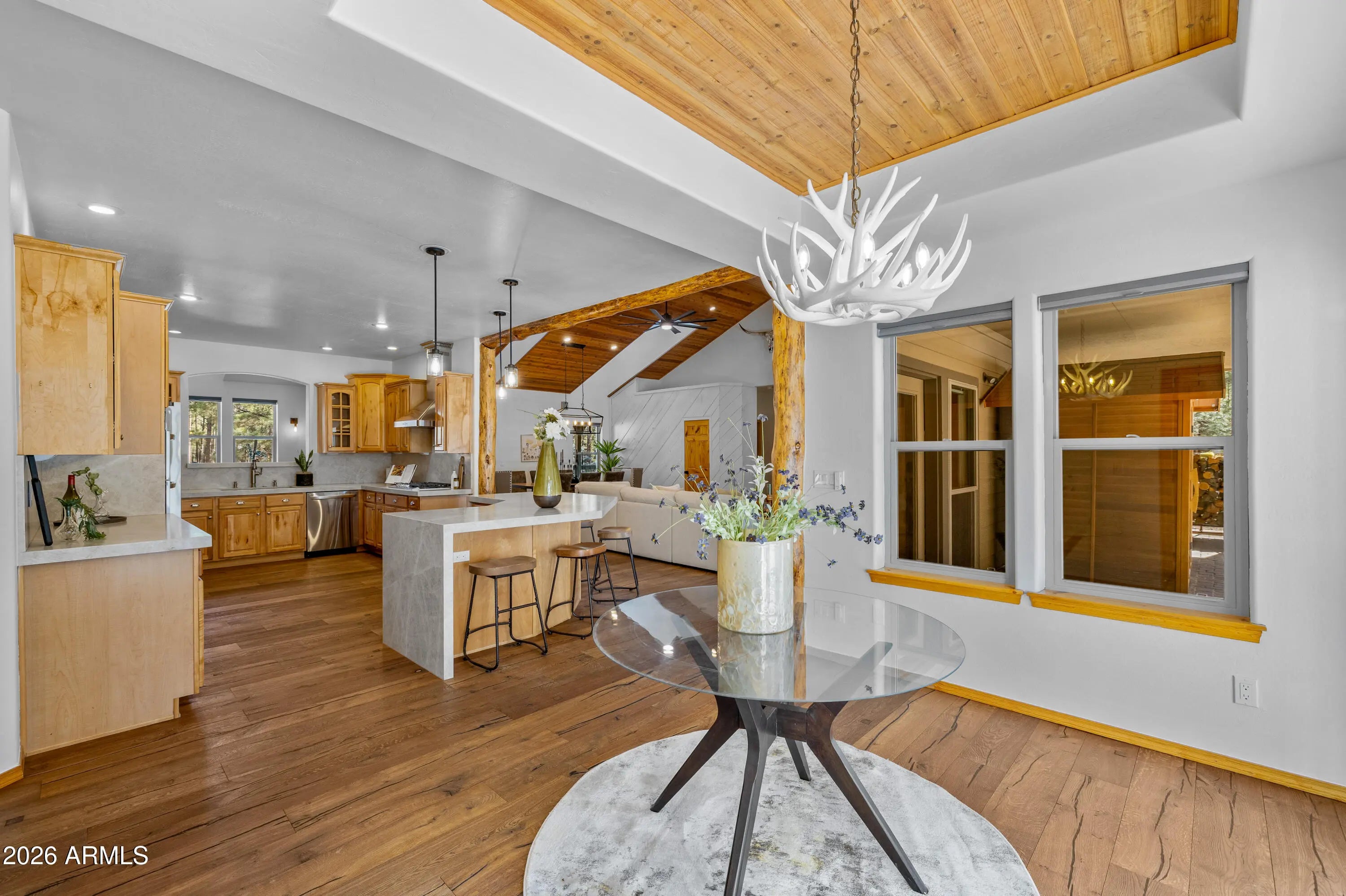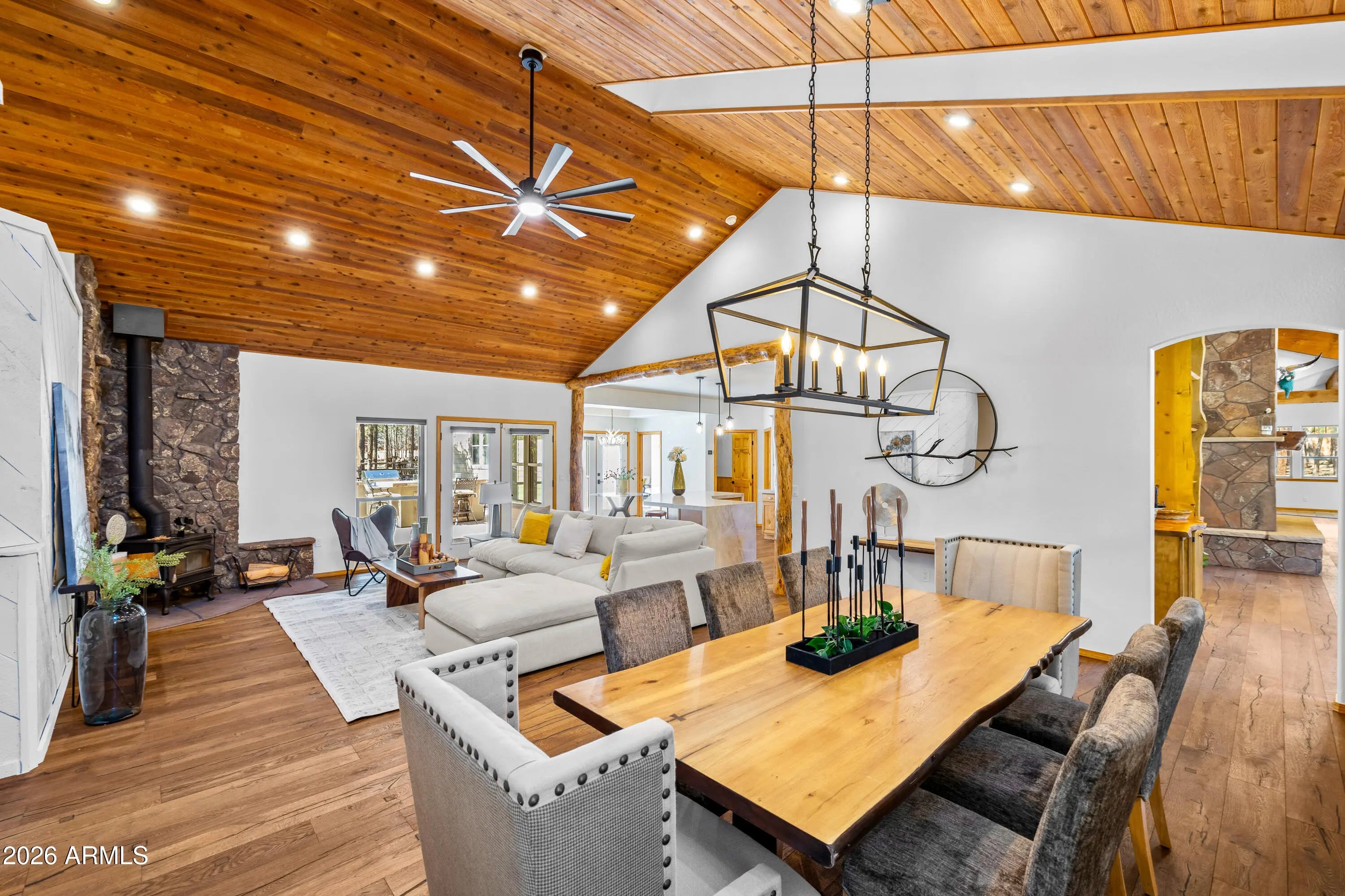 This custom Flagstaff mountain estate has been reimagined with a lighter, more refined mountain aesthetic. Set well back from the road among towering pines on nearly two private acres in the heart of Lockett Ranches, the property offers a rare sense of arrival, privacy, and calm. Thoughtfully updated throughout, the home now presents as it was always intended—bright, inviting, and effortlessly liveable—while preserving the craftsmanship and architectural presence that make it truly one of a kind. A timber-framed entry and solid wood front door welcome you into a dramatic central gathering hall designed as the heart of the home. Anchored by a floor-to-ceiling stone fireplace, massive exposed wood beams, and custom built-ins, this space was intentionally created for connectionequally suited for hosting, relaxing, or everyday living at scale. Large windows throughout frame views of the surrounding forest, filling the home with natural light and a constant connection to the outdoors. The main living areas flow comfortably from the gathering hall into the kitchen, dining, and great room spaces, creating an open yet grounded layout that works for both entertaining and quiet retreat. The home offers a predominantly single-level, split floor plan that provides flexibility, privacy, and long-term comfort, with generously sized rooms and thoughtful separation between living areas and bedrooms. A spacious garage complements the home's scale and functionality, offering ample room for vehicles, gear, and storageideal for Flagstaff living and year-round recreation. The backyard is equally intentional, opening to a peaceful forested setting that feels private and natural, with space to gather, relax, or simply enjoy the quiet of the pines. Whether hosting outdoors or enjoying a quiet morning, the setting reinforces the home's sense of retreat. Recent updates include a full interior repaint in a soft, neutral palette, updated lighting and fixtures, modernized fans and hardware, refreshed exterior paint, and professional stagingbringing a clean, contemporary mountain feel while allowing the home's custom materials and design to take center stage. Every improvement was made to enhance livability and presentation without compromising the home's original character. Surrounded by mature pines and positioned for privacy, yet just minutes from Flagstaff's best trails, parks, downtown amenities, and year-round recreation, the property offers a rare balance of seclusion and accessibility. This combination of acreage, architectural presence, and proximity is increasingly difficult to find.