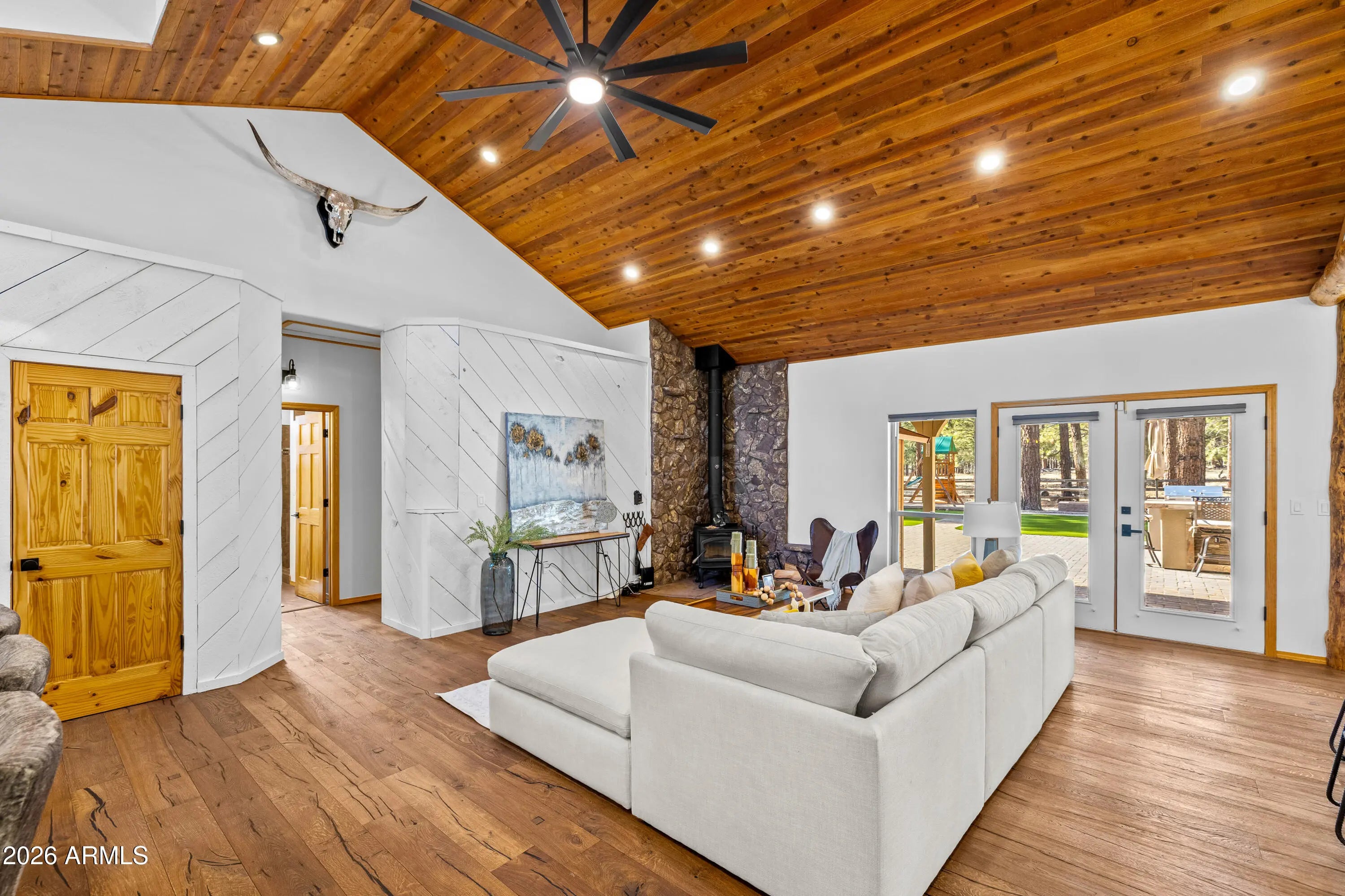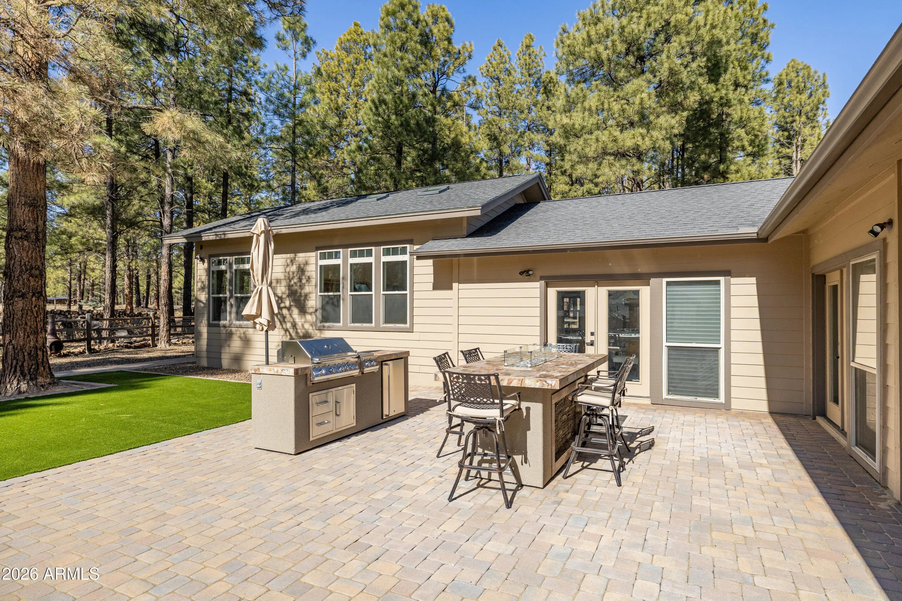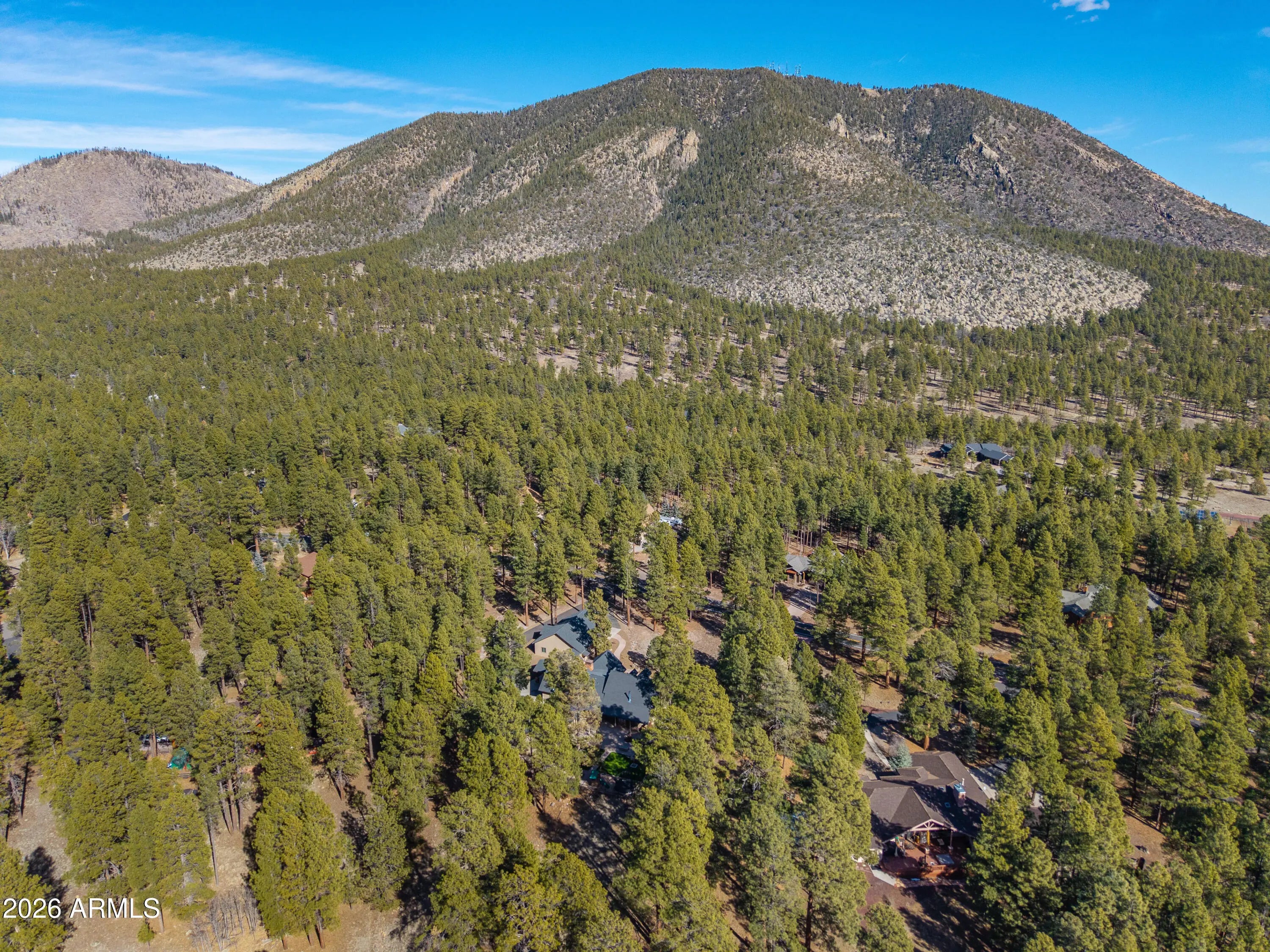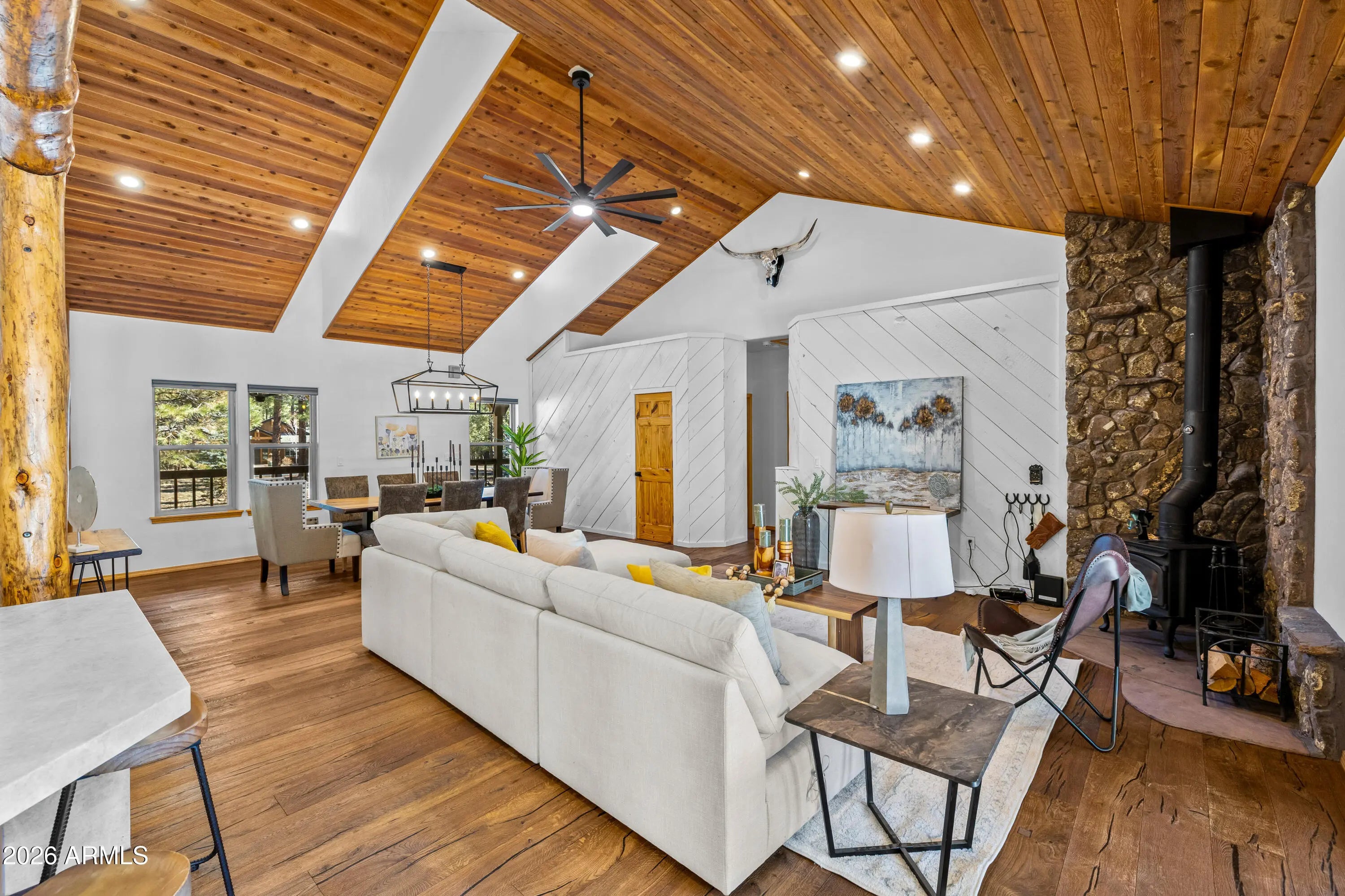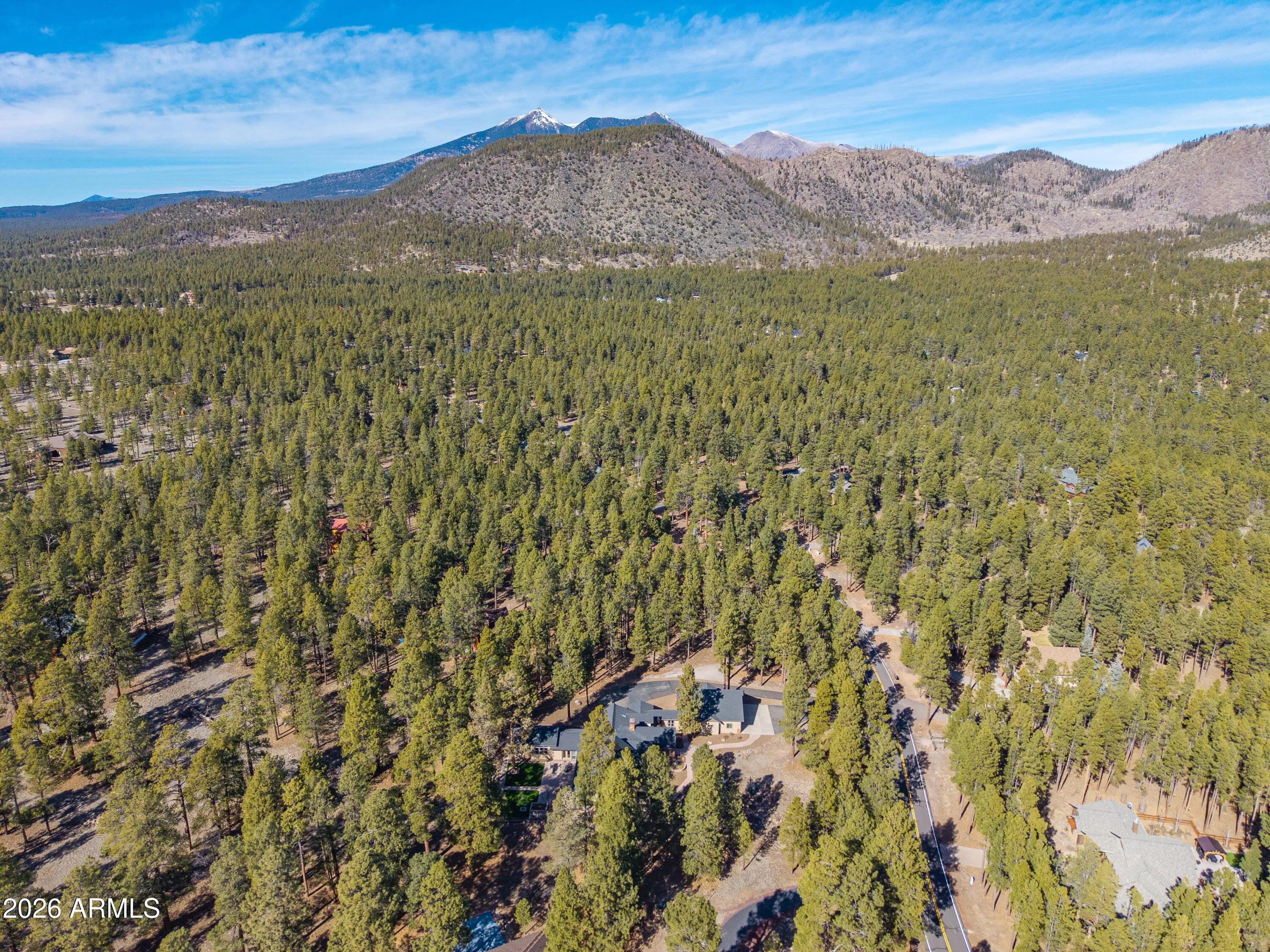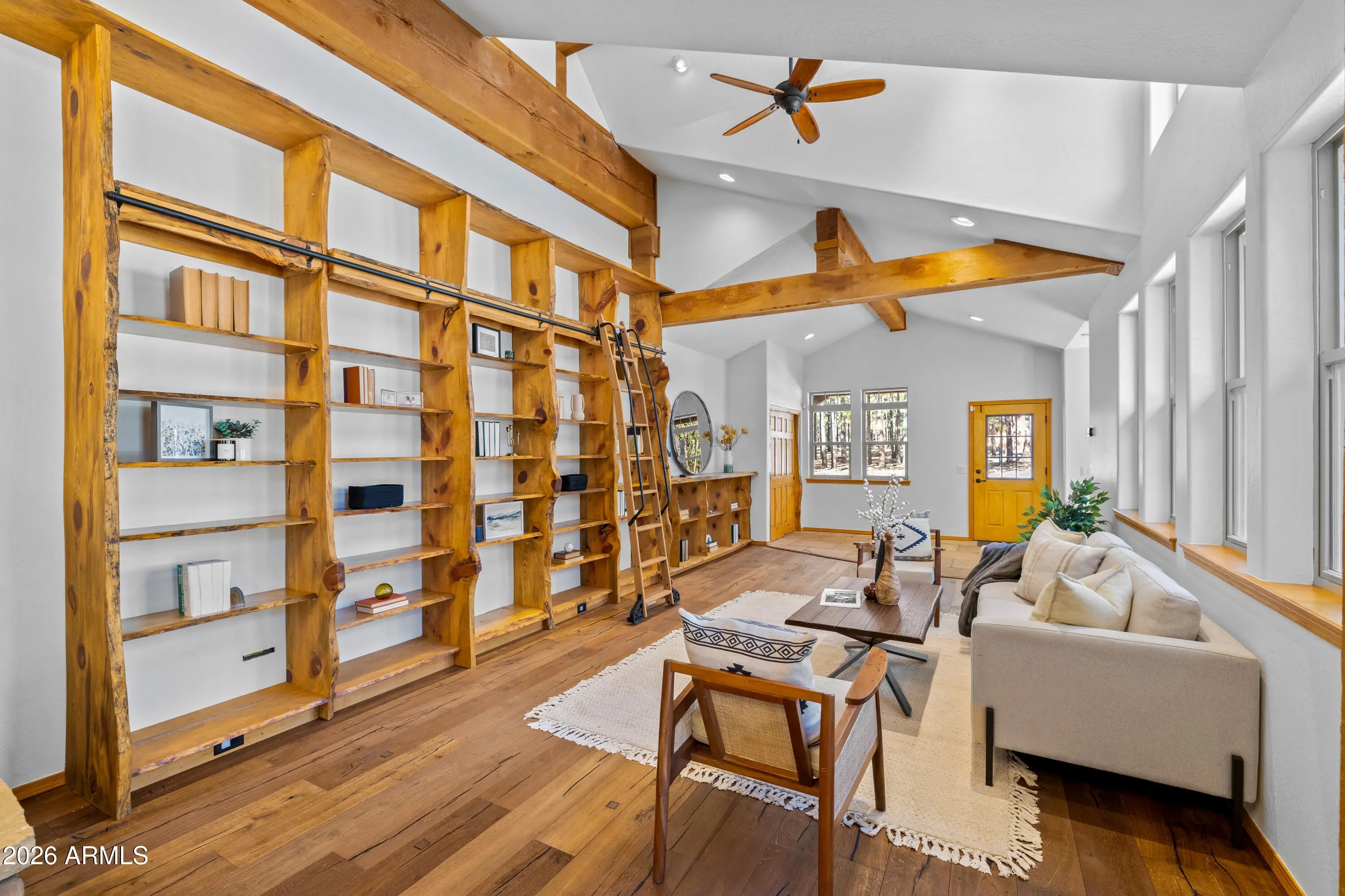 This custom Flagstaff mountain estate has been reimagined with a lighter, more refined mountain aesthetic. Set well back from the road among towering pines on nearly two private acres in the heart of Lockett Ranches, the property offers a rare sense of arrival, privacy, and calm. Thoughtfully updated throughout, the home now presents as it was always intended—bright, inviting, and effortlessly liveable—while preserving the craftsmanship and architectural presence that make it truly one of a kind. A timber-framed entry and solid wood front door welcome you into a dramatic central gathering hall designed as the heart of the home. Anchored by a floor-to-ceiling stone fireplace, massive exposed wood beams, and custom built-ins, this space was intentionally created for connectionequally suited for hosting, relaxing, or everyday living at scale. Large windows throughout frame views of the surrounding forest, filling the home with natural light and a constant connection to the outdoors. The main living areas flow comfortably from the gathering hall into the kitchen, dining, and great room spaces, creating an open yet grounded layout that works for both entertaining and quiet retreat. The home offers a predominantly single-level, split floor plan that provides flexibility, privacy, and long-term comfort, with generously sized rooms and thoughtful separation between living areas and bedrooms. A spacious garage complements the home's scale and functionality, offering ample room for vehicles, gear, and storageideal for Flagstaff living and year-round recreation. The backyard is equally intentional, opening to a peaceful forested setting that feels private and natural, with space to gather, relax, or simply enjoy the quiet of the pines. Whether hosting outdoors or enjoying a quiet morning, the setting reinforces the home's sense of retreat. Recent updates include a full interior repaint in a soft, neutral palette, updated lighting and fixtures, modernized fans and hardware, refreshed exterior paint, and professional stagingbringing a clean, contemporary mountain feel while allowing the home's custom materials and design to take center stage. Every improvement was made to enhance livability and presentation without compromising the home's original character. Surrounded by mature pines and positioned for privacy, yet just minutes from Flagstaff's best trails, parks, downtown amenities, and year-round recreation, the property offers a rare balance of seclusion and accessibility. This combination of acreage, architectural presence, and proximity is increasingly difficult to find.