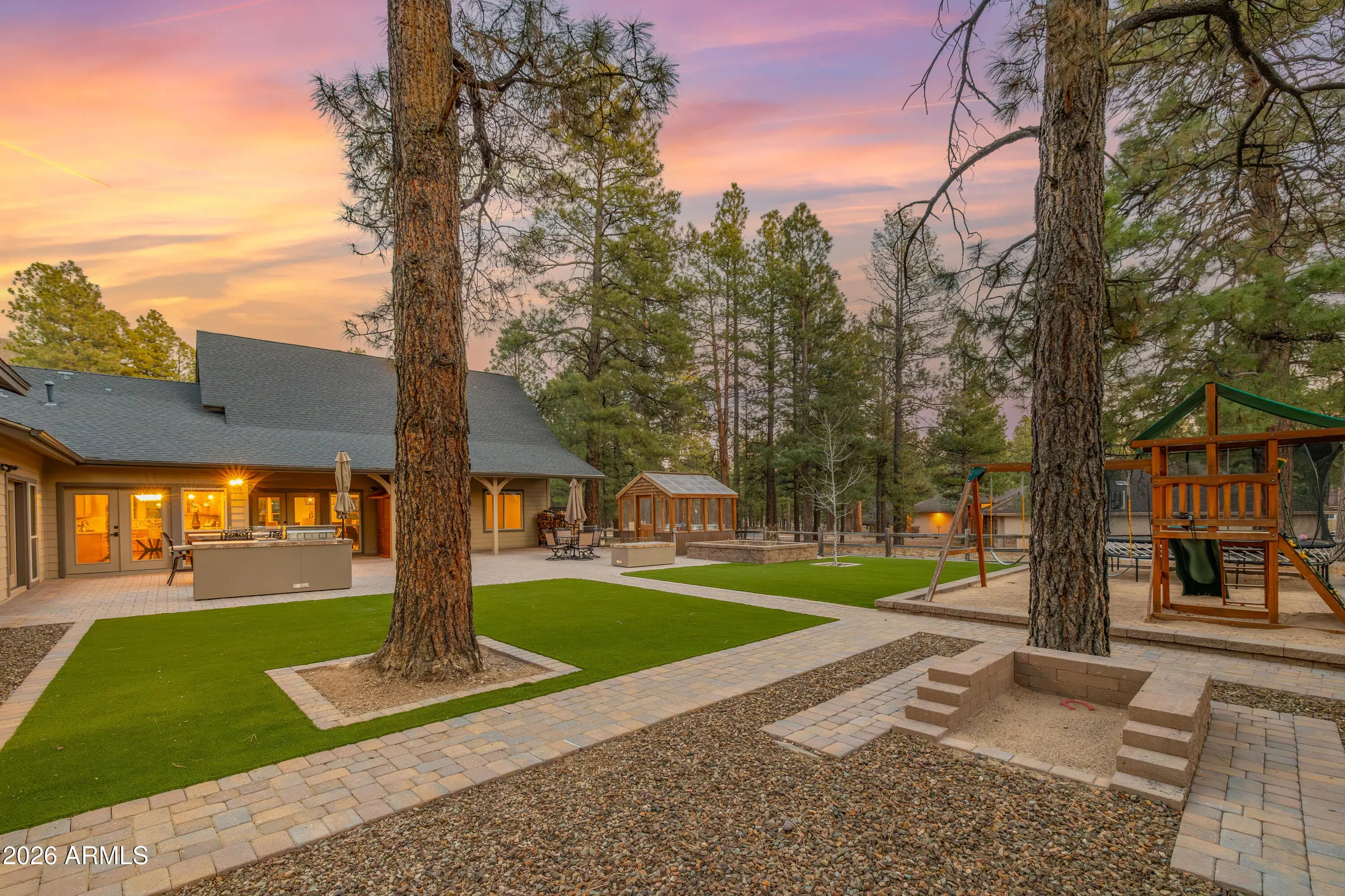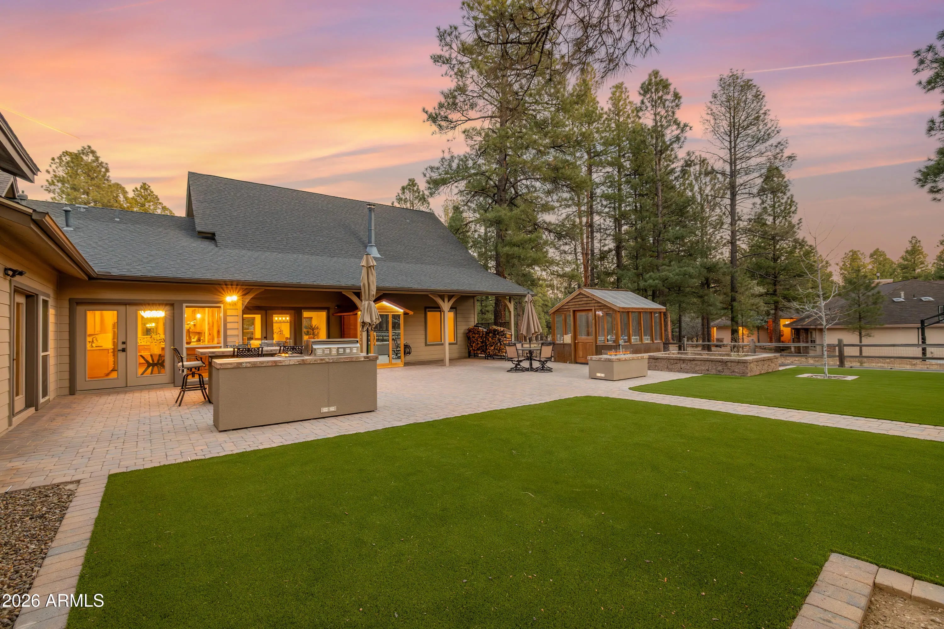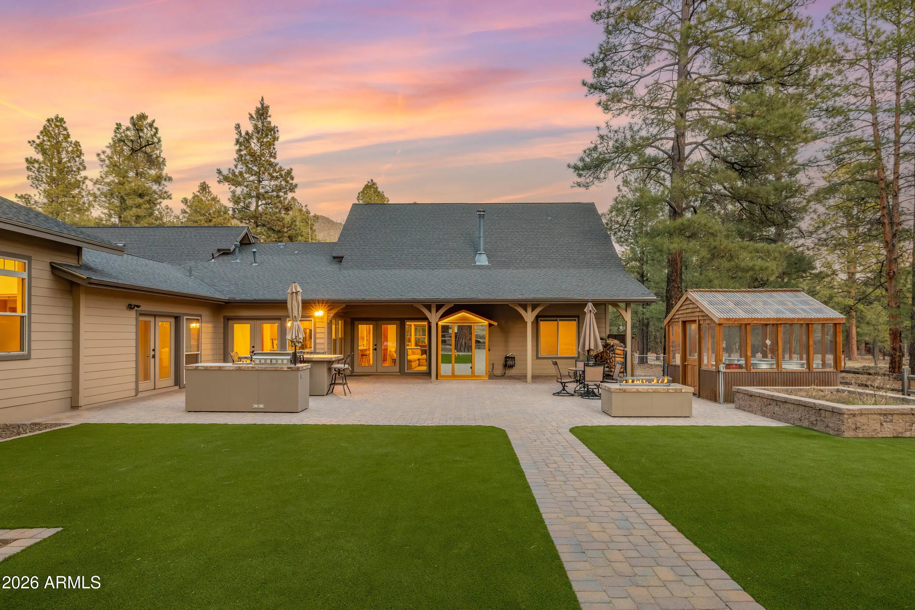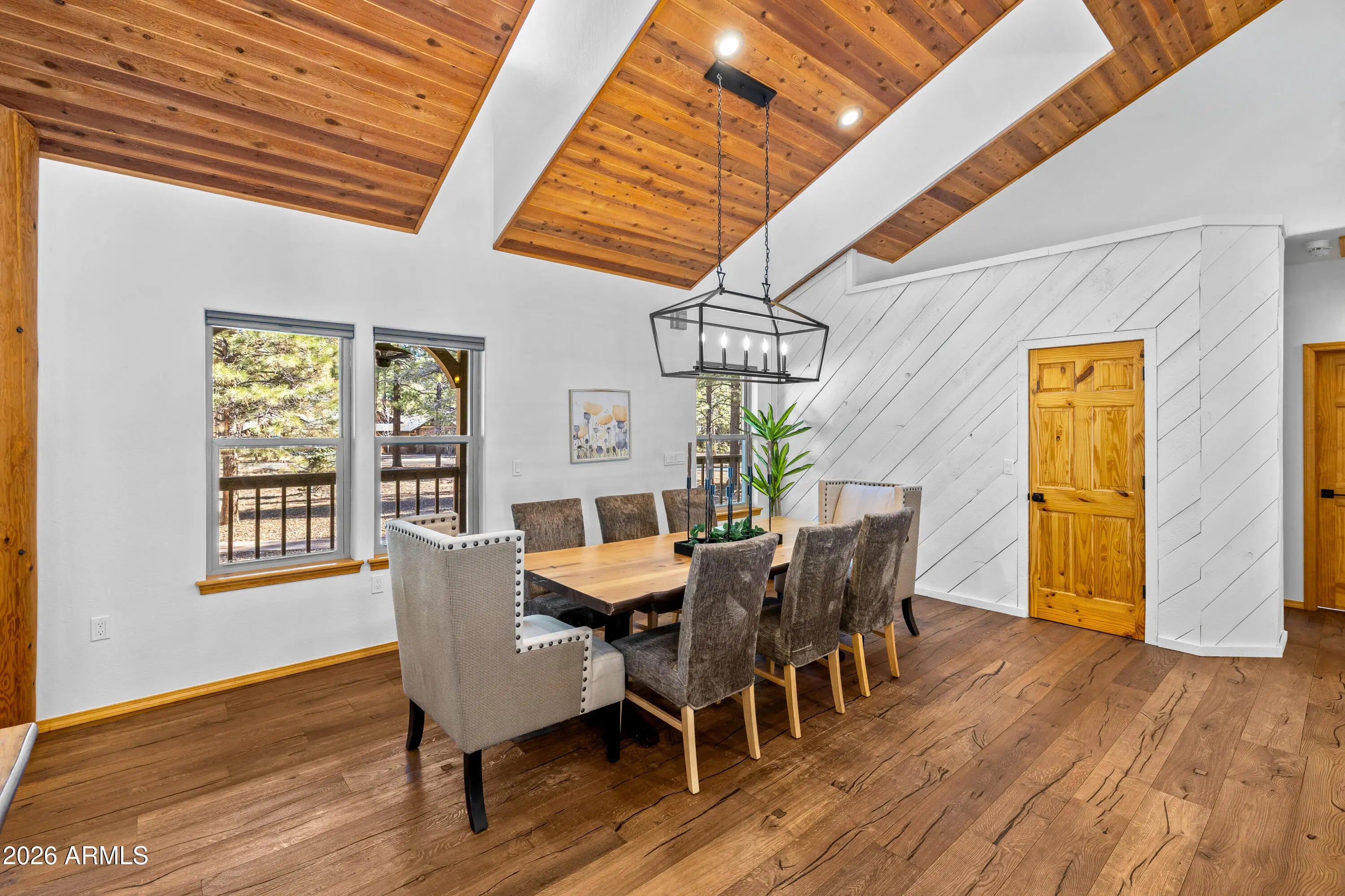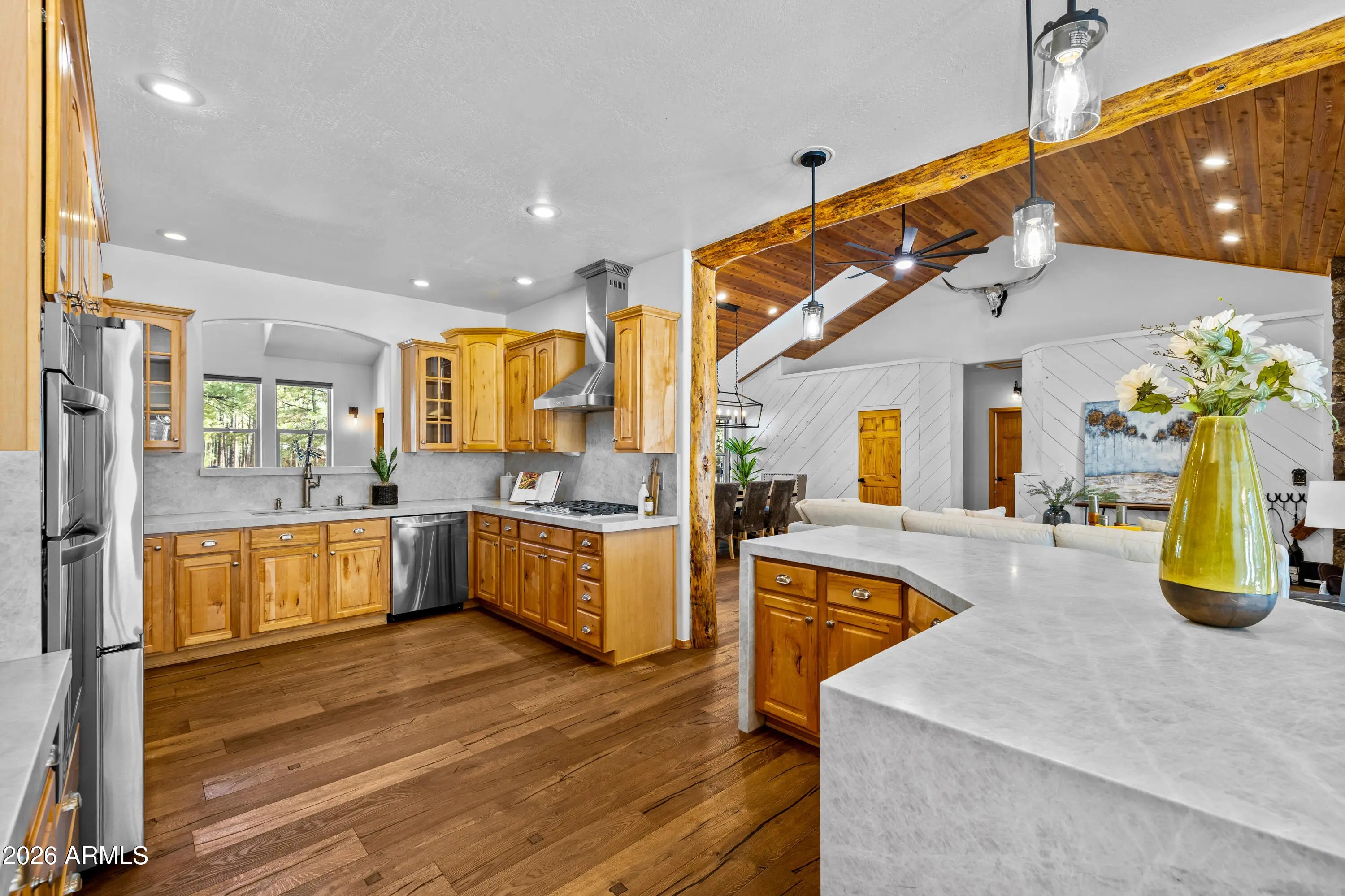 This custom Flagstaff mountain estate has been reimagined with a lighter, more refined mountain aesthetic. Set well back from the road among towering pines on nearly two private acres in the heart of Lockett Ranches, the property offers a rare sense of arrival, privacy, and calm. Thoughtfully updated throughout, the home now presents as it was always intended—bright, inviting, and effortlessly liveable—while preserving the craftsmanship and architectural presence that make it truly one of a kind. A timber-framed entry and solid wood front door welcome you into a dramatic central gathering hall designed as the heart of the home. Anchored by a floor-to-ceiling stone fireplace, massive exposed wood beams, and custom built-ins, this space was intentionally created for connectionequally suited for hosting, relaxing, or everyday living at scale. Large windows throughout frame views of the surrounding forest, filling the home with natural light and a constant connection to the outdoors. The main living areas flow comfortably from the gathering hall into the kitchen, dining, and great room spaces, creating an open yet grounded layout that works for both entertaining and quiet retreat. The home offers a predominantly single-level, split floor plan that provides flexibility, privacy, and long-term comfort, with generously sized rooms and thoughtful separation between living areas and bedrooms. A spacious garage complements the home's scale and functionality, offering ample room for vehicles, gear, and storageideal for Flagstaff living and year-round recreation. The backyard is equally intentional, opening to a peaceful forested setting that feels private and natural, with space to gather, relax, or simply enjoy the quiet of the pines. Whether hosting outdoors or enjoying a quiet morning, the setting reinforces the home's sense of retreat. Recent updates include a full interior repaint in a soft, neutral palette, updated lighting and fixtures, modernized fans and hardware, refreshed exterior paint, and professional stagingbringing a clean, contemporary mountain feel while allowing the home's custom materials and design to take center stage. Every improvement was made to enhance livability and presentation without compromising the home's original character. Surrounded by mature pines and positioned for privacy, yet just minutes from Flagstaff's best trails, parks, downtown amenities, and year-round recreation, the property offers a rare balance of seclusion and accessibility. This combination of acreage, architectural presence, and proximity is increasingly difficult to find.