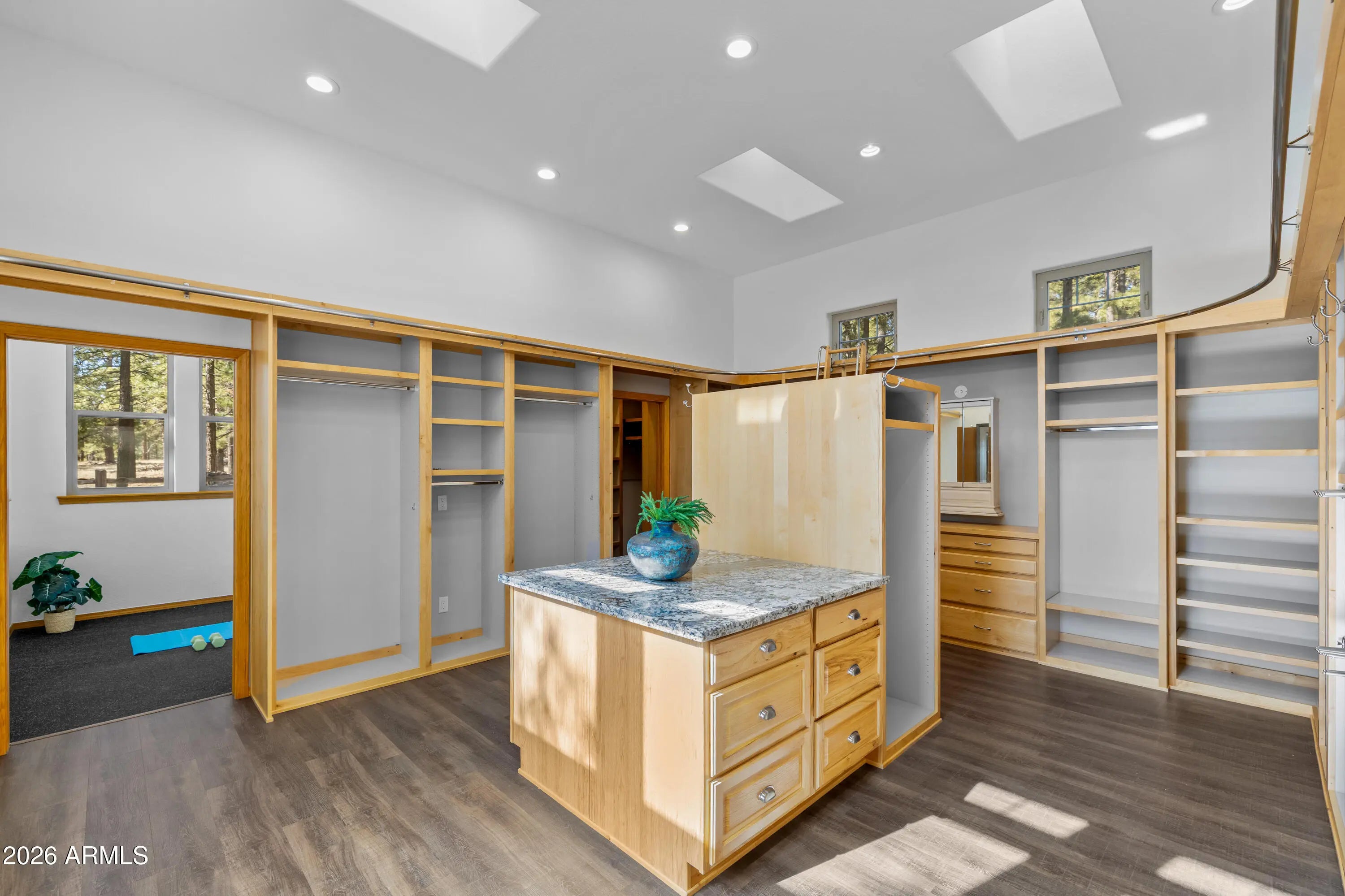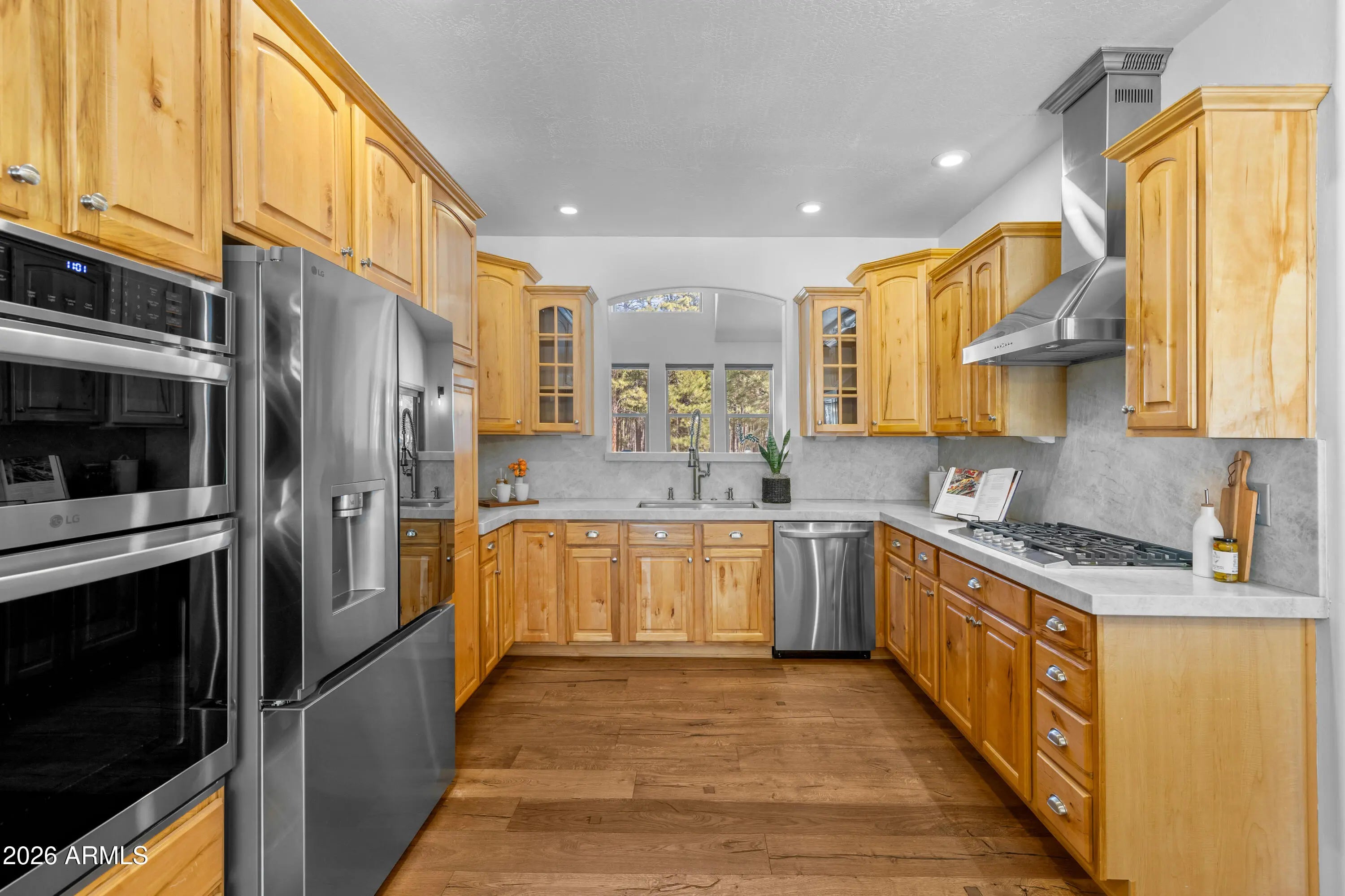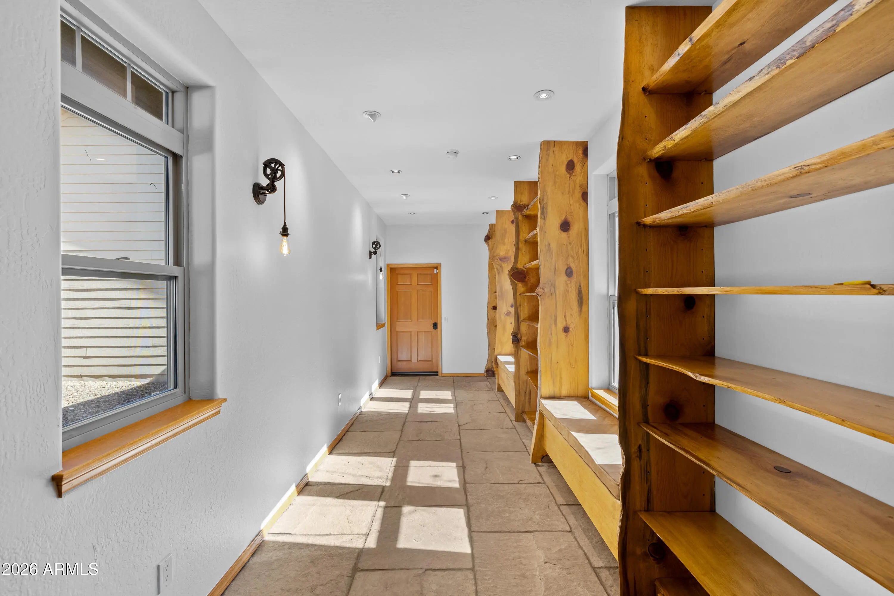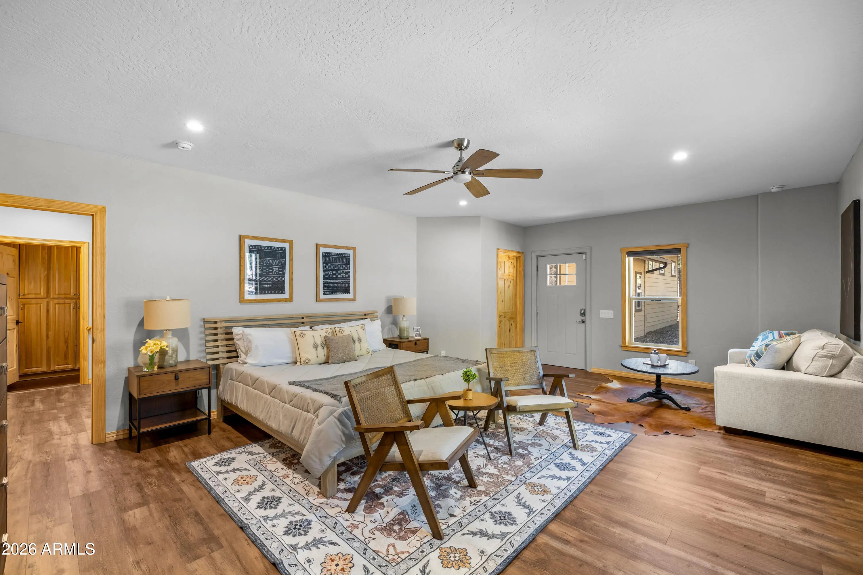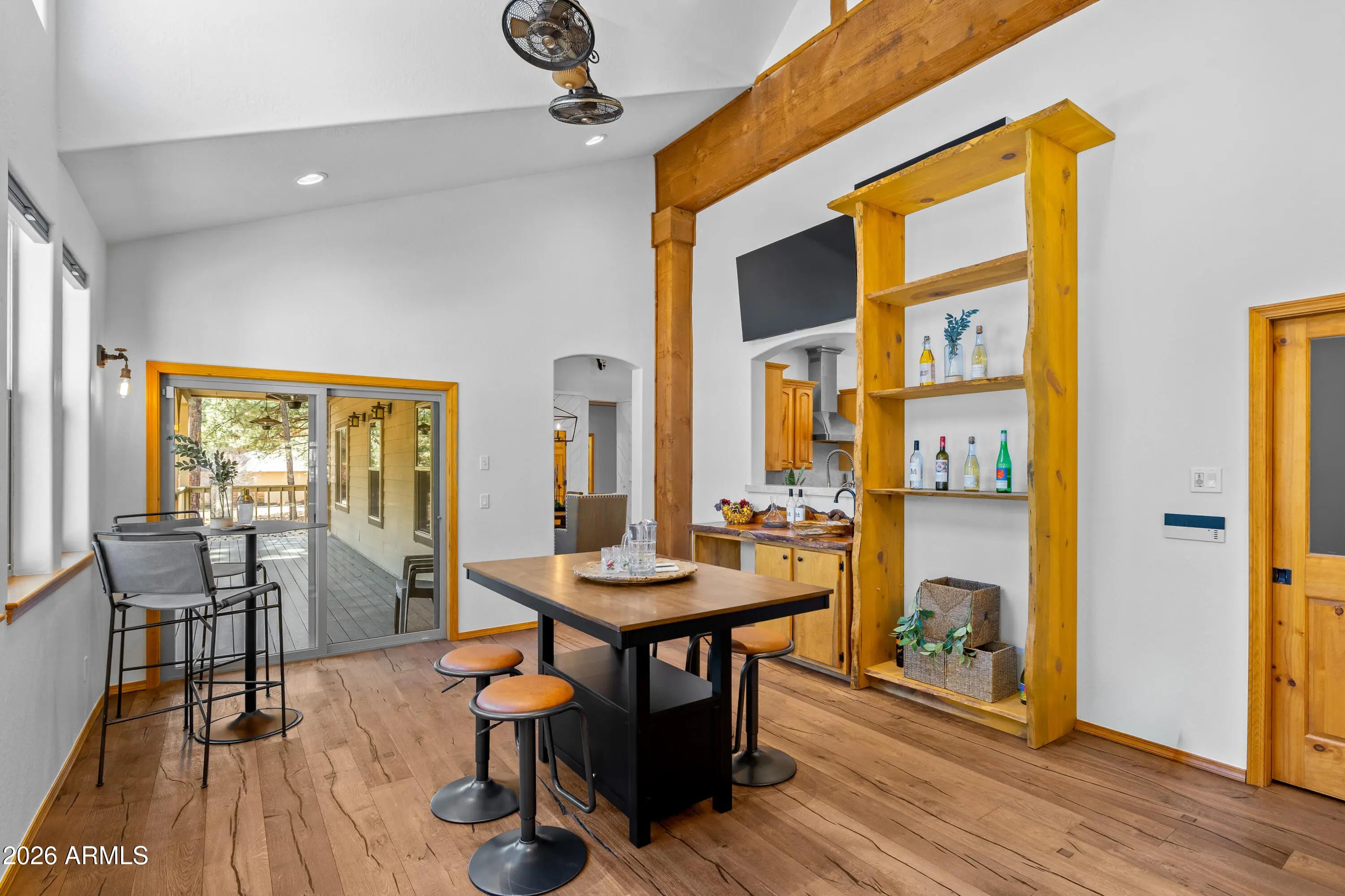 This custom Flagstaff mountain estate has been reimagined with a lighter, more refined mountain aesthetic. Set well back from the road among towering pines on nearly two private acres in the heart of Lockett Ranches, the property offers a rare sense of arrival, privacy, and calm. Thoughtfully updated throughout, the home now presents as it was always intended—bright, inviting, and effortlessly liveable—while preserving the craftsmanship and architectural presence that make it truly one of a kind. A timber-framed entry and solid wood front door welcome you into a dramatic central gathering hall designed as the heart of the home. Anchored by a floor-to-ceiling stone fireplace, massive exposed wood beams, and custom built-ins, this space was intentionally created for connectionequally suited for hosting, relaxing, or everyday living at scale. Large windows throughout frame views of the surrounding forest, filling the home with natural light and a constant connection to the outdoors. The main living areas flow comfortably from the gathering hall into the kitchen, dining, and great room spaces, creating an open yet grounded layout that works for both entertaining and quiet retreat. The home offers a predominantly single-level, split floor plan that provides flexibility, privacy, and long-term comfort, with generously sized rooms and thoughtful separation between living areas and bedrooms. A spacious garage complements the home's scale and functionality, offering ample room for vehicles, gear, and storageideal for Flagstaff living and year-round recreation. The backyard is equally intentional, opening to a peaceful forested setting that feels private and natural, with space to gather, relax, or simply enjoy the quiet of the pines. Whether hosting outdoors or enjoying a quiet morning, the setting reinforces the home's sense of retreat. Recent updates include a full interior repaint in a soft, neutral palette, updated lighting and fixtures, modernized fans and hardware, refreshed exterior paint, and professional stagingbringing a clean, contemporary mountain feel while allowing the home's custom materials and design to take center stage. Every improvement was made to enhance livability and presentation without compromising the home's original character. Surrounded by mature pines and positioned for privacy, yet just minutes from Flagstaff's best trails, parks, downtown amenities, and year-round recreation, the property offers a rare balance of seclusion and accessibility. This combination of acreage, architectural presence, and proximity is increasingly difficult to find.