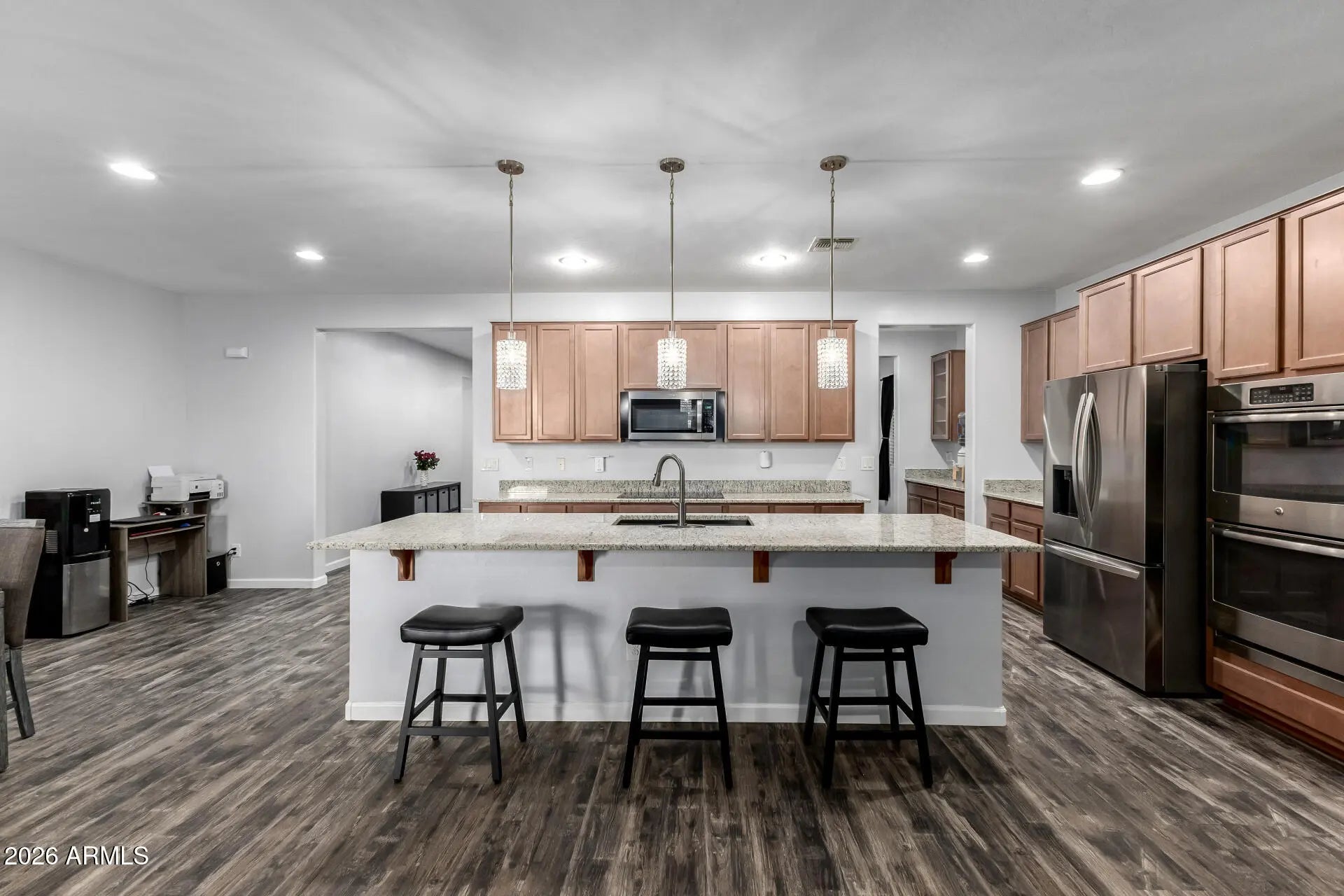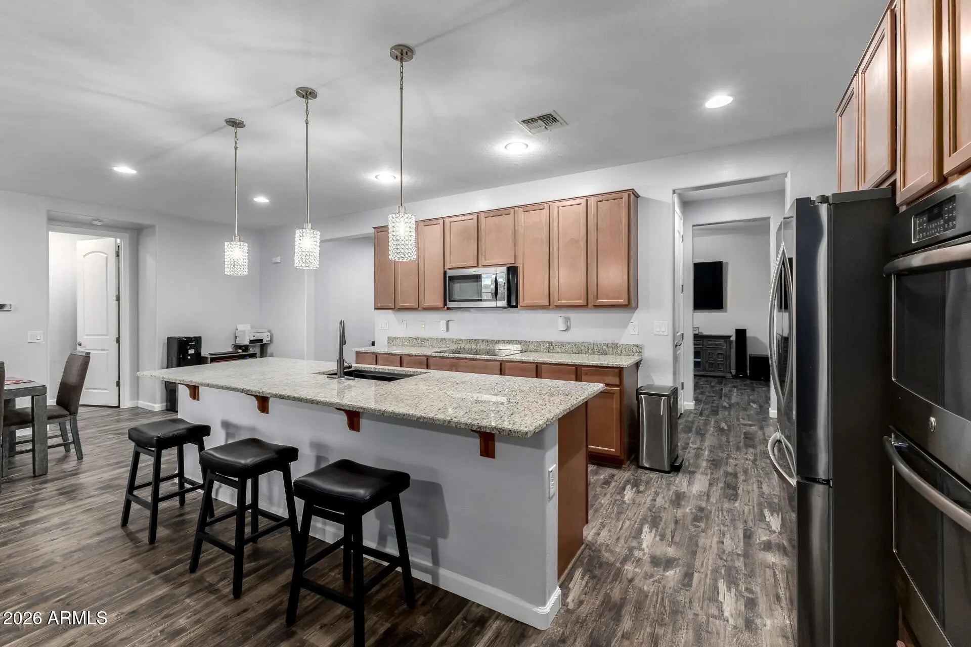 Beautifully upgraded 4 bed, 3 bath home in San Tan Valley with a desirable split floor plan and luxury vinyl plank flooring throughout. The gourmet kitchen features granite countertops, 42'' cabinets, built-in double ovens, new electric cooktop, stainless steel appliances and RO system. Spacious primary suite offers separate tub and shower. Enjoy Arizona living with a 2017 saltwater pool, security fence, large pergola, and BBQ pergola--plus a greenbelt behind so no rear neighbors. 2024 Bosch HVAC, owned solar, 1-year-old water softener, keyless entry, solar screens, security cameras, and washer/dryer convey.