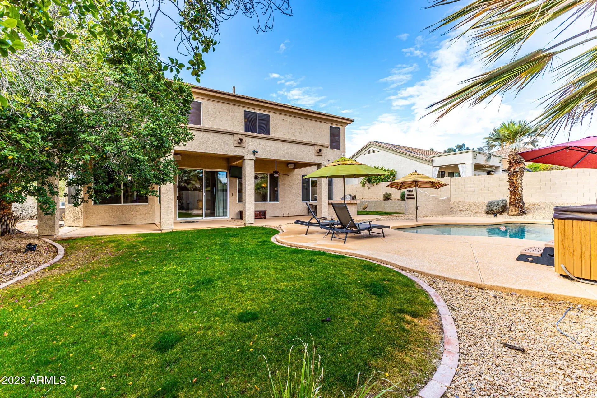 Ocotillo living in Chandler at its finest! Large, elevated corner lot with almost 3500 sf of living space. 5 roomy BRs, 3.5 BAs (ensuite downstairs), den, and bonus/media room off the great room. Kitchen features an expansive granite island, Blanco sink, RO system, pull-out shelves, lighted cabinets/under cabinet lighting, wine fridge, trash pull-out, and SS appliances. W/D, storage closets, freezer, fridge in laundry room. Soft water system. Luxurious spa-like primary bedroom ensuite features a stand-alone soaker tub, multi-head shower system, stunning cabinetry, and thoughtful niches for your personal care needs. 2021 remodeled pool, BBQ island, spa, grassy areas and expanded covered patio. New roof, AC 2021, new int paint 2026. Original owner. Near tech corridor, 101, 202, A+ schools!