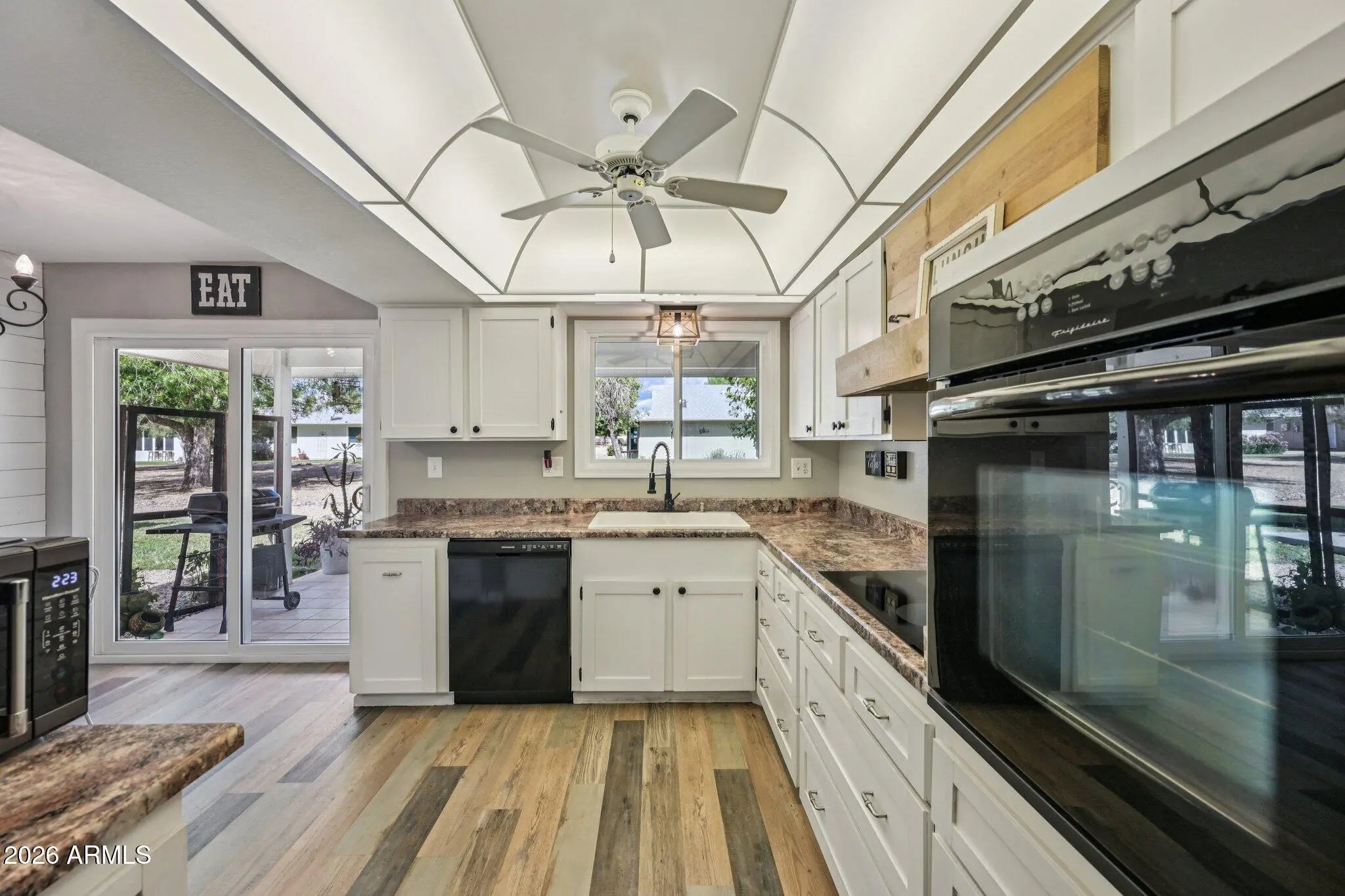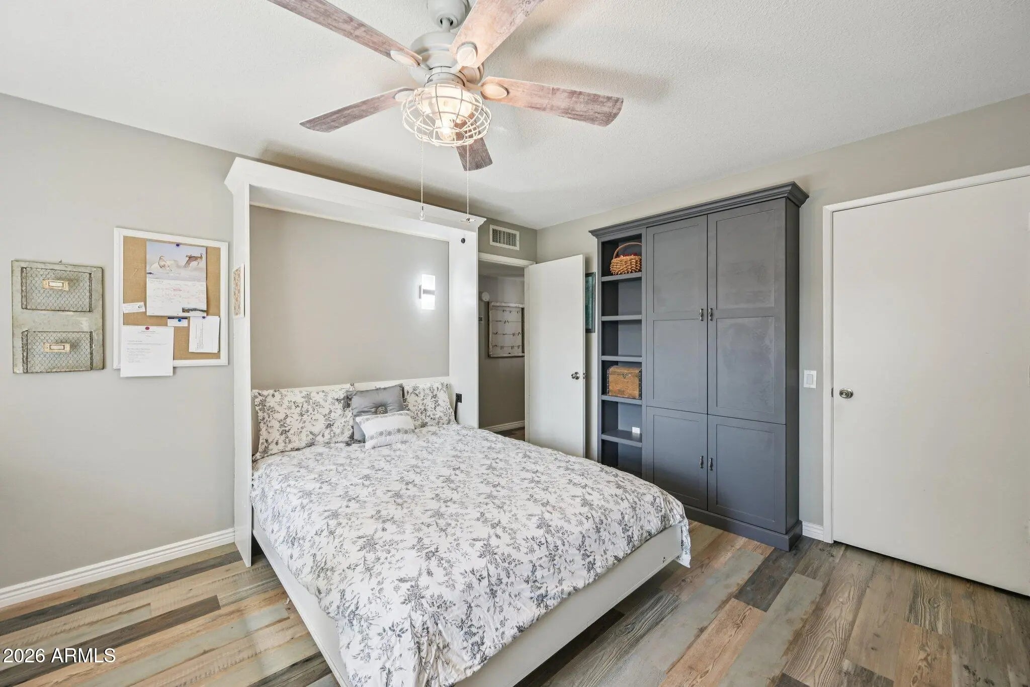 Beautifully updated Gemini Twin in the heart of Sun City West. Major improvements include the roof, HVAC, solar panels, plank flooring, baseboards, dual-pane windows, window coverings, and fresh interior paint. The guest room is exceptional, featuring custom built-ins that maximize space and versatility: a Murphy bed with integrated reading lights for guests, a built-in desk for a home office, an entertainment center, and even a cleverly designed fold-out workstation for arts and crafts. In the kitchen, a custom hood, refreshed cabinetry, and a shiplap accent wall create a warm, farmhouse-inspired feel. Additional upgrades include a newer garage door and opener, and added garage cabinetry for extra storage. The front patio and covered back patio are perfect spaces to enjoy AZ evenings!