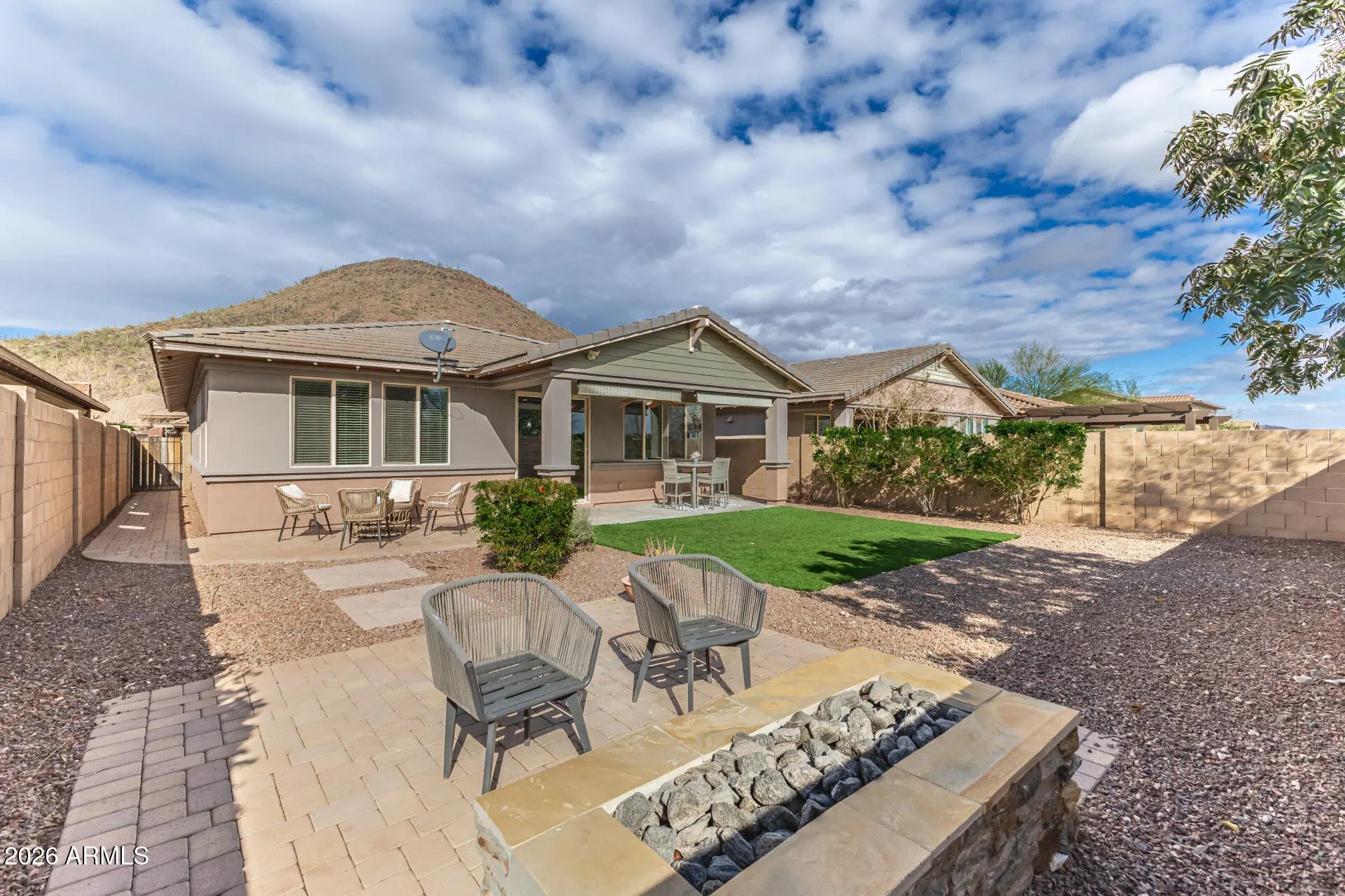 This well kept 3 bed/2bath Vistancia Village home awaits you. With upgraded interior designs, tons of natural light, and fresh interior AND exterior paint... this home is move-in ready! Brand new garage door and recent roof inspection performed. The open floor plan creates a large living and dining area surrounding the beautiful kitchen. Main bedroom has new carpet and a large walk-in shower. The low maintenance backyard has artificial grass, laid pavers for extra entertainment space, a gas fire pit and addtn'l pavers for a spa w/ a 220 outlet connection (addtn'l 220v at front). Take advantage of the Clubhouse Amenities that include multiple Swimming, slide, tennis courts, pickelball, basketball, movement studio and library. Plus golf, walking trails, parks and hiking. Visit today