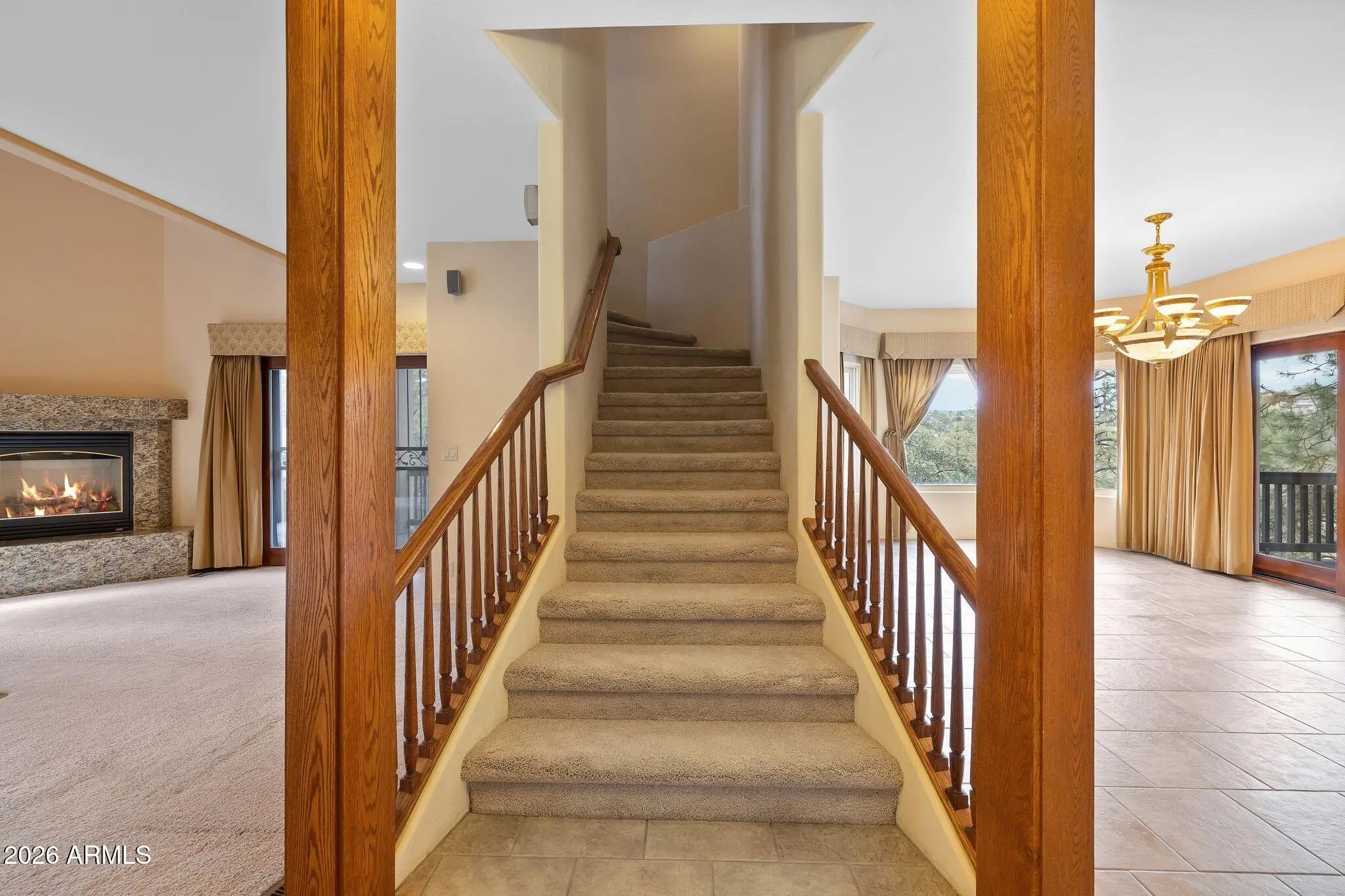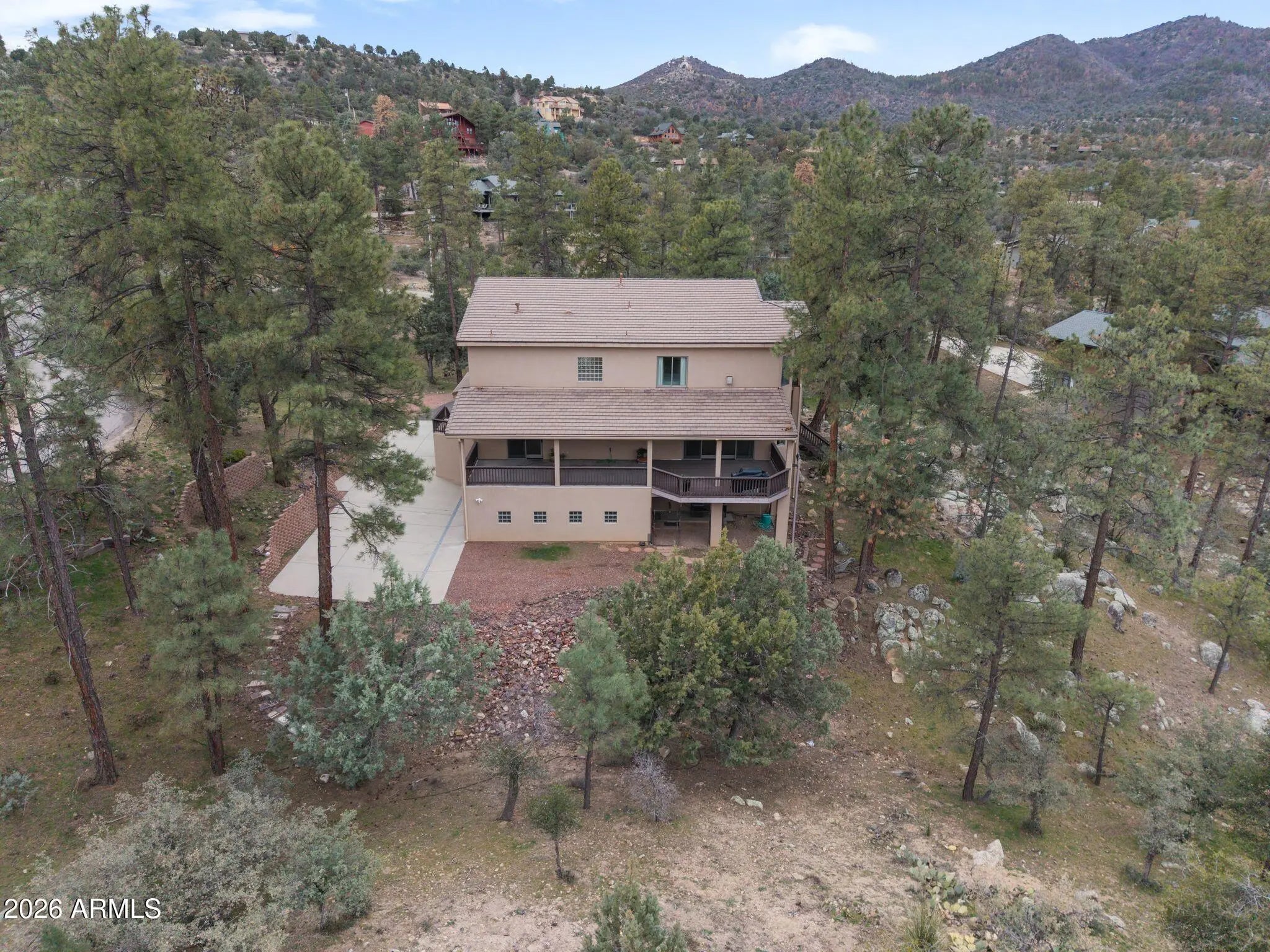 Hidden among towering pines on 1.8 acres of serene landscape, this extraordinary custom residence captures the essence of refined mountain living where privacy, elegance, and comfort converge just moments from the heart of Prescott. From the moment you enter, expansive windows frame endless treetop views. The formal dining room offers a dramatic setting for gatherings, while the living room invites relaxation with surround sound and a striking fireplace. The kitchen was designed for connection--opening seamlessly to an expansive deck made for sunset dinners and effortless entertaining. Not to mention the dumbwaiter from the garage to a cabinet in the kitchen for easy transport of the groceries. Along with a built-in natural gas grill ensures gatherings are never interrupted. Upstairs, a breathtaking library loft overlooks the living space below, a quiet sanctuary for reading, reflection, or inspiration. The primary suite is a retreat unto itself, complete with a cozy fireplace, private deck nestled in the pines, spa-inspired bath with jetted soaking tub, dual walk-in closets, convenient upstairs laundry. Additional upper-level spaces offer flexibility for guests, creative pursuits, or executive office needs. Separate guest quarters provide full independence with a private garage, kitchen, and bath, perfect for multi-generational living or extended stays. This is more than a home, it is a private mountain sanctuary designed for those who value craftsmanship, tranquility, and elevated living.