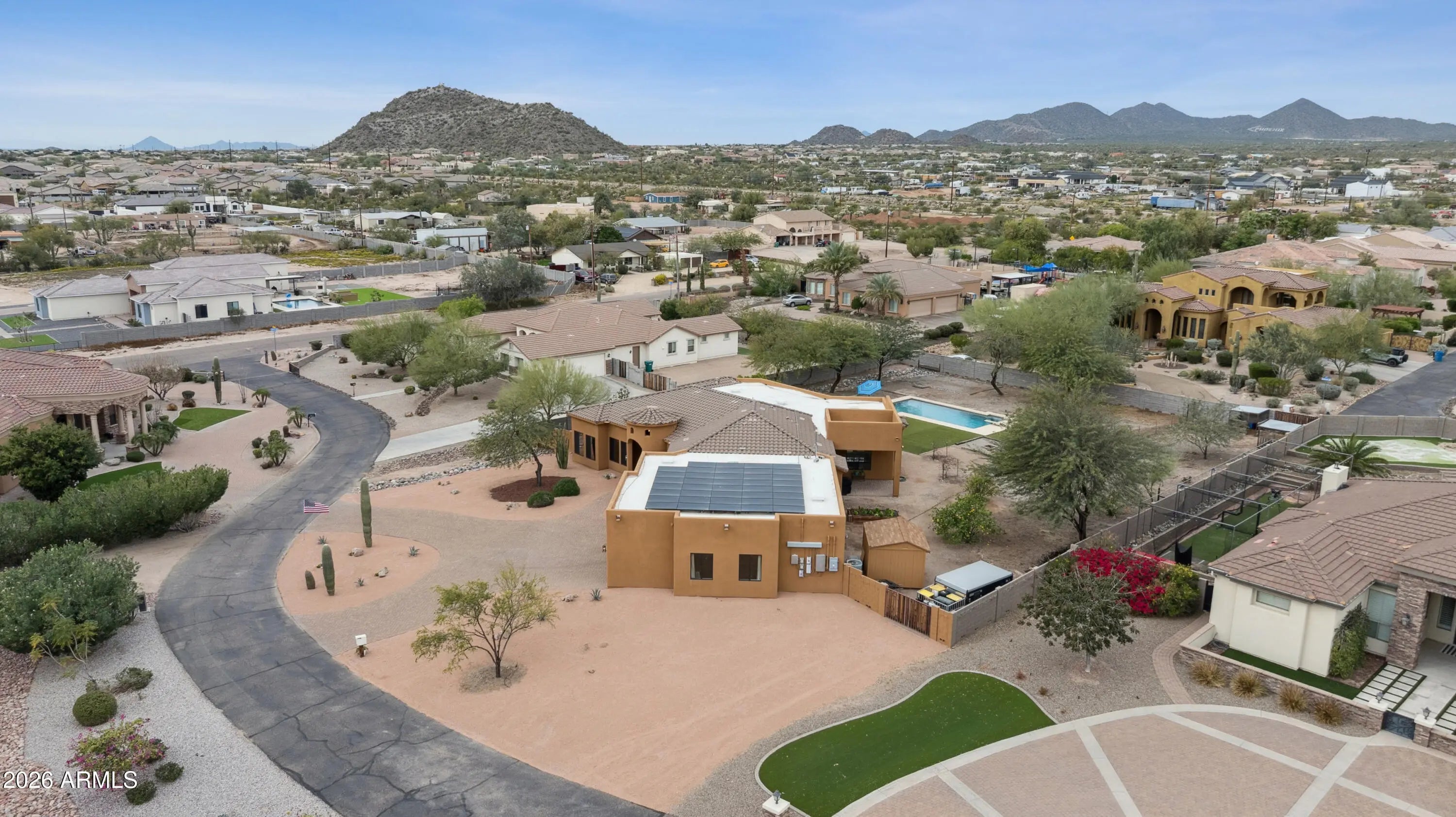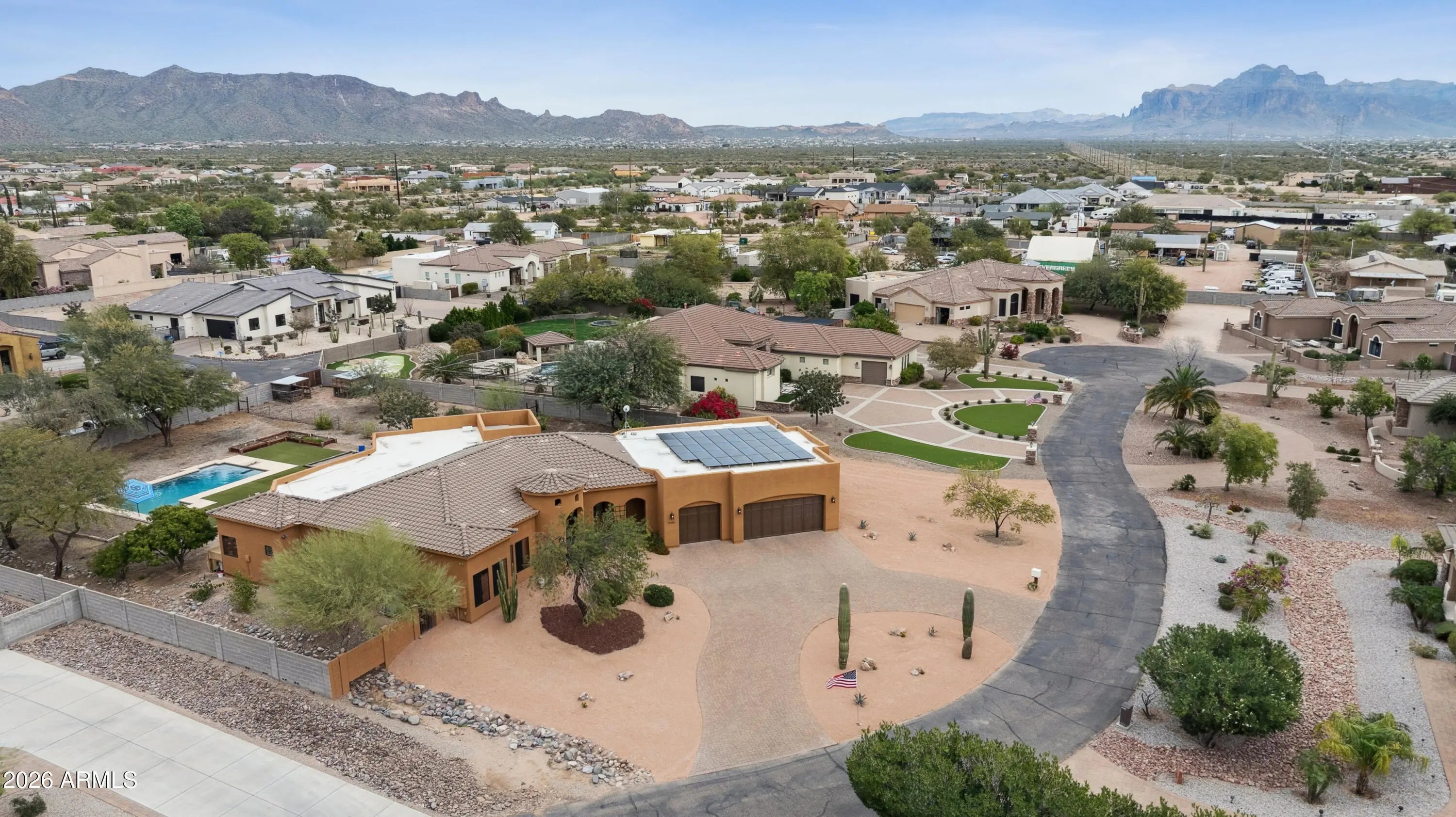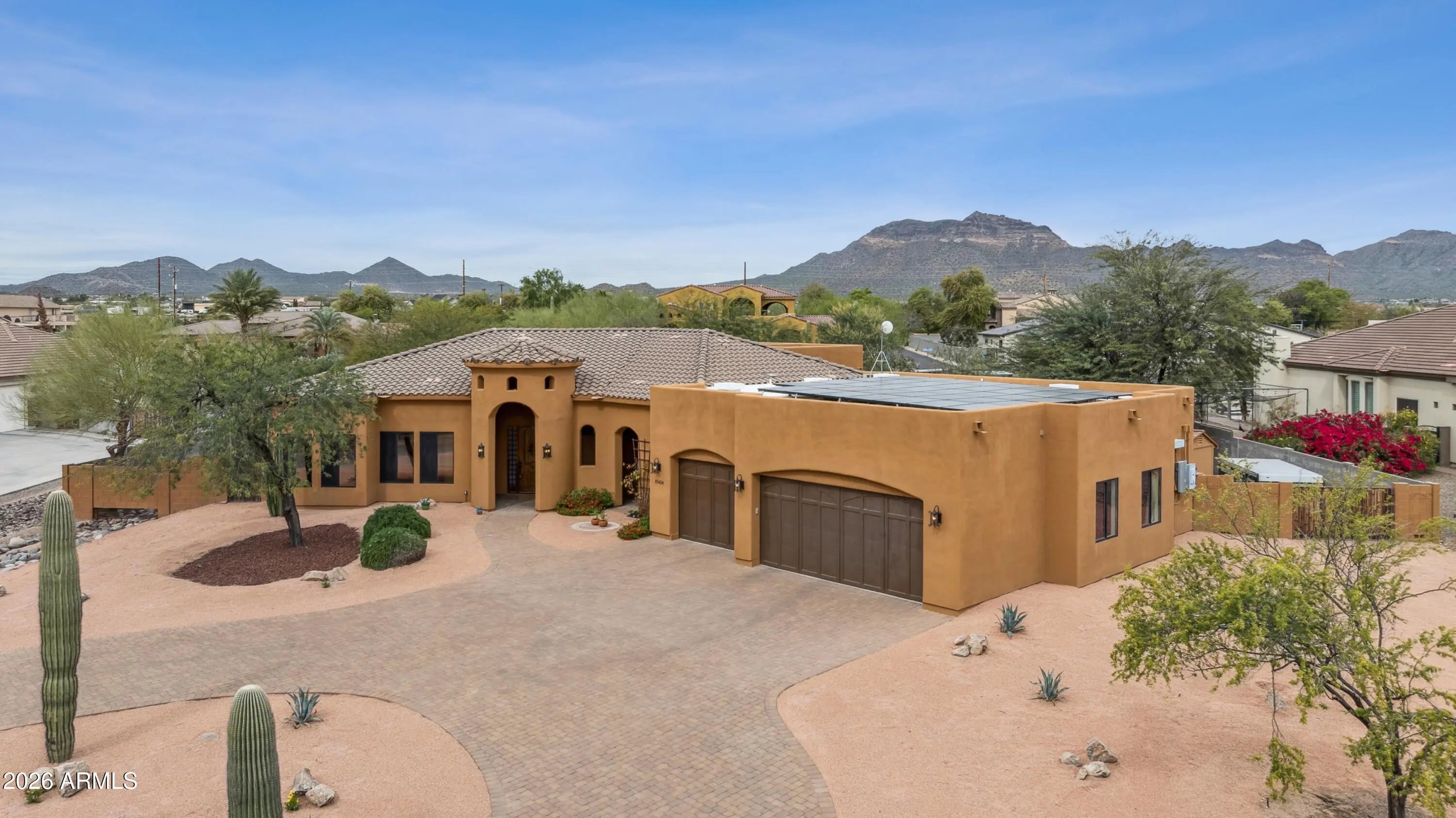 Experience the perfect blend of privacy, space, and modern comfort in this beautifully updated 4-bedroom, 2.5-bath custom home nestled in desirable North East Mesa. Situated on just under an acre with stunning mountain views, this north/south facing property is tucked within a private enclave of only eight custom homes on a quiet cul- de-sac street--offering the rare freedom of NO HOA. Just minutes away from Lakes, Rivers, Hiking Trails, Biking Trails & Many outdoor activities. Step inside to fresh interior paint, brand-new carpet in all bedrooms, and updated tile flooring in the office. The thoughtfully designed split floor plan features a spacious primary suite in the west wing and Jack-and-Jill bedrooms in the east wing, providing ideal separation and functionality. The primary bath has been transformed into a spa- like retreat with a newly remodeled walk-in shower, deep soaking Jacuzzi tub, slate flooring, and dual granite vanities. The guest bath showcases a tiled shower and travertine dual vanity, while natural wood and stone accents throughout the home add warmth and character. The bright, open living spaces flow seamlessly between the kitchen, dining, and living areas--perfect for entertaining while enjoying picturesque mountain views through large picture windows. Energy efficiency shines with dual-pane tinted windows, shade screens, owned solar (to be paid off at closing--see video link for details on this unique, off-grid capable system) with central vacuum for ease of cleaning throughout the home. Additional recent upgrades include a newer dishwasher, water heater, and updated fixtures throughout. The backyard is a private desert oasis designed for both relaxation and productivity. Enjoy a sparkling diving pool, cozy fire pit, two covered patios, and mature mesquite and palo verde trees providing natural shade & privacy. The homesteader's dream continues with six mulberry trees/bushes, pomegranate, orange, grapefruit, olive trees, three grapevines, five raised garden beds with organic soil and established vegetables, plus a chicken coop and goat pen. Two RV gates offer easy access and flexibility, with ample space remaining for toys, play, or future expansion. Completing the property is an oversized 4-car garage with vaulted ceilings and dedicated workshop space--perfect for hobbyists or extra storage. This rare North East Mesa property offers modern updates, exceptional outdoor amenities, and the freedom to truly make it your own--all in a peaceful, private setting.