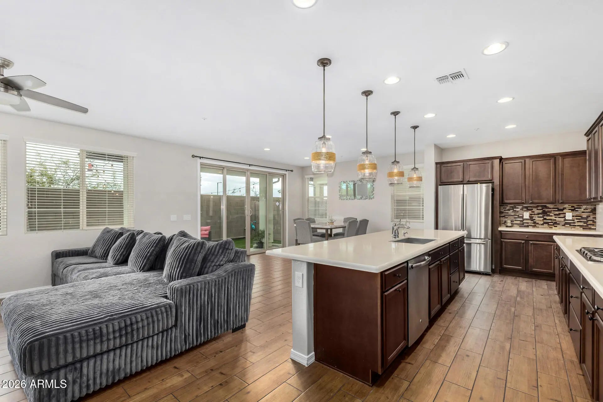 Meticulously maintained 4 bedroom + Loft, 2.5 bathroom home in the desirable Sonoran Foothills! Fall in love with the bright and open layout, featuring wood-look flooring, tons of natural light, and a soothing palette that makes every space perfect for entertaining and relaxation. The gourmet kitchen is a chef's delight, displaying cabinets adorned with crown molding, tile backsplash, sleek quartz countertops, a pantry, and an expansive island, for those casual conversations and quick meals. The primary suite is a true retreat, complete with a walk-in closet for easy organization and a bathroom with dual sinks for convenience. The loft is perfect for a home office or creative area. The backyard hosts a cozy covered patio ideal for morning coffee and a nice seating space with artificial tur