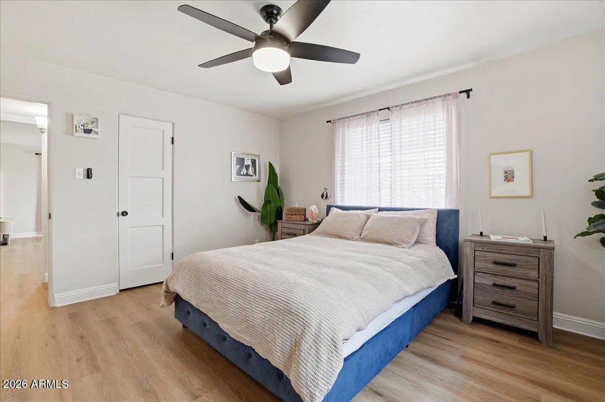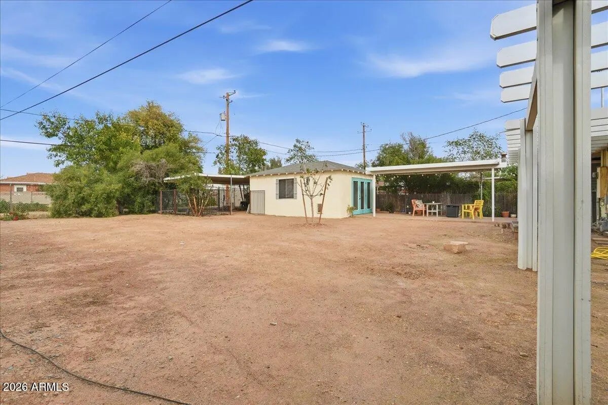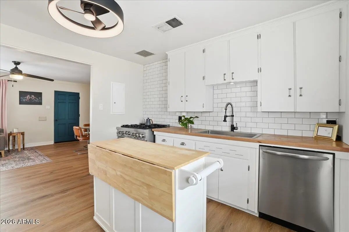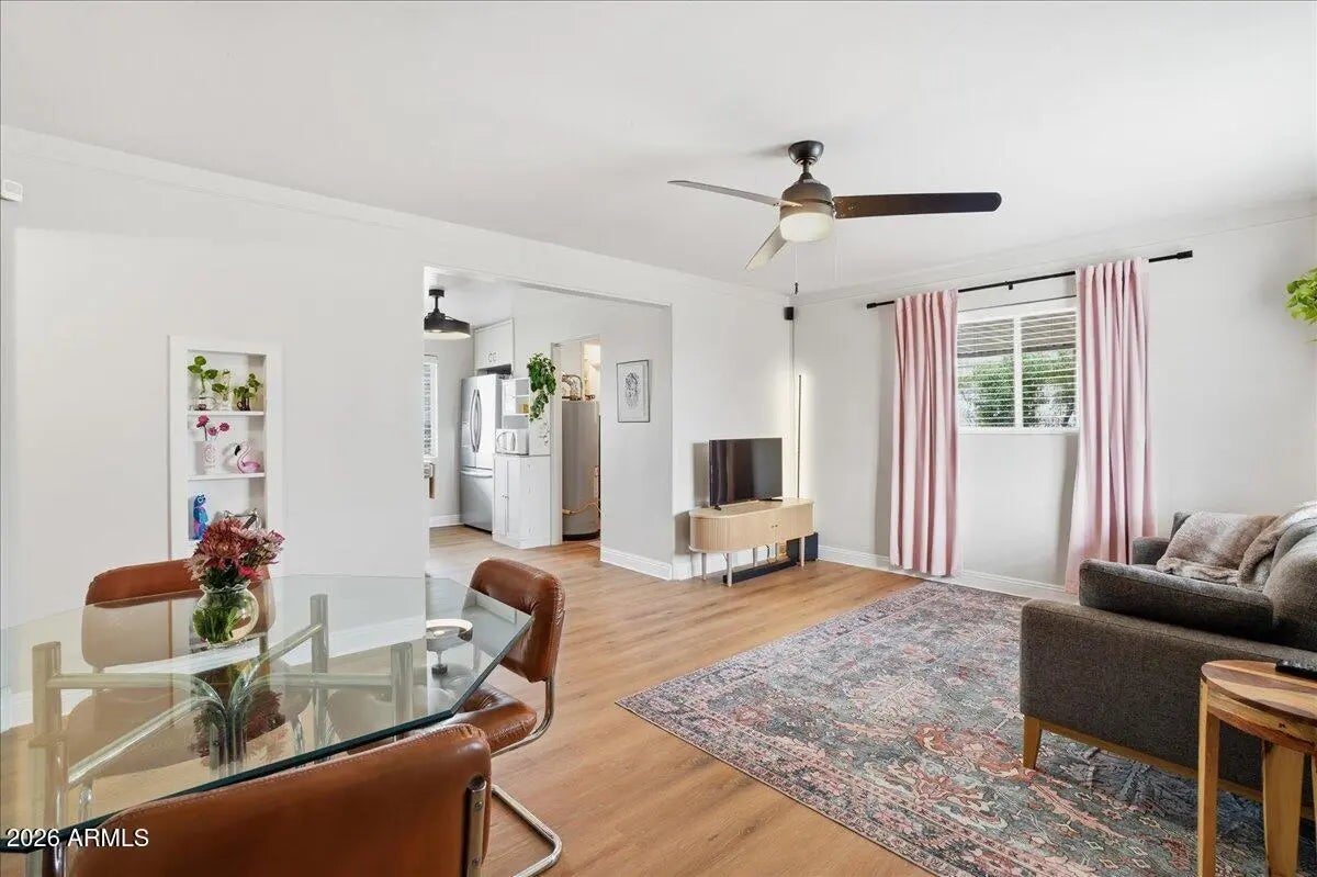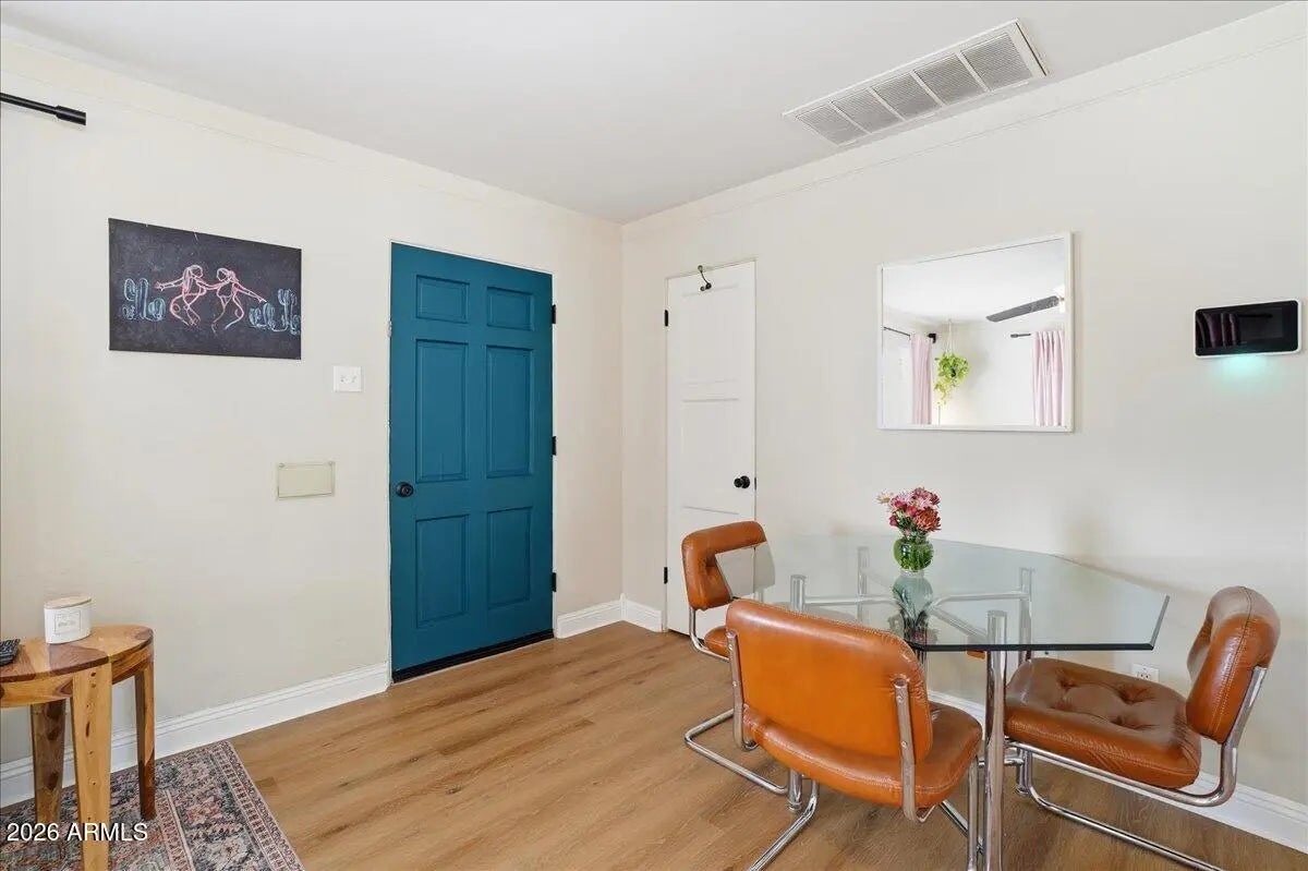 Welcome to this charming 1951 brick home in the historic community of Westwood Estates, conveniently located just minutes from the vibrant art district & downtown Phoenix. With 936 SqFt of thoughtfully designed space, this home beautifully blends mid-century character with modern amenities. Upon entering, you're greeted by an airy open living & dining area, where large windows invite natural light. Newly installed luxury vinyl plank (LVP) flooring flows seamlessly throughout, complemented by elegant large baseboards that add a sophisticated touch. The kitchen offers elongated white cabinets with scalloped details, a stylish white subway backsplash, & wood block countertops, all equipped with stainless steel appliances that inspire culinary creativity. The bedrooms serve as cozy sanctuaries while the bathroom features a colorful tiled tub surround that brings character to its vintage aesthetic. Outside, a detached workspace awaits your vision and is equipped with its own AC unit for comfort. This home captures efficient charm, making it an excellent choice for those seeking a vibrant neighborhood near sport arenas, arts, culture and dining!