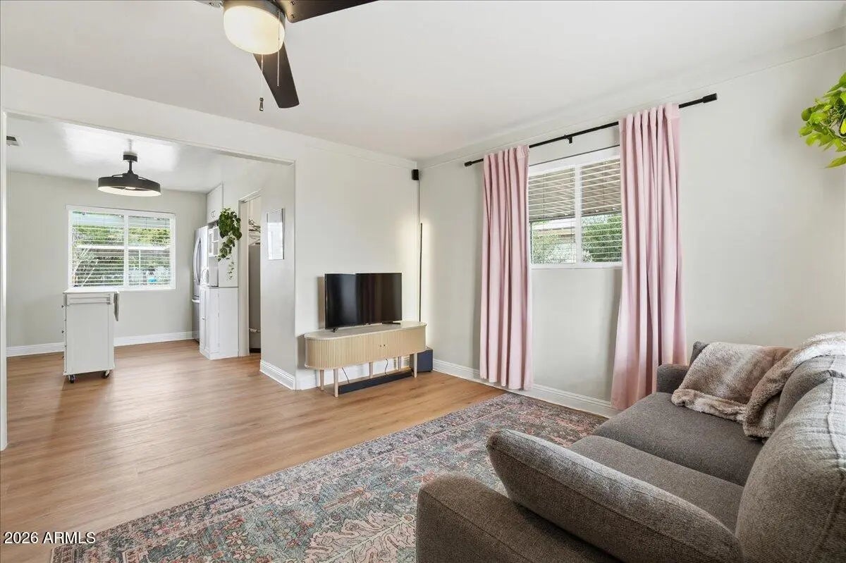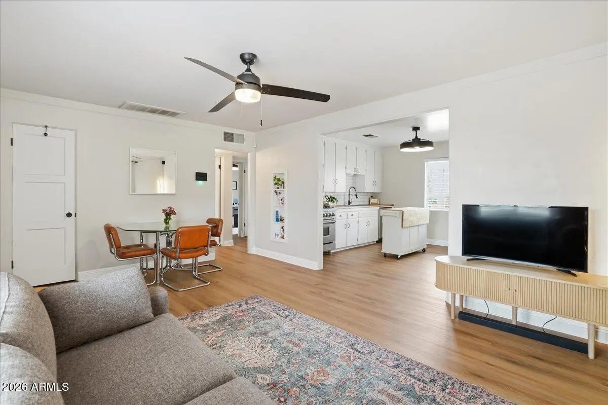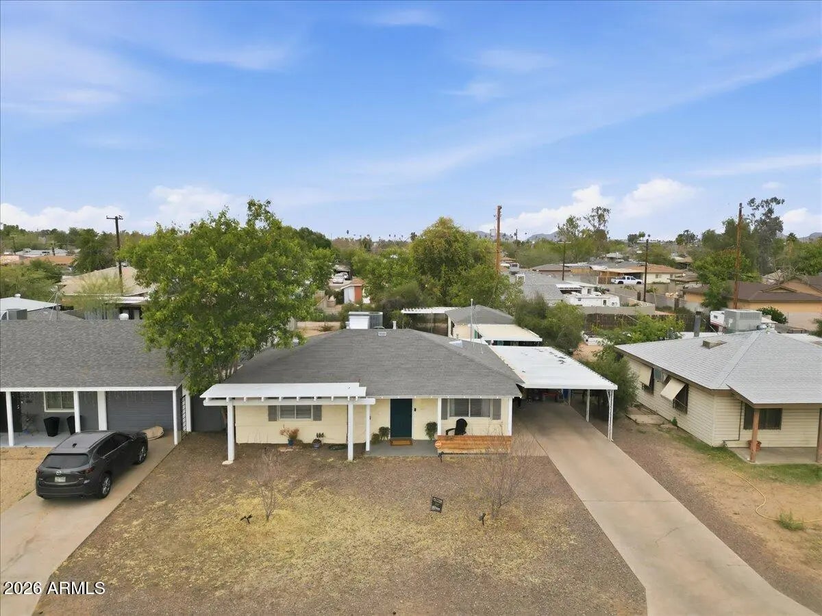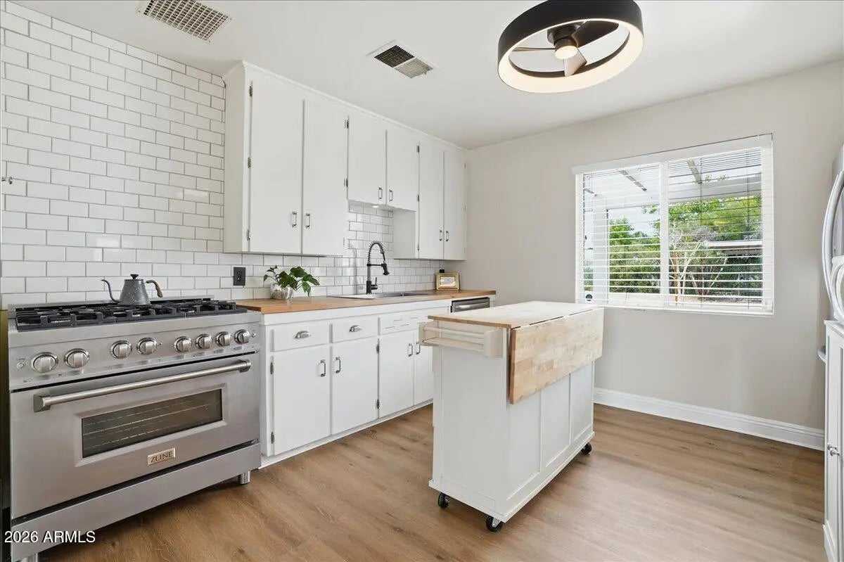 Welcome to this charming 1951 brick home in the historic community of Westwood Estates, conveniently located just minutes from the vibrant art district & downtown Phoenix. With 936 SqFt of thoughtfully designed space, this home beautifully blends mid-century character with modern amenities. Upon entering, you're greeted by an airy open living & dining area, where large windows invite natural light. Newly installed luxury vinyl plank (LVP) flooring flows seamlessly throughout, complemented by elegant large baseboards that add a sophisticated touch. The kitchen offers elongated white cabinets with scalloped details, a stylish white subway backsplash, & wood block countertops, all equipped with stainless steel appliances that inspire culinary creativity. The bedrooms serve as cozy sanctuaries while the bathroom features a colorful tiled tub surround that brings character to its vintage aesthetic. Outside, a detached workspace awaits your vision and is equipped with its own AC unit for comfort. This home captures efficient charm, making it an excellent choice for those seeking a vibrant neighborhood near sport arenas, arts, culture and dining!