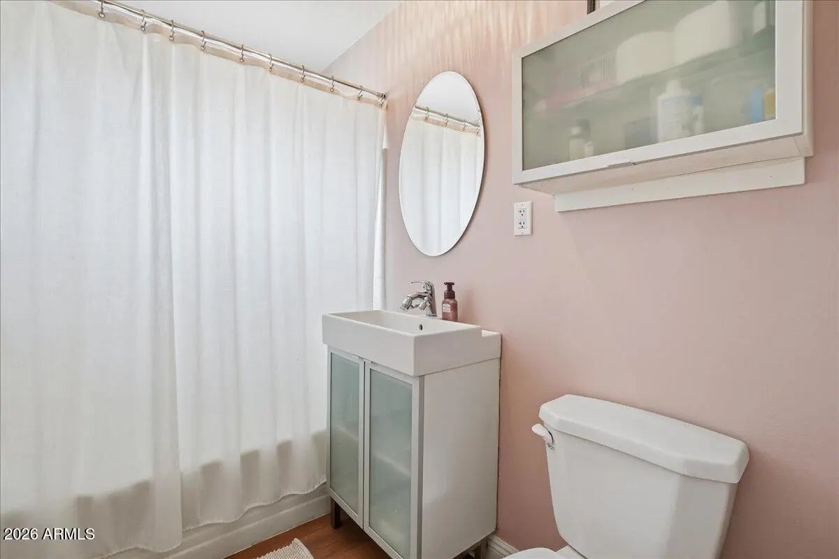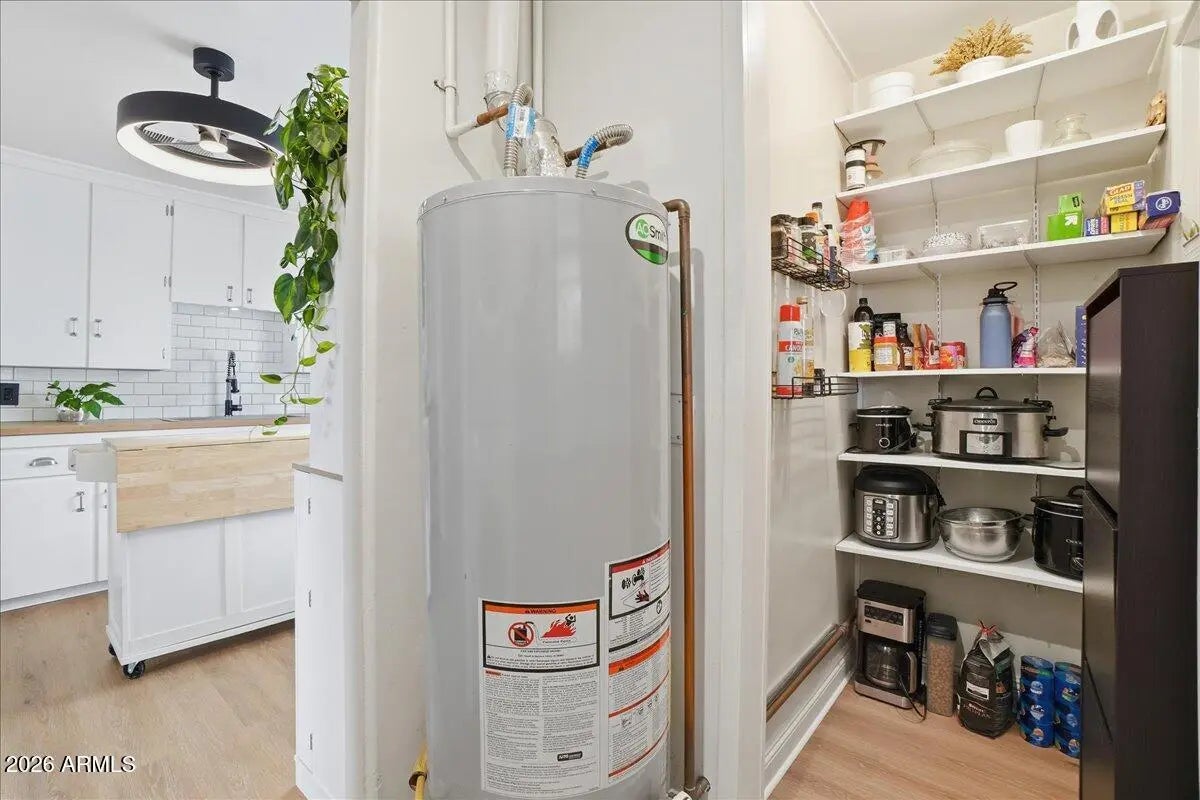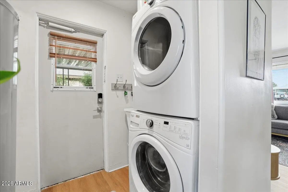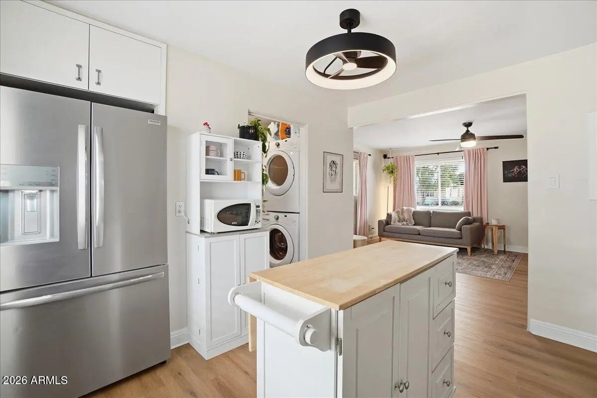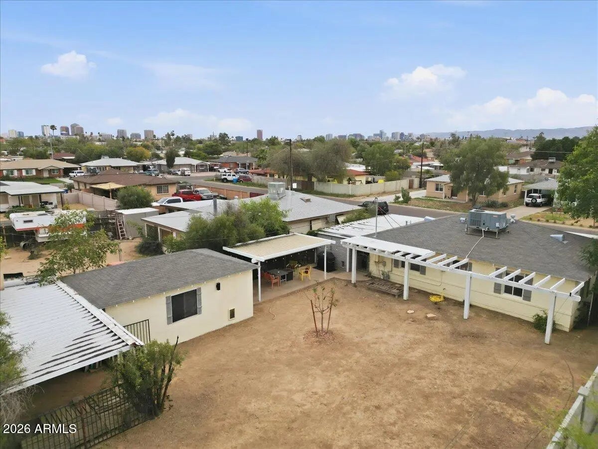 Welcome to this charming 1951 brick home in the historic community of Westwood Estates, conveniently located just minutes from the vibrant art district & downtown Phoenix. With 936 SqFt of thoughtfully designed space, this home beautifully blends mid-century character with modern amenities. Upon entering, you're greeted by an airy open living & dining area, where large windows invite natural light. Newly installed luxury vinyl plank (LVP) flooring flows seamlessly throughout, complemented by elegant large baseboards that add a sophisticated touch. The kitchen offers elongated white cabinets with scalloped details, a stylish white subway backsplash, & wood block countertops, all equipped with stainless steel appliances that inspire culinary creativity. The bedrooms serve as cozy sanctuaries while the bathroom features a colorful tiled tub surround that brings character to its vintage aesthetic. Outside, a detached workspace awaits your vision and is equipped with its own AC unit for comfort. This home captures efficient charm, making it an excellent choice for those seeking a vibrant neighborhood near sport arenas, arts, culture and dining!