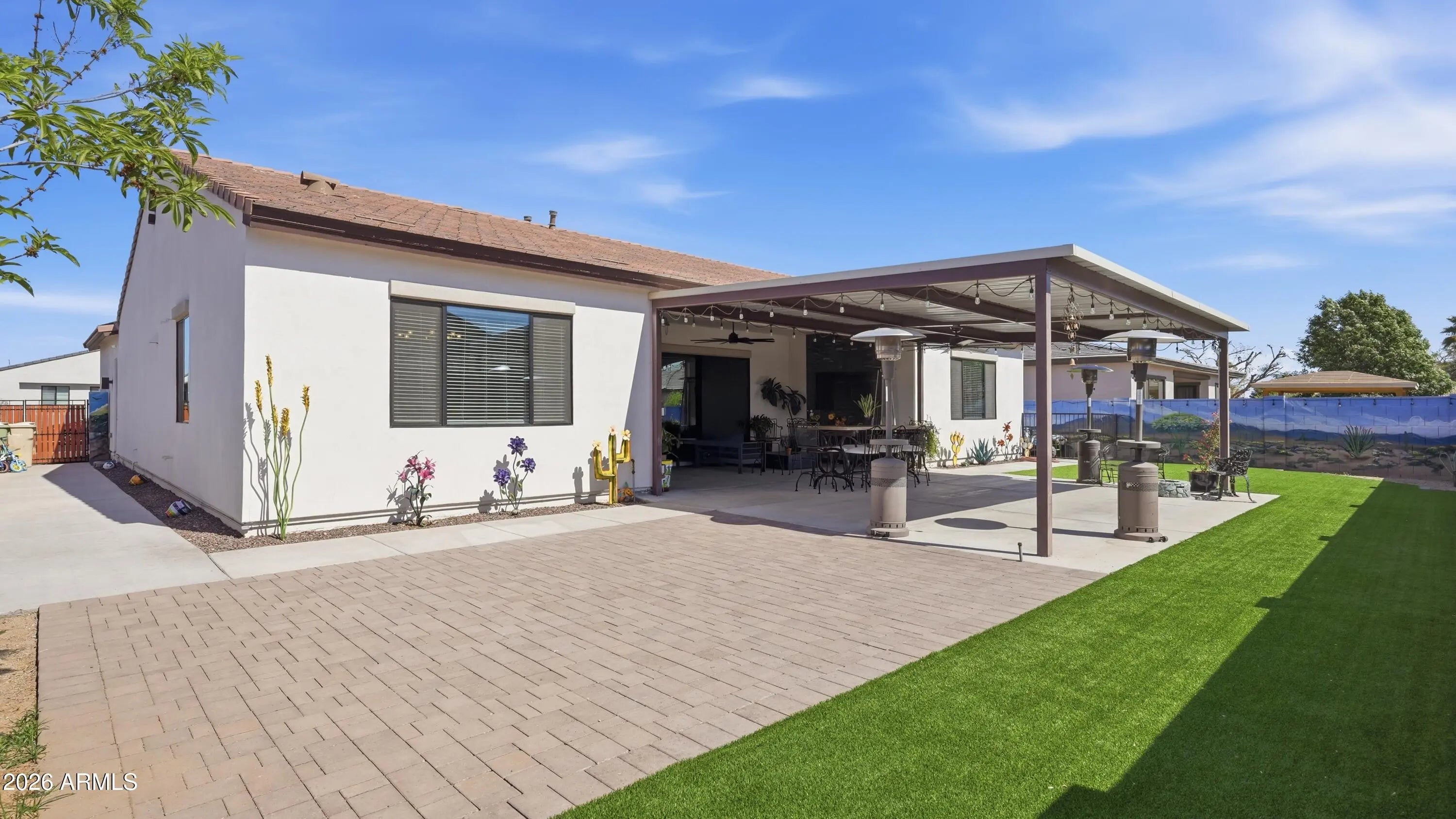 Nearly NEW 2023 single-story home in a gated community offering 3,240 sq ft sq ft with 4 bedrooms, 3.5 baths, and a 3-car tandem garage with RV parking. The bright open layout features high ceilings and a spacious great room that flows into a gourmet kitchen with granite counters, stainless appliances, gas cooktop, walk-in pantry, and oversized island. The split primary suite includes dual vanities, private toilet room, and walk-in closet. Step outside to a professionally designed backyard with extended covered patio, pavers, artificial turf, and custom mural fence.perfect for relaxing or entertaining. Large 9,000 sq ft lot in a gated neighborhood with only single story homes, parks and walking paths nearby. Do not use Google Maps It will take you to the wrong address. Use Apple Maps.