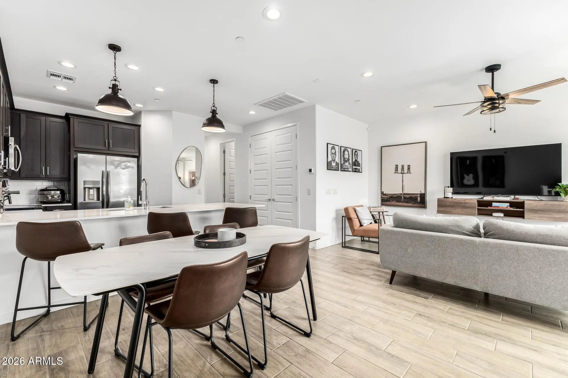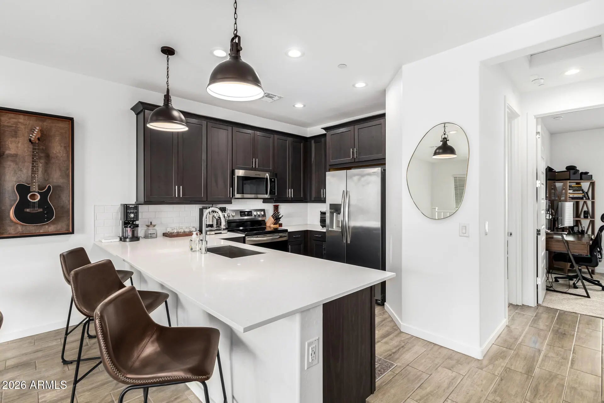You don't want to miss this delightful two-story townhome in the highly sought-after Eastmark! The interior blends style and comfort seamlessly, featuring wood-look floors, contemporary lighting, abundant natural light, and neutral tones throughout. The pristine kitchen boasts espresso cabinets adorned with crown molding, tile backsplash, a quartz peninsula, and stainless steel appliances. The main bedroom is a true retreat, complete with a bathroom with double sinks for convenience. The balcony is the perfect spot for relaxing with a good book or your favorite drink. You'll have access to the community's pool, clubhouse, sports courts, and other amenities to fill your days with fun! Don't miss out on this gem!