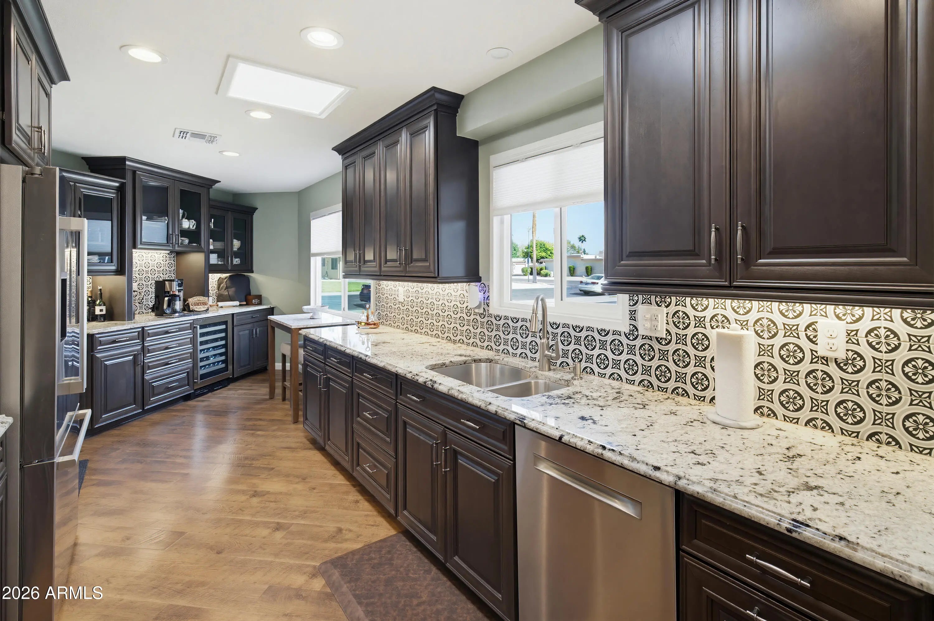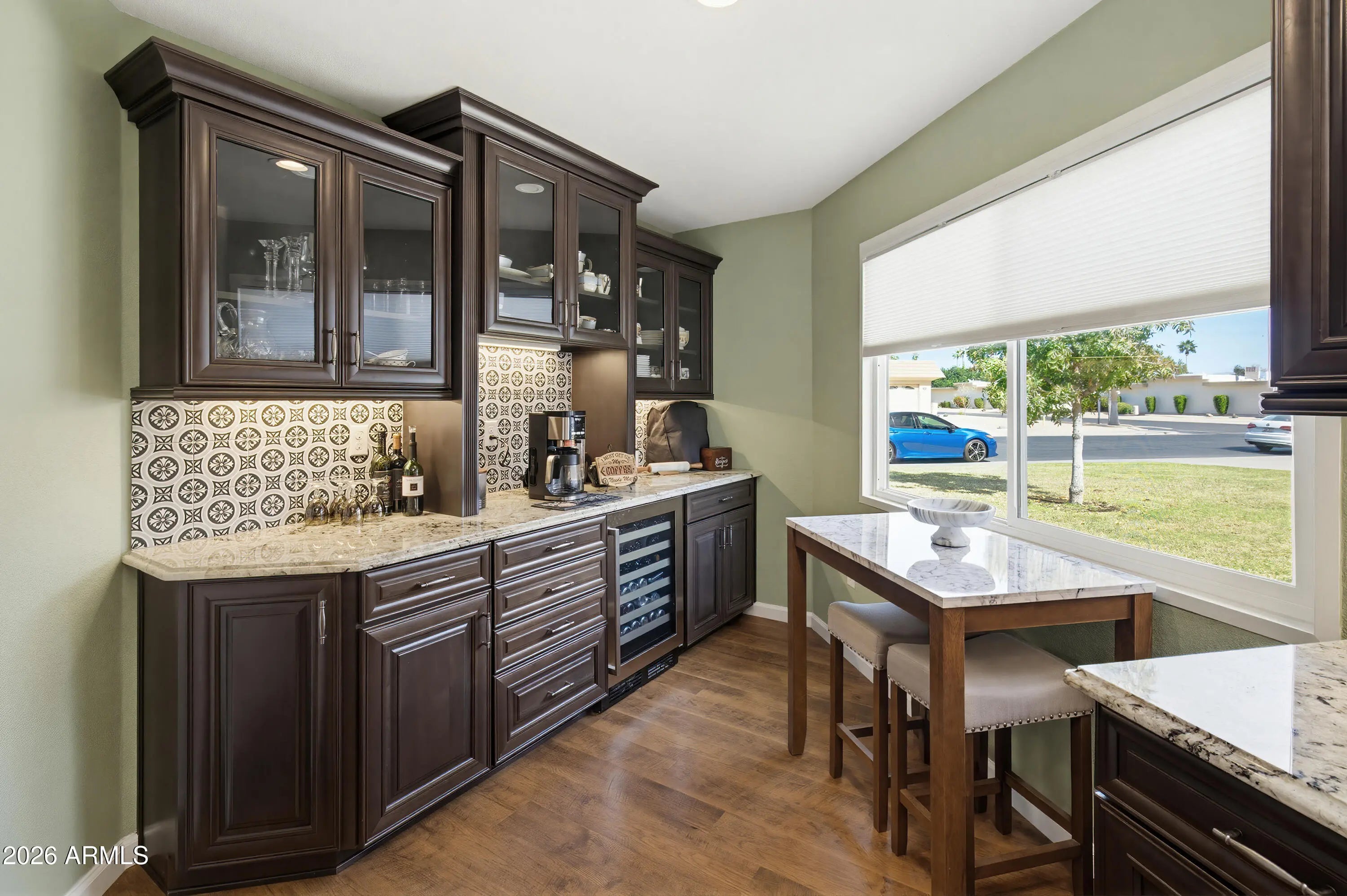 Beautifully remodeled home with exceptional quality and craftsmanship. The improvements were completed by licensed contractors to ensure meticulous attention to detail. The wood-look premium laminate flooring enhances the main living areas complemented by carpet in the main bedroom and ceramic tile in the guest bath. The elegant kitchen has rich cherry cabinetry, a ceramic tile backsplash, granite countertops, and includes a Bosch DW & refrigerator and microwave and a GE induction range. A wine refrigerator and wine/liquor/coffee bar create the perfect setup for entertaining. The primary and guest bathrooms have been beautifully updated. Step outside to a beautiful backyard complete with a tiled patio, artificial turf and manicured trees and shrubs-an inviting space to relax or entertain.