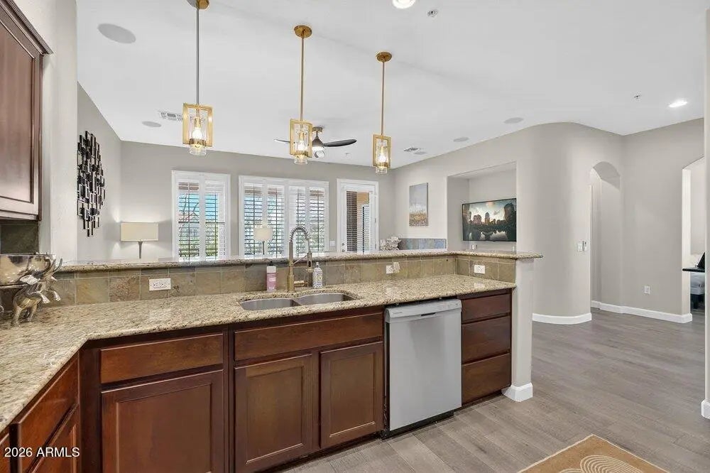 Behind the gates of one of Chandler's most sought after communities, Serenity Shores at Fulton Ranch, this exceptional condo offers a refined blend of luxury, convenience, and low-maintenance living. Designed for a true lock-and-leave lifestyle, Serenity Shores is ideal for those who want elevated living without the upkeep, all within a beautifully maintained, resort-style setting. Inside, you're welcomed by a bright, open layout and a beautifully appointed kitchen featuring stainless steel appliances, expansive countertops, and generous cabinetry, perfect for everyday living and effortless entertaining. Upgraded lighting and flooring throughout the home add a modern, elevated feel that carries through every space. The split primary suite is a private retreat with a spacious layout, dual sink and a soaking tub, creating a spa-like experience. Secondary bedrooms offer flexibility for guests, a home office, or additional living space. Step outside to your private covered patio, an inviting extension of the home, perfect for quiet mornings or relaxed evenings. Living in Serenity Shores means access to resort-style amenities including a pool and spa, clubhouse, and fitness center, along with scenic walking paths, parks, and gathering spaces throughout the community. Located in the heart of Chandler, you're just minutes from top dining, shopping, golf, and major employers like Intel, with easy access to the 202 and I-10 for seamless travel. This is where lifestyle, location, and a true lock-and-leave experience come together behind the gates at Serenity Shores.