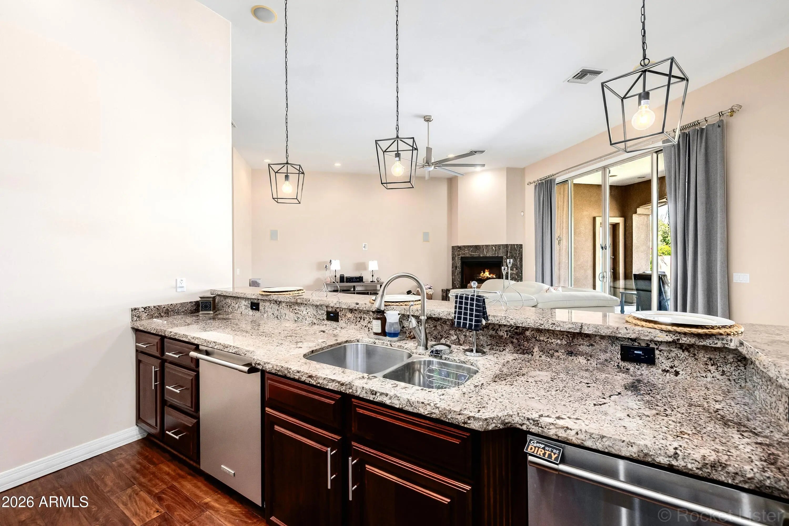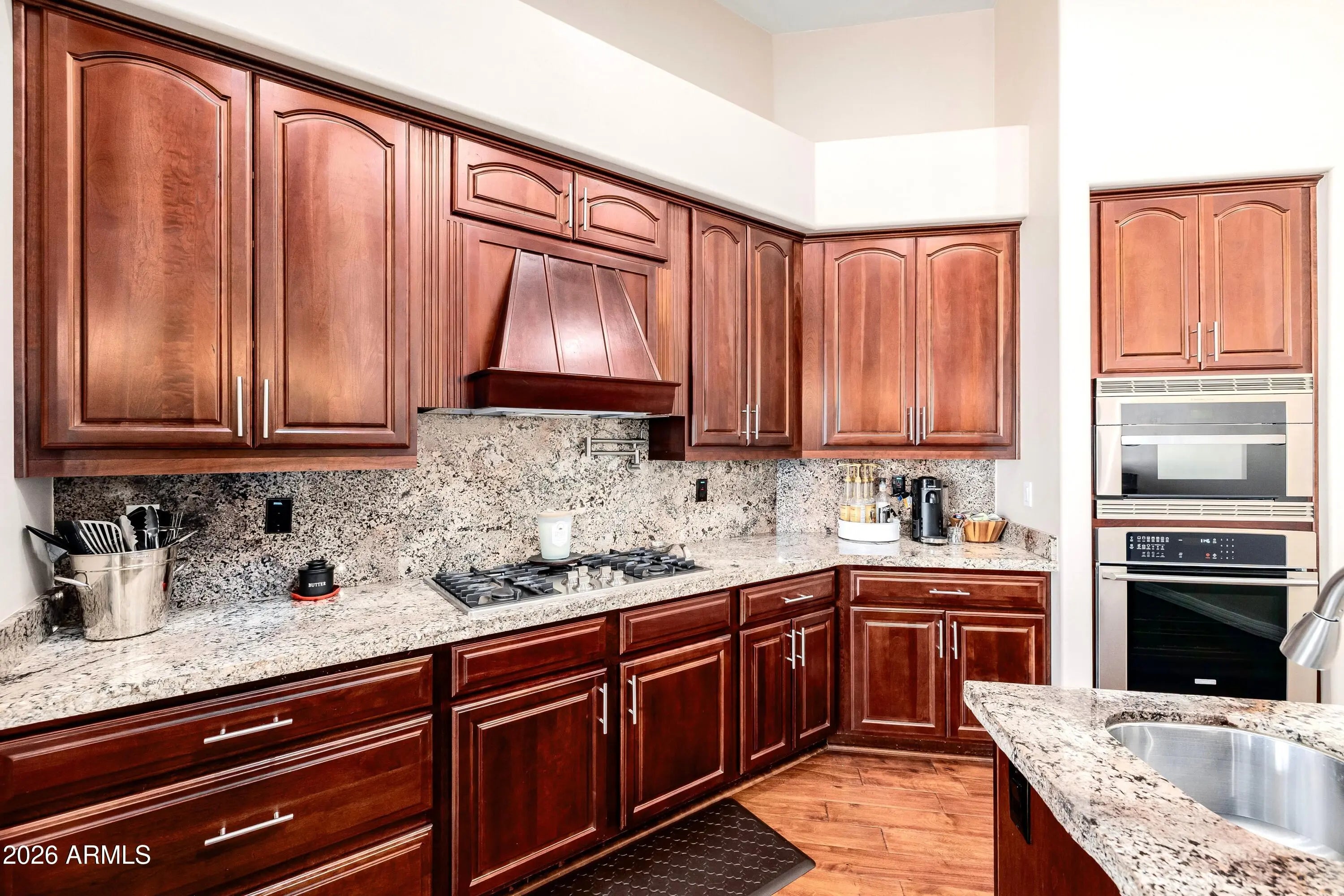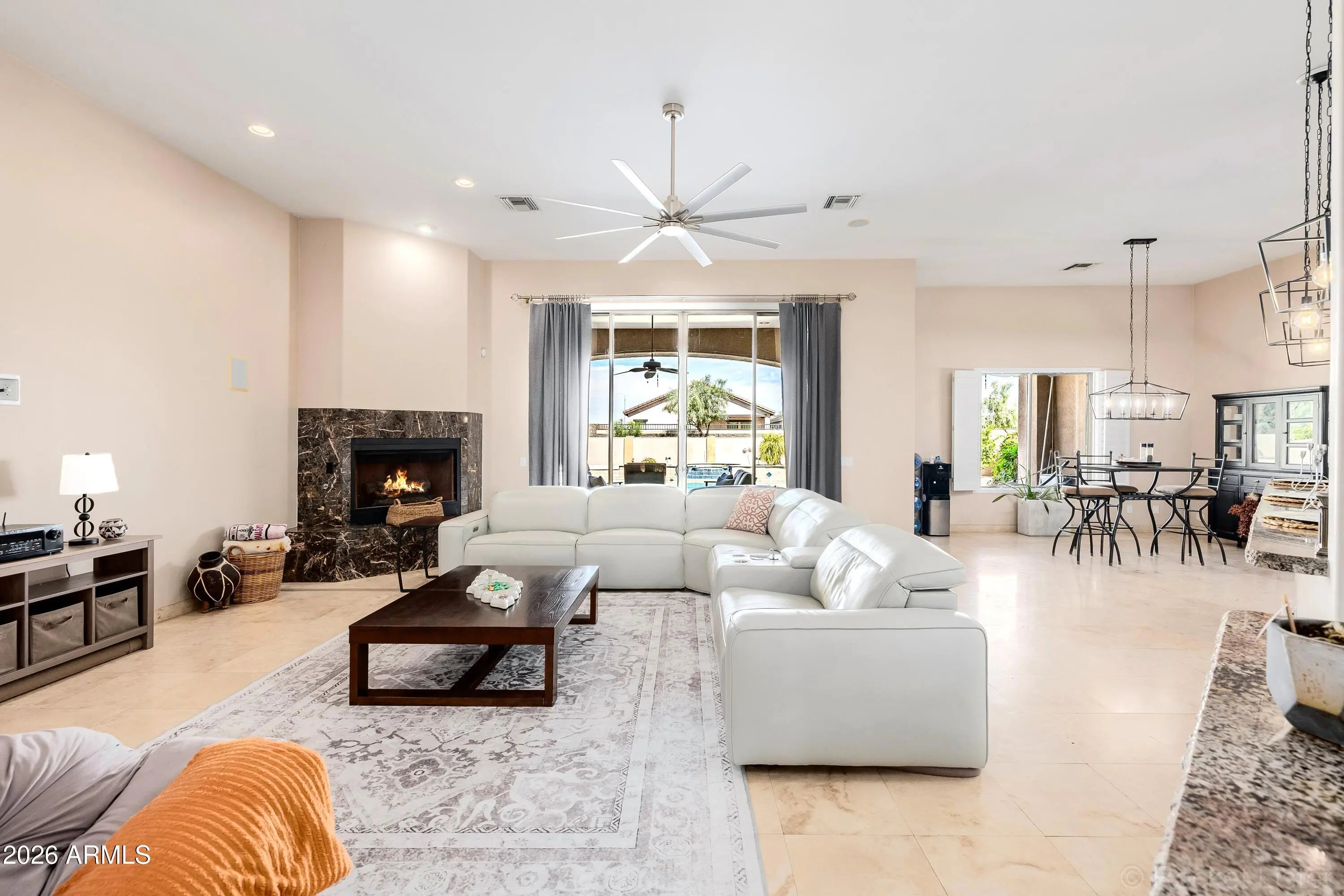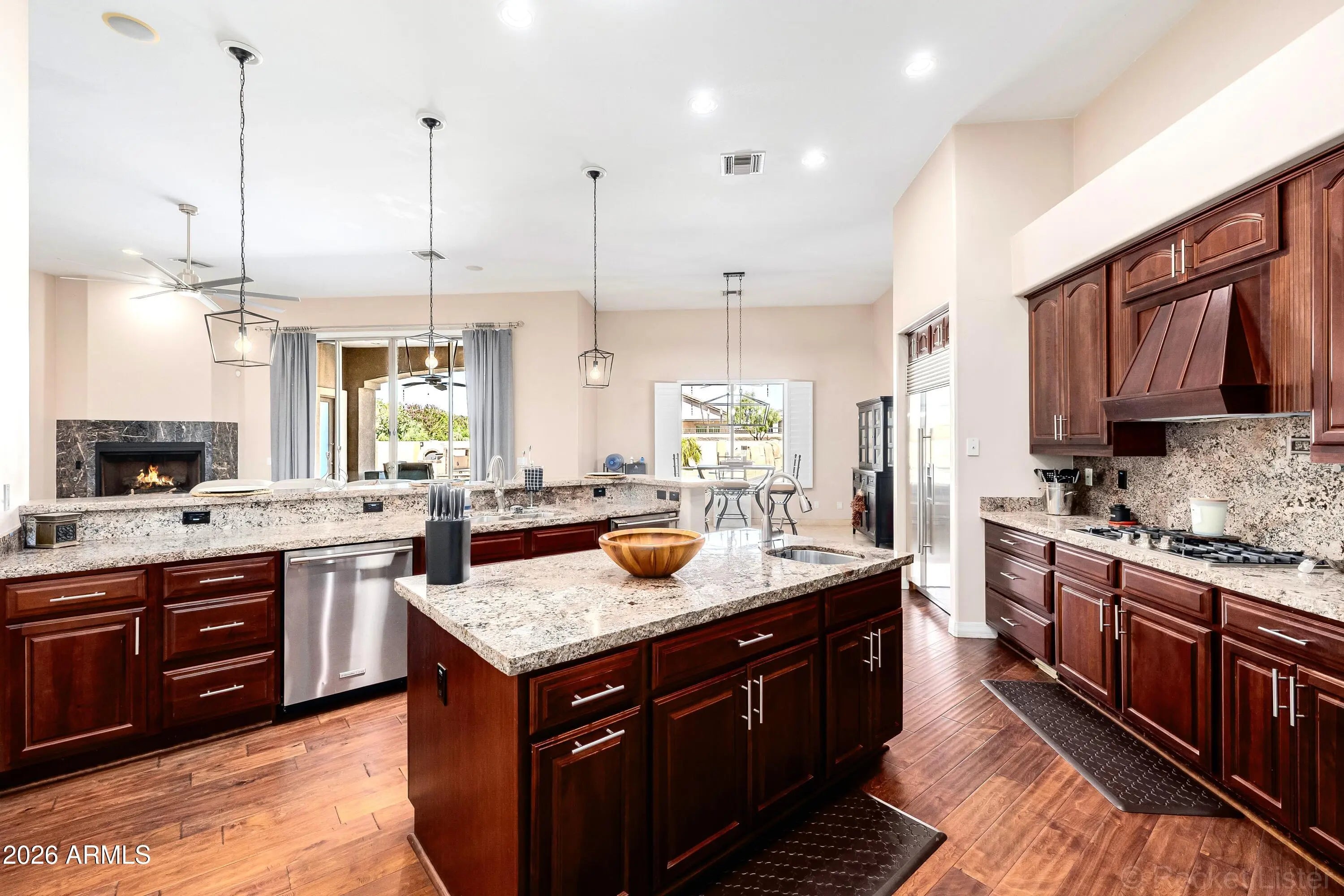 Exceptional gated estate where luxury meets resort living. Nestled on nearly half an acre inside the prestigious gated Topaz community in Glendale. This stunning single-level custom estate delivers sophistication, scale, and unforgettable indoor-outdoor living. Spanning 4,215 square feet, the expansive open floor plan offers 4 bedrooms, 5 bathrooms, a private executive office, and a secondary primary suite -- perfect for multigenerational living or hosting guests in complete comfort and privacy. At the heart of the home, the gourmet kitchen makes a statement with rich cherry wood cabinetry, granite countertops, an oversized center island, and premium stainless steel KitchenAid appliances. Designer finishes elevate every space, including travertine flooring, high-grade hardwood in the kitchen and dining areas, dramatic coffered ceilings, skylights, plantation shutters, and two elegant marble fireplaces. A spacious wet bar and whole-home surround sound system create the ultimate entertaining environment, while a central vacuum system adds modern convenience. Step outside and experience true resort-style living. The backyard is a private oasis featuring a heated Pebble Tec pool with a waterfall grotto and spa, expansive travertine decking, exterior gas and wood-burning fireplaces, and a built-in BBQ designed for unforgettable gatherings. An RV gate and rare 4-car garage complete this exceptional property. Enjoy fully owned SolarEdge® solar panels delivering long-term energy savings!
