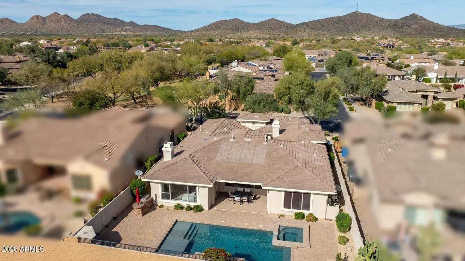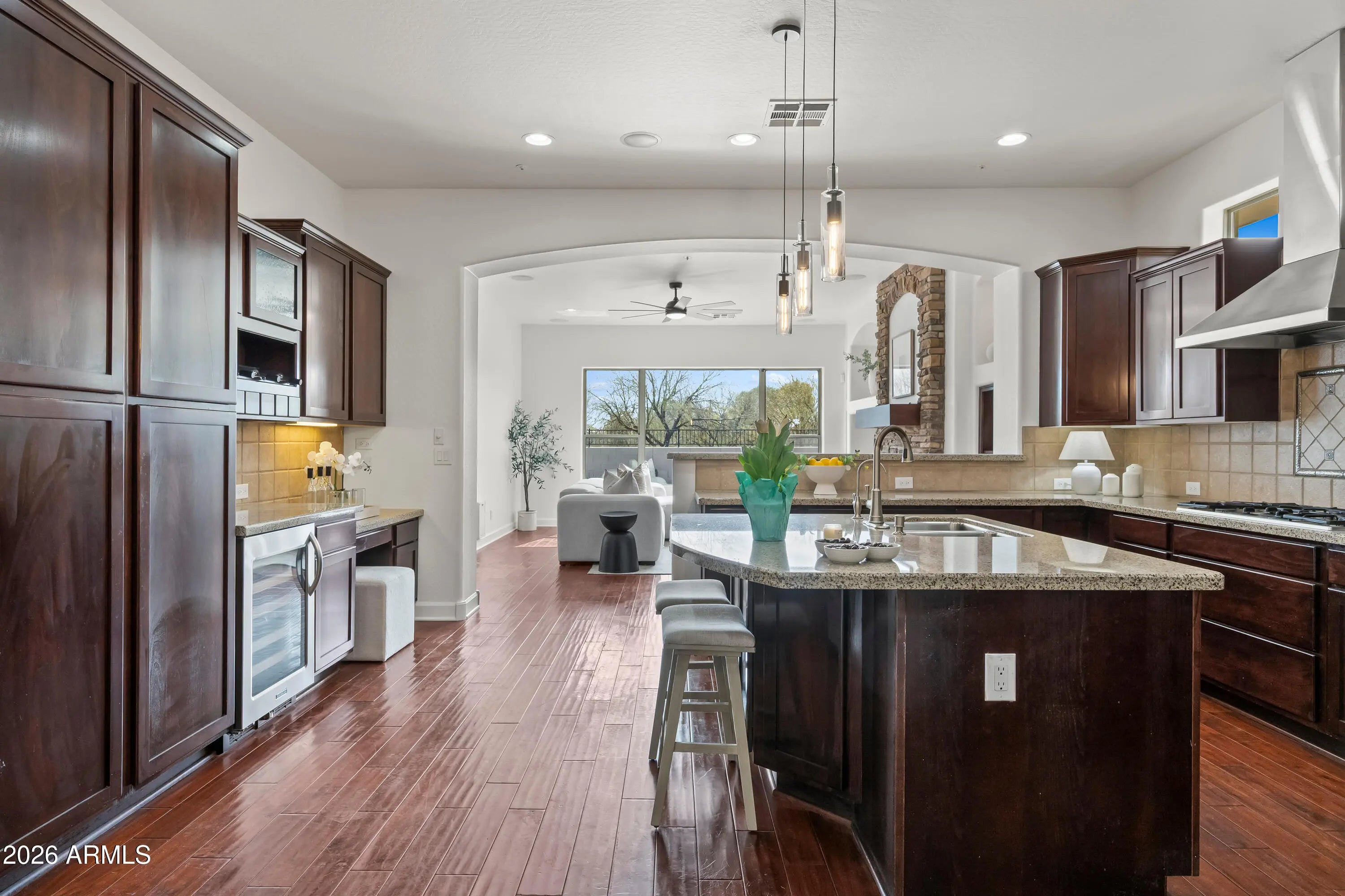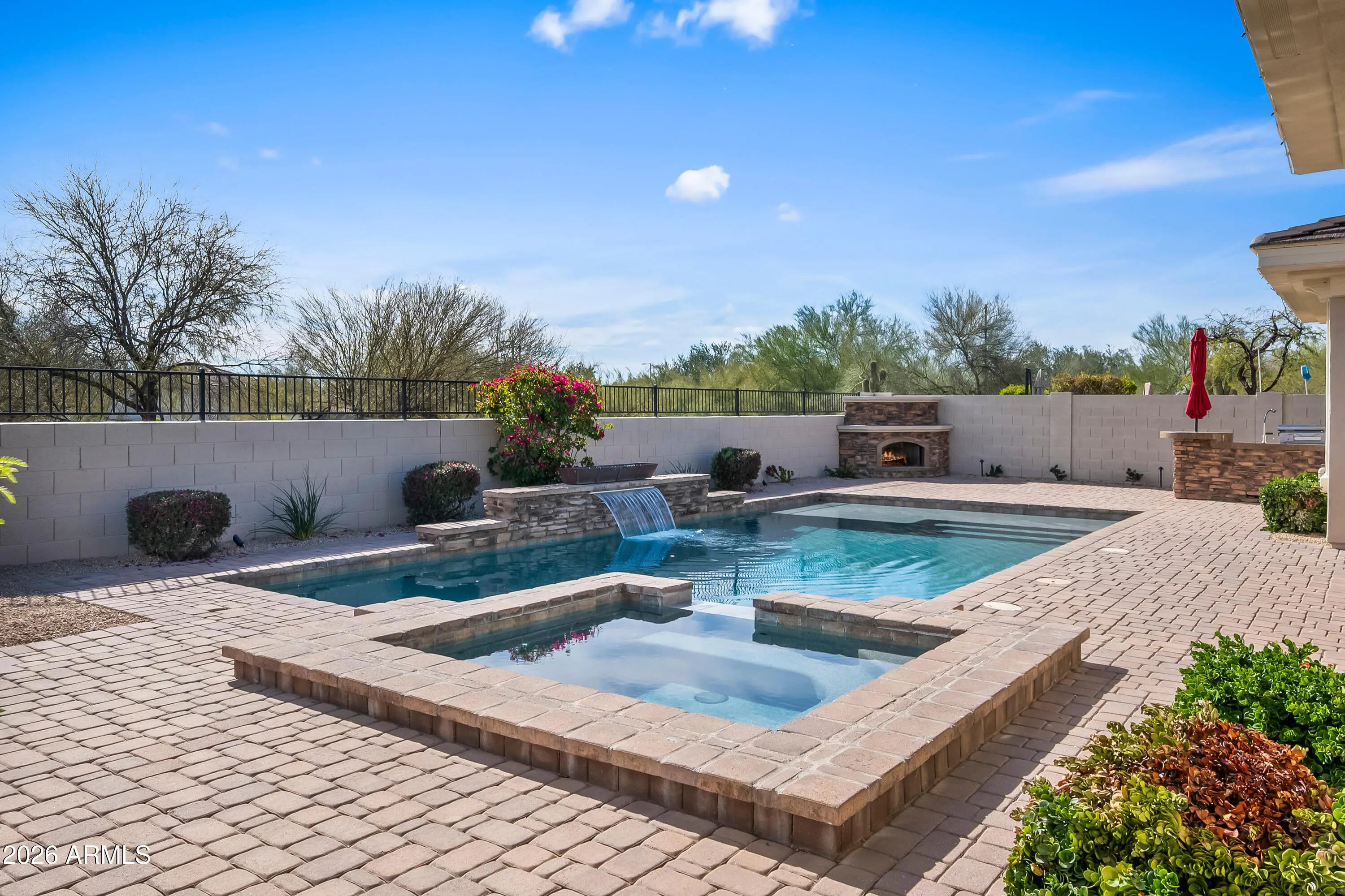 Discover serene living in this peaceful neighborhood gem, where your large home backs directly to a beautiful park with nearby hiking trails--perfect for morning walks, outdoor adventures, or relaxing evenings under the stars. Step inside to elegant all-tile and wood flooring throughout (carpet only on stairs!), creating a clean, modern flow. The kitchen shines with a built-in refrigerator and wine cooler and ample space for gatherings. Downstairs, a versatile basement offers endless possibilities--home gym, media room, guest suite, or extra storage. Outside, entertain in style with a fabulous backyard oasis: sparkling pool and spa (recently replastered for like-new condition), custom BBQ island, cozy outdoor fireplace, expansive patio, and charming front courtyard ideal for morning coffee or evening relaxation. This rare combination of size, privacy, and location won't last--your peaceful Arizona escape awaits!