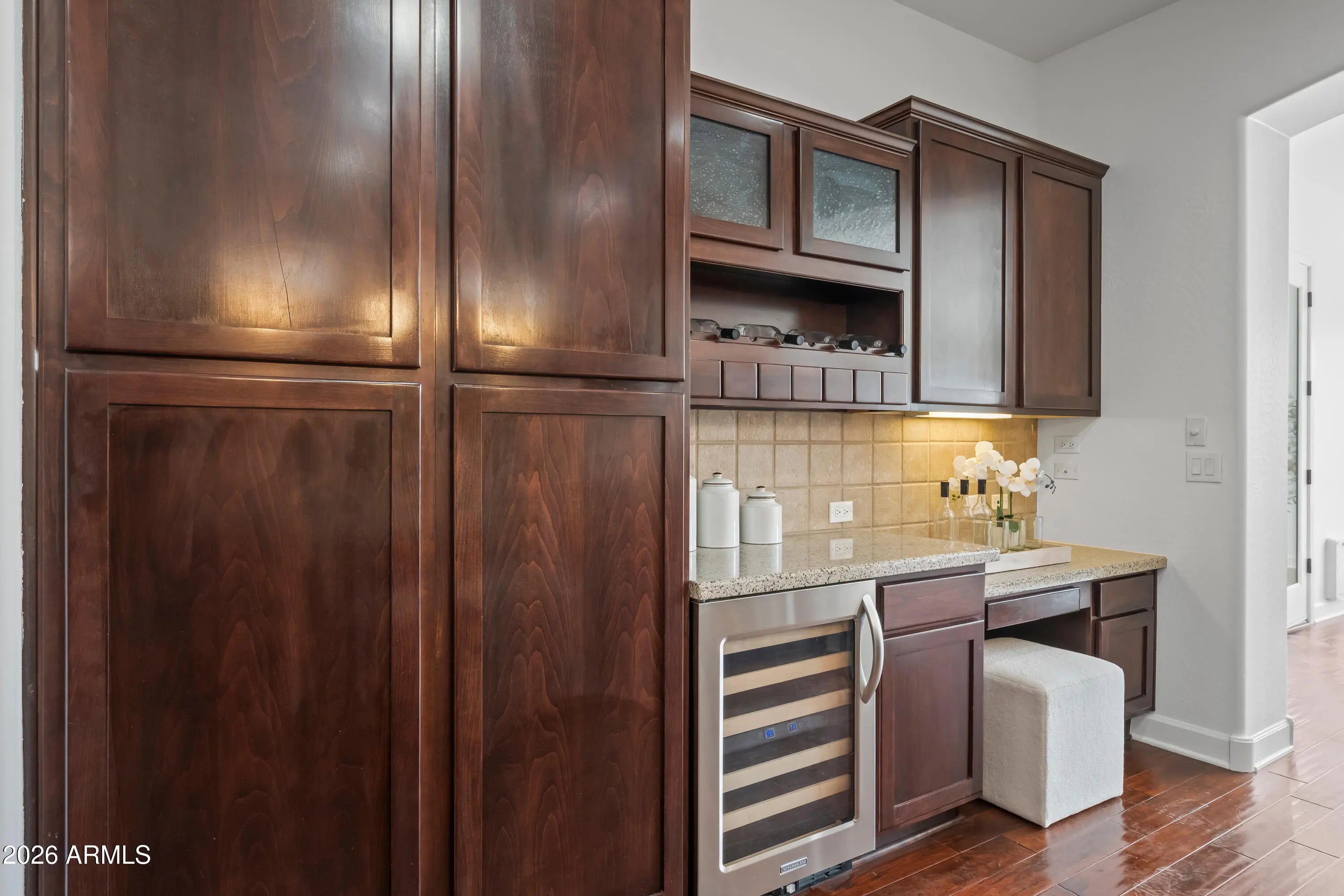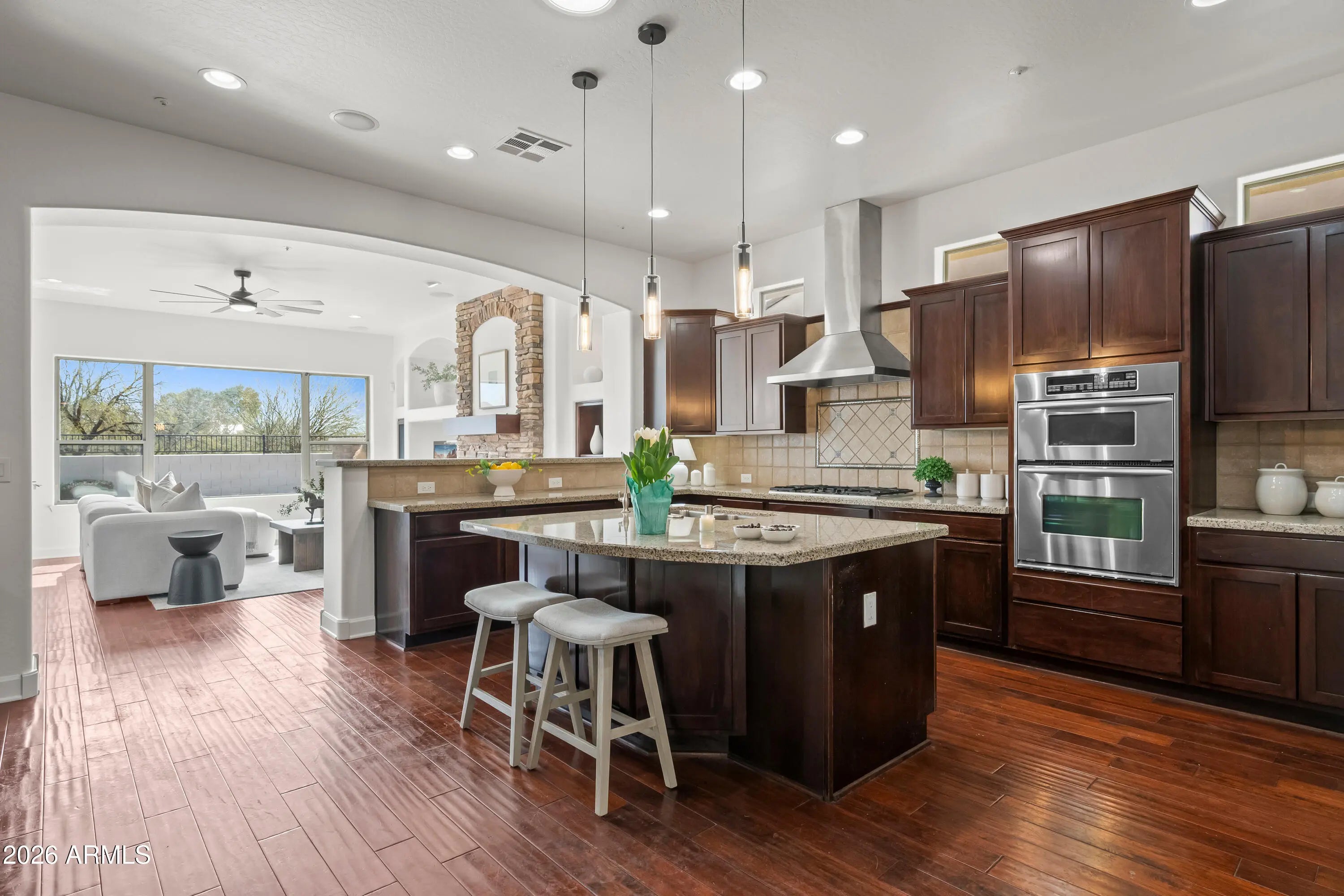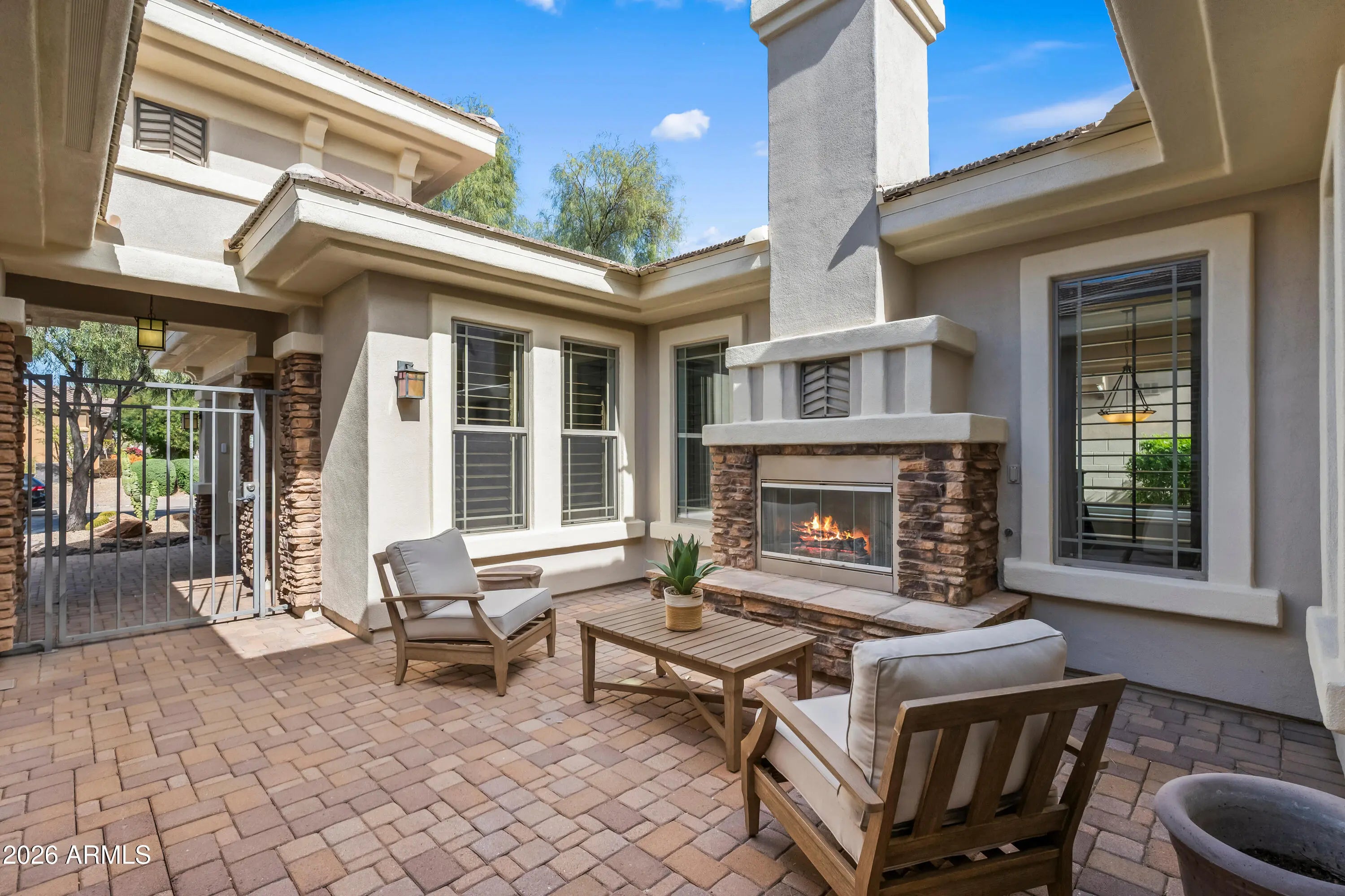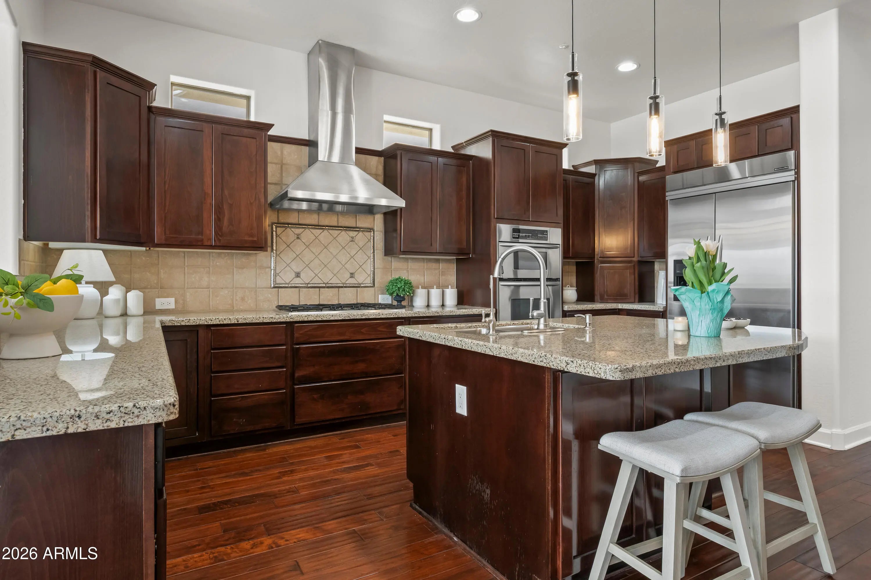 Discover serene living in this peaceful neighborhood gem, where your large home backs directly to a beautiful park with nearby hiking trails--perfect for morning walks, outdoor adventures, or relaxing evenings under the stars. Step inside to elegant all-tile and wood flooring throughout (carpet only on stairs!), creating a clean, modern flow. The kitchen shines with a built-in refrigerator and wine cooler and ample space for gatherings. Downstairs, a versatile basement offers endless possibilities--home gym, media room, guest suite, or extra storage. Outside, entertain in style with a fabulous backyard oasis: sparkling pool and spa (recently replastered for like-new condition), custom BBQ island, cozy outdoor fireplace, expansive patio, and charming front courtyard ideal for morning coffee or evening relaxation. This rare combination of size, privacy, and location won't last--your peaceful Arizona escape awaits!