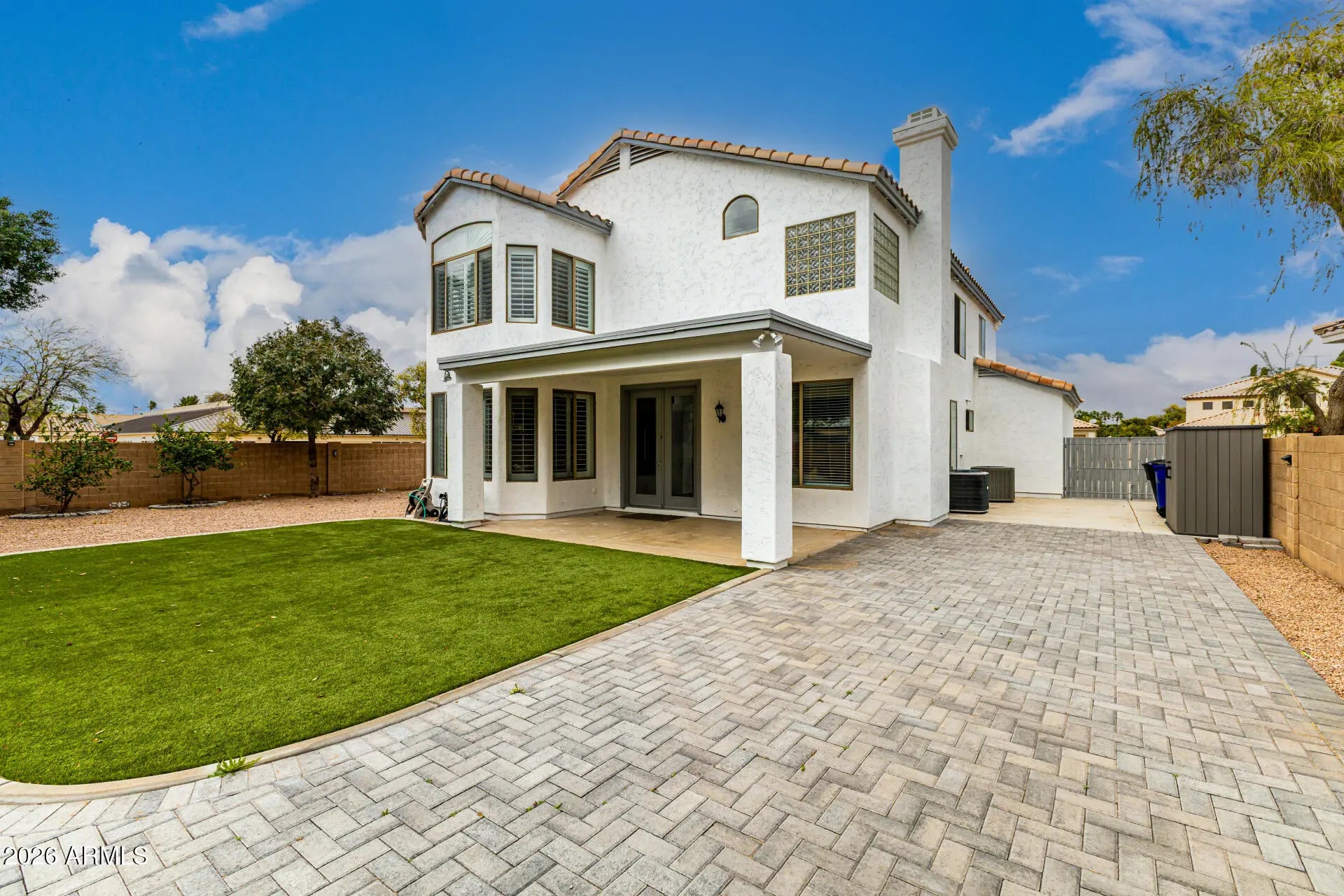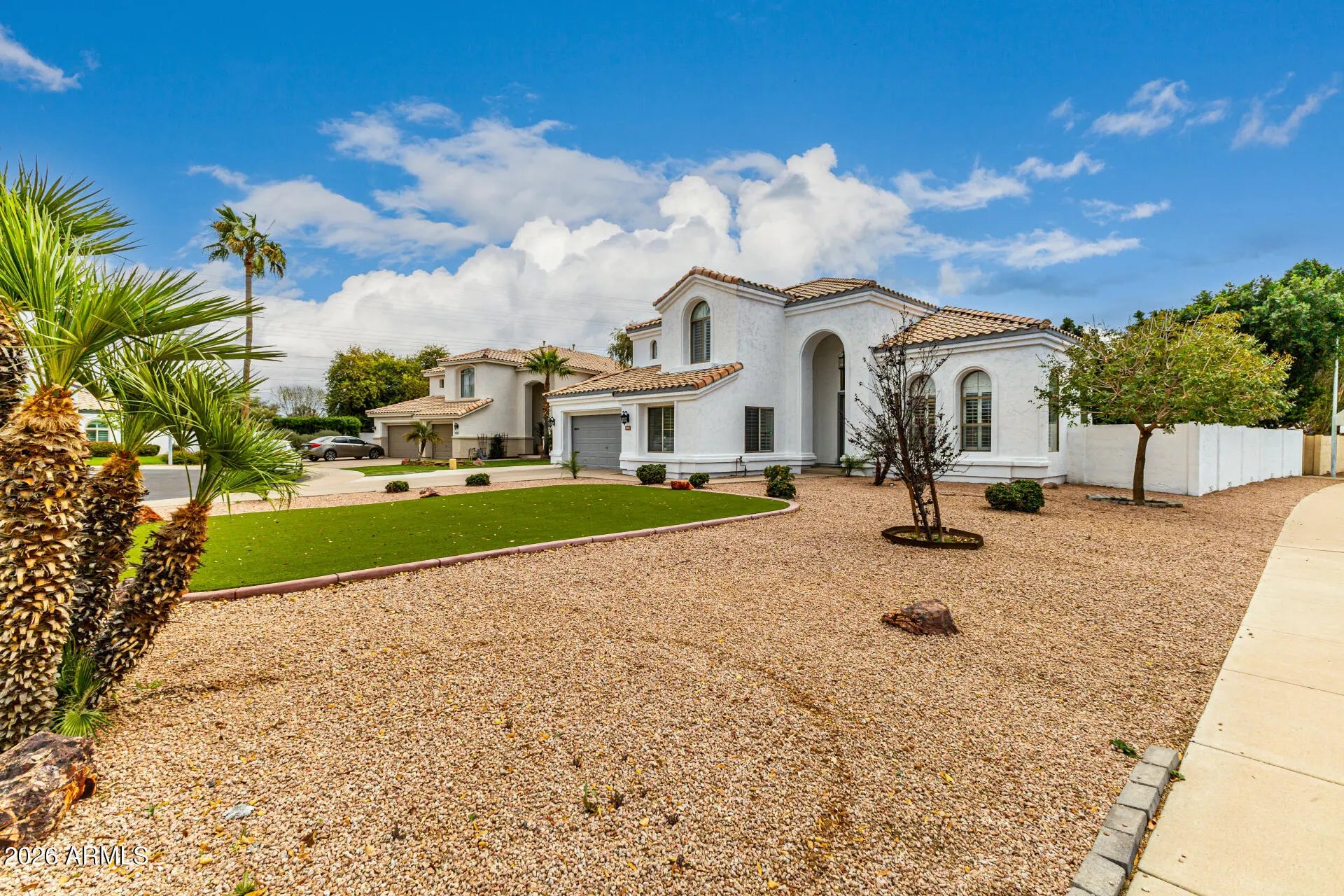 Welcome to this beautifully enhanced 5-bedroom, 3-bath residence ideally situated on a premium corner lot within a quiet cul-de-sac in Sonoma Ranch. Nestled in the desirable Sonoma Ranch community, this home offers a premier Gilbert location--approximately 3 miles from Downtown Gilbert, 1.5 miles from Freestone Park & Rec Center, and 1 mile from the Riparian Preserve--and is just steps from Sonoma Ranch Elementary, providing upscale living with exceptional family convenience. Offering both privacy and presence, the expansive artificial turf front yard, extended driveway, RV gate, and 2-car garage create exceptional curb appeal and functionality. Inside, soaring ceilings and elegant wood-look flooring complement formal living and dining spaces, plantation shutters, modern lighting, and a refined neutral palette. The spacious family room is anchored by a warm fireplace, creating an inviting yet sophisticated gathering space. The gourmet kitchen is thoughtfully designed for elevated everyday living and entertaining, featuring quartz countertops, a mosaic tile backsplash, stainless steel appliances, a prep island with breakfast bar, abundant cabinetry, a walk in pantry, and a sunlit breakfast nook. The grand primary suite offers double door entry, a bay window sitting area, walk in closet, and a spa inspired bath with dual vanities and a soaking garden tub. A versatile open den provides ideal space for a home office or flex room. Extensively upgraded with over $172,000 invested since 2017, the home includes renovated bathrooms, designer flooring, upgraded lighting, fresh interior and exterior paint, dual HVAC systems, upgraded insulation, a new water heater, and a complete appliance package--delivering both refined comfort and long term efficiency. The expansive backyard with covered patio and extended paver seating area creates a perfect setting for relaxation and entertaining. The backyard is thoughtfully designed with mature fruit trees--including a grafted apple tree, two lemon trees, and a tangerine--along with two fully irrigated raised vegetable garden beds, ideal for effortless, year round homegrown harvests. A rare opportunity to own a meticulously maintained corner lot property where quality enhancements, privacy, and modern comfort come together seamlessly.