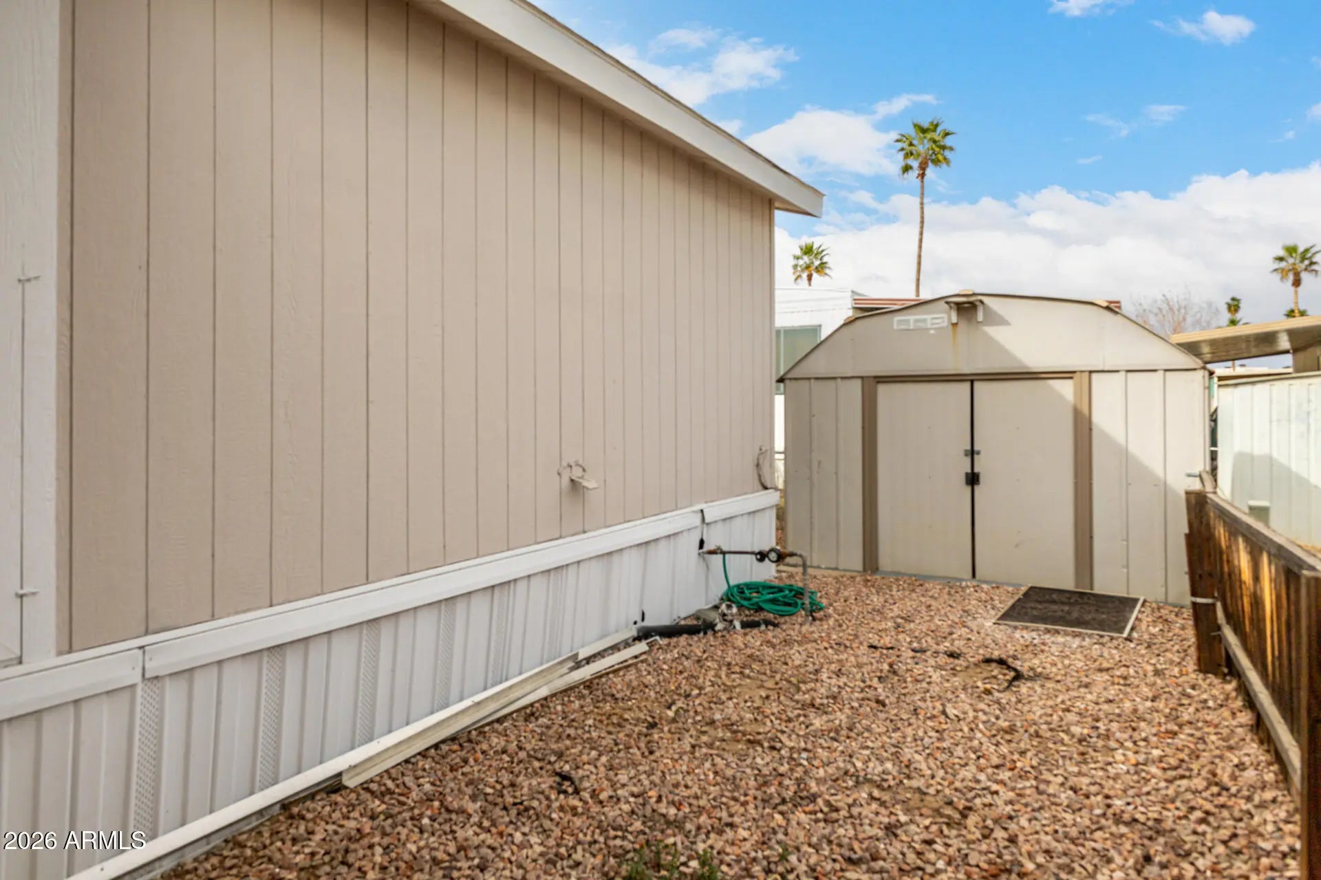 Check out this adorable 2-bedroom mobile home in a desired corner lot! The inviting covered patio is perfect for enjoying your morning brew, while the convenient carport provides parking space. Inside, you'll find a bright layout with wood-look floors, vaulted ceilings for a feeling of openness, natural light, plantation shutters, and neutral paint that complement any décor style. Whip up your favorite dishes in the well-appointed kitchen, complete with rich black cabinets adorned with crown molding, spacious counters, skylights, and stainless steel appliances. The primary retreat boasts a private bathroom for convenience. Out back, you'll have a storage shed for added organization. Enjoy the community pool and spa. What's not to love? Make it yours!