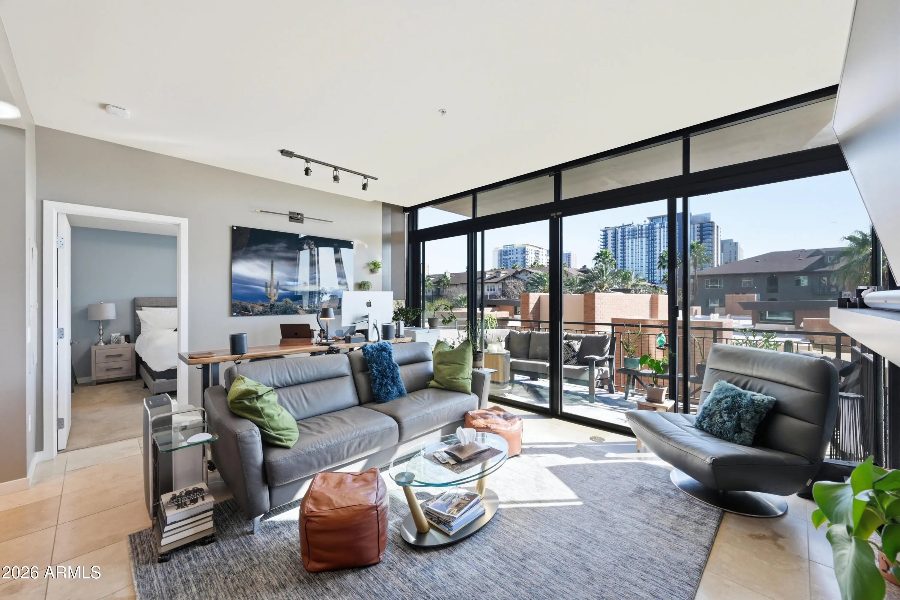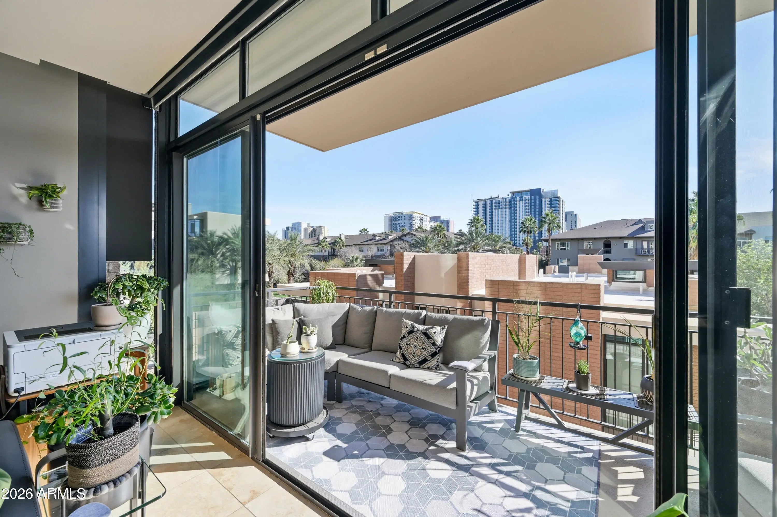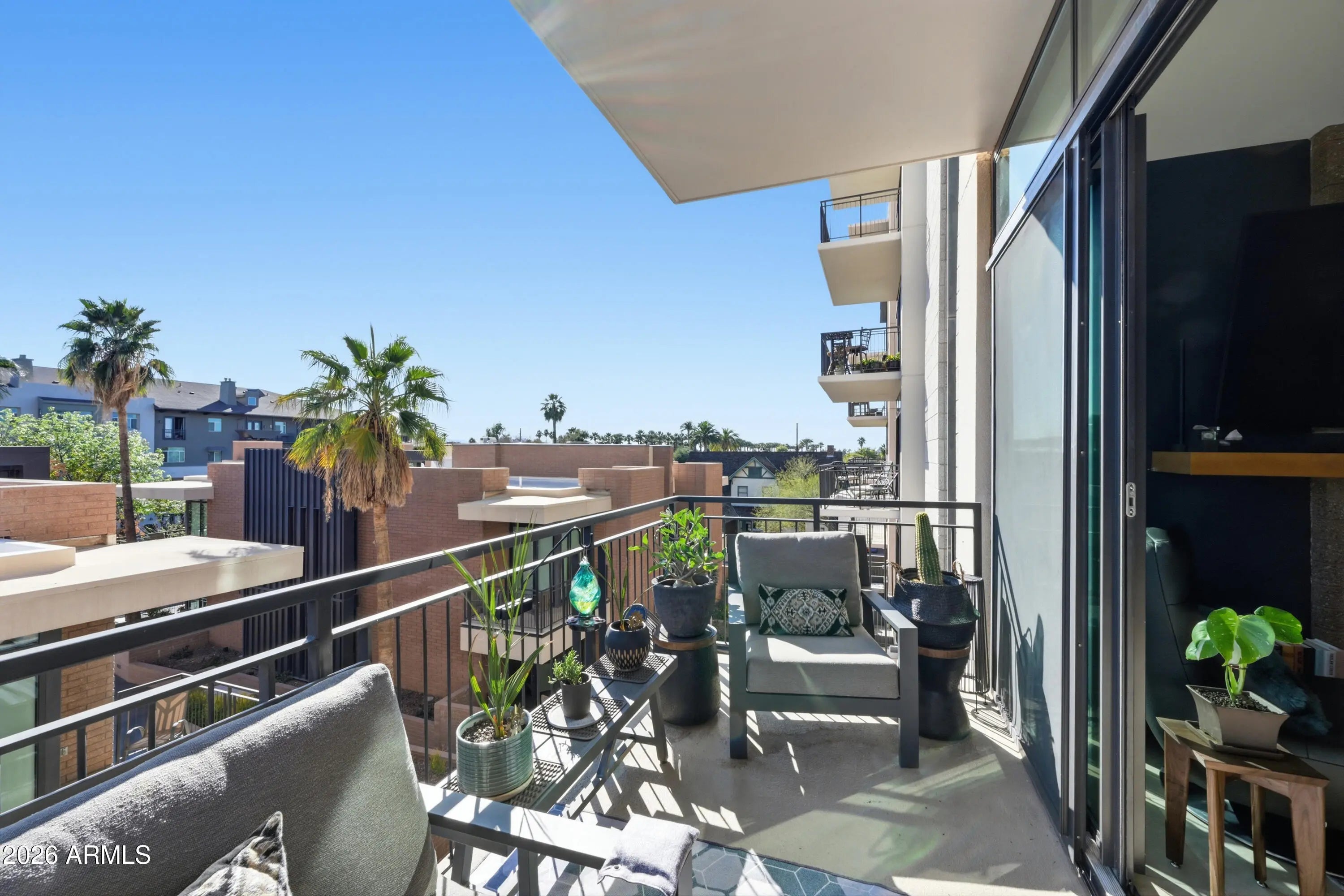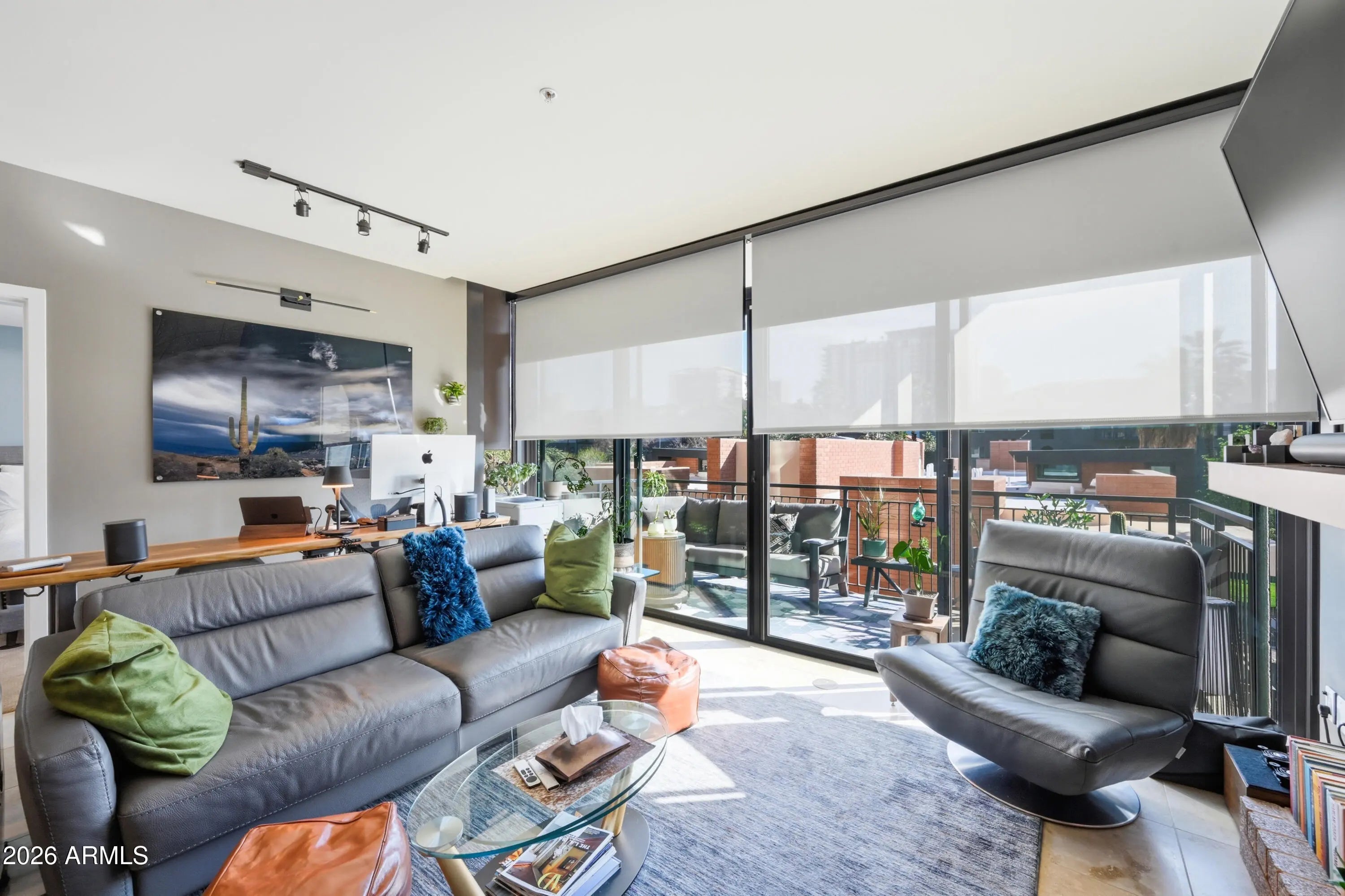 Experience downtown living in the heart of Roosevelt Row, steps from cafes, galleries, restaurants, Margaret T. Hance Park, the Japanese Friendship Garden, and light rail. This boutique neighborhood offers the perfect mix of energy, convenience, and urban lifestyle. Located on the 3rd floor, this 2 bedroom, 2.5 bathroom condo features an open-concept layout connecting the living, dining, and kitchen spaces. Dual remote-controlled blackout and light-filtering blinds let you control light and privacy, and dual sliding doors open to a private patio, extending your living space outdoors. The kitchen is upgraded with custom painted cabinetry, premium hardware, lighting, and appliances and a kitchen island with bar seating, perfect for entertaining. Both bedrooms are private retreats with en-suite baths and spacious closets with built-in cabinetry. A front-lit vanity mirror enhances the modern bathrooms, while a separate half bath serves guests. High-end Valli Italian door hardware and carefully selected finishes reflect a meaningful investment in quality throughout. In-unit laundry adds everyday convenience. All appliances and mounted TVs convey. One assigned parking space and unit are both conveniently located near the elevator. Portland Place offers secure boutique living with underground gated parking, a fitness center, resident lounge, and a rooftop pool and deck with sweeping city views. From the upgrades inside to the vibrant neighborhood outside, this condo delivers a thoughtfully designed, high-quality downtown lifestyle.