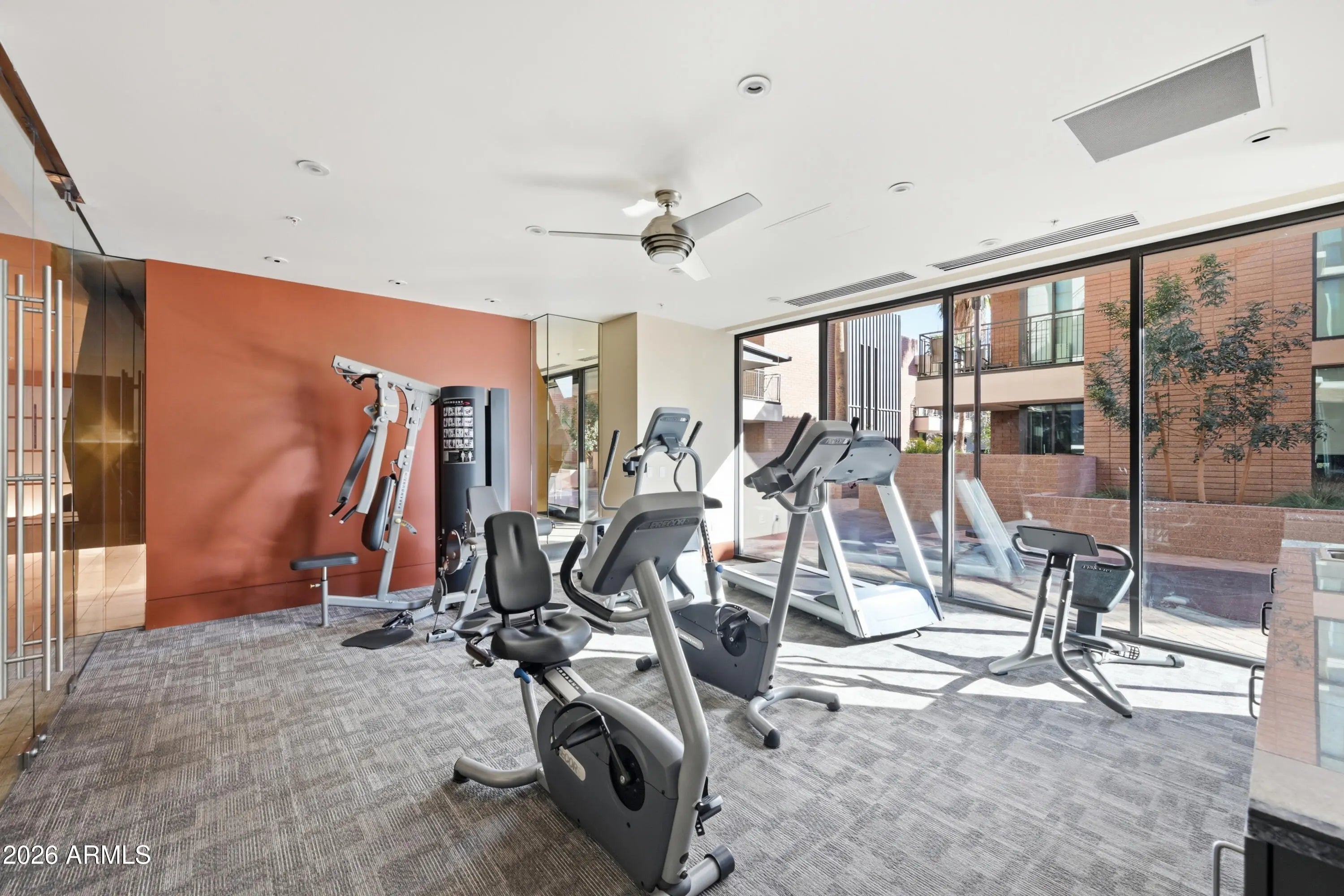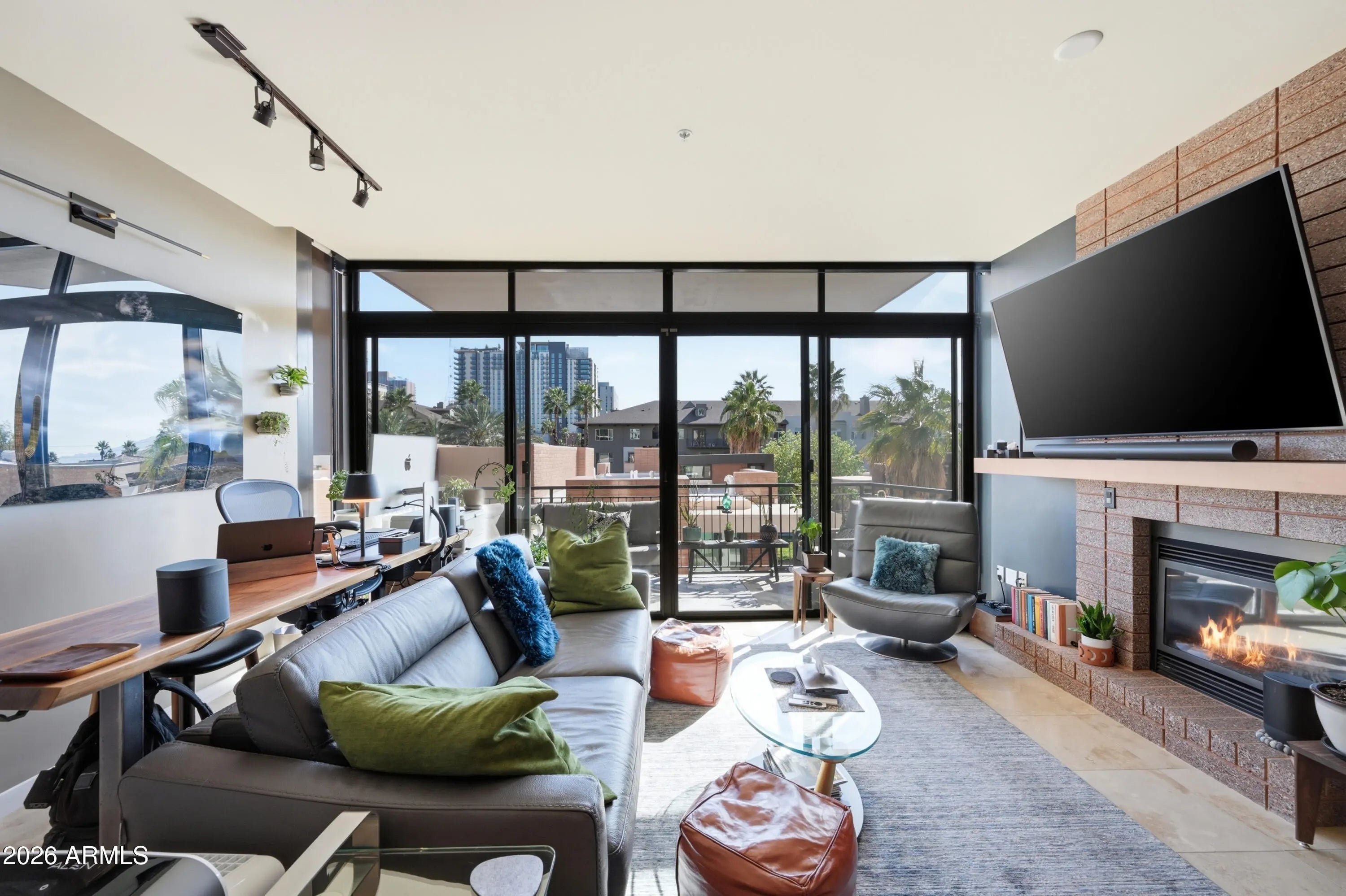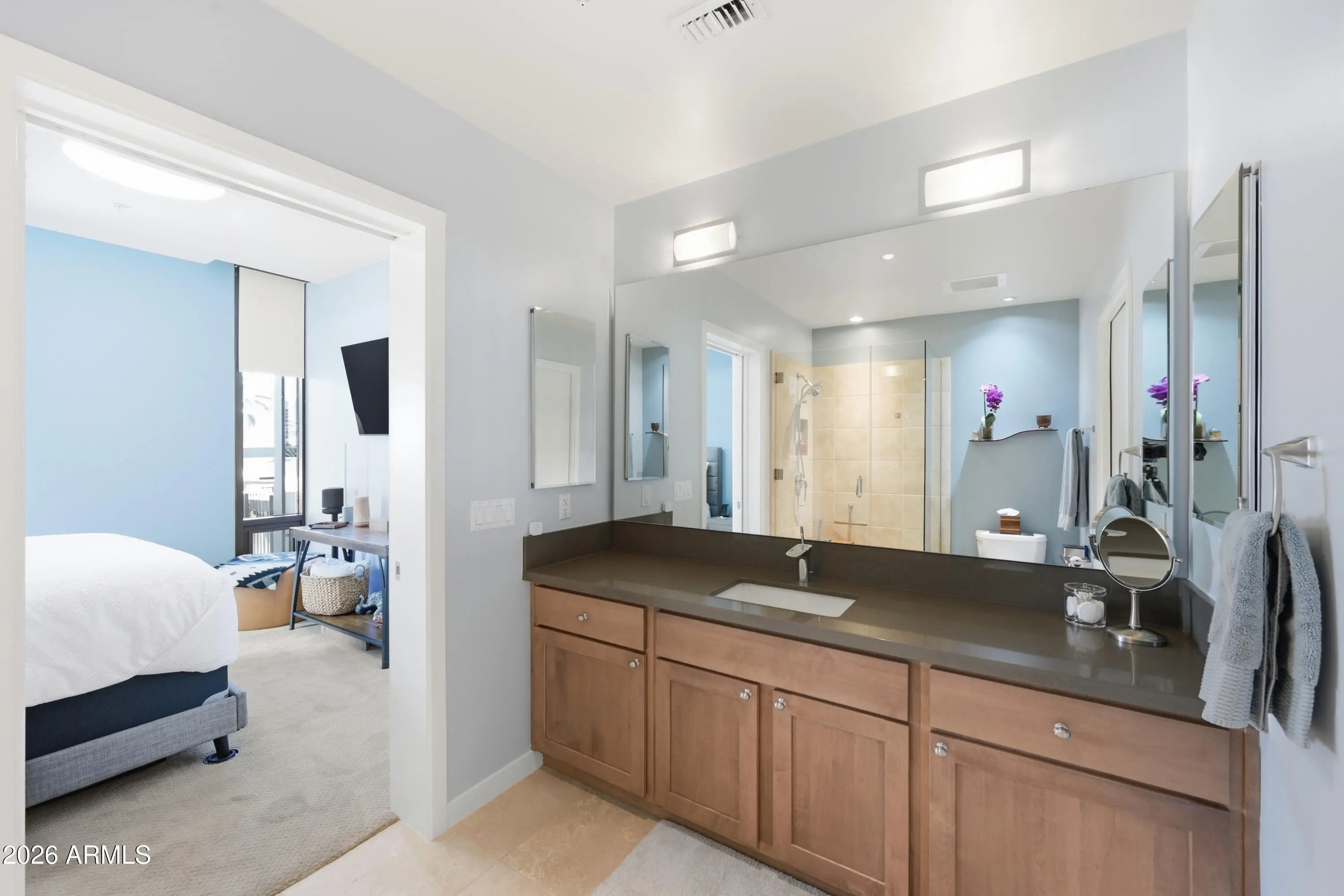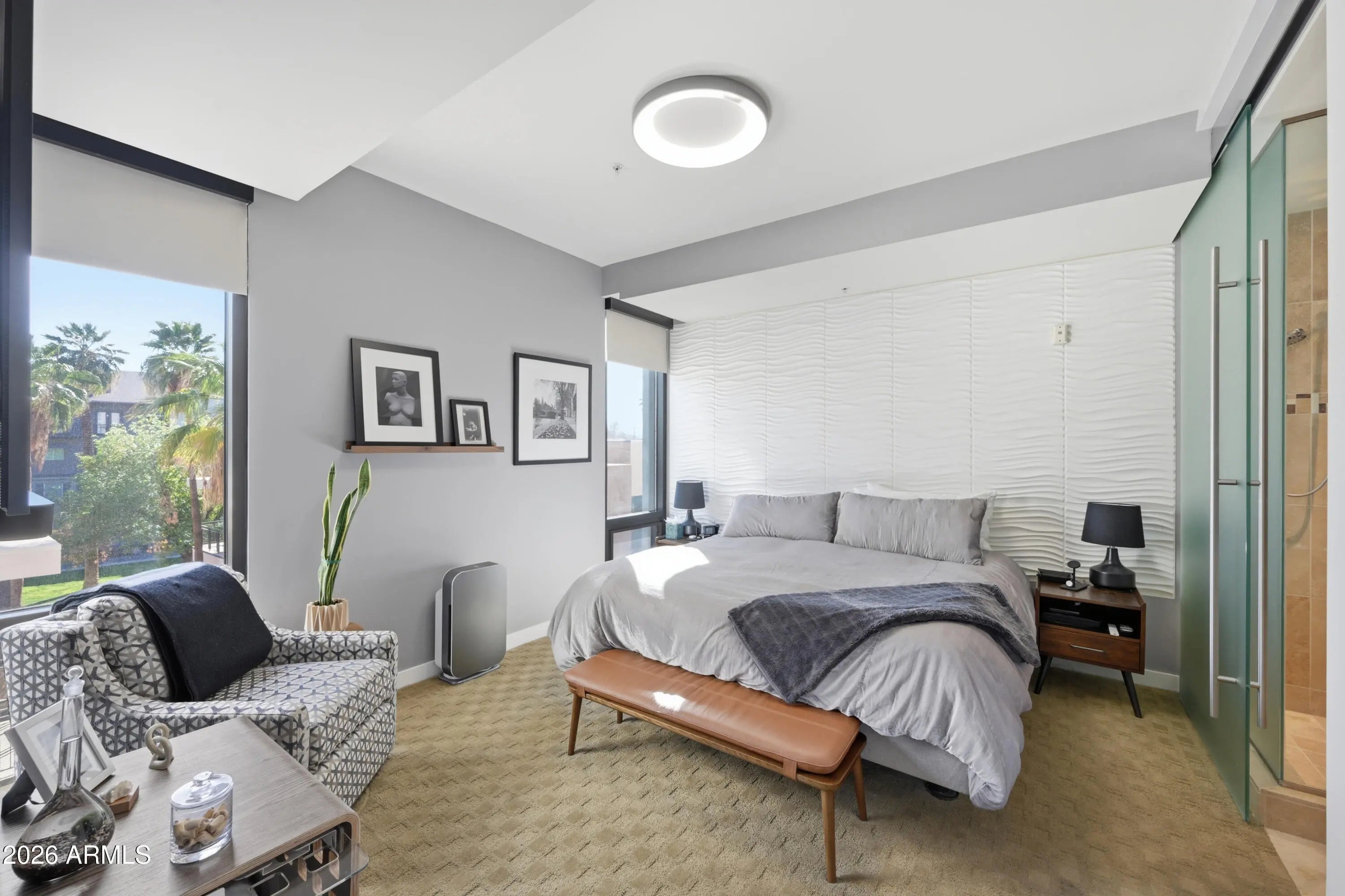 Experience downtown living in the heart of Roosevelt Row, steps from cafes, galleries, restaurants, Margaret T. Hance Park, the Japanese Friendship Garden, and light rail. This boutique neighborhood offers the perfect mix of energy, convenience, and urban lifestyle. Located on the 3rd floor, this 2 bedroom, 2.5 bathroom condo features an open-concept layout connecting the living, dining, and kitchen spaces. Dual remote-controlled blackout and light-filtering blinds let you control light and privacy, and dual sliding doors open to a private patio, extending your living space outdoors. The kitchen is upgraded with custom painted cabinetry, premium hardware, lighting, and appliances and a kitchen island with bar seating, perfect for entertaining. Both bedrooms are private retreats with en-suite baths and spacious closets with built-in cabinetry. A front-lit vanity mirror enhances the modern bathrooms, while a separate half bath serves guests. High-end Valli Italian door hardware and carefully selected finishes reflect a meaningful investment in quality throughout. In-unit laundry adds everyday convenience. All appliances and mounted TVs convey. One assigned parking space and unit are both conveniently located near the elevator. Portland Place offers secure boutique living with underground gated parking, a fitness center, resident lounge, and a rooftop pool and deck with sweeping city views. From the upgrades inside to the vibrant neighborhood outside, this condo delivers a thoughtfully designed, high-quality downtown lifestyle.