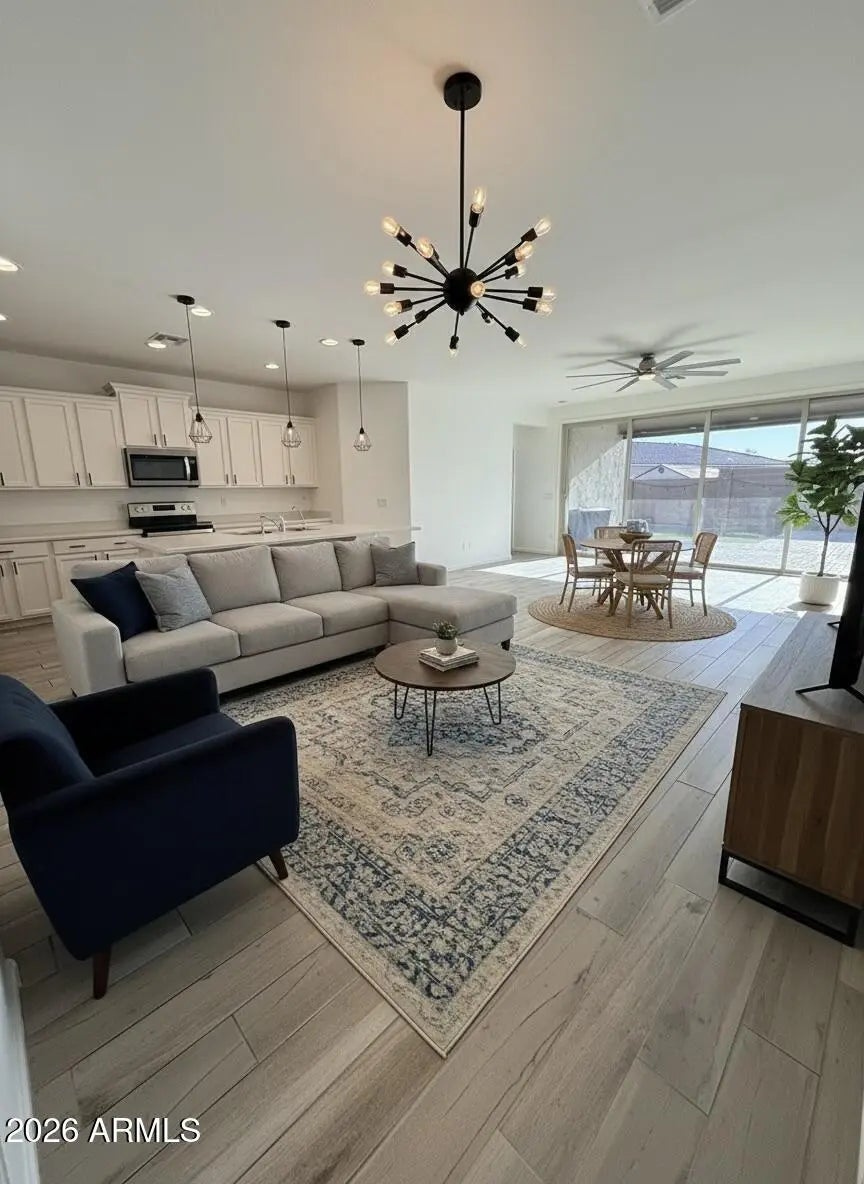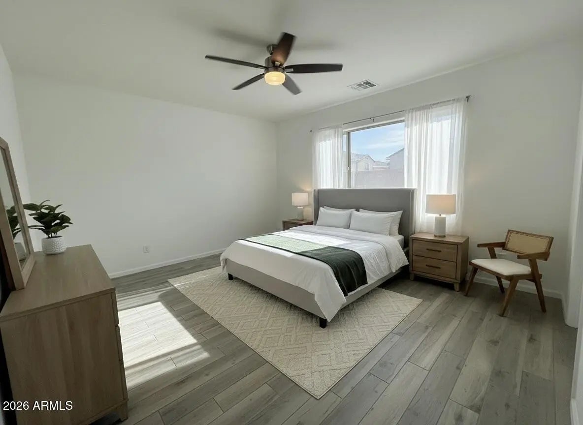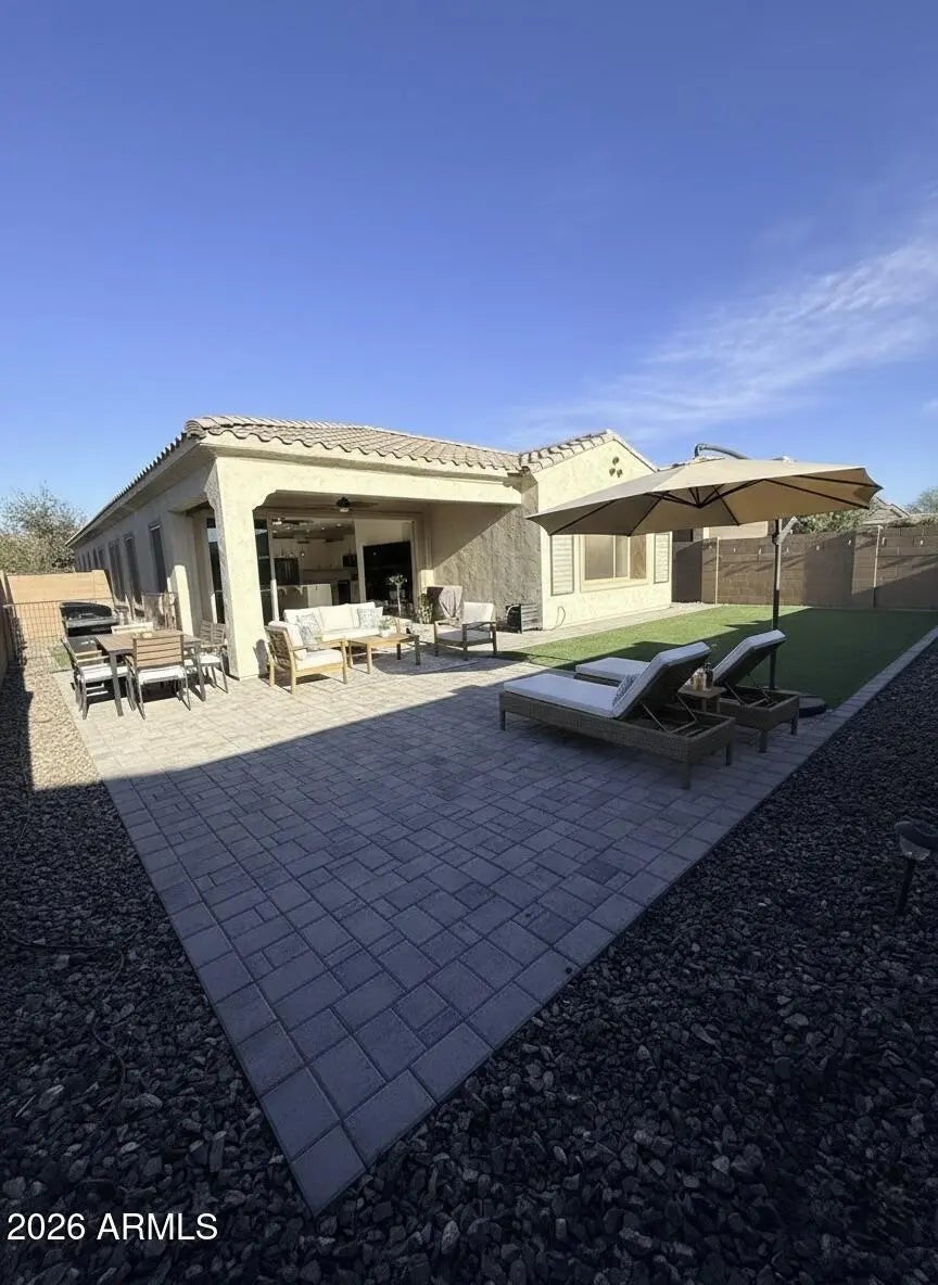 The heart of the home opens into a bright living area anchored by a large sliding glass door that spans nearly the entire back wall, creating seamless indoor-outdoor living. Open it up and enjoy breathtaking mountain views and fresh desert air -- perfect for entertaining, relaxing evenings, or quiet morning coffee. Step outside to your backyard retreat complete with a covered awning patio, designed to block the Arizona sun while you unwind, grill, or host friends. The spacious primary suite offers: A peaceful escape from the main living area, A large walk-in closet, Private full bath This home offers both beauty and practicality -- ideal for families, remote professionals, or anyone who values space and comfort. Located in growing Buckeye, you'll enjoy: " Stunning desert sunsets " Easy access to main roads and conveniences " A welcoming neighborhood atmosphere If you're looking for a home that blends comfort, functionality, and those incredible mountain views, this is it.