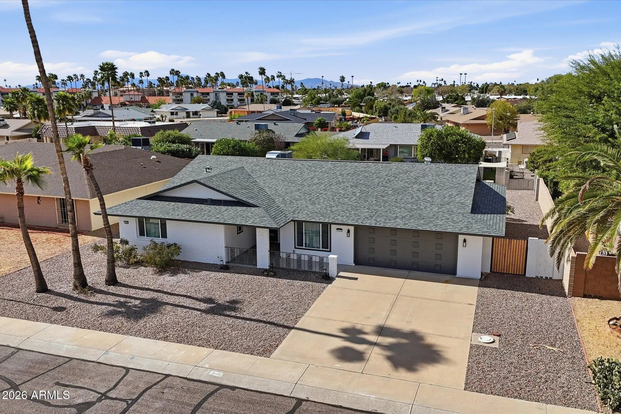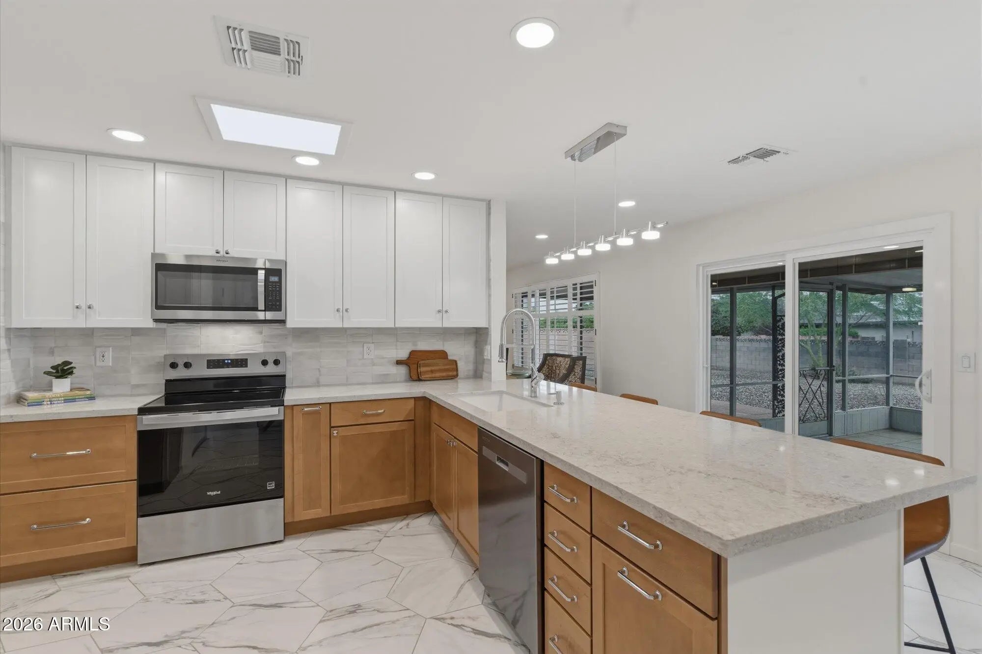 Extensively updated 2025-26 in Sun City PH3, this move-in ready 2-bed, 2-bath home offers quality, comfort, and easy 55+ living. Major improvements already completed: new roof, heat/AC w warranties, dual-pane windows, added insulation, and updated bathrooms and lighting. Quartz kitchen with new cabinetry, new appliances, and beverage bar. Marble bath counters, comfort-height vanities, and custom tile showers with rainfall heads and handhelds. Porcelain tile floors--no carpet, no popcorn, no shortcuts. Walk-in closets, screened patio, block-enclosed yard, flexible laundry/den, and 2-car garage. Located near golf, recreation centers this premier 55+ community is known for. A rare fully updated home with the hard work is already done - simply move in and enjoy. Owner/Agent. IMPROVEMENTS Oct 2025 - Feb 2026: - New roof, underlayment, skylight - New Heat Pump Pkg (AC and heat) 4 ton, 14 SEER, partial ductwork - New dual pane windows, sliders with integral blinds, fire rated garage door. - New attic insulation - New outlets, switches, USB ports, lighting - All new porcelain tile flooring - New baseboards, door casing - New interior doors, hinges and hardware - New kitchen cabinets, quartz counters, sink, faucet, disposal - New toilets, sinks, faucets, interior water lines -All new appliances including stackable laundry center and utility sink. - New paint inside and out - Permitted block wall add for fully enclosed backyard - Home warranty included This nearly new home is ready for you!