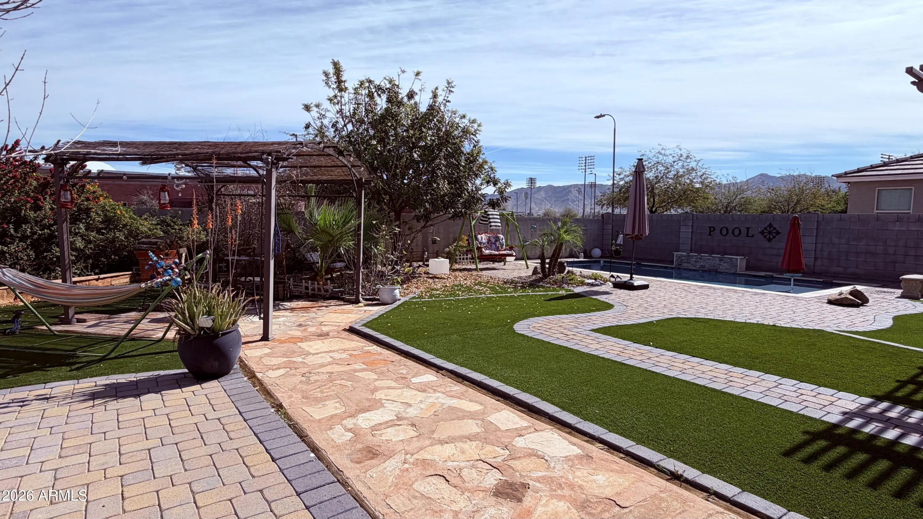 Step into your dream backyard! This stunning outdoor oasis features a brand-new, low-maintenance saltwater pool with an automatic cleaning system, enjoy a pristine swim every day with zero hassle. Unwind under the pergola, sway in the hammock, or gather with friends on the spacious patio. Artificial turf and paver pathways create a lush, green escape, perfect for entertaining or unwinding. Plus, the solar panel system covers approximately 83% of the home's power consumption, ensuring energy efficiency and sustainability, all while you enjoy breathtaking mountain views. Inside, the home boasts upgraded interior features, including a refreshed layout and modernized appliances. The home is also energy-efficient, featuring a water softener, a new water boiler, and a reverse osmosis system.