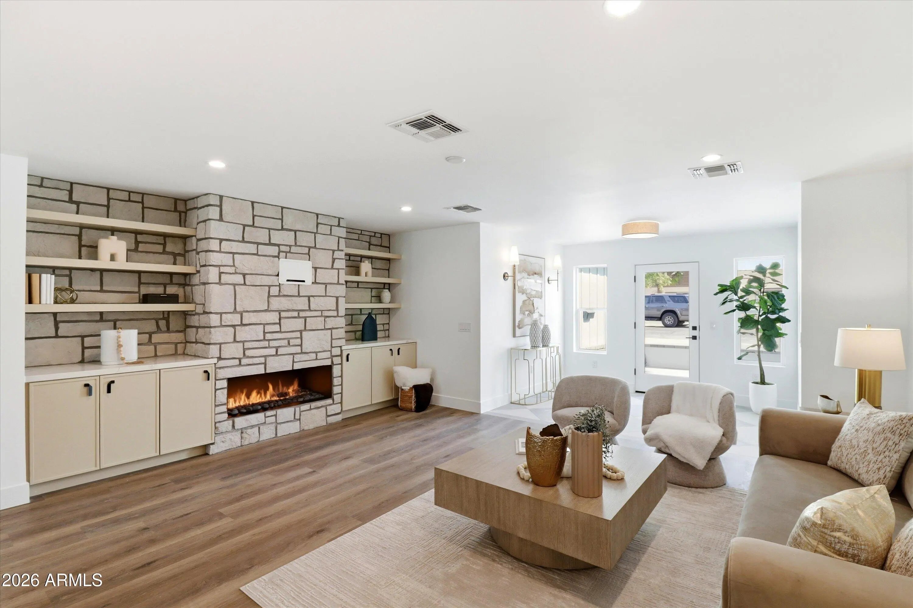 Fully rebuilt and redesigned, this stunning uptown Phoenix residence is a true showcase of quality craftsmanship and thoughtful design, creating a liveable space that combines timeless architecture with organic modern luxury. This home offers a seamless, open layout with high end finishes throughout. 4 bedrooms with exquisitely designed ensuite baths and walk in closets. Kitchen features quartz countertops, island, large breakfast bar with accent waterfall edge, slab backsplash, solid maple millwork painted-Oyster Bay soft close doors/drawers and top grade Frigidaire stainless steel appliances-full size counter depth refrigerator and freezer. Light oak LVP flooring and ceramic & stone tile accents. All brand new systems-framing, electrical, plumbing, sewer, roof and HVAC. Limestone clad fireplace is the centerpiece for gathering in main living area. The spa inspired primary suite is highlighted by pitched ceilings, french doors and a serene ensuite bath complete with freestanding soaking tub and designer finishes. The private backyard offers a peaceful escape with brick pavers, grassy backyard and sideyard with 8 FT RV gate. A charming brick paved courtyard entry welcomes you home. All of this in a walkable location, just minutes from incredible dining, hiking trails and the iconic Murphy Bridle Path. A unique opportunity to own a thoughtfully rebuilt home where design, craftsmanship and lifestyle converge.